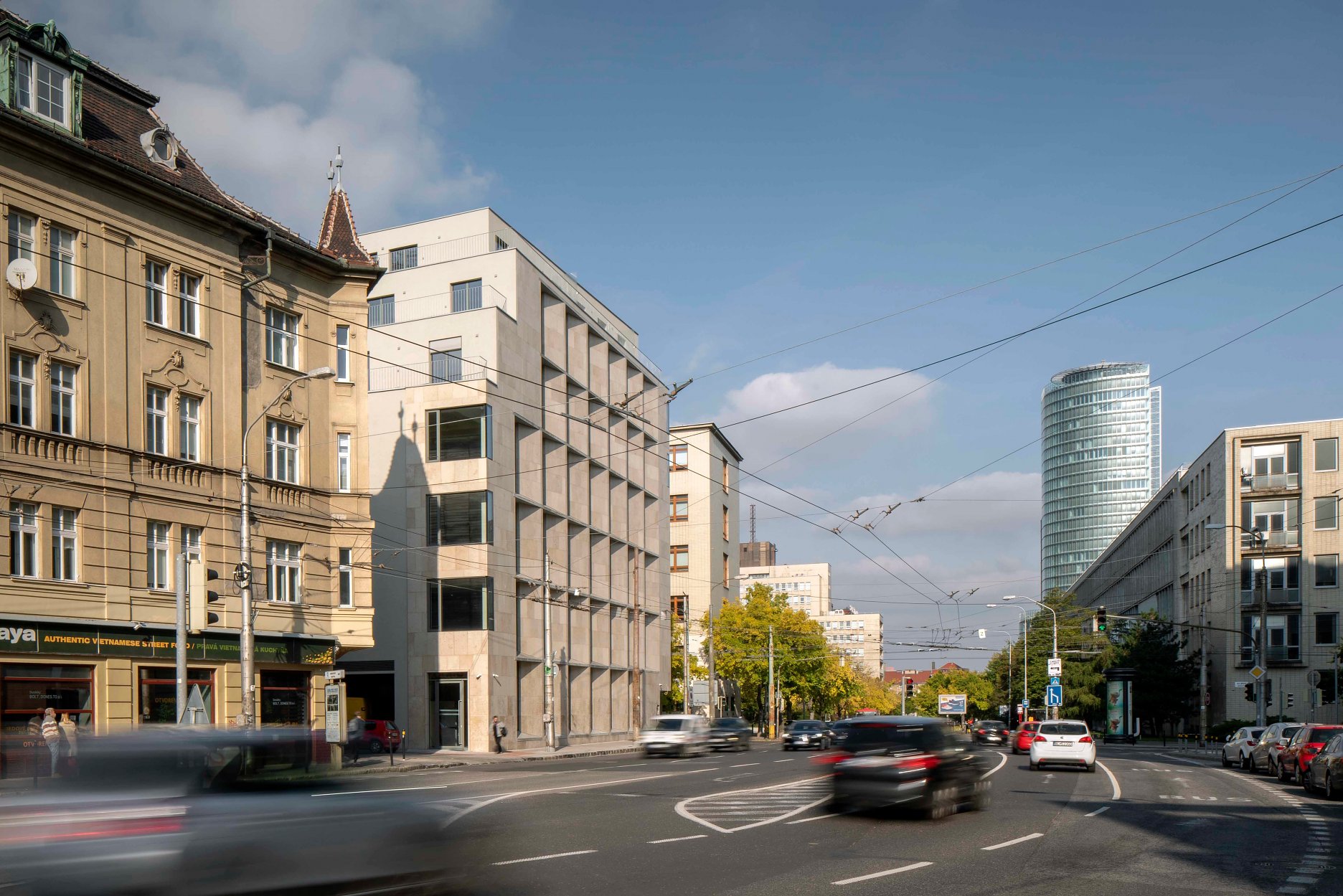 "Snahou autorov bolo postaviť mestský panský dom v strede hlavného mesta – svojou identitou, tektonikou, materialitou a detailom. Od začiatku sme si stanovili ako princíp – urobiť budovu s 3 tvárami. Dosiahli sme to plasticitou fasády. Z jednej strany pôsobí ako kamenná plastická stena a z druhej ako stena s otvormi a z frontálneho pohľadu ako raster otvorov. Jednoduchá šikmina okenného ostenia, ako reakcia na zalomenie cesty. Je paradoxné, že napriek kamennému pôsobeniu budovy je táto vlastne vyskladaná zo síce masívnych, ale okenných otvorov. Tie oddeľuje titerná horizontála betónového prefabrikátu. Od začiatku sme kládli veľký dôraz na detail, materialitu a logiku fasády."