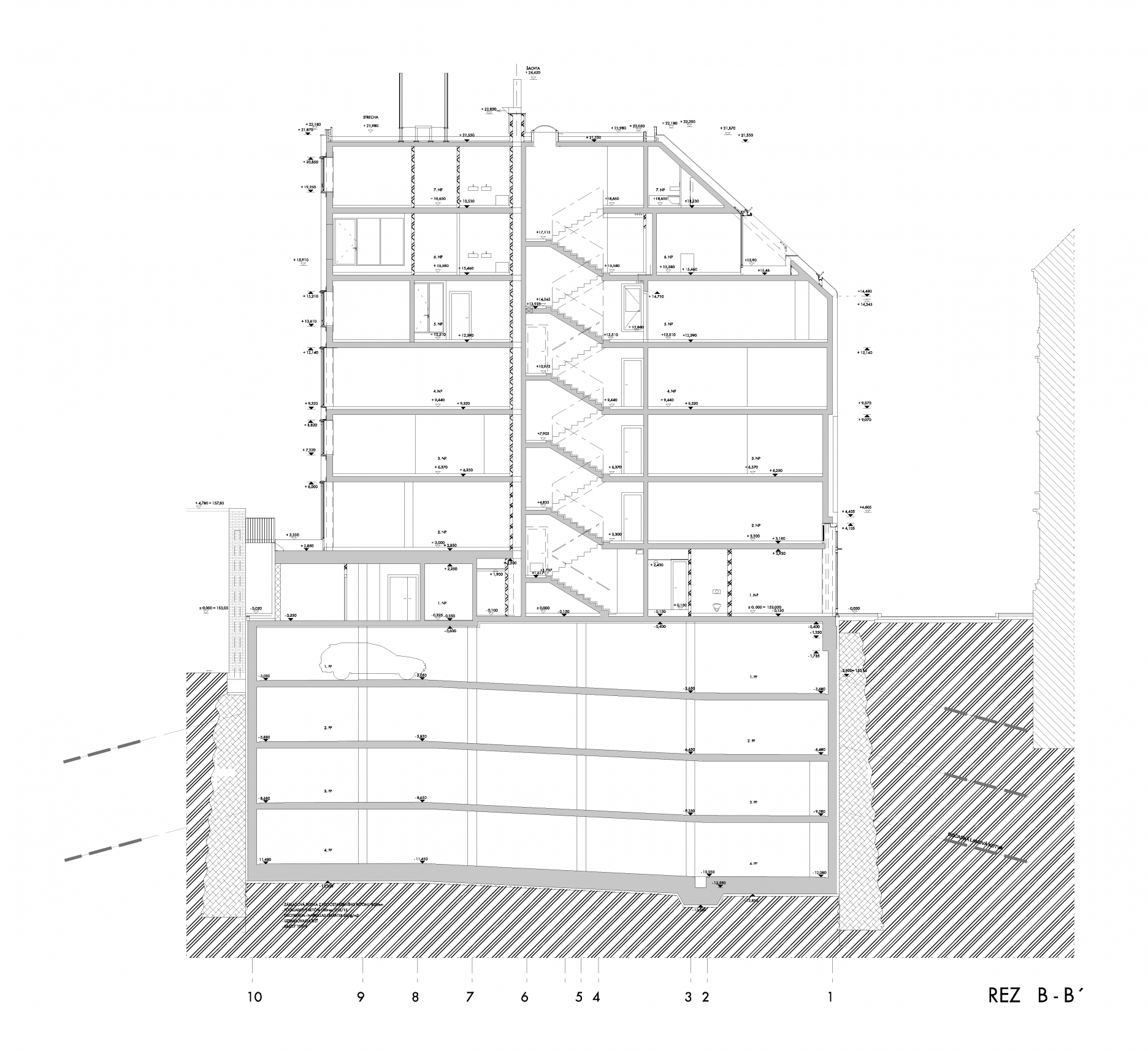 "Kľúčovou architektonickou otázkou návrhu objektu bola voľba takých postupov, ktoré reagujú na historický kontext miesta a zároveň jednoznačne identifikujú túto architektúru ako dnešnú, súčasnú. Okolitú historickú architektúru charakteristickú bohatým reliéfnym klasicistným zdobením sa návrh pokúša interpretovať súčasným architektonickým vokabulárom, ktorý abstrahuje ver-tikálne (smerom na hor) a horizontálne (smerom k susedovi z 20 teho storočia). Rovnako použité materiály, ušlachtilé omietky, drevo.... prezentujú jednak celistvosť vlastného objemu a vzťah s okolím. Architektúra dvornej strany je v detaile prostejšia, tak ako u susedov, dôraz je kladený na drobnejšie proporcie, zeleň na terasách a strechách a svetlotechnické podmienky, ktorých dopad je zrejmý hlavne z uličnej strany."