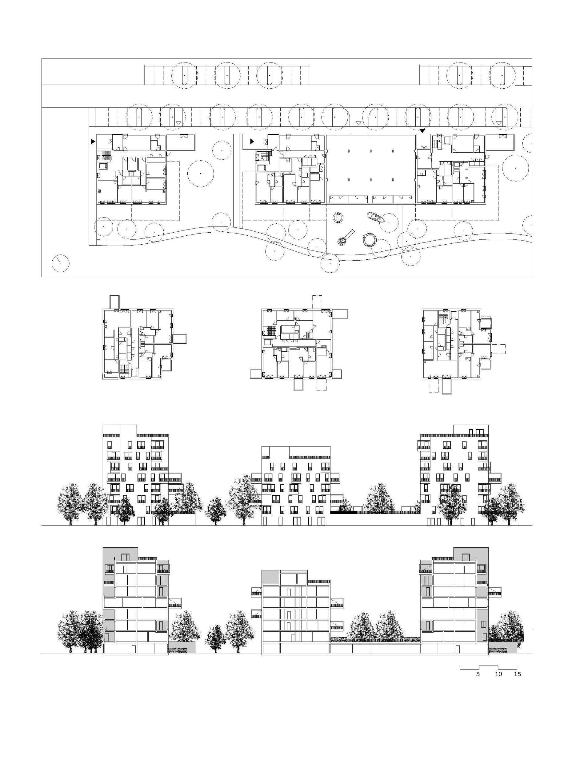"Tri bytové domy sú prvou etapou pripravovanej obytnej zóny na rozhraní exis-tujúceho mesta, sídliska, rodinných domov, centra mesta a biokoridoru rieky. Masterplan vychádza z predpokladu postupnej realizácie jednotlivých etáp ako samostatných projektov organizovaných do pásov vymedzených ulicami so vstupmi, spoločnými priestormi, vybavenosťou a parkovaním na povrchu zohľad-ňujúcim ekonomické možnosti regiónu. Zelené koridory sú súčasťou každého pásu, prepájajú nábrežie s existujúcou časťou mesta, aby nová zástavba nebola bariérou medzi mestom a riekou, ale spájajúcim elementom."