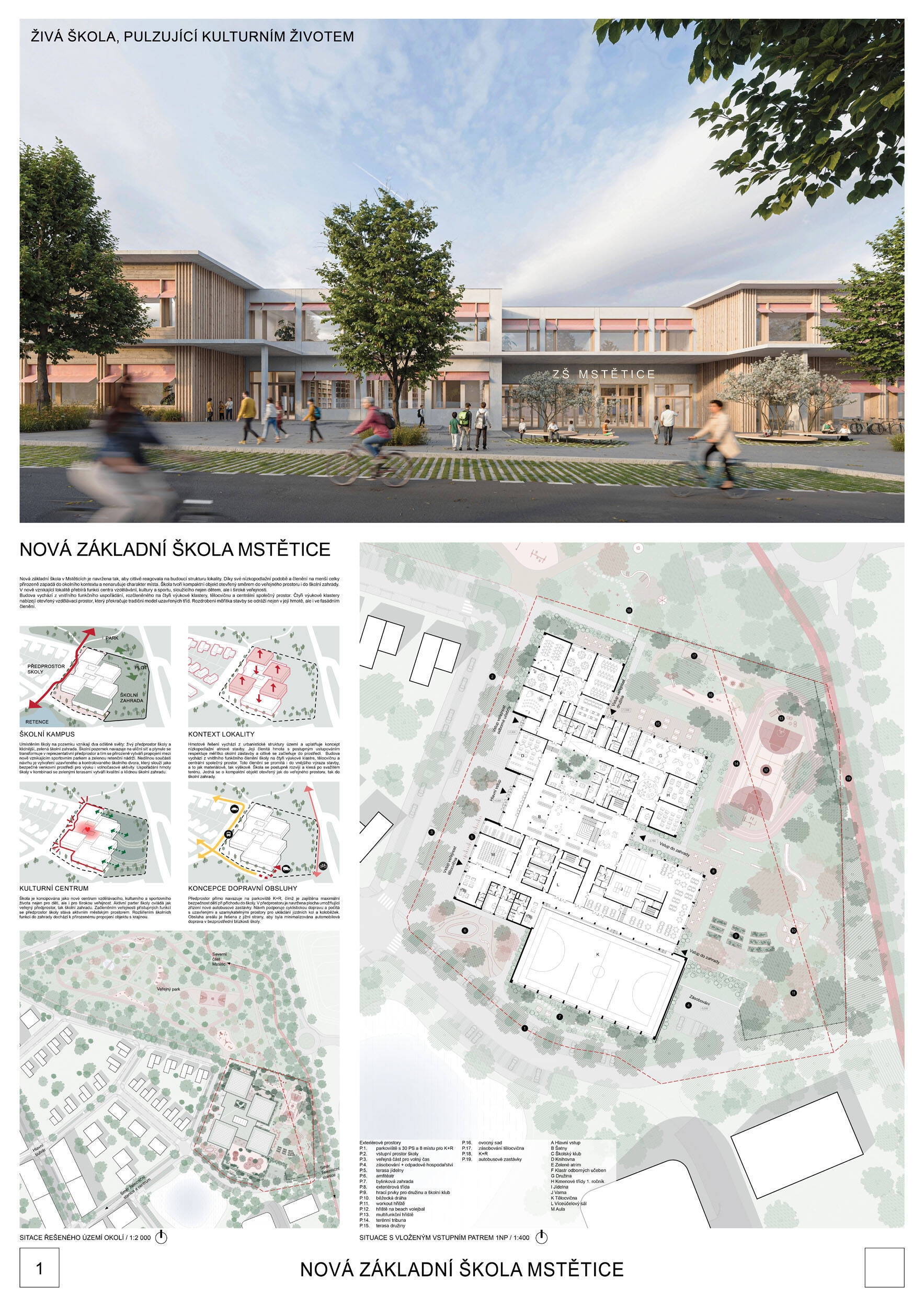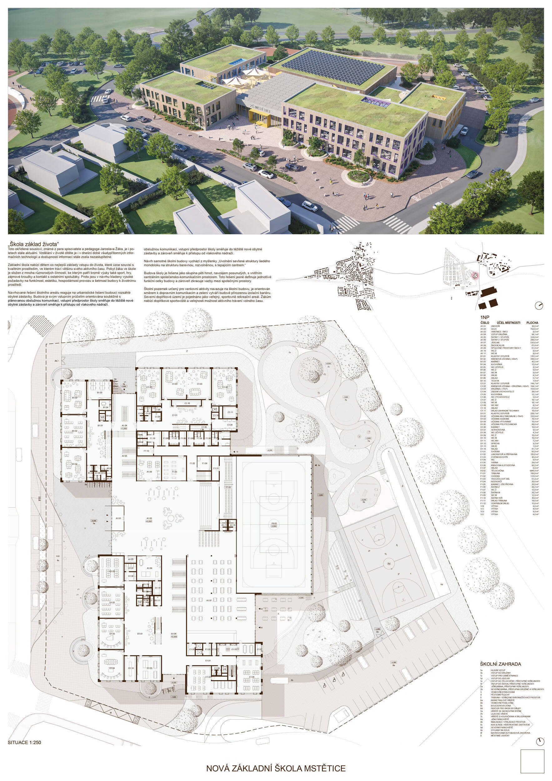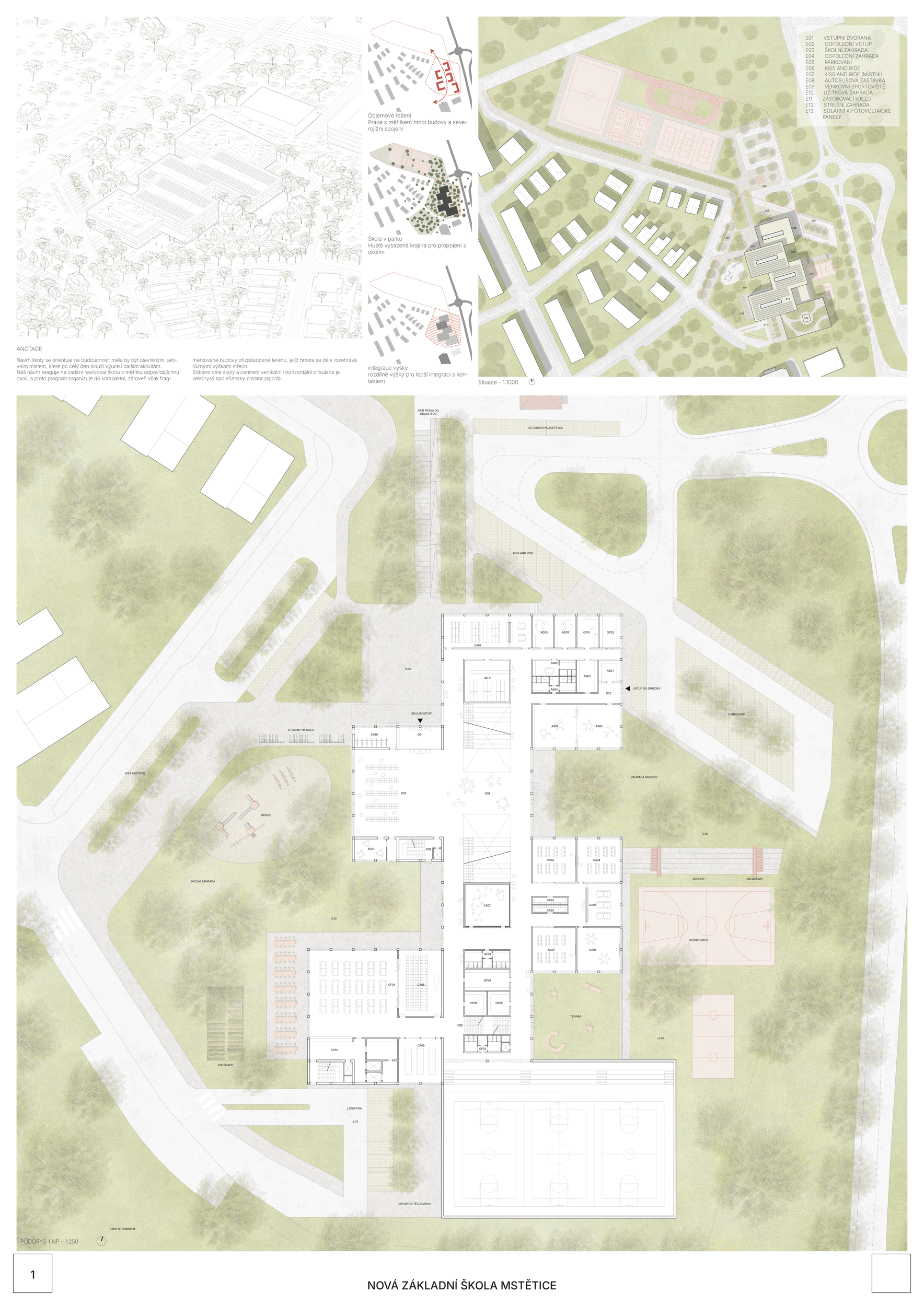 V rámci širšího kontextu návrh vhodně pracuje s odstupem od budoucí zástavby rodinných domů. Veřejný prostor je pečlivě navržen a vybízí ke komfortnímu pobytu ve stínu stromů, jak pro uživatele objektu, tak pro kolemjdoucí. Díky zvolené orientaci navržené hmoty zbývá na pozemku dostatek místa pro školní zahradu. Ta je přístupná z hlavních komunikací, ale lze do ní vstoupit i z jídelny, což porota ocenila. Zahrada navíc poskytuje logické členění. Klastry a společné prostory jsou navrženy přehledně, poskytují žádoucí různorodost a denní světlo. Díky centrální hale jsou pak minimalizovány provozní vzdálenosti. Návrh celkově vykazuje značnou míru propracovanosti na mnoha úrovních, včetně chráněných únikových cest. To v podrobnosti soutěžní studie není samozřejmostí. Jako kultivovaný a realizovatelný spatřovala porota také fasádní plášť včetně elegantního límce nad hlavním vstupem. Příjemné je i předložené barevné schéma řízeně patinované dřevěné fasády, zelených výplní otvorů a mobiliáře v korálovém odstínu. Slabinou projektu je sloučení zásobování gastro provozu a vstupu do tělocvičny pro veřejnost.