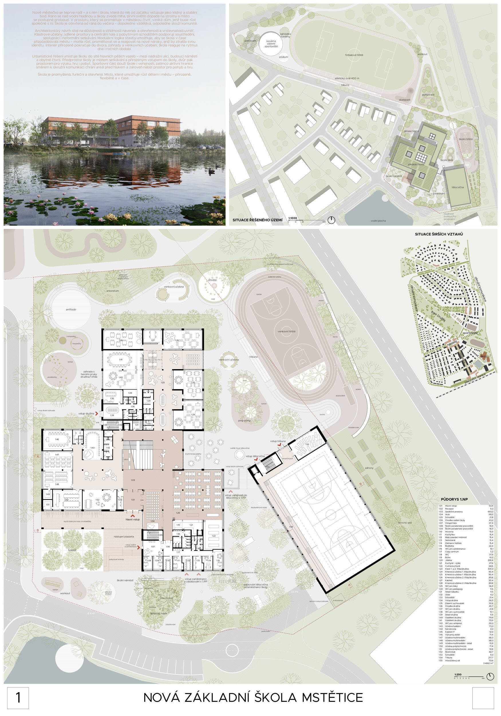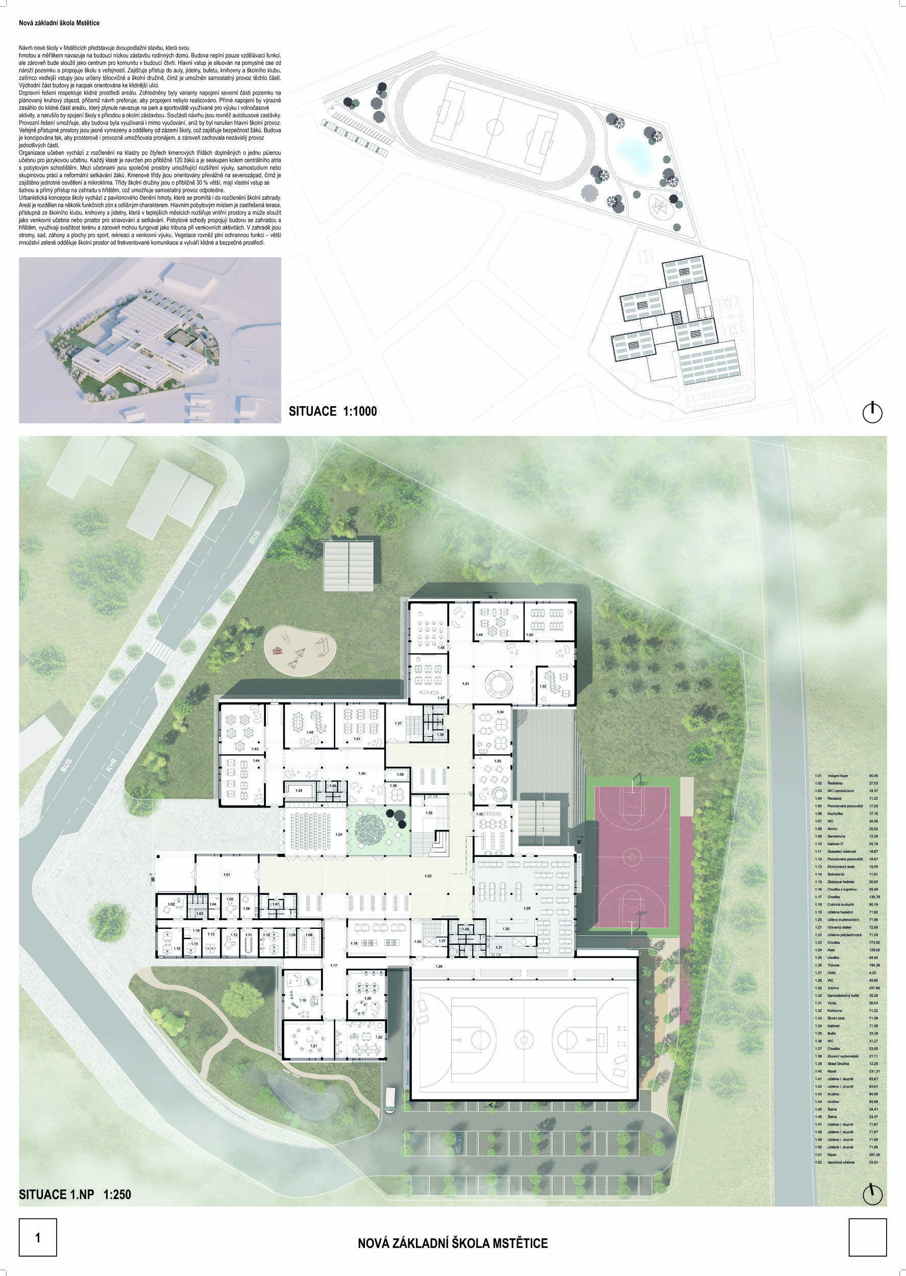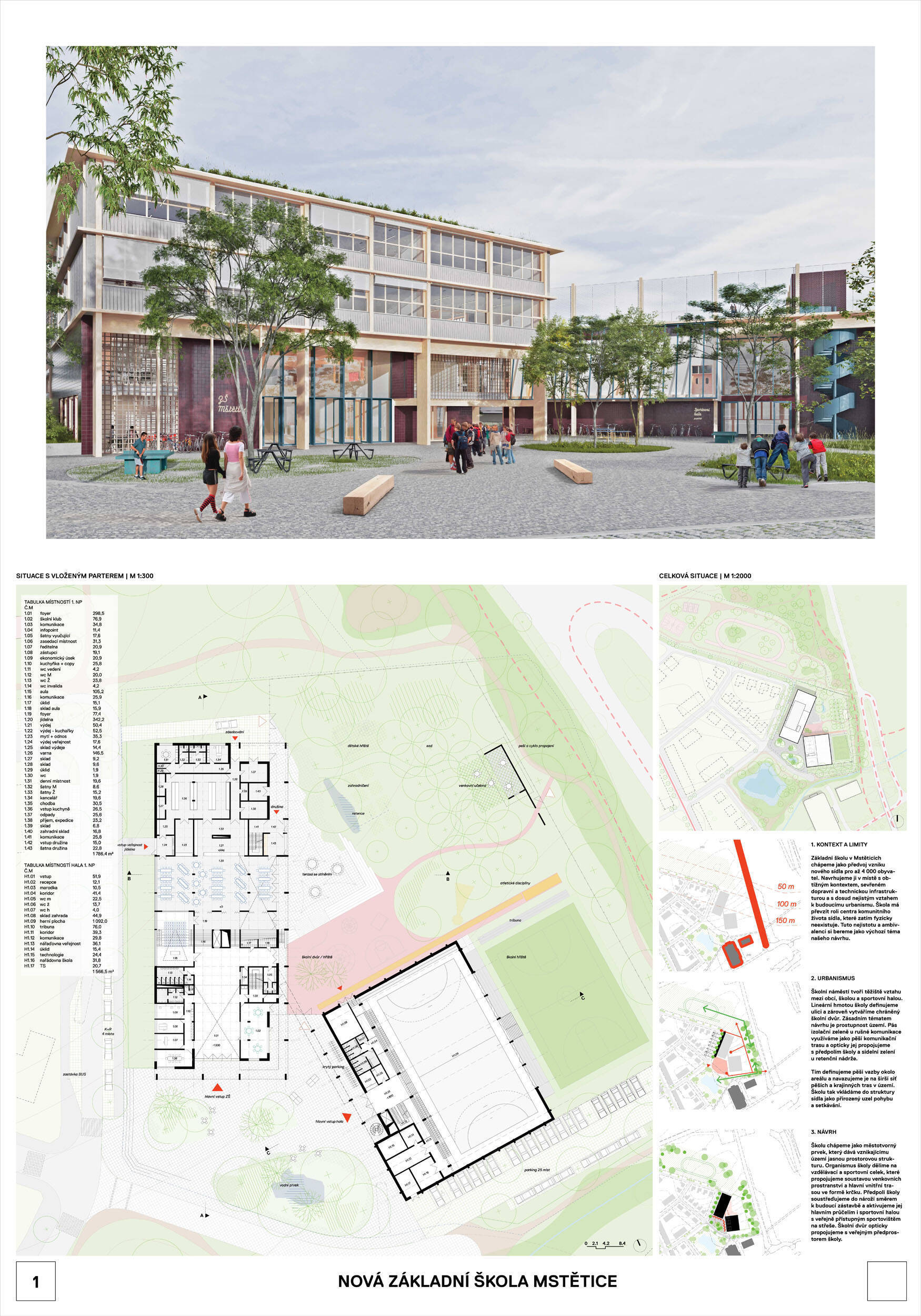 V rámci širšího kontextu návrh vhodně pracuje s odstupem od budoucí zástavby rodinných domů. Veřejný prostor je pečlivě navržen a vybízí ke komfortnímu pobytu ve stínu stromů, jak pro uživatele objektu, tak pro kolemjdoucí. Díky zvolené orientaci navržené hmoty zbývá na pozemku dostatek místa pro školní zahradu. Ta je přístupná z hlavních komunikací, ale lze do ní vstoupit i z jídelny, což porota ocenila. Zahrada navíc poskytuje logické členění. Klastry a společné prostory jsou navrženy přehledně, poskytují žádoucí různorodost a denní světlo. Díky centrální hale jsou pak minimalizovány provozní vzdálenosti. Návrh celkově vykazuje značnou míru propracovanosti na mnoha úrovních, včetně chráněných únikových cest. To v podrobnosti soutěžní studie není samozřejmostí. Jako kultivovaný a realizovatelný spatřovala porota také fasádní plášť včetně elegantního límce nad hlavním vstupem. Příjemné je i předložené barevné schéma řízeně patinované dřevěné fasády, zelených výplní otvorů a mobiliáře v korálovém odstínu. Slabinou projektu je sloučení zásobování gastro provozu a vstupu do tělocvičny pro veřejnost.