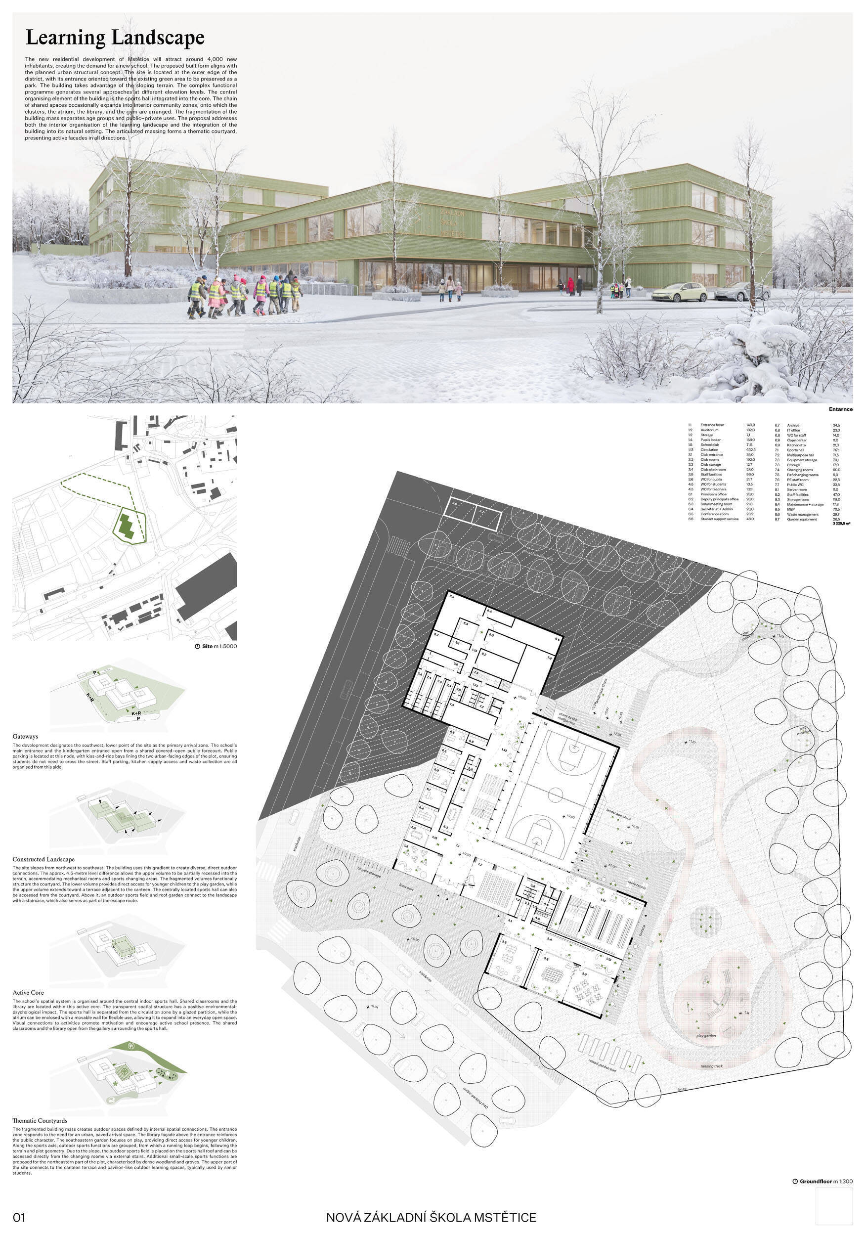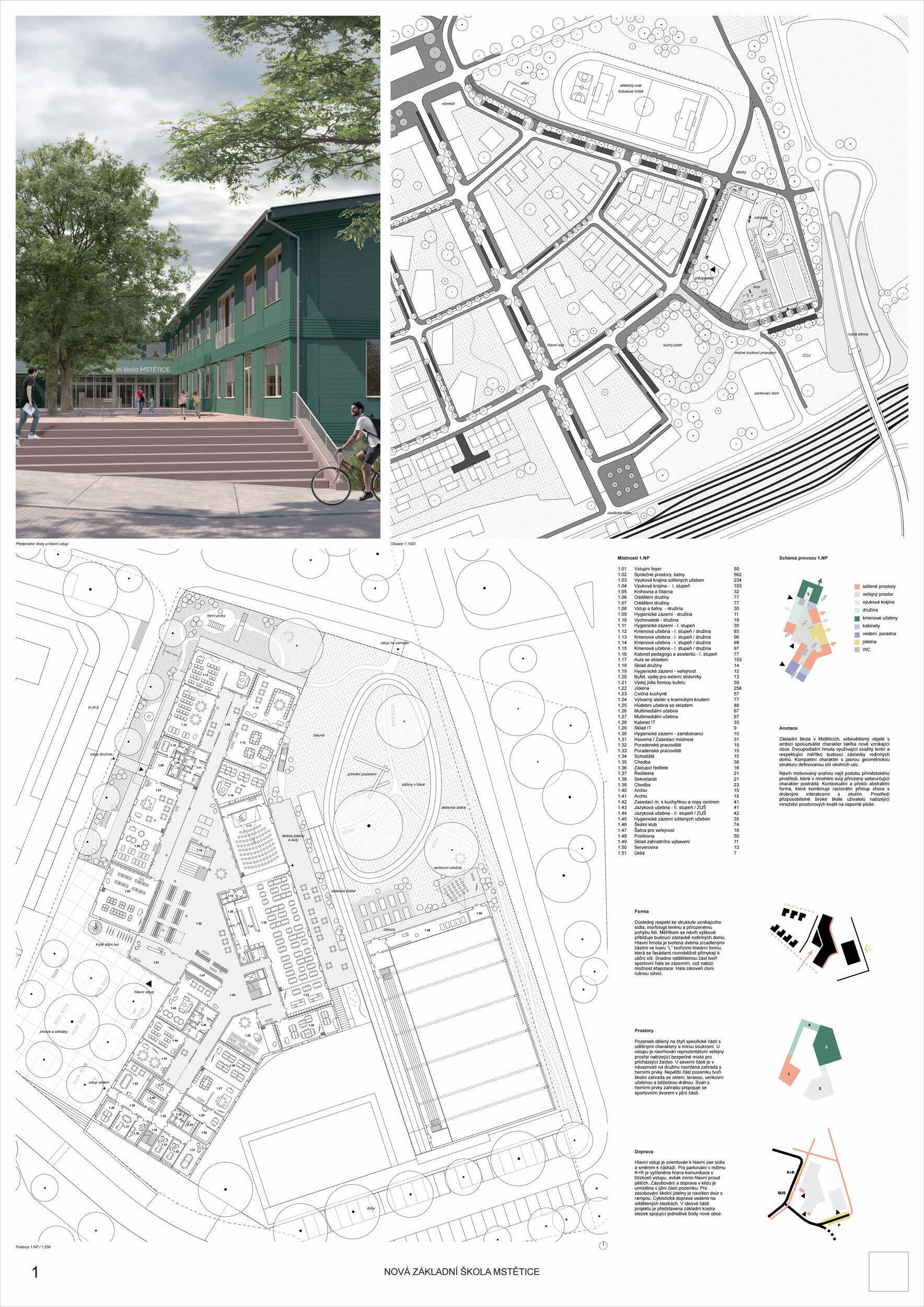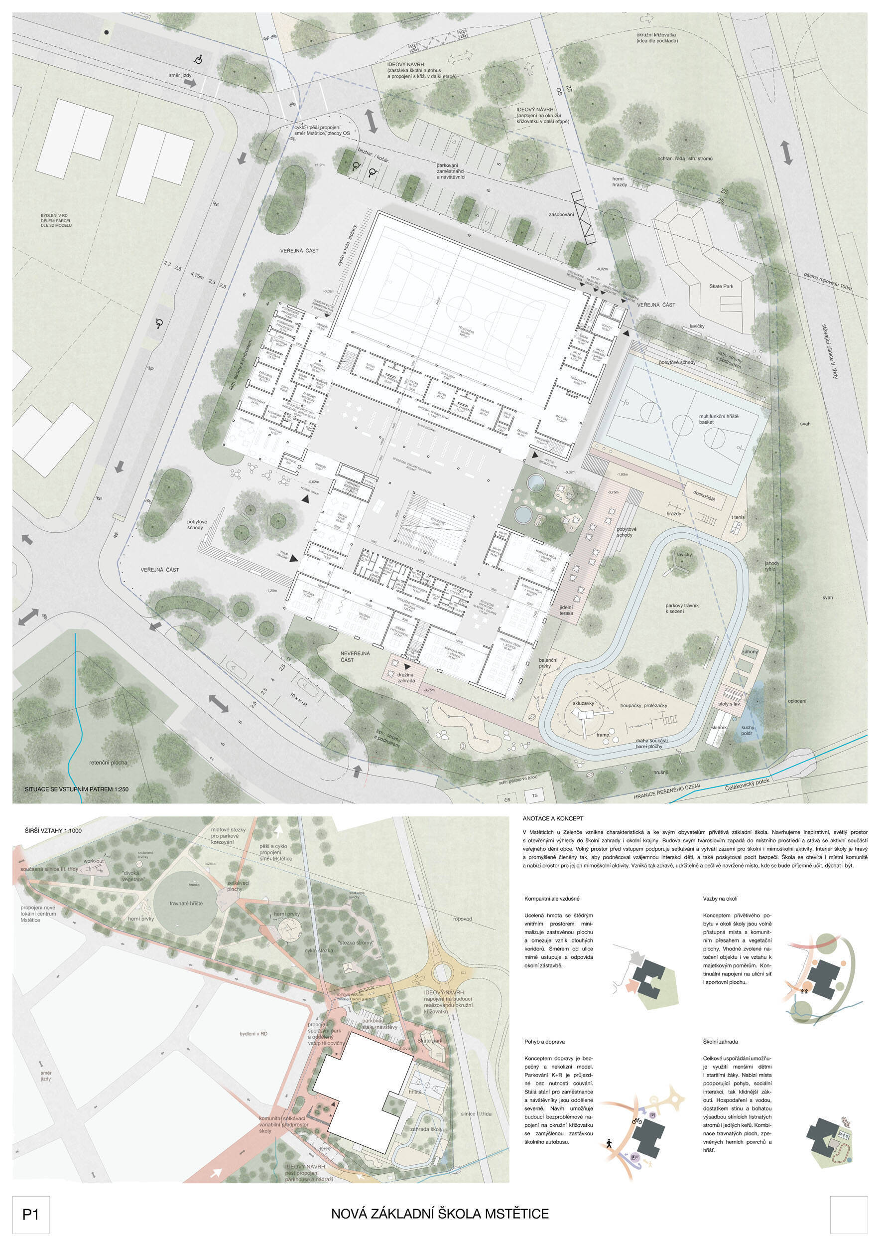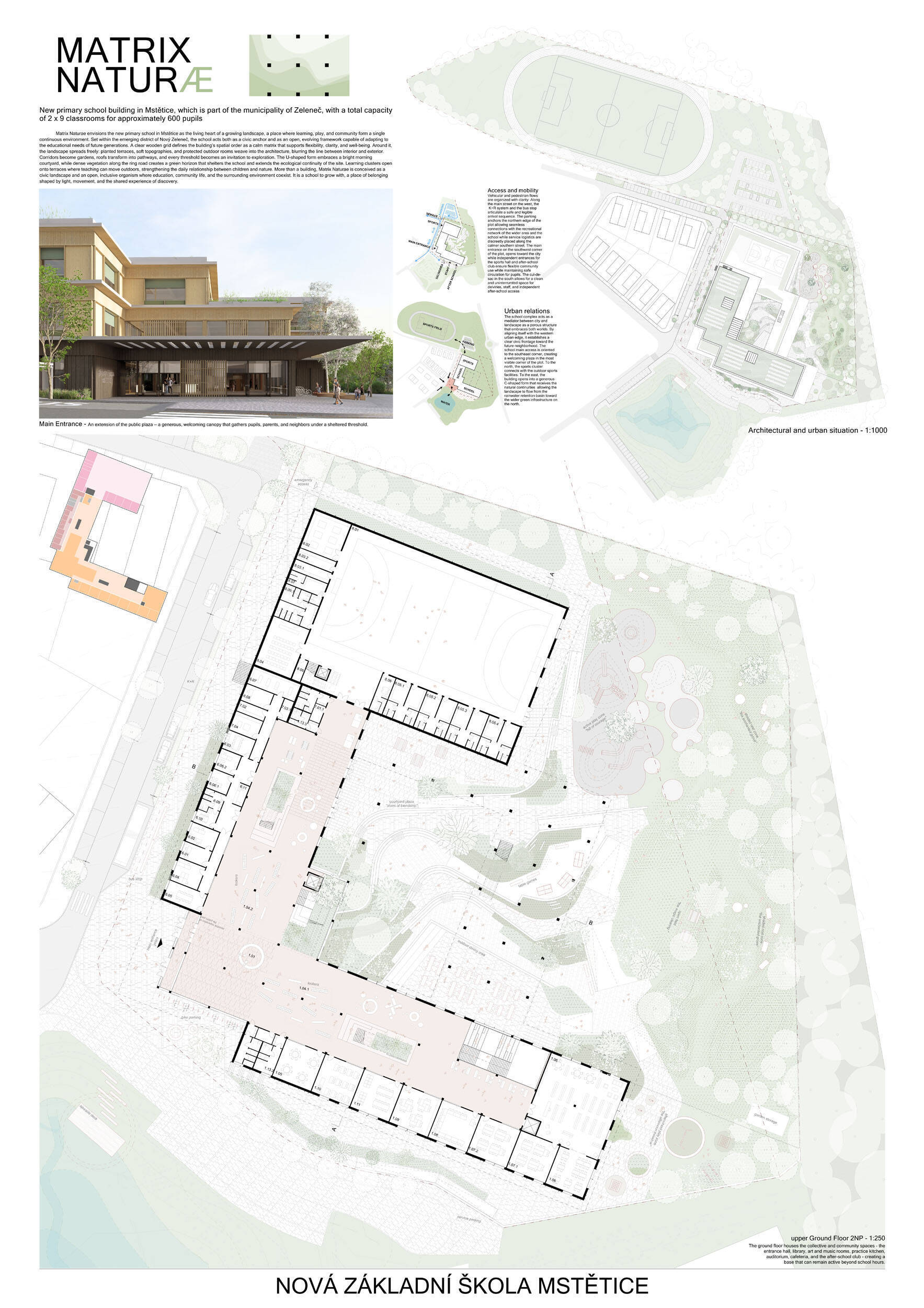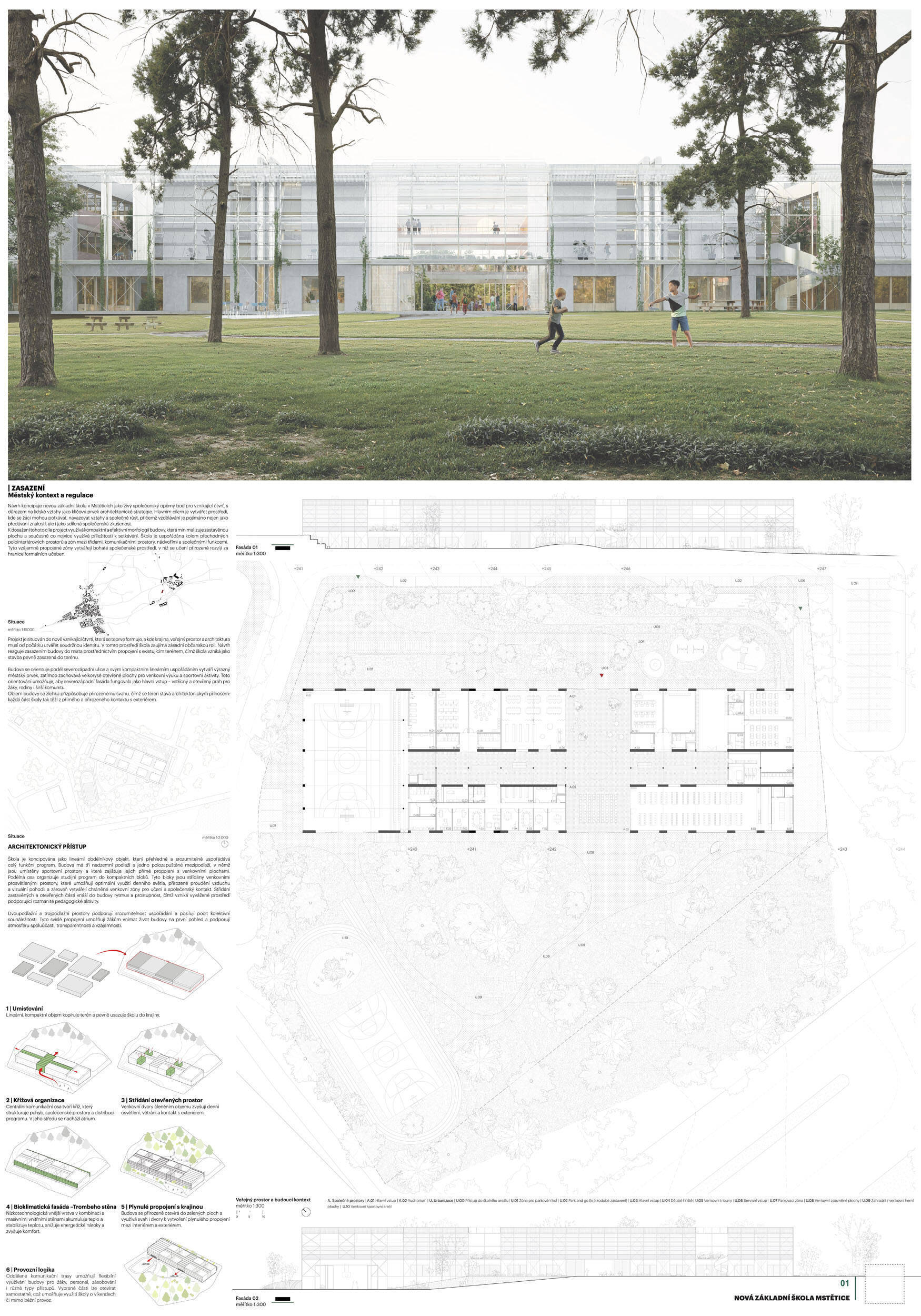 Návrh je velmi dobře propojen se širším územím a logicky navazuje na územní studii Zeleneč, čímž respektuje širší kontext rozvoje obce. Porota pozitivně hodnotí navržený půdorys, který tvoří kompaktní a přehledně organizovaný celek. Vhodné natočení objektu a promyšlené tvarování hmoty umožňuje, aby ze západní strany, otevírající se směrem k novému rozvojovému centru, vedly veřejné vstupy jak do školy, tak do tělocvičny a odborných učeben, čímž vzniká přirozené propojení objektu s veřejným prostranstvím a školní halou, což podporuje intuitivní orientaci a snadný přístup návštěvníků. Naopak vstup do družiny je situován spíše diskrétně, v zahradní části areálu, což odpovídá požadavku na klid a bezpečí dětí. Parkování je soustředěno v jižní části podél silnice, zatímco zóna K+R je umístěna v před prostoru školy, čímž se efektivně eliminuje potřeba velké plochy parkoviště a minimalizuje dopad automobilového provozu na školní prostředí. Mezi silné stránky návrhu patří funkčně řešená celková vnitřní dispozice a jasné provozní vazby jednotlivých částí budovy na školní zahradu, přístupové trasy i zásobovací a obslužné body. Oceňujeme architektonické členění stavby do několika dílčích objemů, které umožňuje zachovat prostornou a funkční školní zahradu. Autoři návrhu skutečně vytvořili veřejně přístupnou školu, která může sloužit jako centrum komunitních a kulturních aktivit. Další silnou stránkou je vnitřní uspořádání klastrů, které jsou strategicky umístěny na konci společných prostor a využívají přirozeného světla, čímž podporují pohodlí žáků a kvalitu výuky.