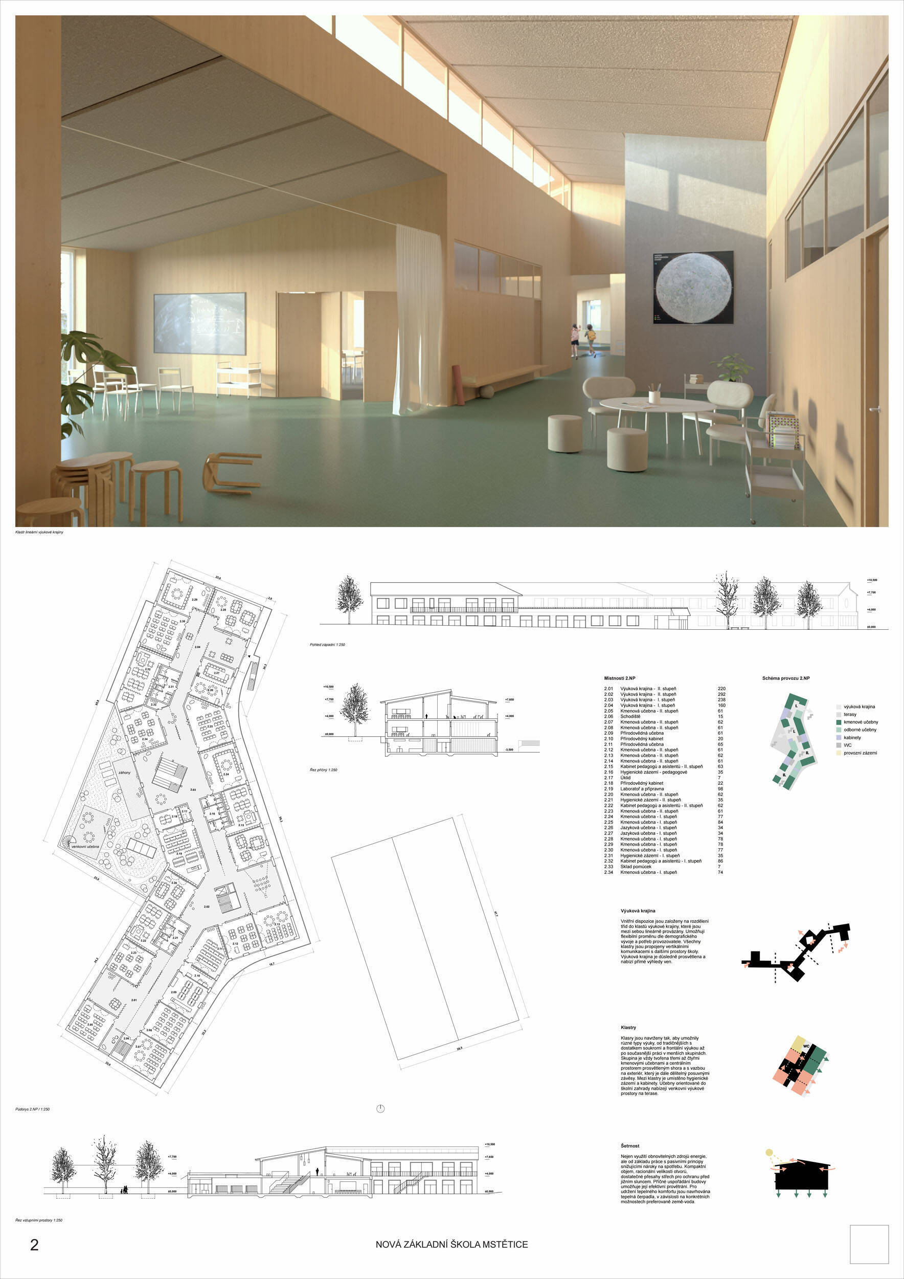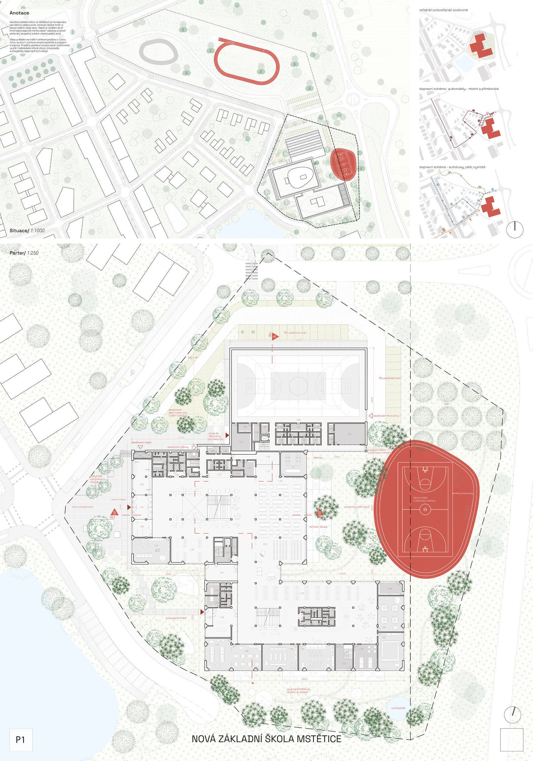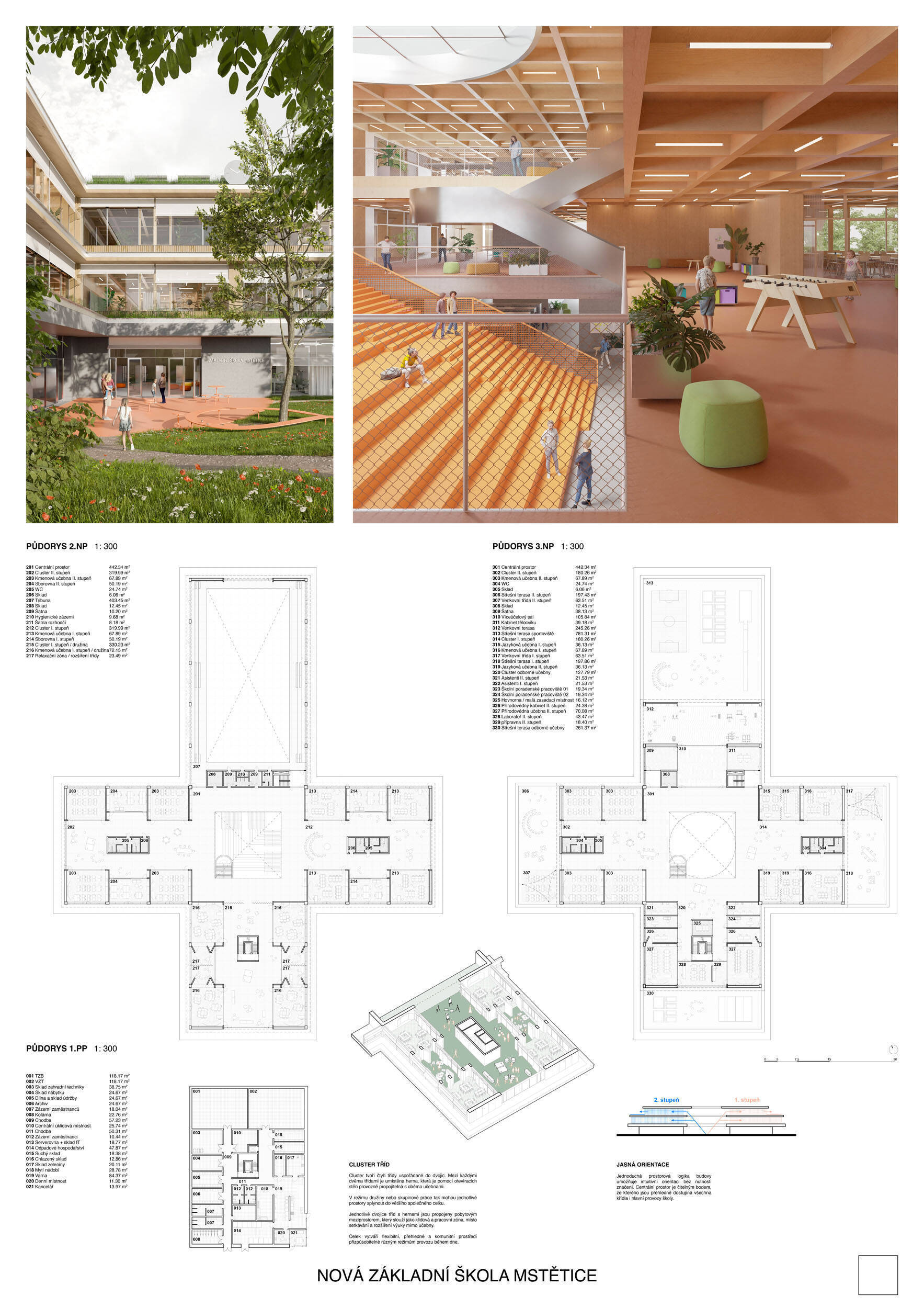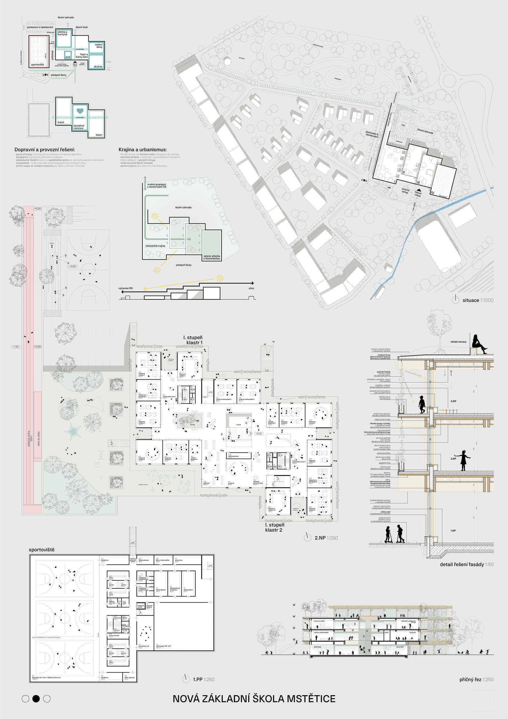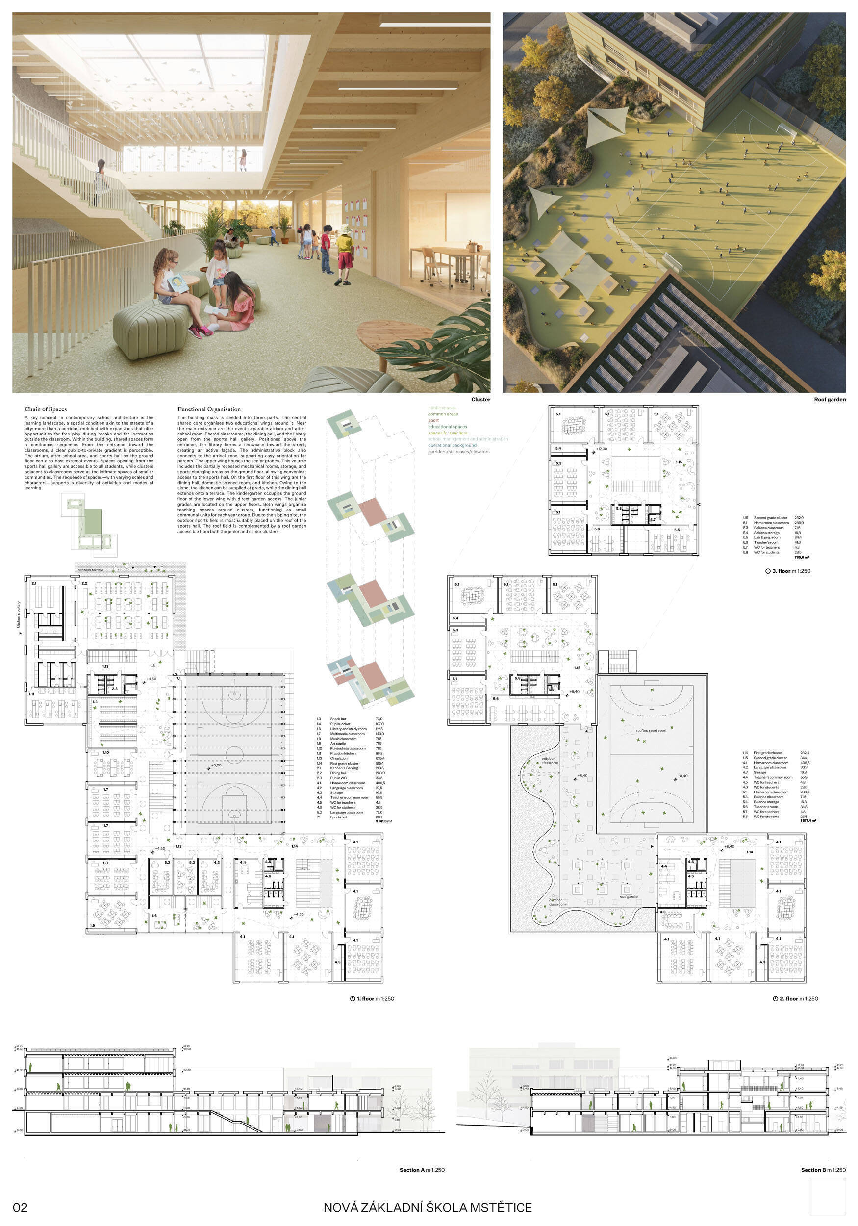 Návrh je velmi dobře propojen se širším územím a logicky navazuje na územní studii Zeleneč, čímž respektuje širší kontext rozvoje obce. Porota pozitivně hodnotí navržený půdorys, který tvoří kompaktní a přehledně organizovaný celek. Vhodné natočení objektu a promyšlené tvarování hmoty umožňuje, aby ze západní strany, otevírající se směrem k novému rozvojovému centru, vedly veřejné vstupy jak do školy, tak do tělocvičny a odborných učeben, čímž vzniká přirozené propojení objektu s veřejným prostranstvím a školní halou, což podporuje intuitivní orientaci a snadný přístup návštěvníků. Naopak vstup do družiny je situován spíše diskrétně, v zahradní části areálu, což odpovídá požadavku na klid a bezpečí dětí. Parkování je soustředěno v jižní části podél silnice, zatímco zóna K+R je umístěna v před prostoru školy, čímž se efektivně eliminuje potřeba velké plochy parkoviště a minimalizuje dopad automobilového provozu na školní prostředí. Mezi silné stránky návrhu patří funkčně řešená celková vnitřní dispozice a jasné provozní vazby jednotlivých částí budovy na školní zahradu, přístupové trasy i zásobovací a obslužné body. Oceňujeme architektonické členění stavby do několika dílčích objemů, které umožňuje zachovat prostornou a funkční školní zahradu. Autoři návrhu skutečně vytvořili veřejně přístupnou školu, která může sloužit jako centrum komunitních a kulturních aktivit. Další silnou stránkou je vnitřní uspořádání klastrů, které jsou strategicky umístěny na konci společných prostor a využívají přirozeného světla, čímž podporují pohodlí žáků a kvalitu výuky.