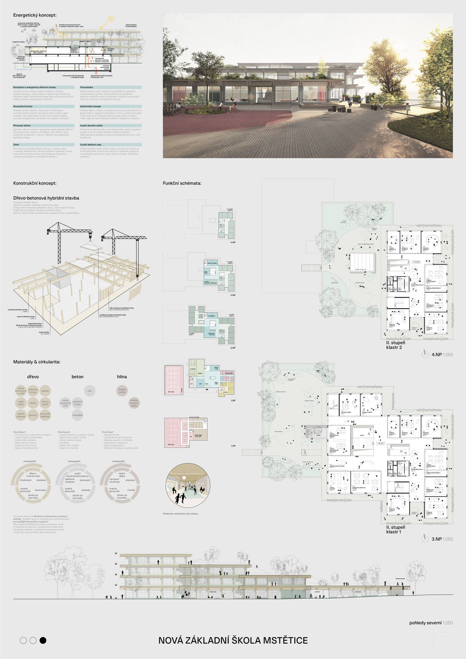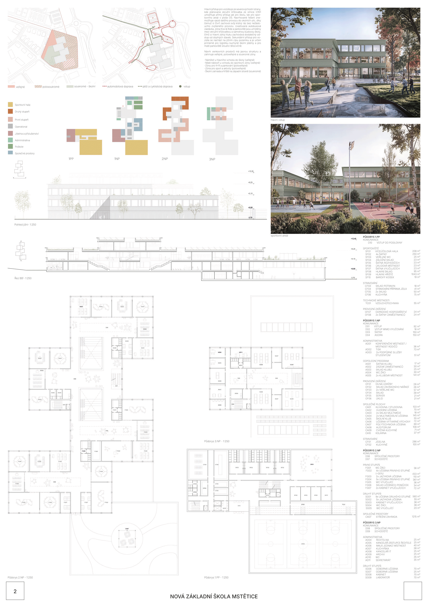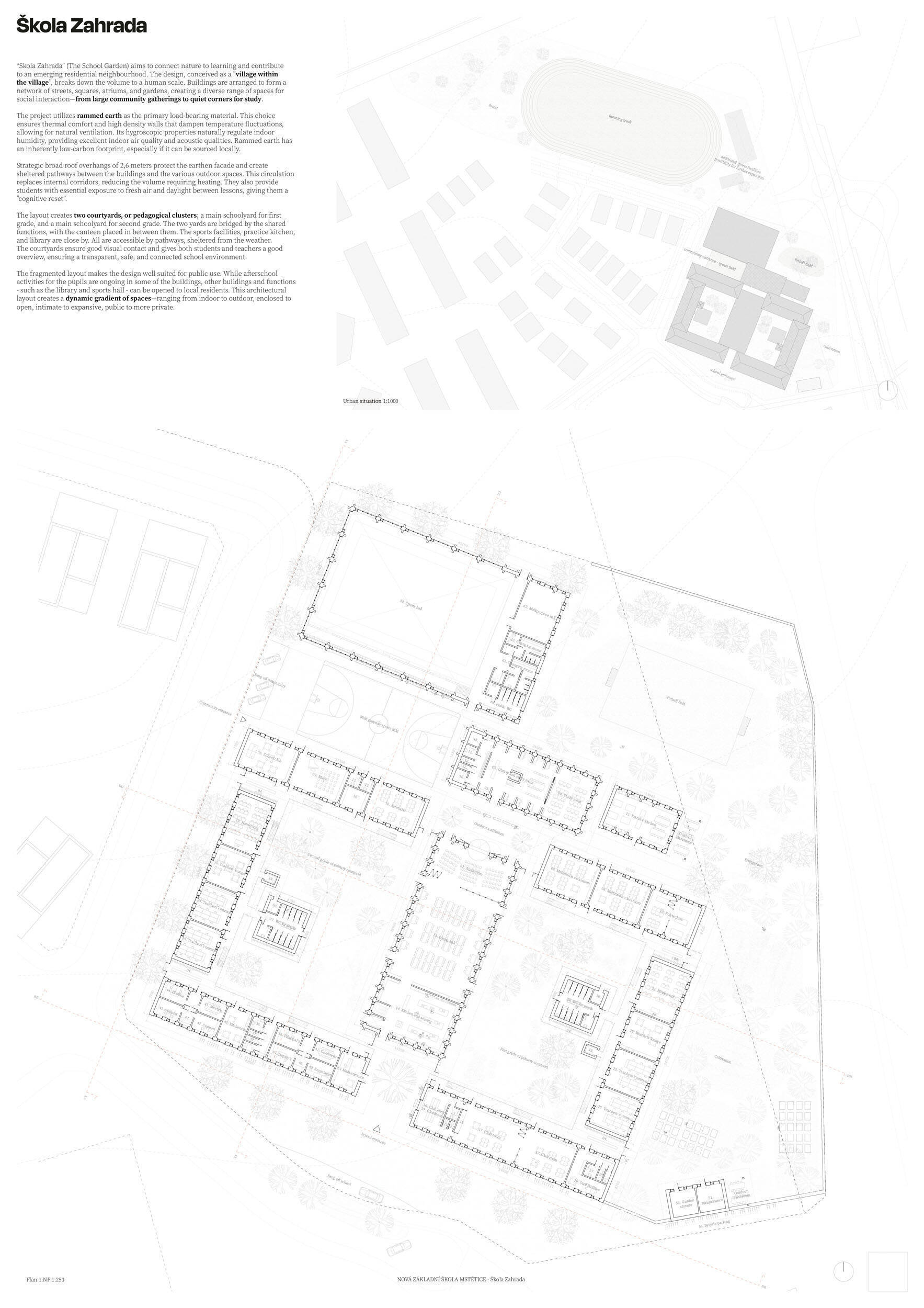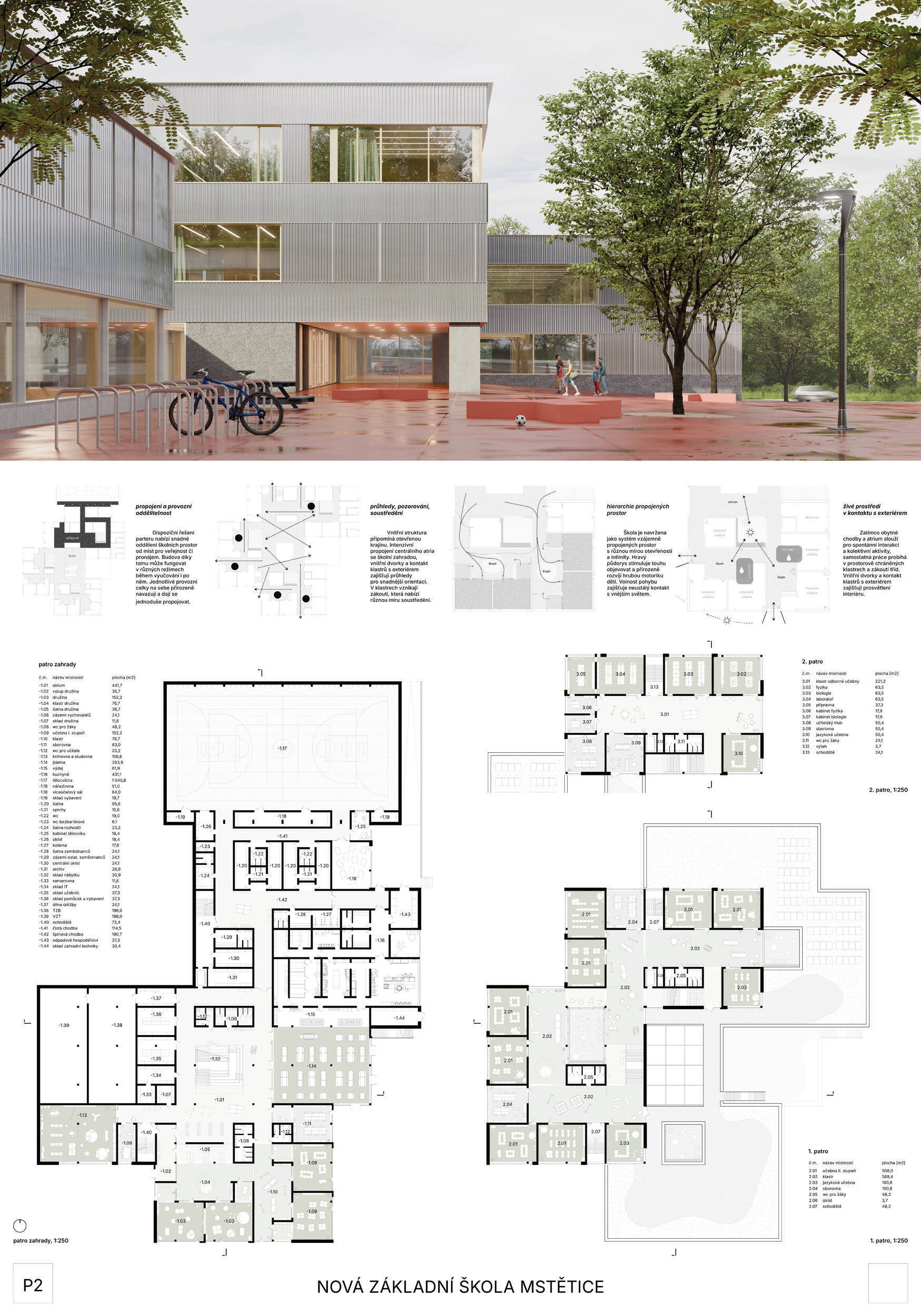 Návrh je velmi dobře propojen se širším územím a logicky navazuje na územní studii Zeleneč, čímž respektuje širší kontext rozvoje obce. Porota pozitivně hodnotí navržený půdorys, který tvoří kompaktní a přehledně organizovaný celek. Vhodné natočení objektu a promyšlené tvarování hmoty umožňuje, aby ze západní strany, otevírající se směrem k novému rozvojovému centru, vedly veřejné vstupy jak do školy, tak do tělocvičny a odborných učeben, čímž vzniká přirozené propojení objektu s veřejným prostranstvím a školní halou, což podporuje intuitivní orientaci a snadný přístup návštěvníků. Naopak vstup do družiny je situován spíše diskrétně, v zahradní části areálu, což odpovídá požadavku na klid a bezpečí dětí. Parkování je soustředěno v jižní části podél silnice, zatímco zóna K+R je umístěna v před prostoru školy, čímž se efektivně eliminuje potřeba velké plochy parkoviště a minimalizuje dopad automobilového provozu na školní prostředí. Mezi silné stránky návrhu patří funkčně řešená celková vnitřní dispozice a jasné provozní vazby jednotlivých částí budovy na školní zahradu, přístupové trasy i zásobovací a obslužné body. Oceňujeme architektonické členění stavby do několika dílčích objemů, které umožňuje zachovat prostornou a funkční školní zahradu. Autoři návrhu skutečně vytvořili veřejně přístupnou školu, která může sloužit jako centrum komunitních a kulturních aktivit. Další silnou stránkou je vnitřní uspořádání klastrů, které jsou strategicky umístěny na konci společných prostor a využívají přirozeného světla, čímž podporují pohodlí žáků a kvalitu výuky.