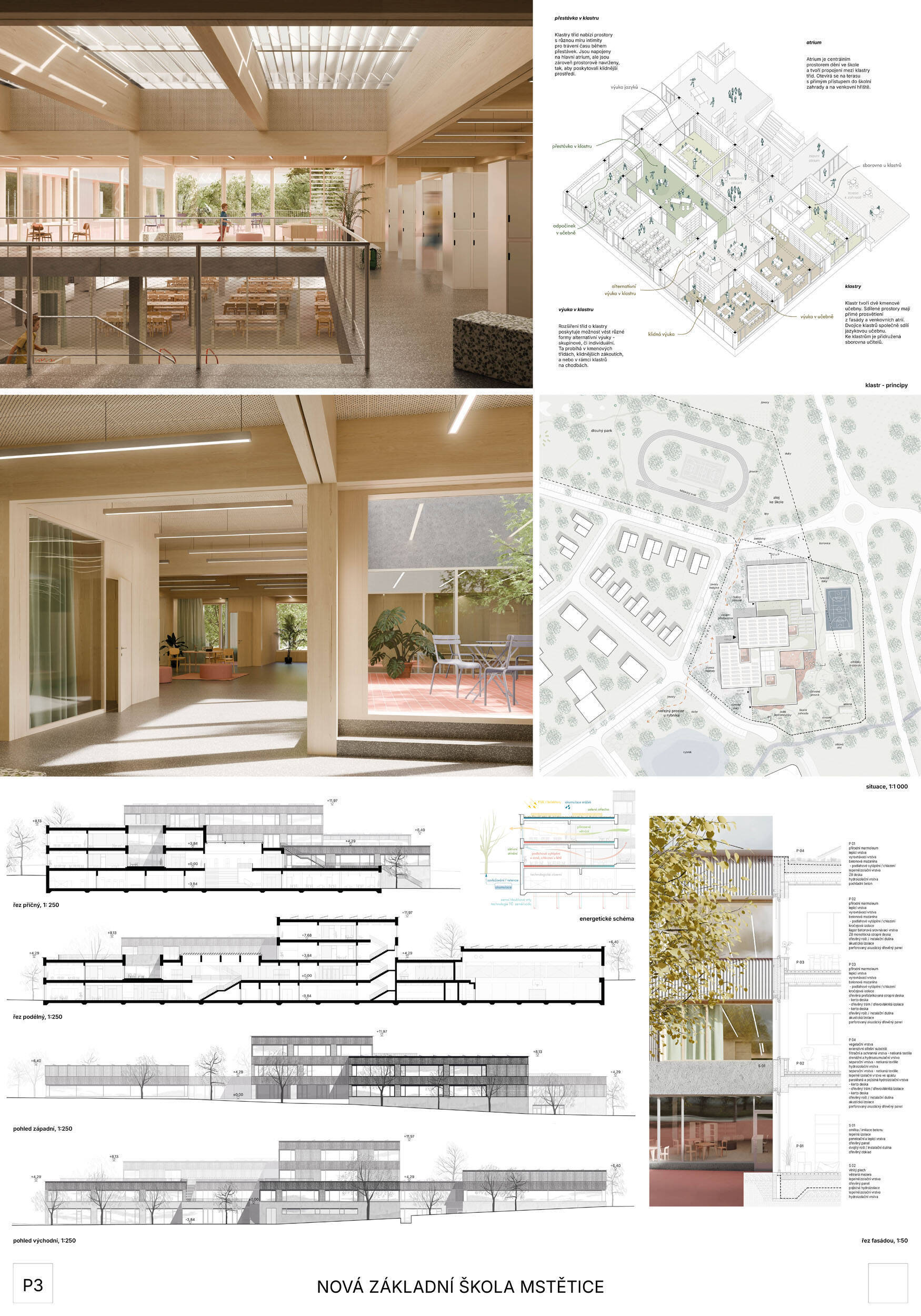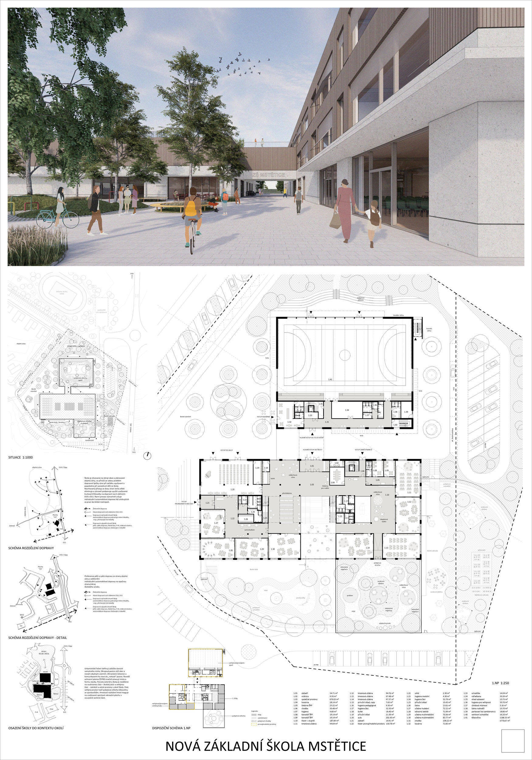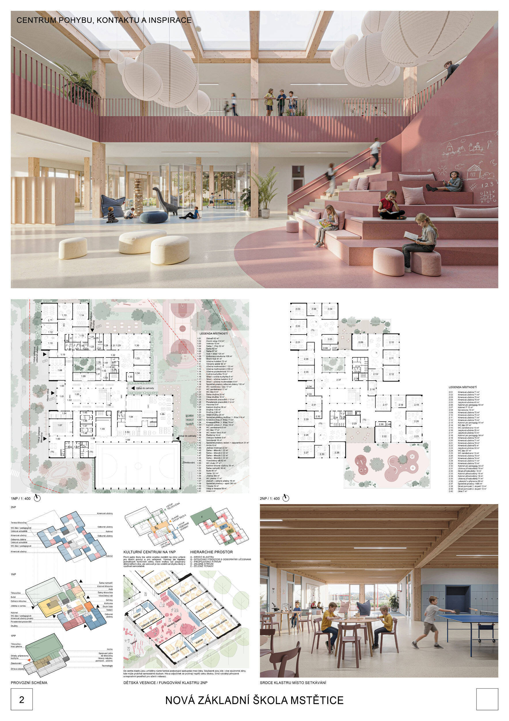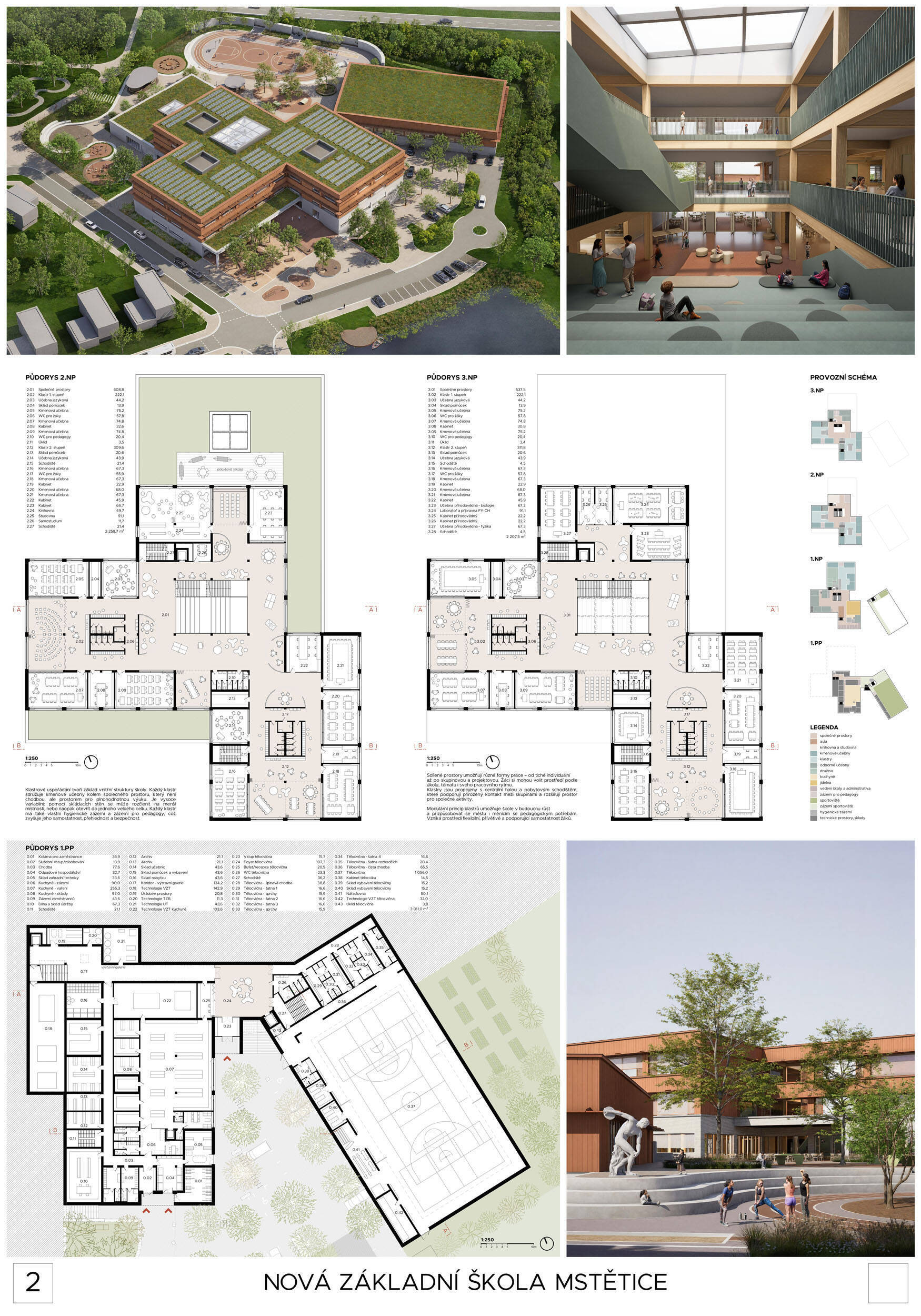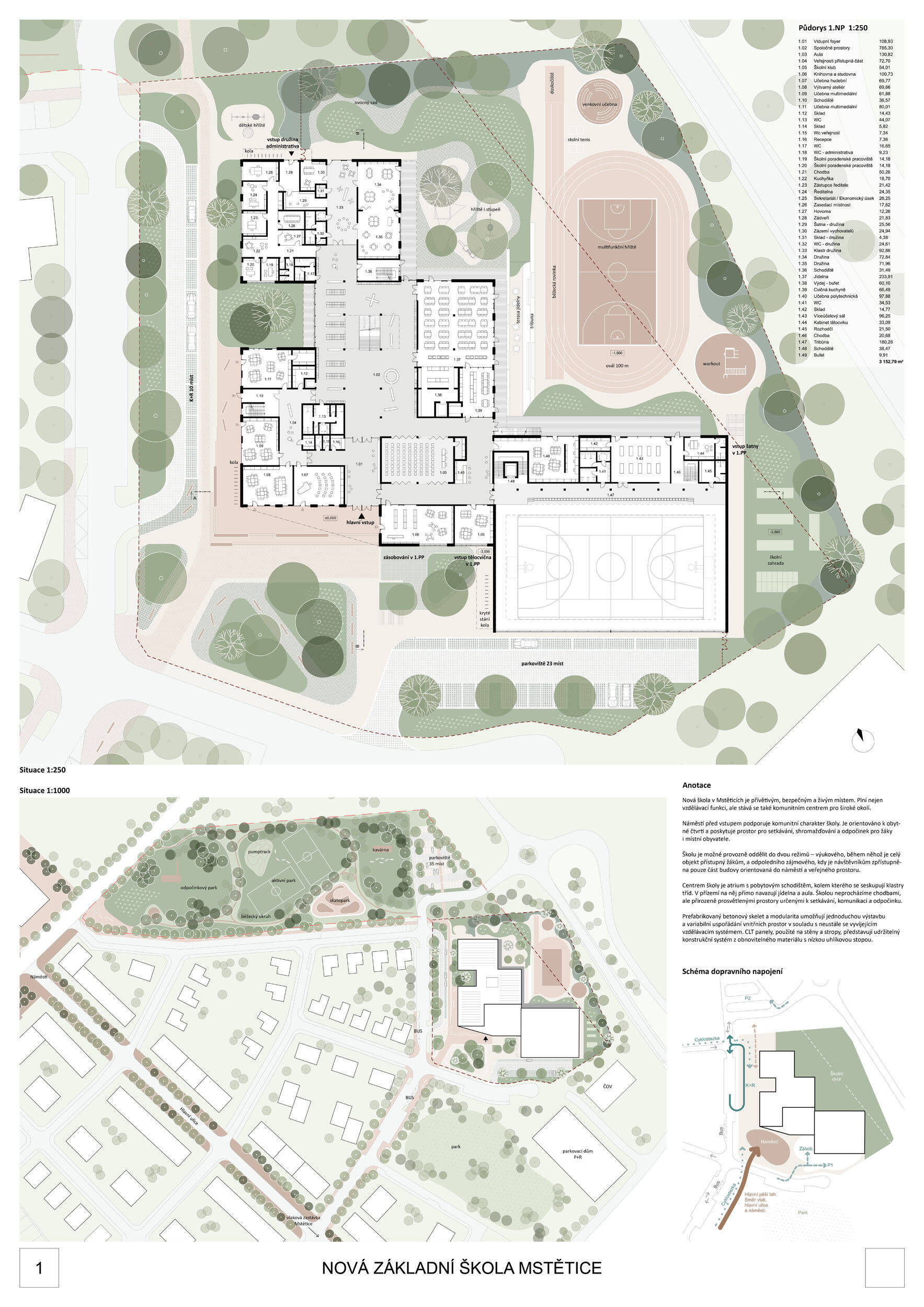 Návrh je velmi dobře propojen se širším územím a logicky navazuje na územní studii Zeleneč, čímž respektuje širší kontext rozvoje obce. Porota pozitivně hodnotí navržený půdorys, který tvoří kompaktní a přehledně organizovaný celek. Vhodné natočení objektu a promyšlené tvarování hmoty umožňuje, aby ze západní strany, otevírající se směrem k novému rozvojovému centru, vedly veřejné vstupy jak do školy, tak do tělocvičny a odborných učeben, čímž vzniká přirozené propojení objektu s veřejným prostranstvím a školní halou, což podporuje intuitivní orientaci a snadný přístup návštěvníků. Naopak vstup do družiny je situován spíše diskrétně, v zahradní části areálu, což odpovídá požadavku na klid a bezpečí dětí. Parkování je soustředěno v jižní části podél silnice, zatímco zóna K+R je umístěna v před prostoru školy, čímž se efektivně eliminuje potřeba velké plochy parkoviště a minimalizuje dopad automobilového provozu na školní prostředí. Mezi silné stránky návrhu patří funkčně řešená celková vnitřní dispozice a jasné provozní vazby jednotlivých částí budovy na školní zahradu, přístupové trasy i zásobovací a obslužné body. Oceňujeme architektonické členění stavby do několika dílčích objemů, které umožňuje zachovat prostornou a funkční školní zahradu. Autoři návrhu skutečně vytvořili veřejně přístupnou školu, která může sloužit jako centrum komunitních a kulturních aktivit. Další silnou stránkou je vnitřní uspořádání klastrů, které jsou strategicky umístěny na konci společných prostor a využívají přirozeného světla, čímž podporují pohodlí žáků a kvalitu výuky.