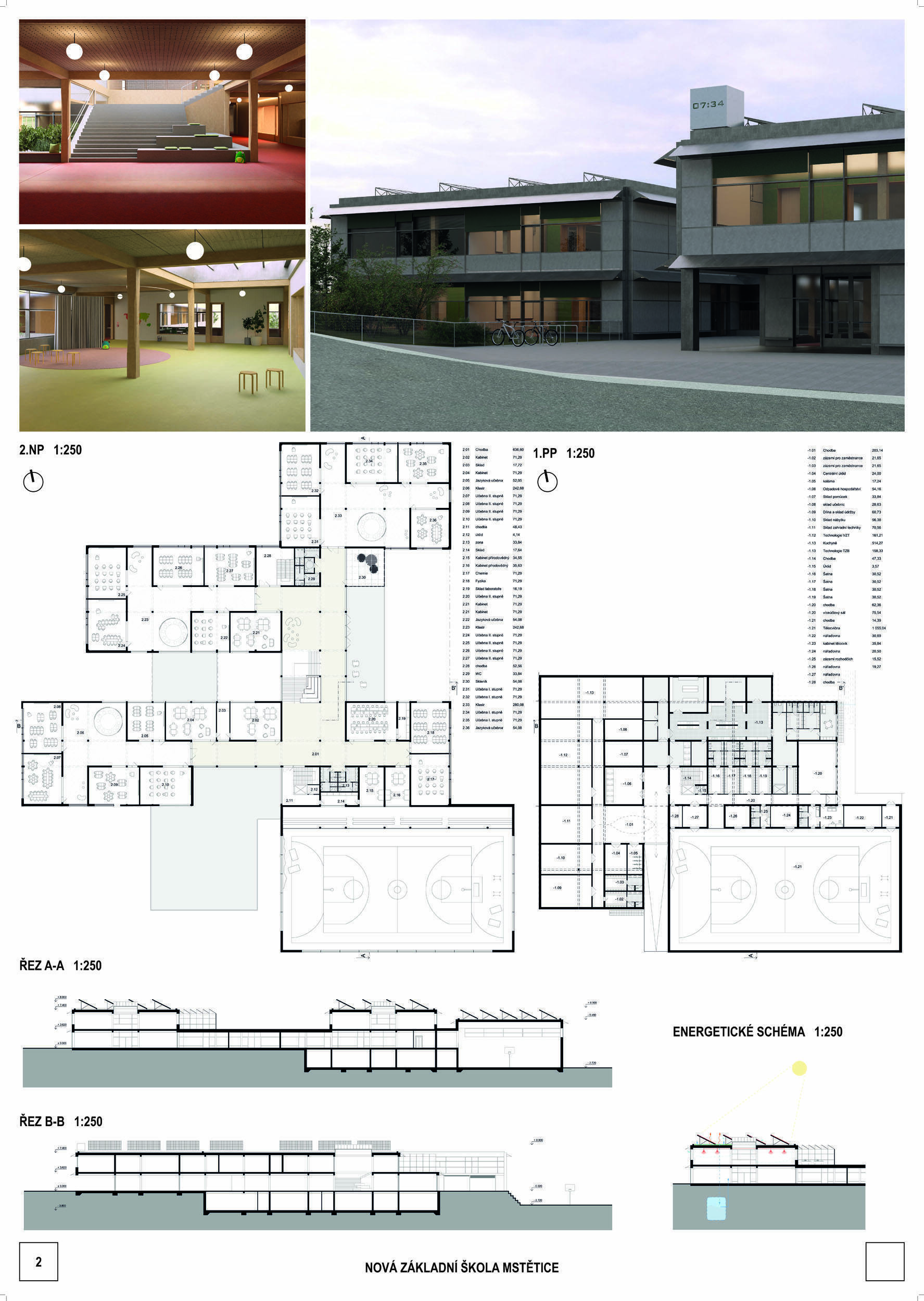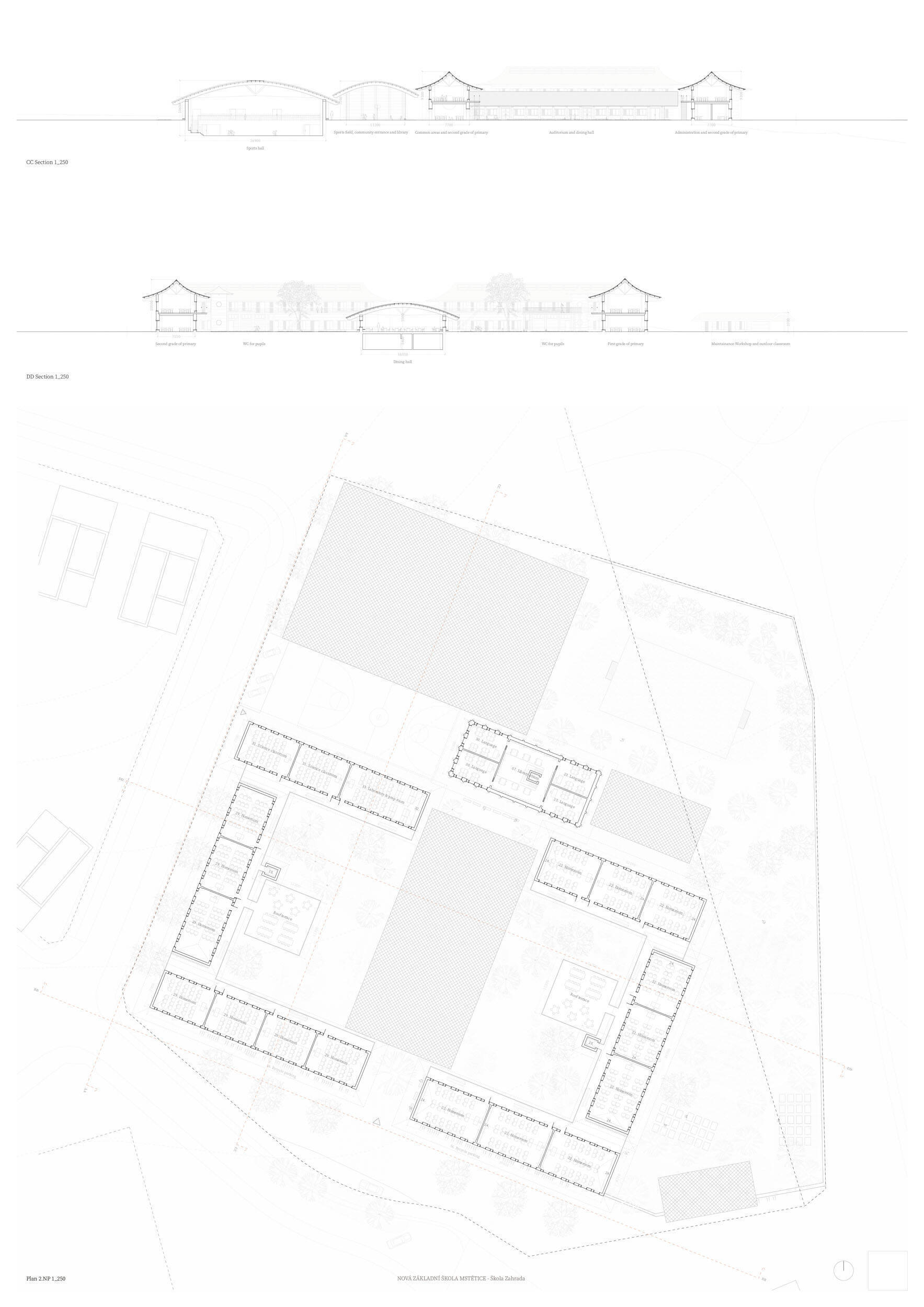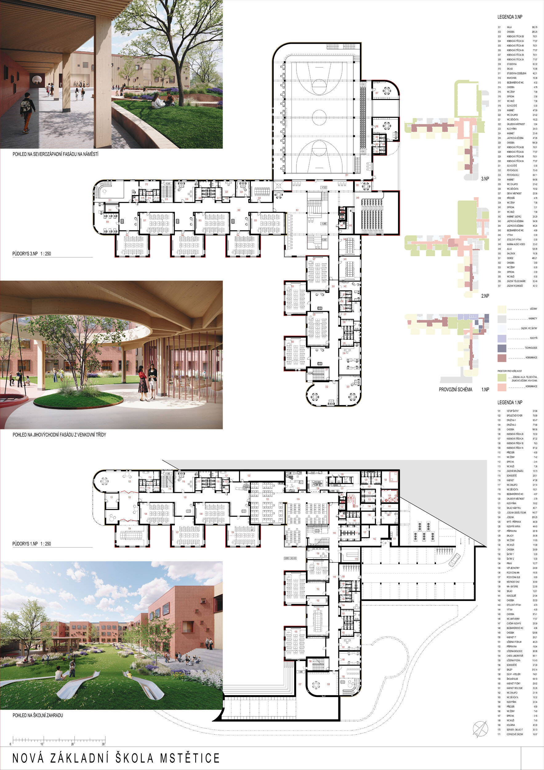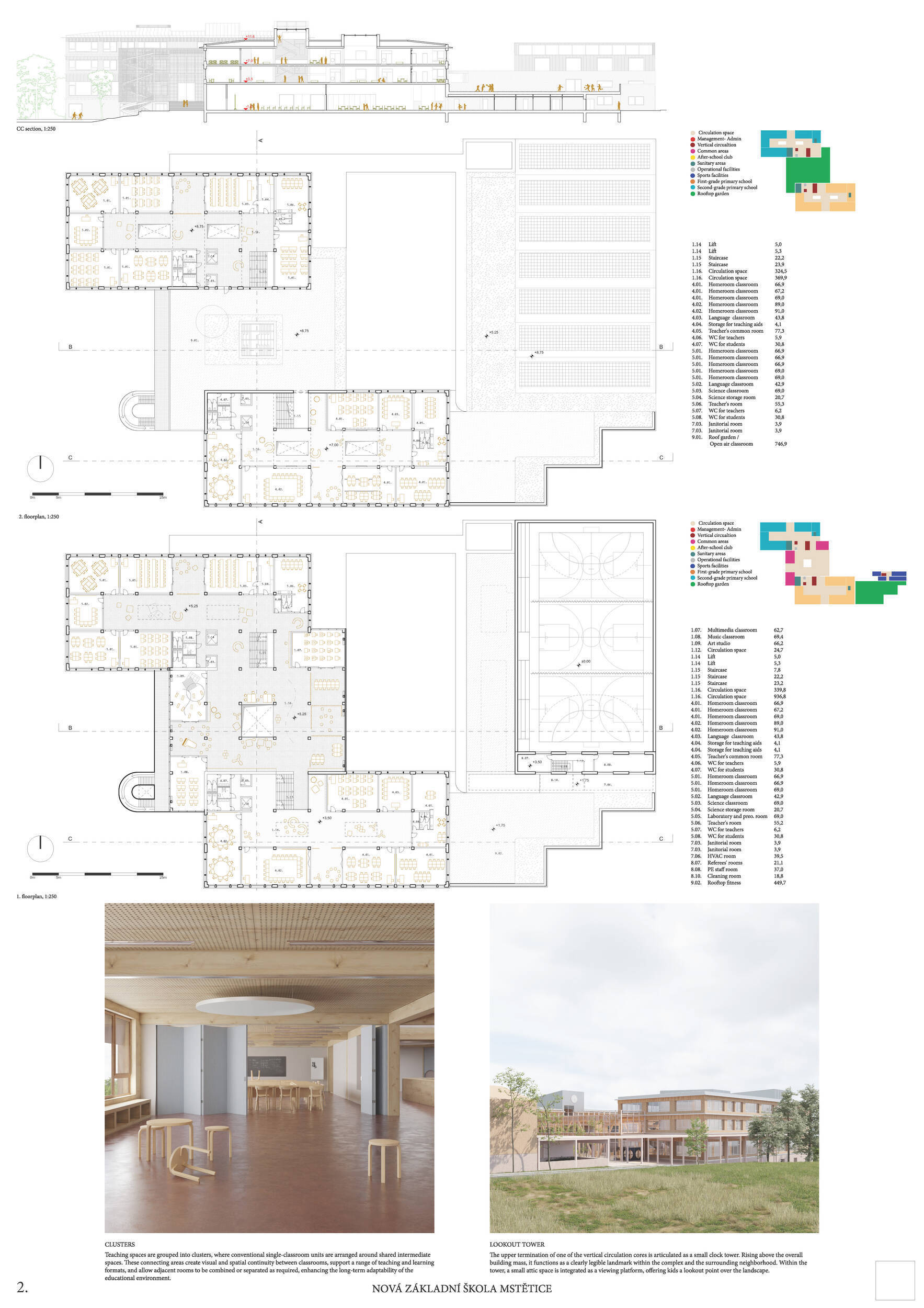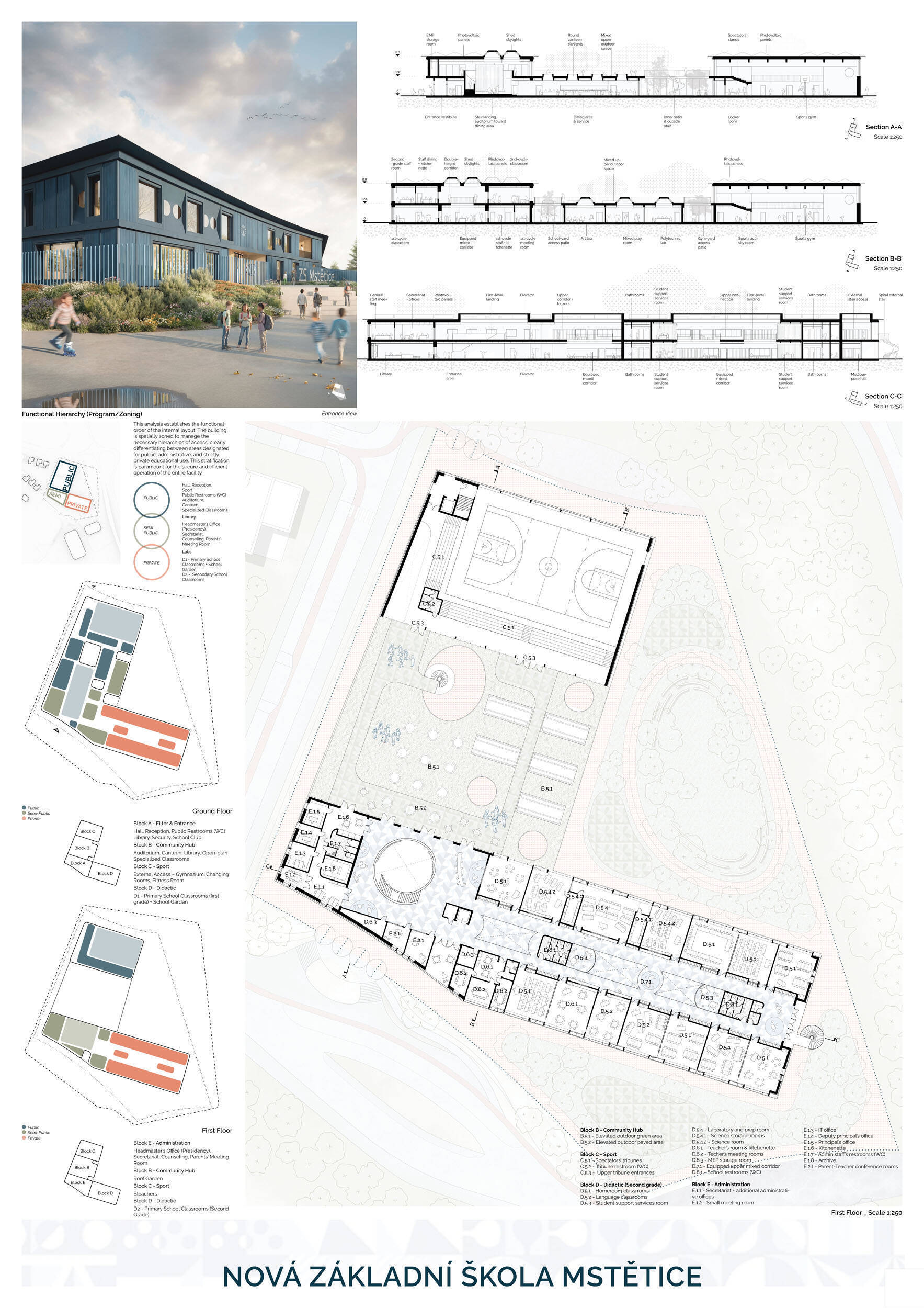 Návrh je velmi dobře propojen se širším územím a logicky navazuje na územní studii Zeleneč, čímž respektuje širší kontext rozvoje obce. Porota pozitivně hodnotí navržený půdorys, který tvoří kompaktní a přehledně organizovaný celek. Vhodné natočení objektu a promyšlené tvarování hmoty umožňuje, aby ze západní strany, otevírající se směrem k novému rozvojovému centru, vedly veřejné vstupy jak do školy, tak do tělocvičny a odborných učeben, čímž vzniká přirozené propojení objektu s veřejným prostranstvím a školní halou, což podporuje intuitivní orientaci a snadný přístup návštěvníků. Naopak vstup do družiny je situován spíše diskrétně, v zahradní části areálu, což odpovídá požadavku na klid a bezpečí dětí. Parkování je soustředěno v jižní části podél silnice, zatímco zóna K+R je umístěna v před prostoru školy, čímž se efektivně eliminuje potřeba velké plochy parkoviště a minimalizuje dopad automobilového provozu na školní prostředí. Mezi silné stránky návrhu patří funkčně řešená celková vnitřní dispozice a jasné provozní vazby jednotlivých částí budovy na školní zahradu, přístupové trasy i zásobovací a obslužné body. Oceňujeme architektonické členění stavby do několika dílčích objemů, které umožňuje zachovat prostornou a funkční školní zahradu. Autoři návrhu skutečně vytvořili veřejně přístupnou školu, která může sloužit jako centrum komunitních a kulturních aktivit. Další silnou stránkou je vnitřní uspořádání klastrů, které jsou strategicky umístěny na konci společných prostor a využívají přirozeného světla, čímž podporují pohodlí žáků a kvalitu výuky.