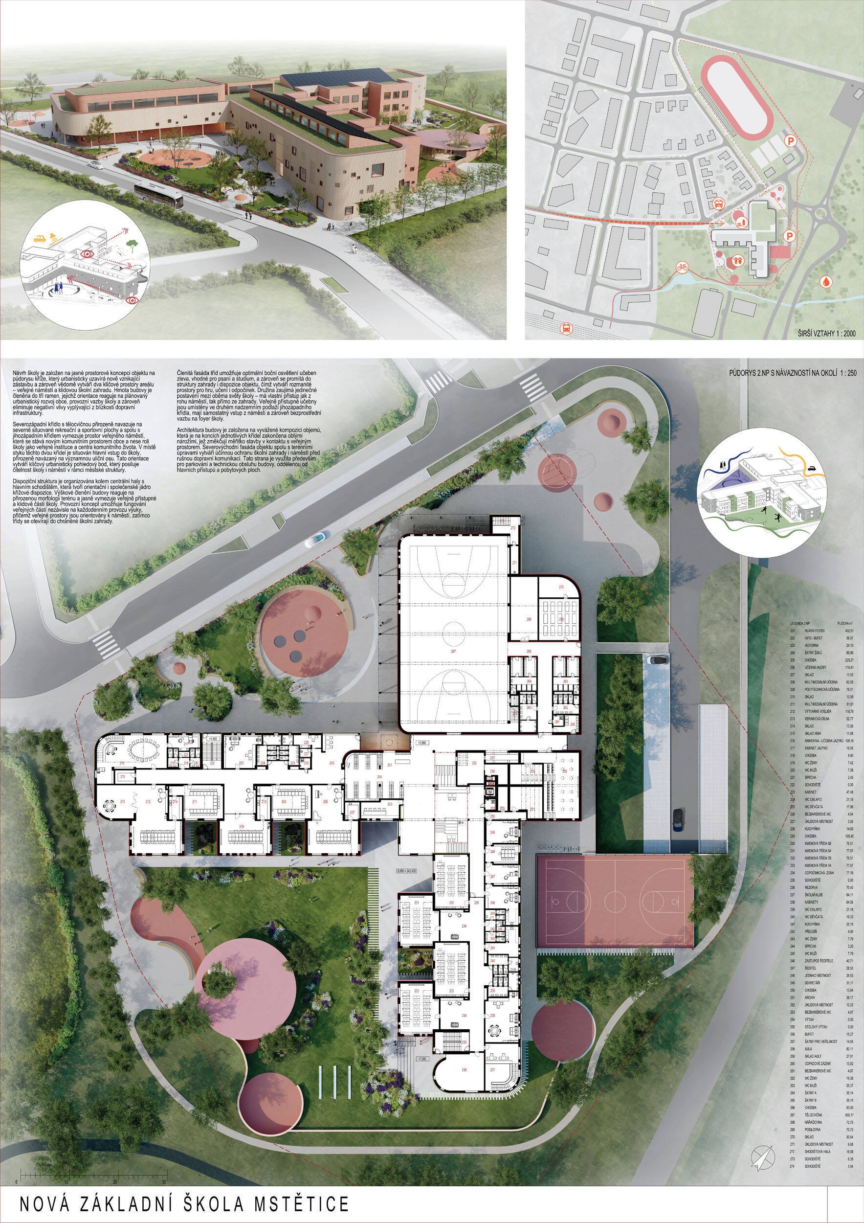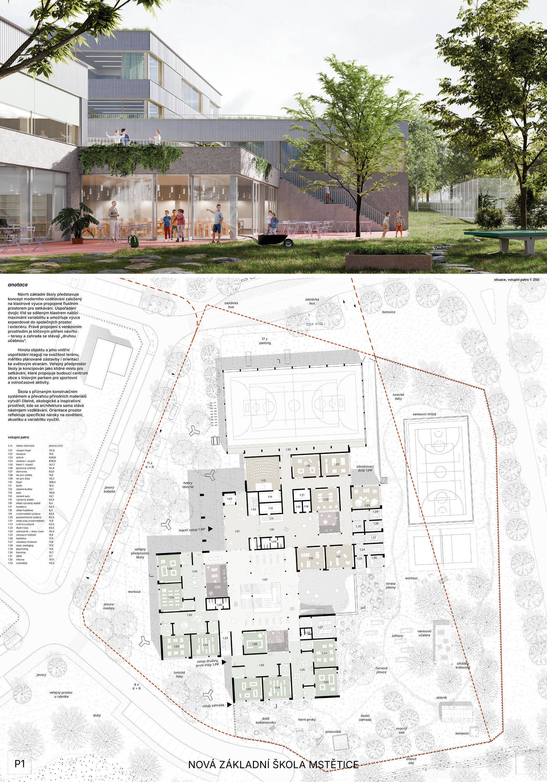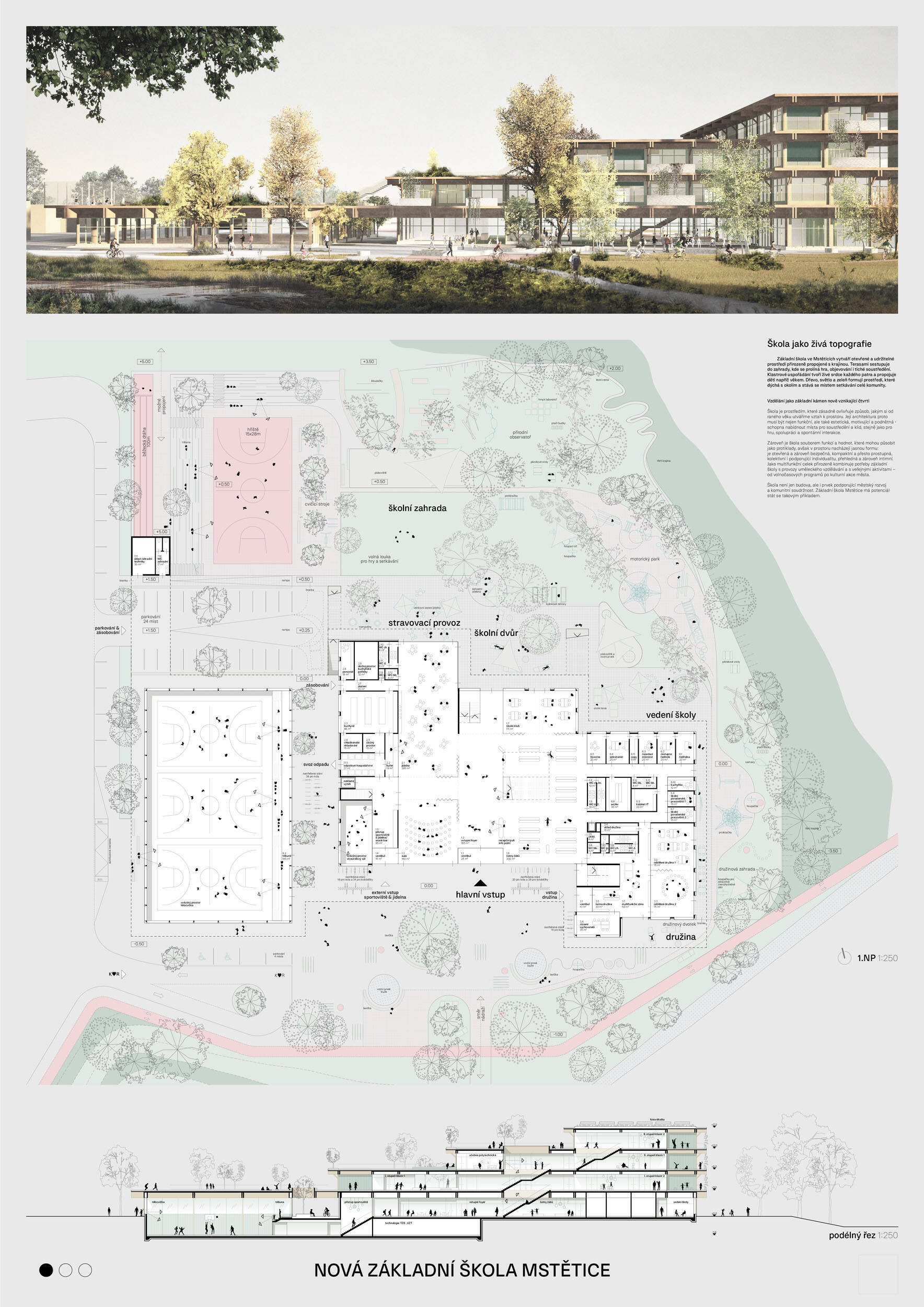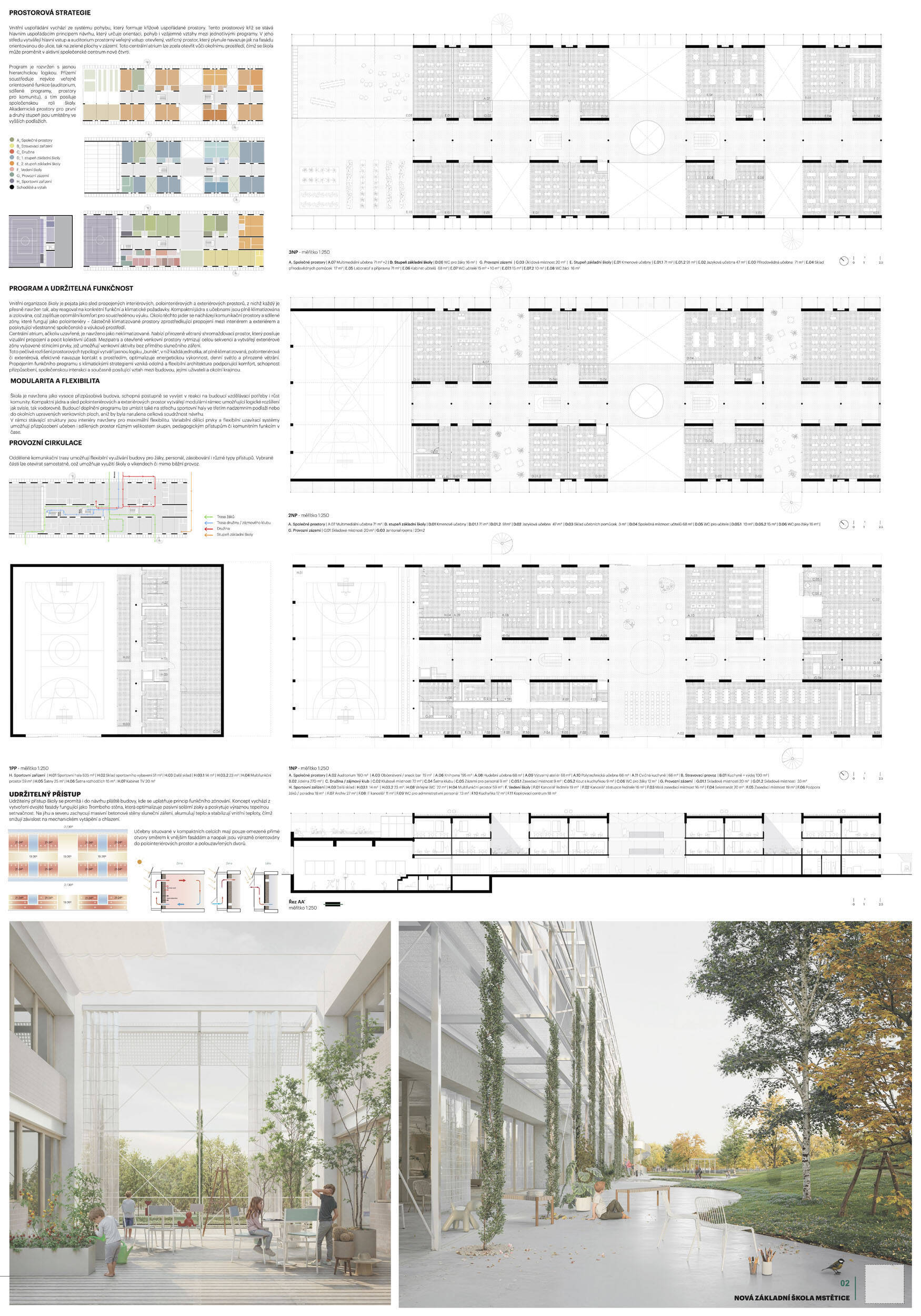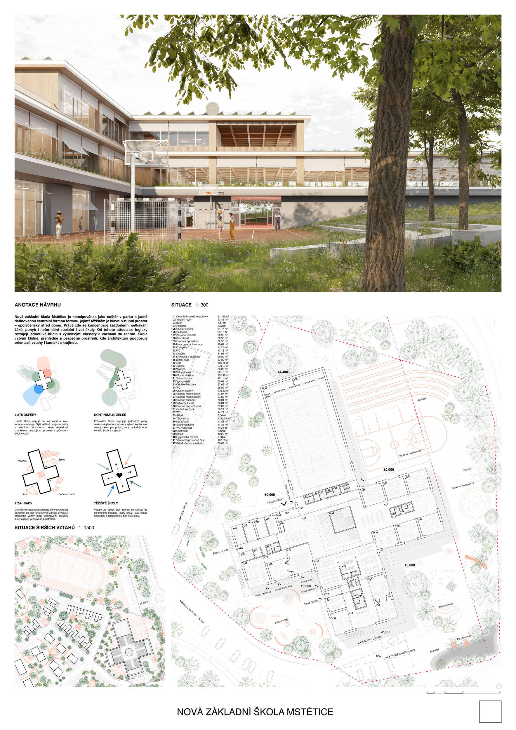 V rámci širšího kontextu návrh vhodně pracuje s odstupem od budoucí zástavby rodinných domů. Veřejný prostor je pečlivě navržen a vybízí ke komfortnímu pobytu ve stínu stromů, jak pro uživatele objektu, tak pro kolemjdoucí. Díky zvolené orientaci navržené hmoty zbývá na pozemku dostatek místa pro školní zahradu. Ta je přístupná z hlavních komunikací, ale lze do ní vstoupit i z jídelny, což porota ocenila. Zahrada navíc poskytuje logické členění. Klastry a společné prostory jsou navrženy přehledně, poskytují žádoucí různorodost a denní světlo. Díky centrální hale jsou pak minimalizovány provozní vzdálenosti. Návrh celkově vykazuje značnou míru propracovanosti na mnoha úrovních, včetně chráněných únikových cest. To v podrobnosti soutěžní studie není samozřejmostí. Jako kultivovaný a realizovatelný spatřovala porota také fasádní plášť včetně elegantního límce nad hlavním vstupem. Příjemné je i předložené barevné schéma řízeně patinované dřevěné fasády, zelených výplní otvorů a mobiliáře v korálovém odstínu. Slabinou projektu je sloučení zásobo-vání gastro provozu a vstupu do tělocvičny pro veřejnost.