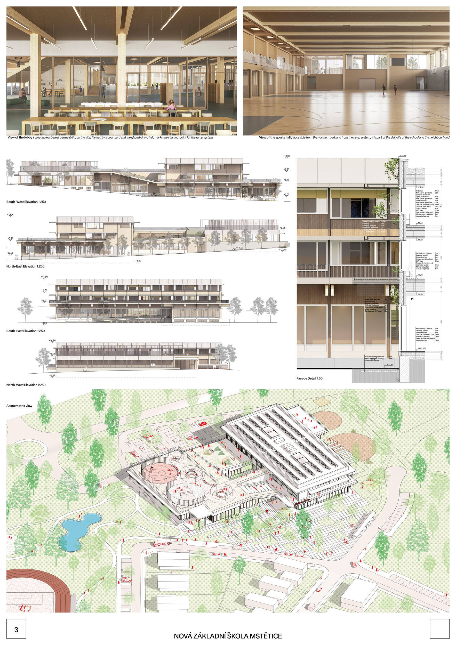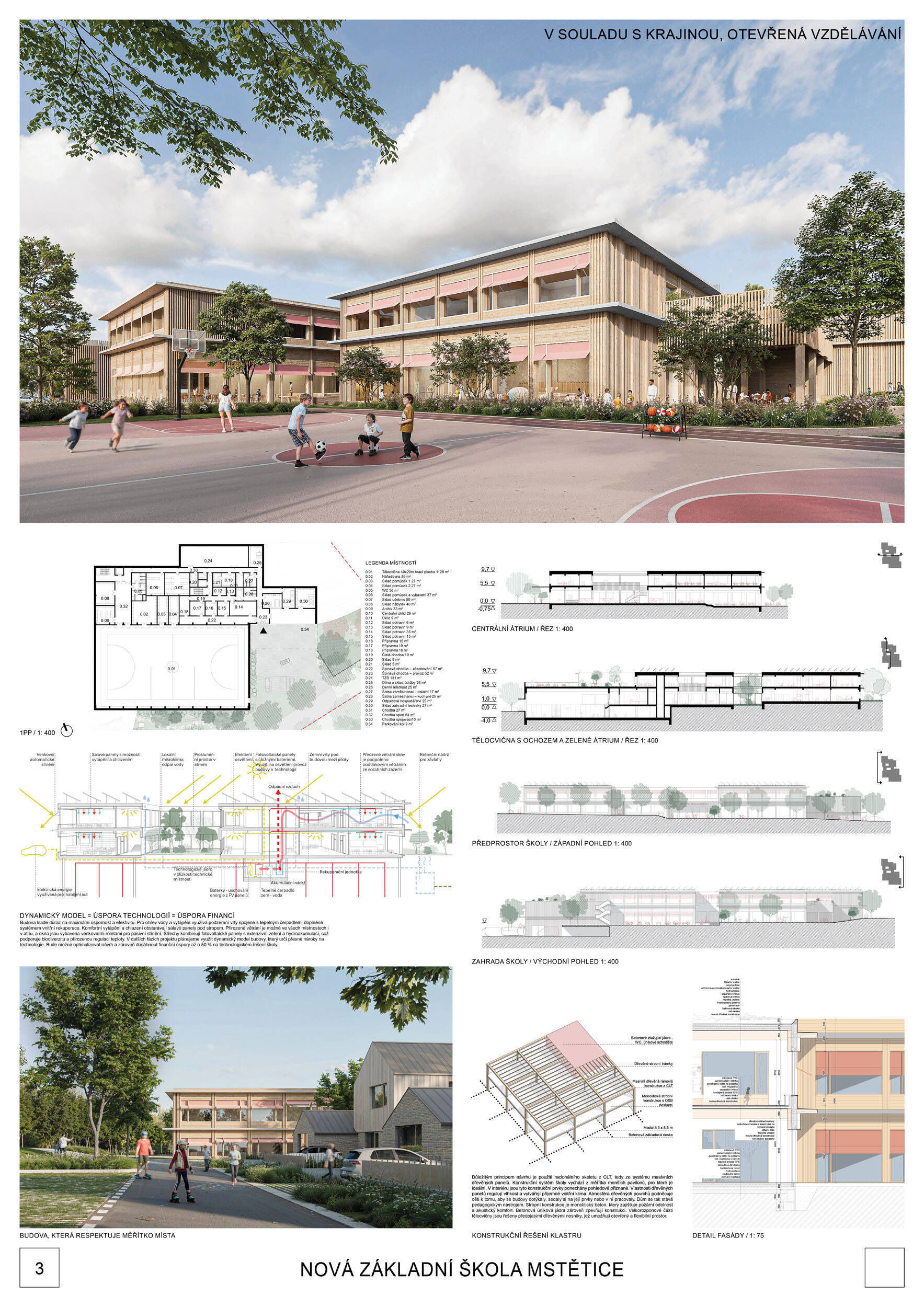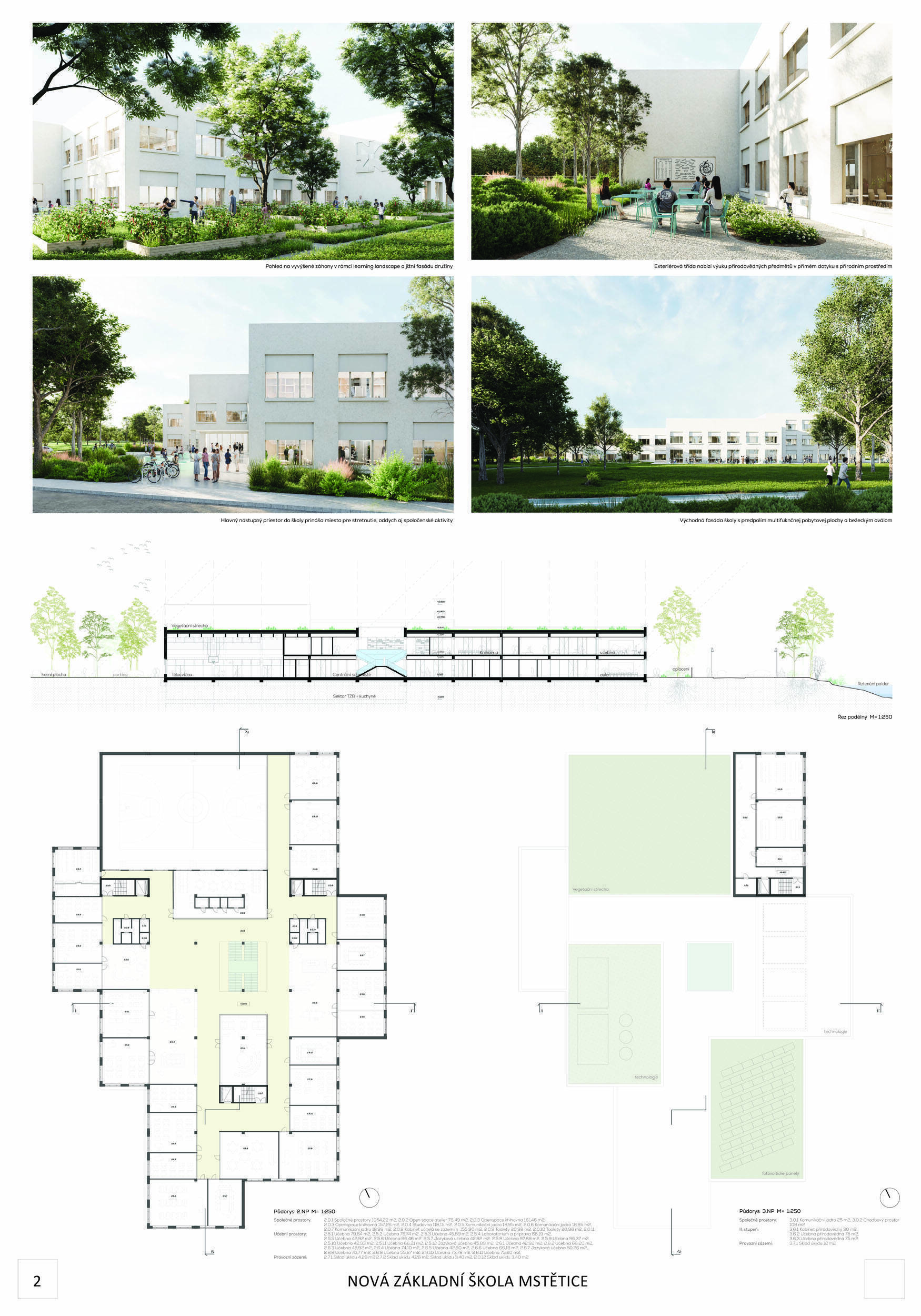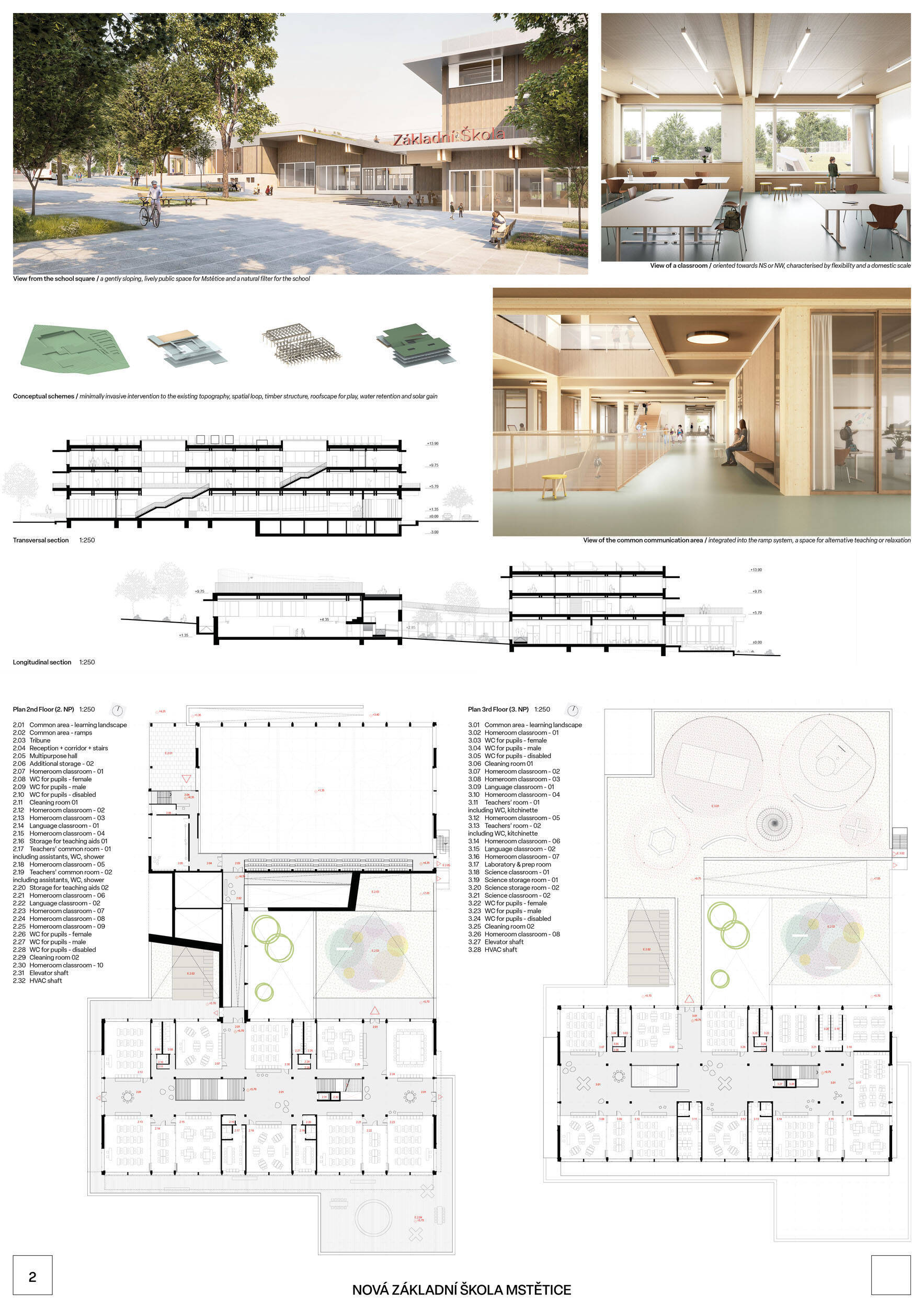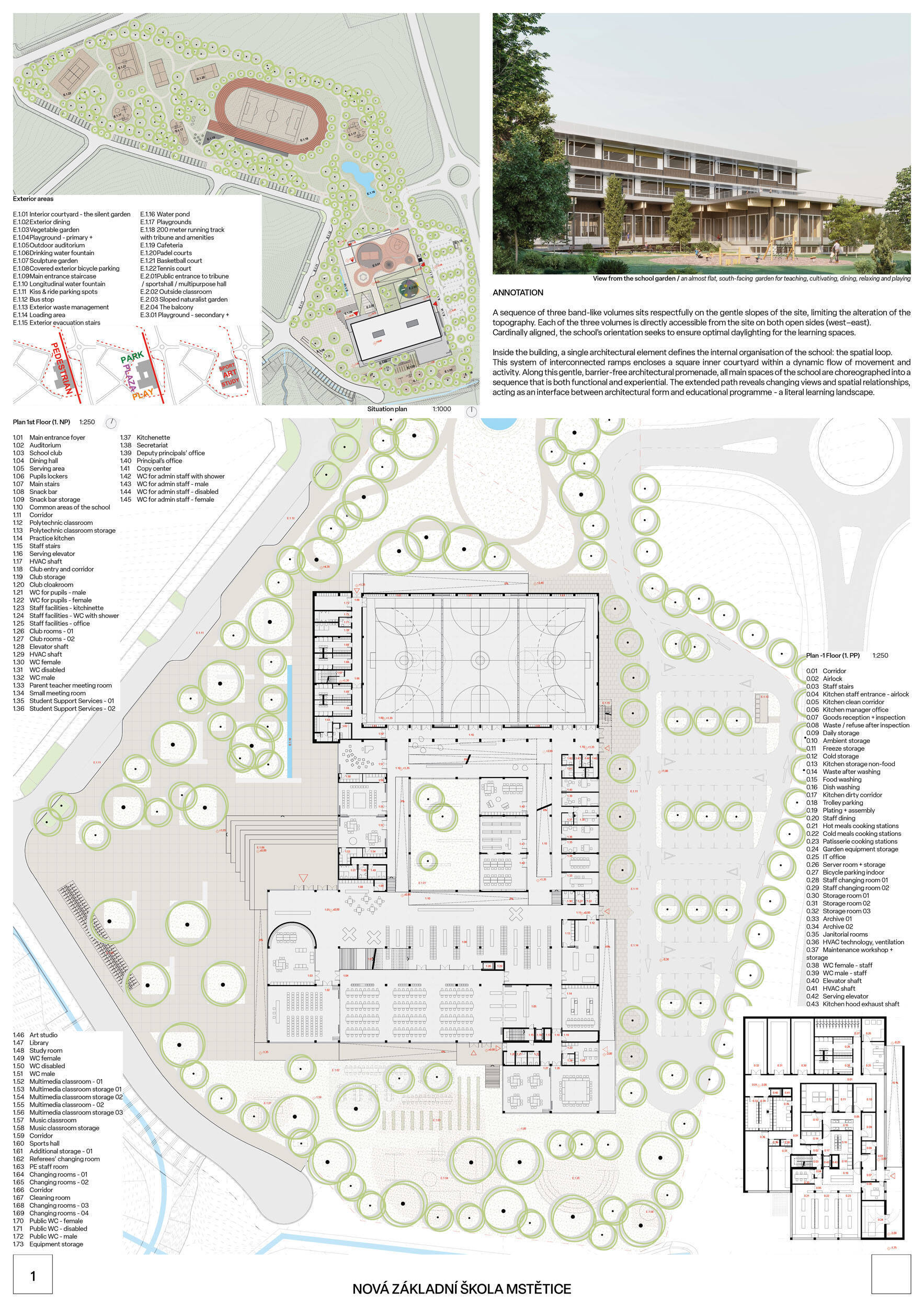 V rámci širšího kontextu návrh vhodně pracuje s odstupem od budoucí zástavby rodinných domů. Veřejný prostor je pečlivě navržen a vybízí ke komfortnímu pobytu ve stínu stromů, jak pro uživatele objektu, tak pro kolemjdoucí. Díky zvolené orientaci navržené hmoty zbývá na pozemku dostatek místa pro školní zahradu. Ta je přístupná z hlavních komunikací, ale lze do ní vstoupit i z jídelny, což porota ocenila. Zahrada navíc poskytuje logické členění. Klastry a společné prostory jsou navrženy přehledně, poskytují žádoucí různorodost a denní světlo. Díky centrální hale jsou pak minimalizovány provozní vzdálenosti. Návrh celkově vykazuje značnou míru propracovanosti na mnoha úrovních, včetně chráněných únikových cest. To v podrobnosti soutěžní studie není samozřejmostí. Jako kultivovaný a realizovatelný spatřovala porota také fasádní plášť včetně elegantního límce nad hlavním vstupem. Příjemné je i předložené barevné schéma řízeně patinované dřevěné fasády, zelených výplní otvorů a mobiliáře v korálovém odstínu. Slabinou projektu je sloučení zásobo-vání gastro provozu a vstupu do tělocvičny pro veřejnost.