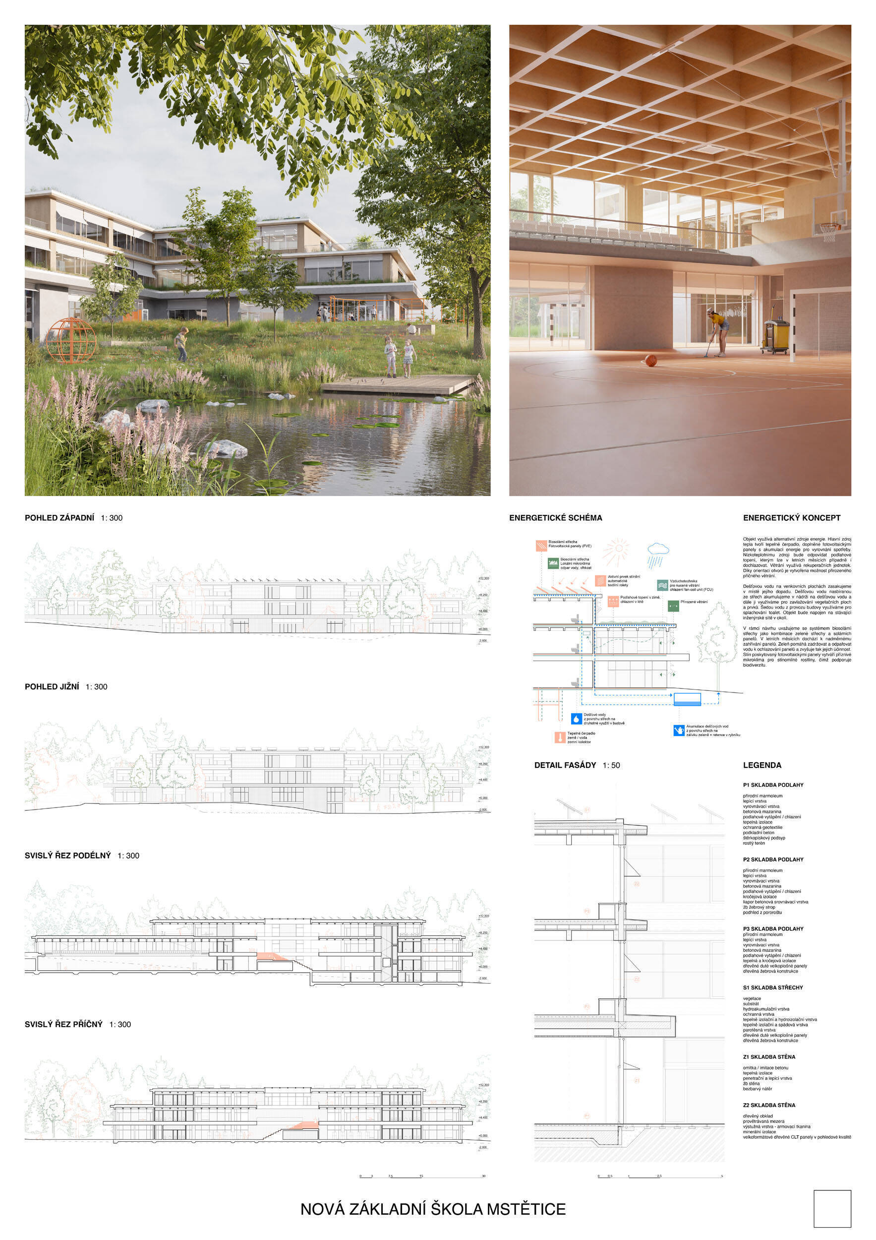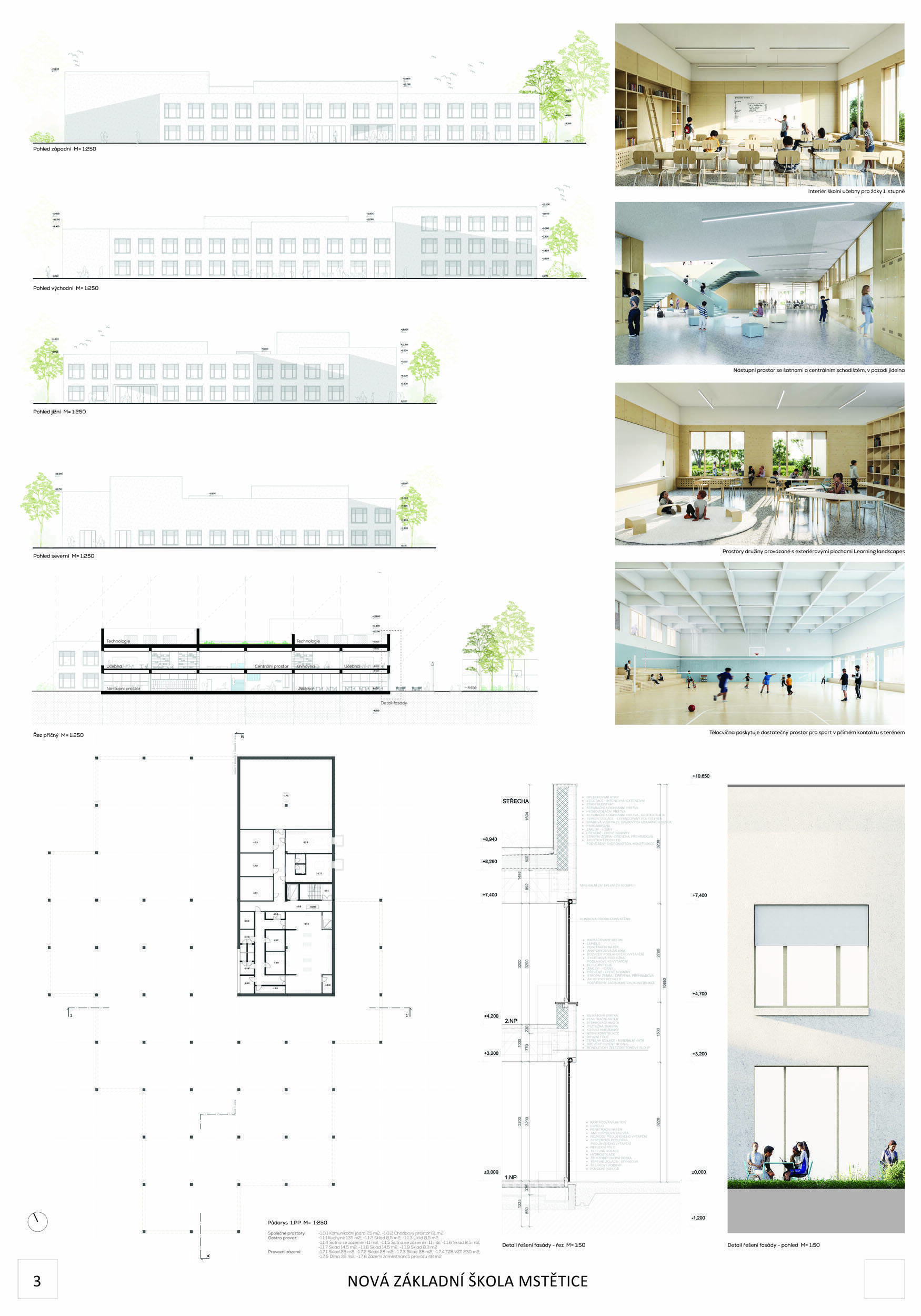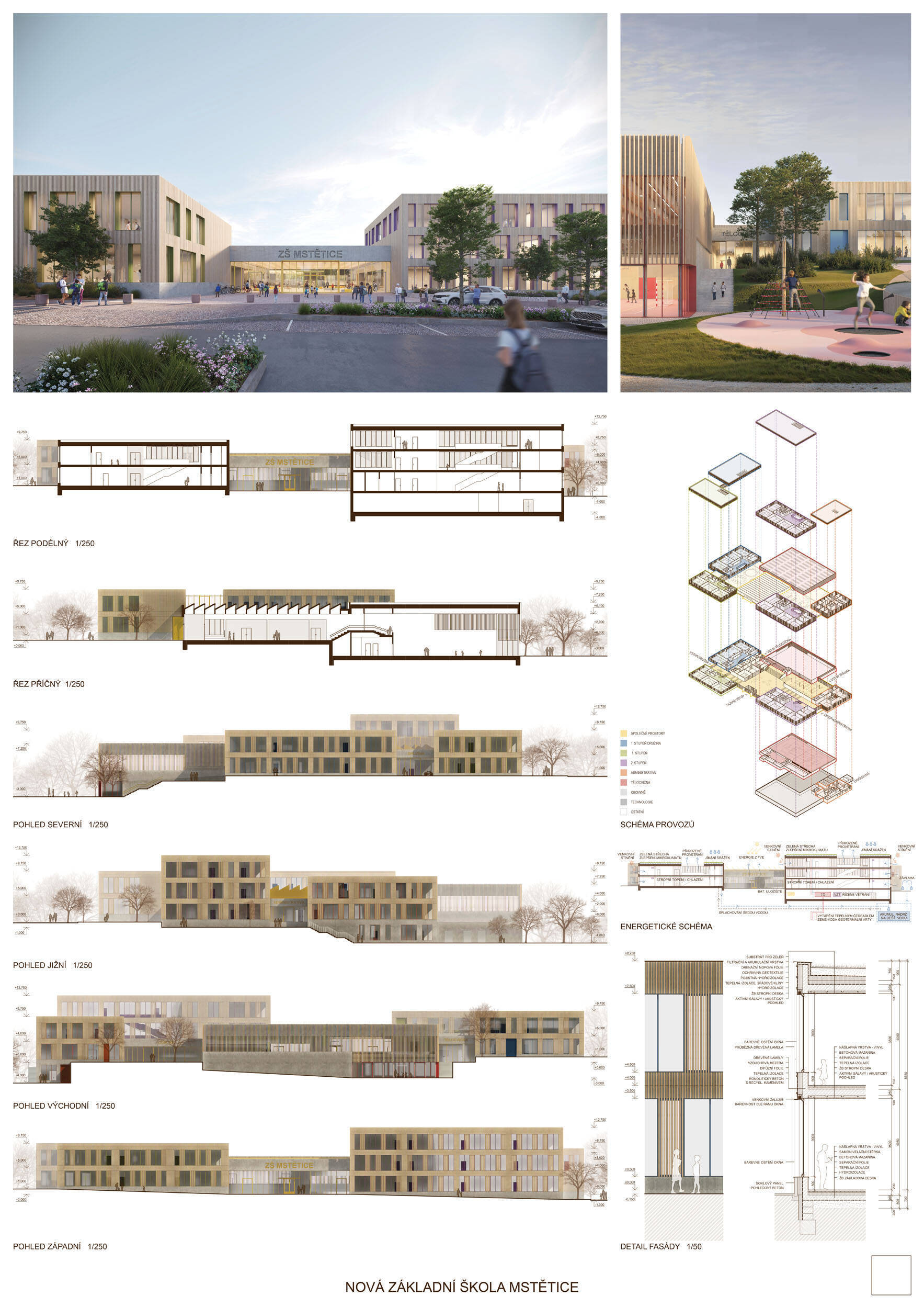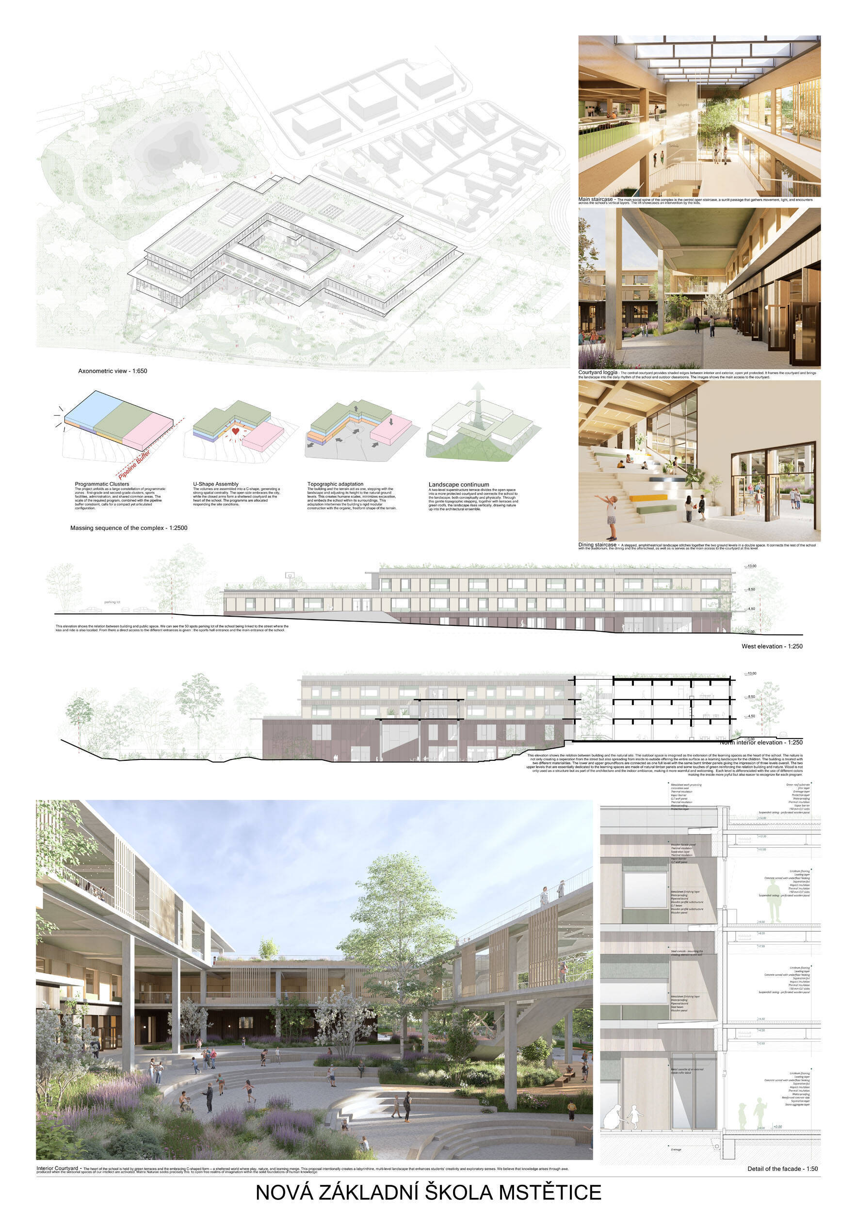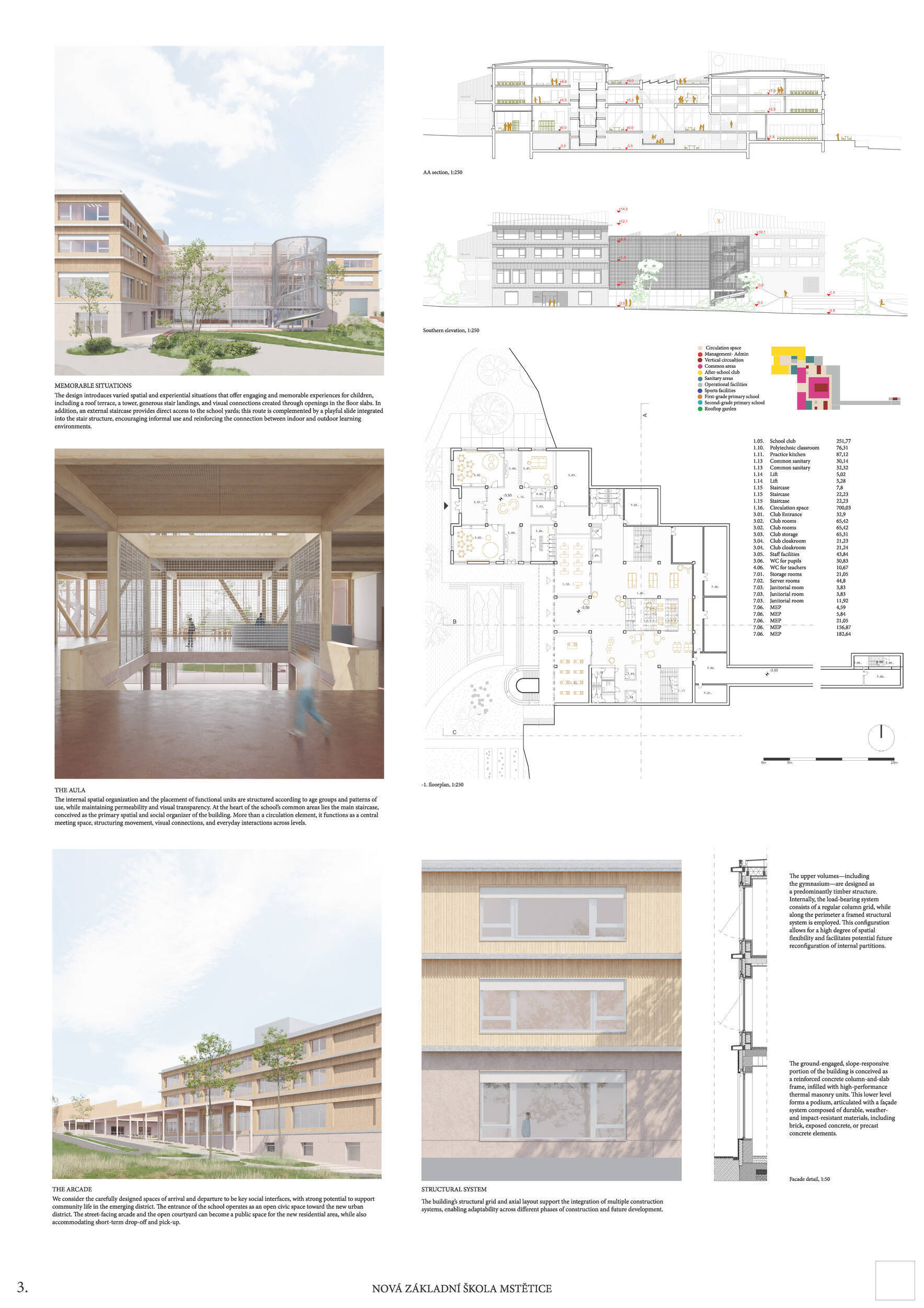 V rámci širšího kontextu návrh vhodně pracuje s odstupem od budoucí zástavby rodinných domů. Veřejný prostor je pečlivě navržen a vybízí ke komfortnímu pobytu ve stínu stromů, jak pro uživatele objektu, tak pro kolemjdoucí. Díky zvolené orientaci navržené hmoty zbývá na pozemku dostatek místa pro školní zahradu. Ta je přístupná z hlavních komunikací, ale lze do ní vstoupit i z jídelny, což porota ocenila. Zahrada navíc poskytuje logické členění. Klastry a společné prostory jsou navrženy přehledně, poskytují žádoucí různorodost a denní světlo. Díky centrální hale jsou pak minimalizovány provozní vzdálenosti. Návrh celkově vykazuje značnou míru propracovanosti na mnoha úrovních, včetně chráněných únikových cest. To v podrobnosti soutěžní studie není samozřejmostí. Jako kultivovaný a realizovatelný spatřovala porota také fasádní plášť včetně elegantního límce nad hlavním vstupem. Příjemné je i předložené barevné schéma řízeně patinované dřevěné fasády, zelených výplní otvorů a mobiliáře v korálovém odstínu. Slabinou projektu je sloučení zásobo-vání gastro provozu a vstupu do tělocvičny pro veřejnost.