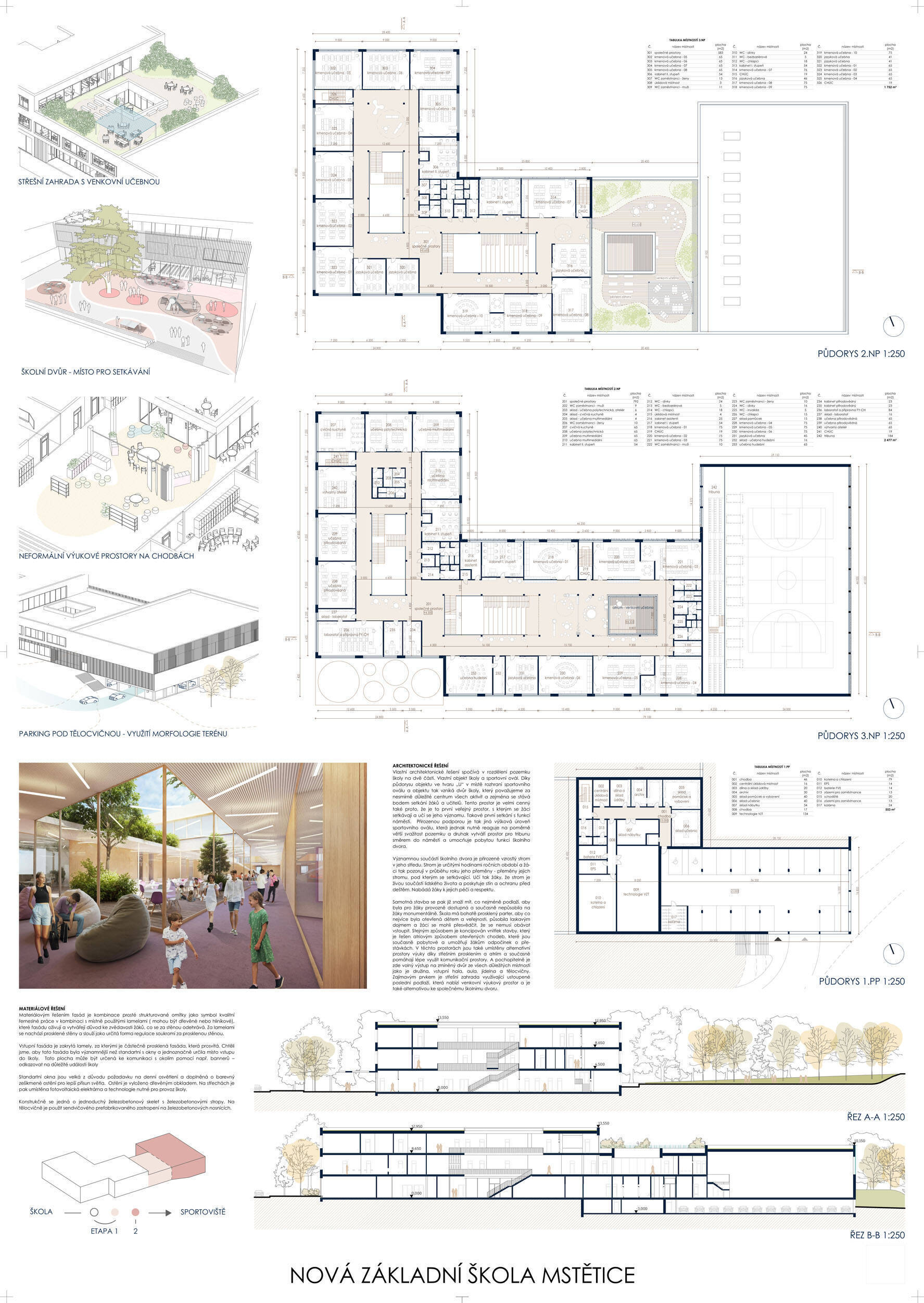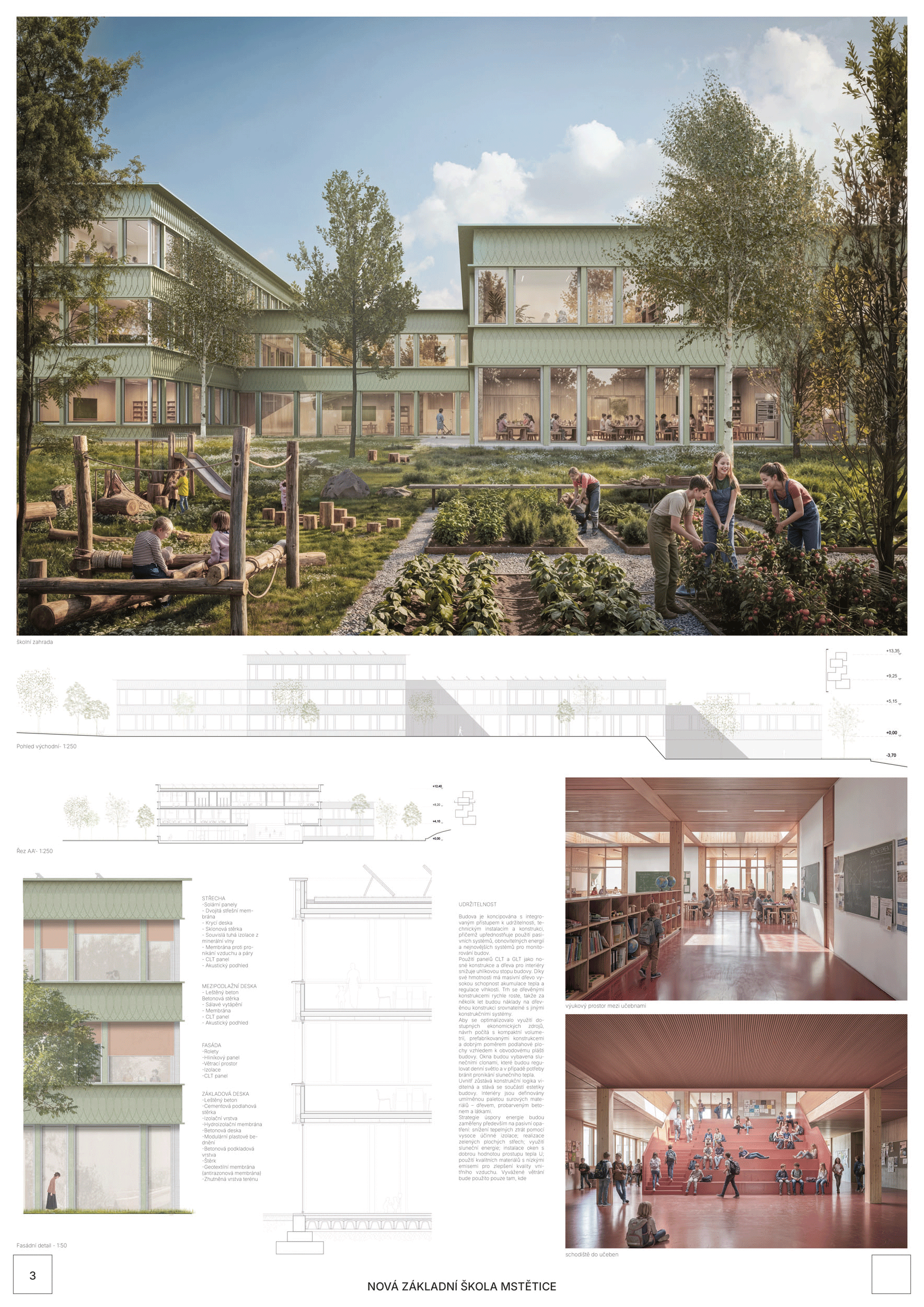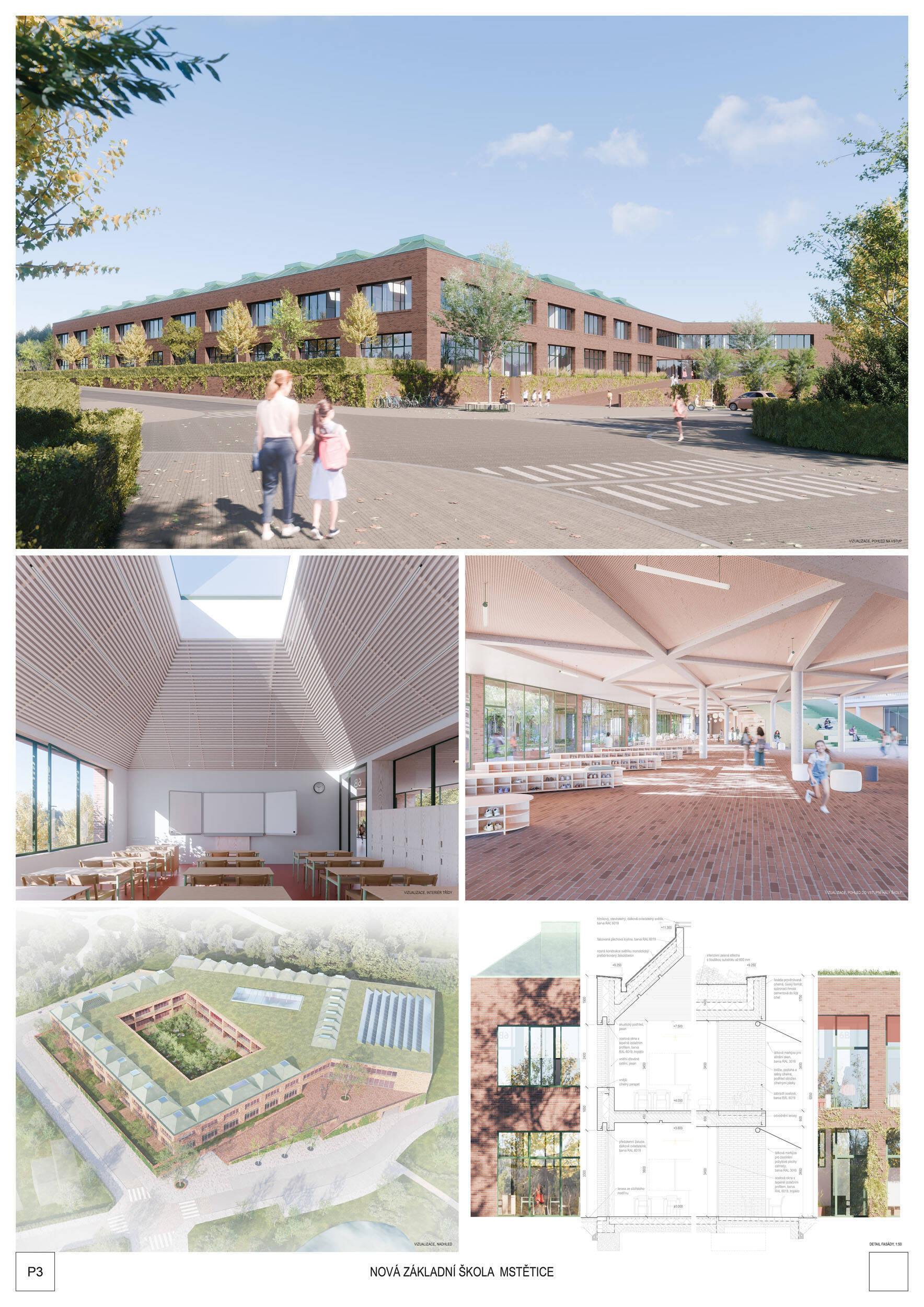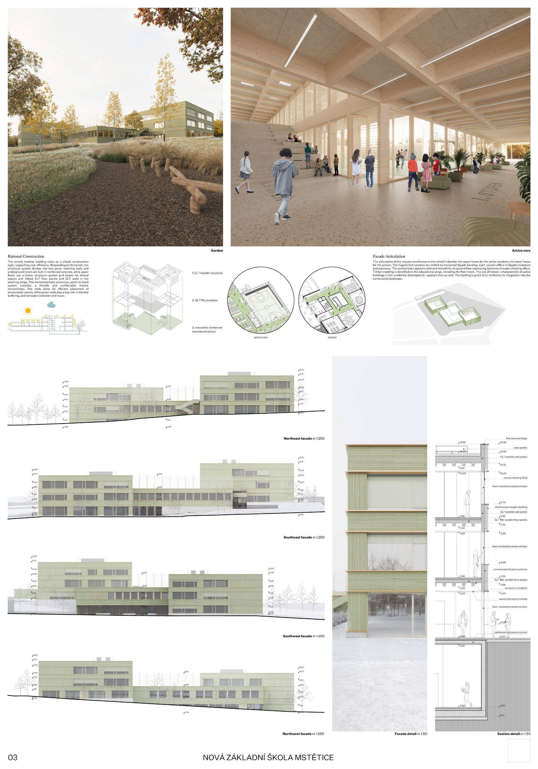 V rámci širšího kontextu návrh vhodně pracuje s odstupem od budoucí zástavby rodinných domů. Veřejný prostor je pečlivě navržen a vybízí ke komfortnímu pobytu ve stínu stromů, jak pro uživatele objektu, tak pro kolemjdoucí. Díky zvolené orientaci navržené hmoty zbývá na pozemku dostatek místa pro školní zahradu. Ta je přístupná z hlavních komunikací, ale lze do ní vstoupit i z jídelny, což porota ocenila. Zahrada navíc poskytuje logické členění. Klastry a společné prostory jsou navrženy přehledně, poskytují žádoucí různorodost a denní světlo. Díky centrální hale jsou pak minimalizovány provozní vzdálenosti. Návrh celkově vykazuje značnou míru propracovanosti na mnoha úrovních, včetně chráněných únikových cest. To v podrobnosti soutěžní studie není samozřejmostí. Jako kultivovaný a realizovatelný spatřovala porota také fasádní plášť včetně elegantního límce nad hlavním vstupem. Příjemné je i předložené barevné schéma řízeně patinované dřevěné fasády, zelených výplní otvorů a mobiliáře v korálovém odstínu. Slabinou projektu je sloučení zásobo-vání gastro provozu a vstupu do tělocvičny pro veřejnost.