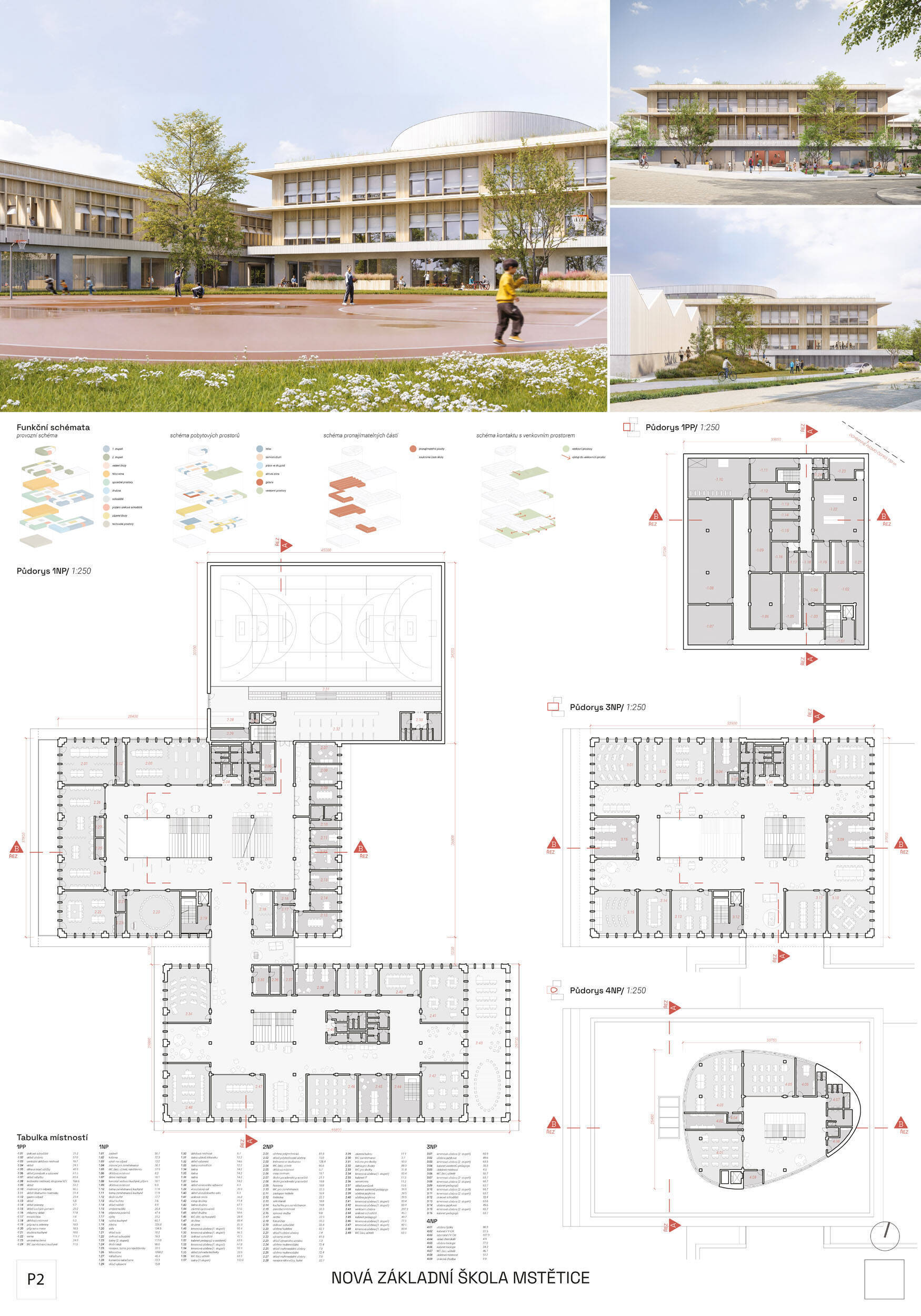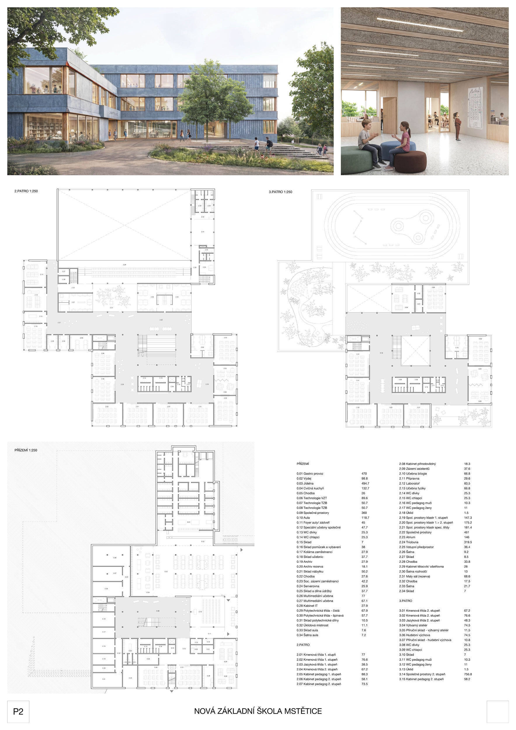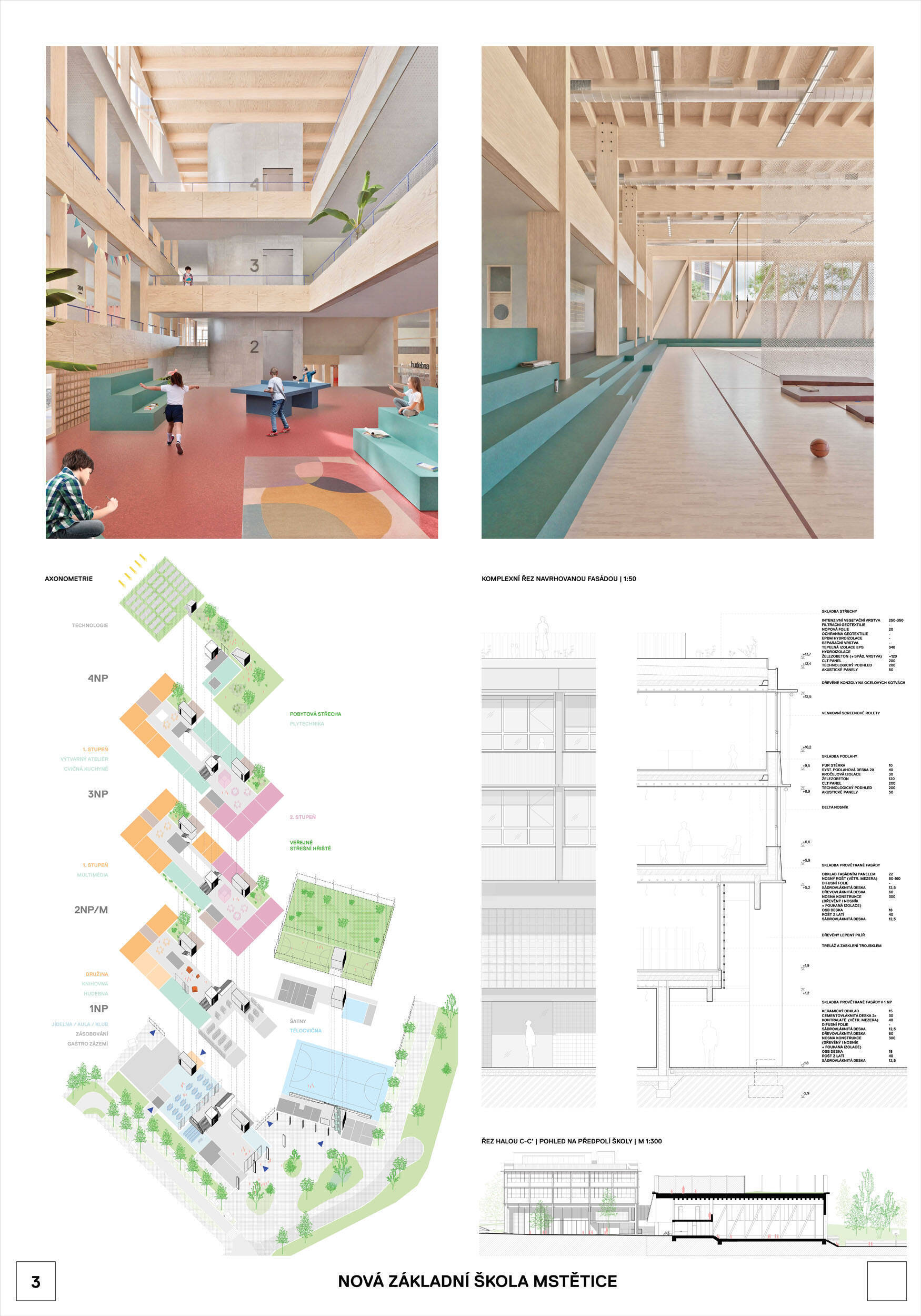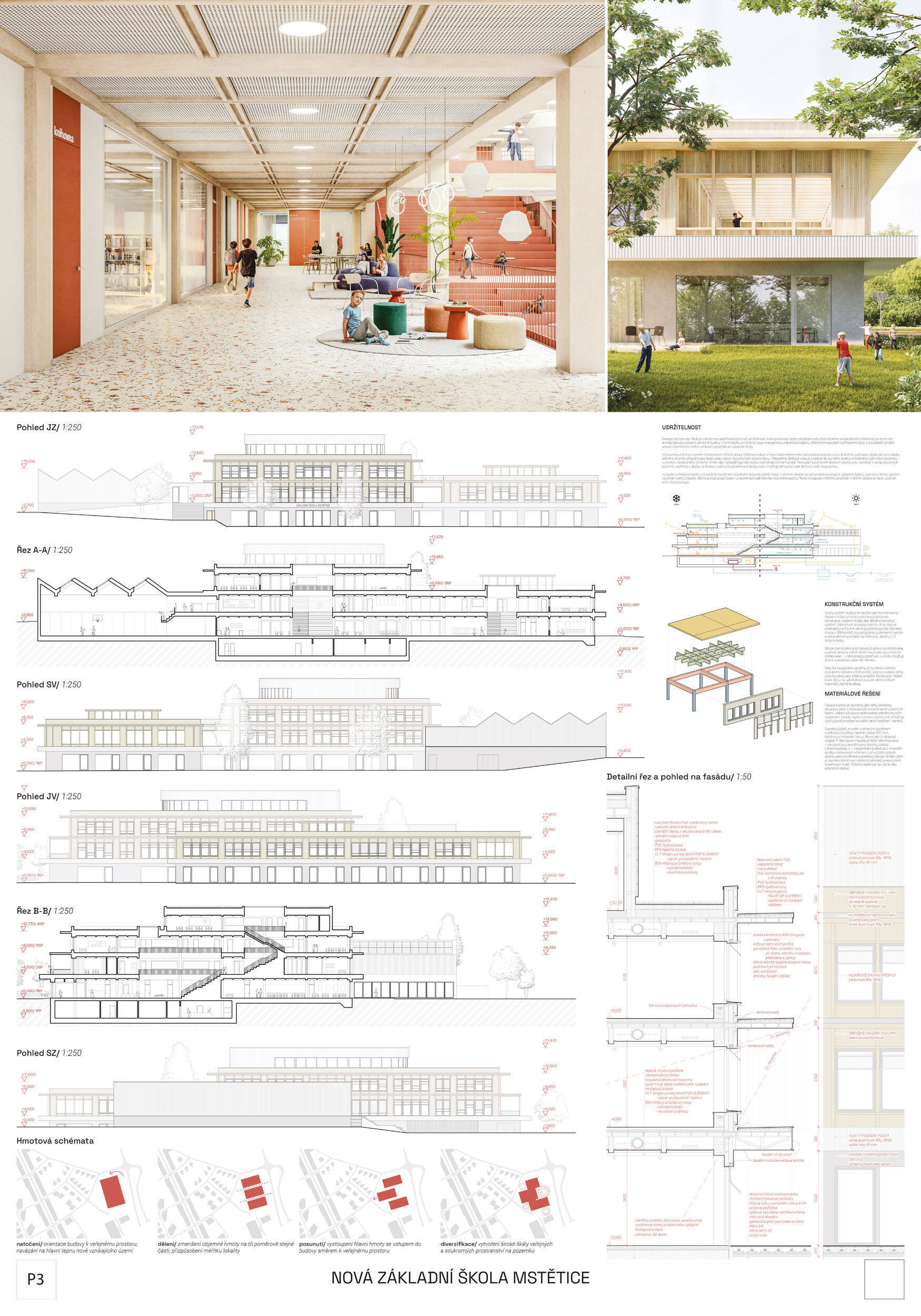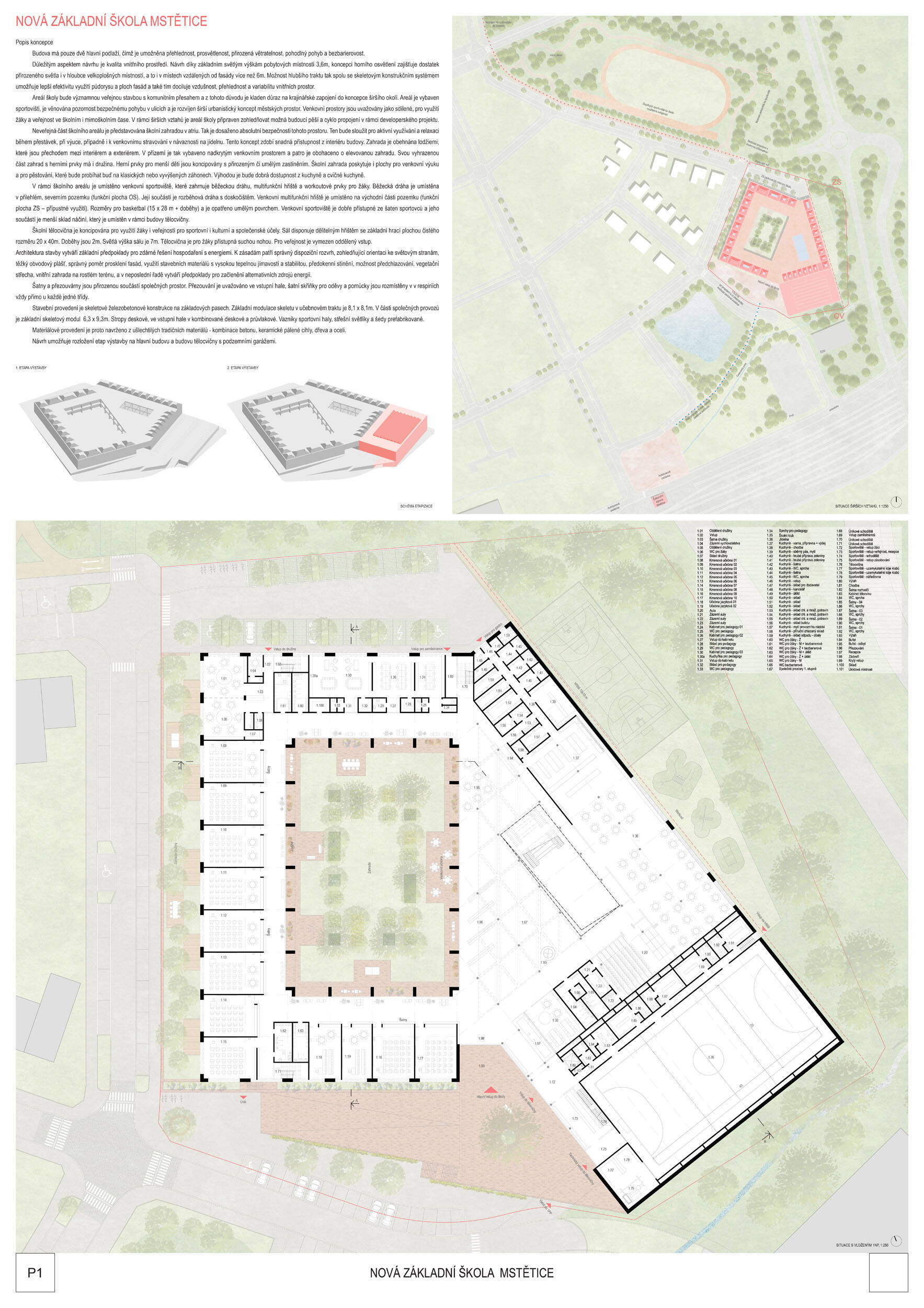 V rámci širšího kontextu návrh vhodně pracuje s odstupem od budoucí zástavby rodinných domů. Veřejný prostor je pečlivě navržen a vybízí ke komfortnímu pobytu ve stínu stromů, jak pro uživatele objektu, tak pro kolemjdoucí. Díky zvolené orientaci navržené hmoty zbývá na pozemku dostatek místa pro školní zahradu. Ta je přístupná z hlavních komunikací, ale lze do ní vstoupit i z jídelny, což porota ocenila. Zahrada navíc poskytuje logické členění. Klastry a společné prostory jsou navrženy přehledně, poskytují žádoucí různorodost a denní světlo. Díky centrální hale jsou pak minimalizovány provozní vzdálenosti. Návrh celkově vykazuje značnou míru propracovanosti na mnoha úrovních, včetně chráněných únikových cest. To v podrobnosti soutěžní studie není samozřejmostí. Jako kultivovaný a realizovatelný spatřovala porota také fasádní plášť včetně elegantního límce nad hlavním vstupem. Příjemné je i předložené barevné schéma řízeně patinované dřevěné fasády, zelených výplní otvorů a mobiliáře v korálovém odstínu. Slabinou projektu je sloučení zásobo-vání gastro provozu a vstupu do tělocvičny pro veřejnost.