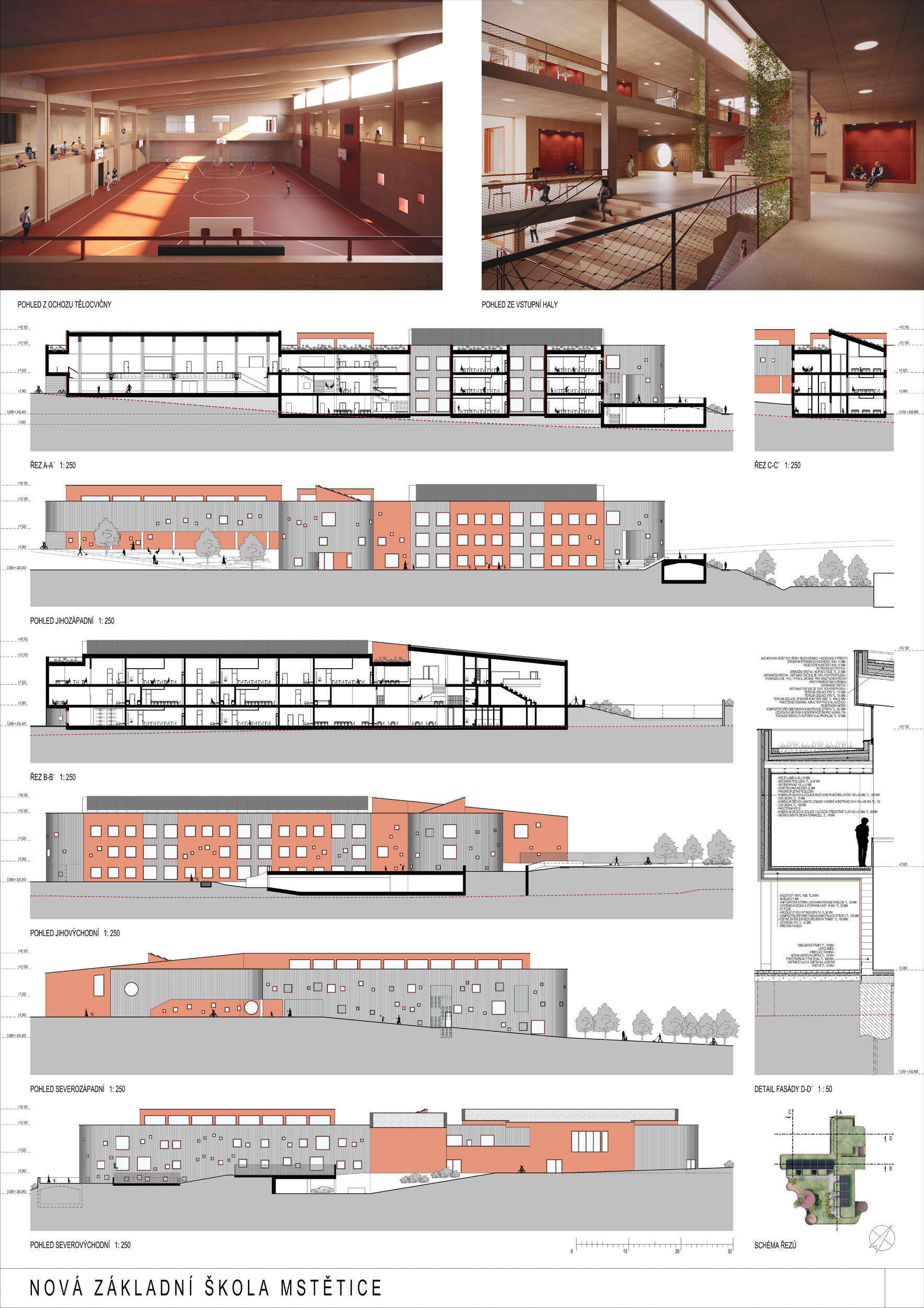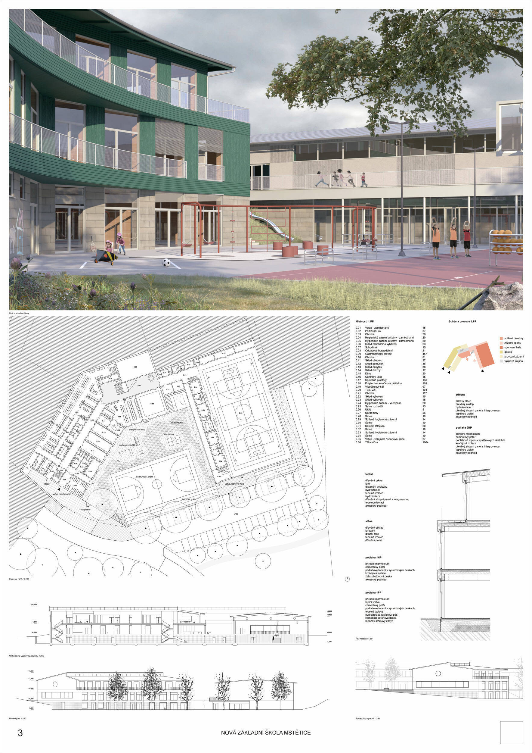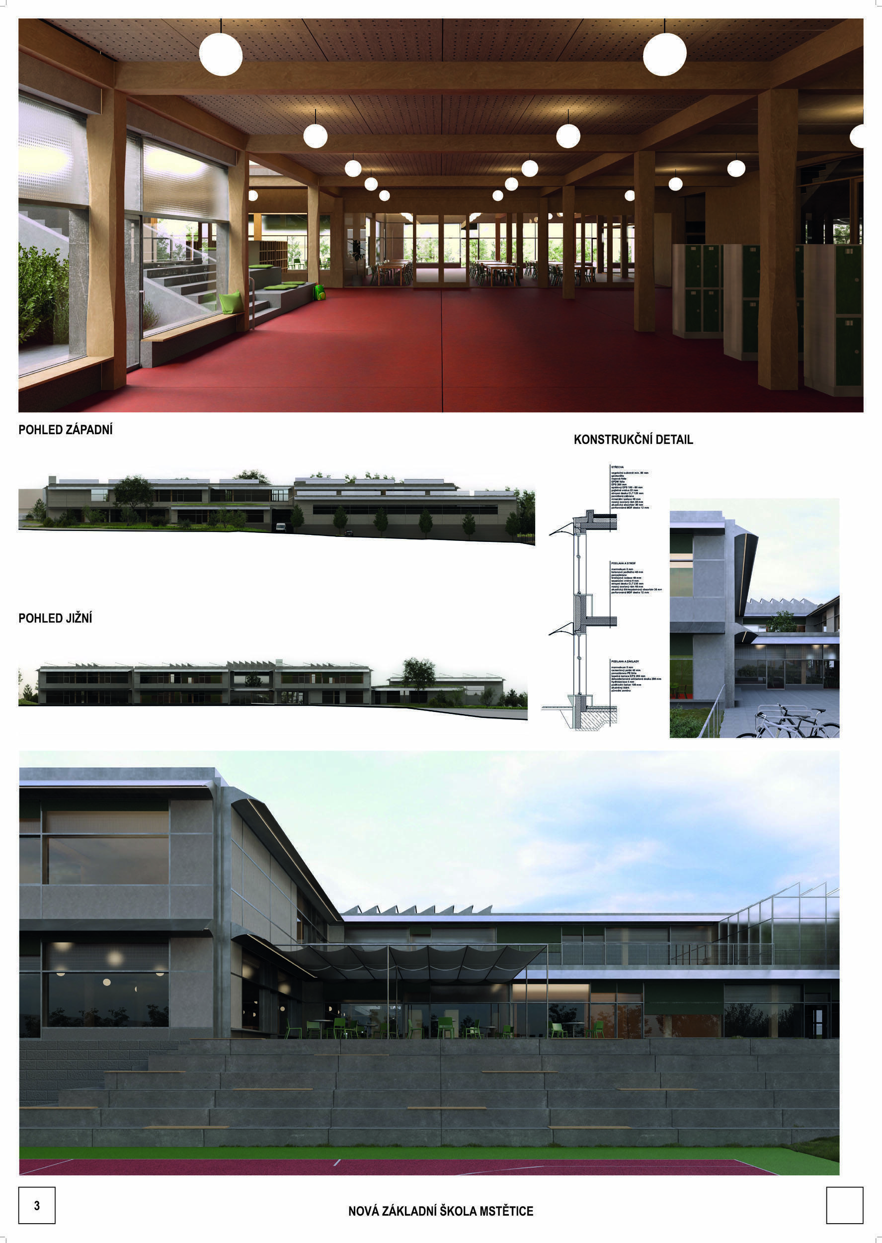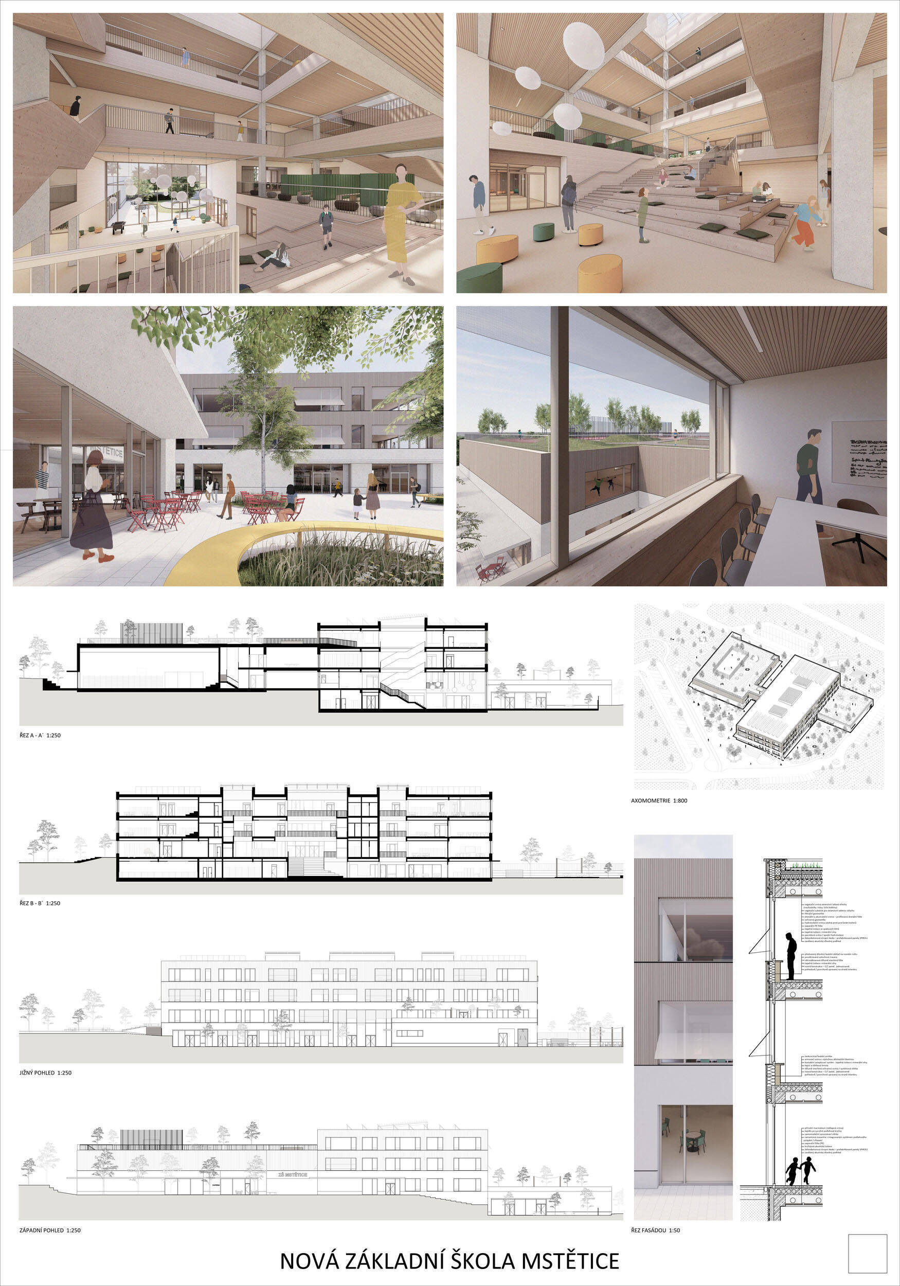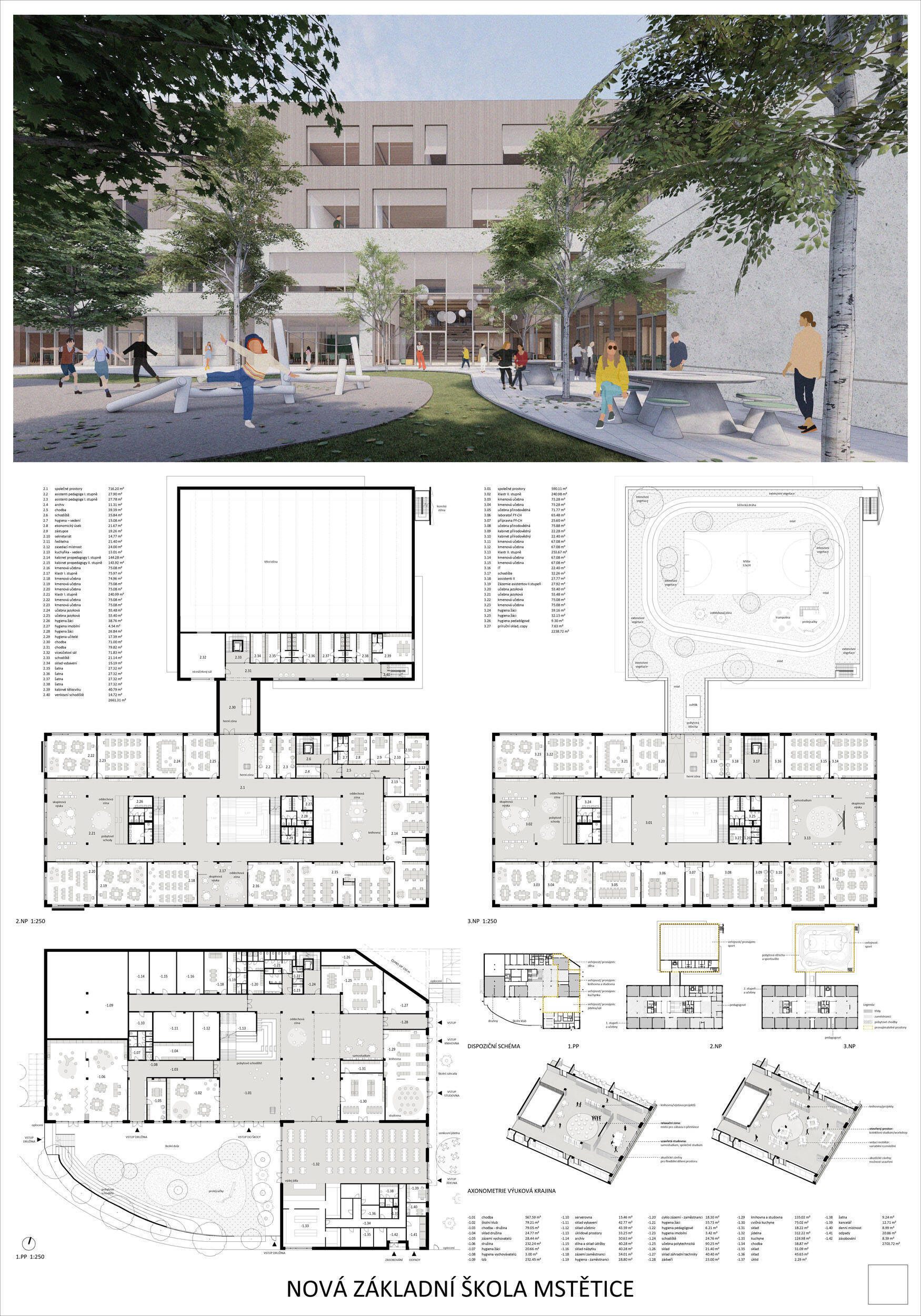 V rámci širšího kontextu návrh vhodně pracuje s odstupem od budoucí zástavby rodinných domů. Veřejný prostor je pečlivě navržen a vybízí ke komfortnímu pobytu ve stínu stromů, jak pro uživatele objektu, tak pro kolemjdoucí. Díky zvolené orientaci navržené hmoty zbývá na pozemku dostatek místa pro školní zahradu. Ta je přístupná z hlavních komunikací, ale lze do ní vstoupit i z jídelny, což porota ocenila. Zahrada navíc poskytuje logické členění. Klastry a společné prostory jsou navrženy přehledně, poskytují žádoucí různorodost a denní světlo. Díky centrální hale jsou pak minimalizovány provozní vzdálenosti. Návrh celkově vykazuje značnou míru propracovanosti na mnoha úrovních, včetně chráněných únikových cest. To v podrobnosti soutěžní studie není samozřejmostí. Jako kultivovaný a realizovatelný spatřovala porota také fasádní plášť včetně elegantního límce nad hlavním vstupem. Příjemné je i předložené barevné schéma řízeně patinované dřevěné fasády, zelených výplní otvorů a mobiliáře v korálovém odstínu. Slabinou projektu je sloučení zásobo-vání gastro provozu a vstupu do tělocvičny pro veřejnost.