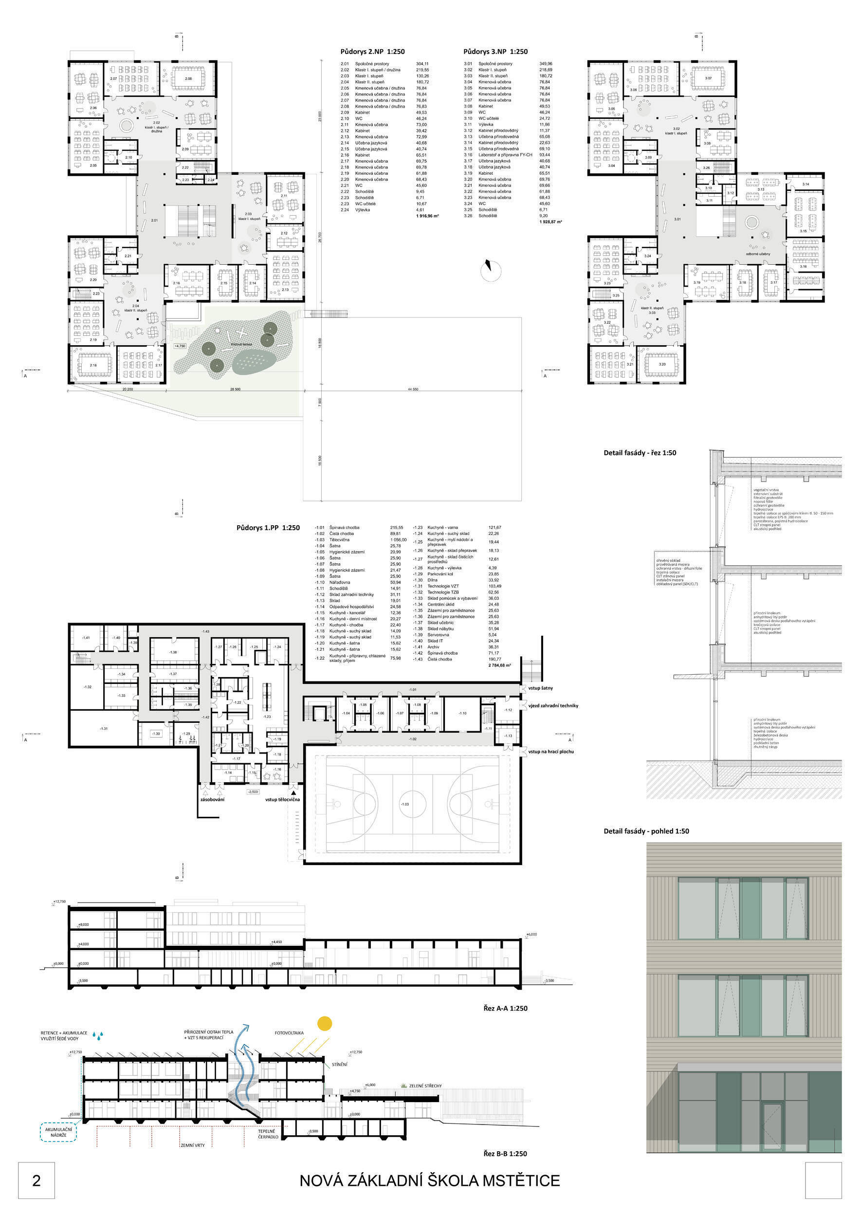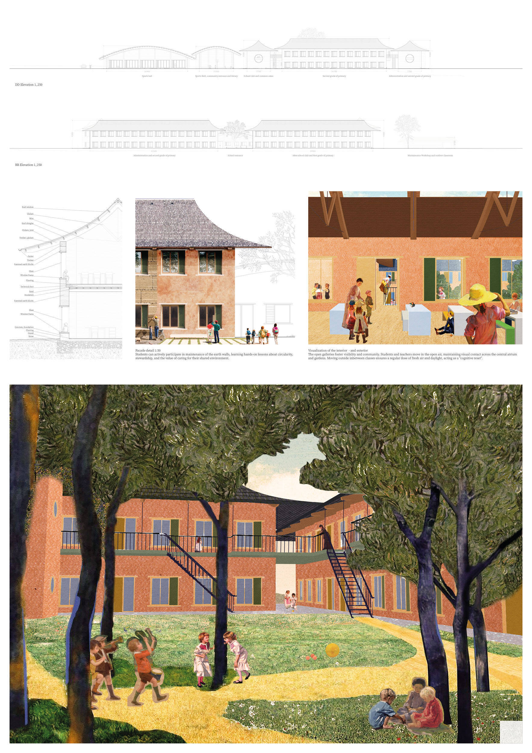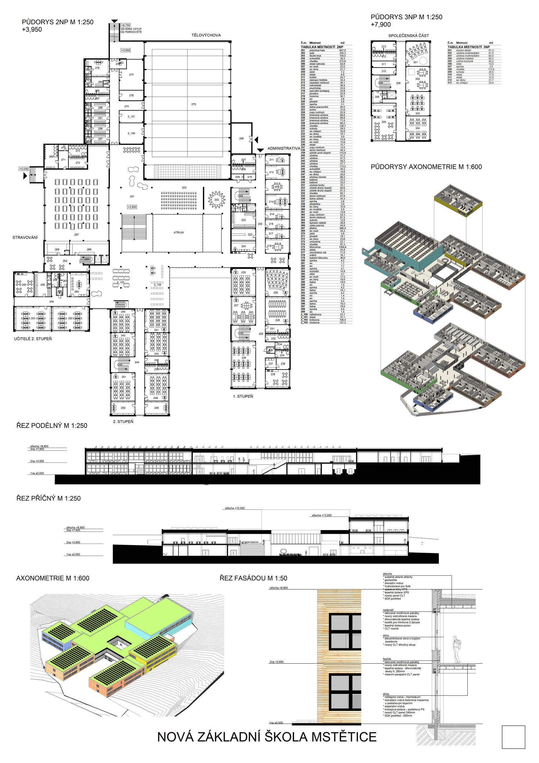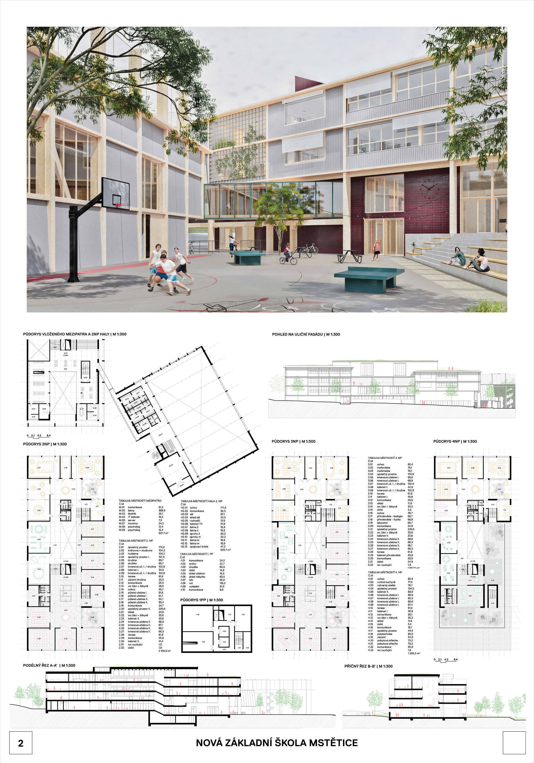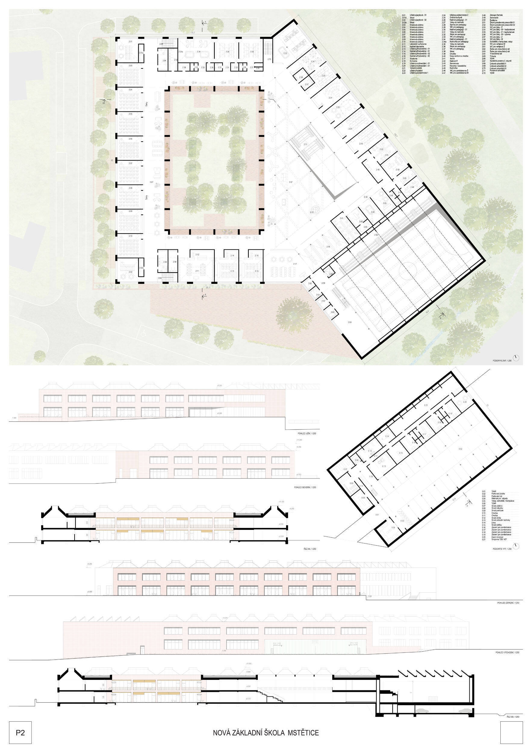 V rámci širšího kontextu návrh vhodně pracuje s odstupem od budoucí zástavby rodinných domů. Veřejný prostor je pečlivě navržen a vybízí ke komfortnímu pobytu ve stínu stromů, jak pro uživatele objektu, tak pro kolemjdoucí. Díky zvolené orientaci navržené hmoty zbývá na pozemku dostatek místa pro školní zahradu. Ta je přístupná z hlavních komunikací, ale lze do ní vstoupit i z jídelny, což porota ocenila. Zahrada navíc poskytuje logické členění. Klastry a společné prostory jsou navrženy přehledně, poskytují žádoucí různorodost a denní světlo. Díky centrální hale jsou pak minimalizovány provozní vzdálenosti. Návrh celkově vykazuje značnou míru propracovanosti na mnoha úrovních, včetně chráněných únikových cest. To v podrobnosti soutěžní studie není samozřejmostí. Jako kultivovaný a realizovatelný spatřovala porota také fasádní plášť včetně elegantního límce nad hlavním vstupem. Příjemné je i předložené barevné schéma řízeně patinované dřevěné fasády, zelených výplní otvorů a mobiliáře v korálovém odstínu. Slabinou projektu je sloučení zásobo-vání gastro provozu a vstupu do tělocvičny pro veřejnost.