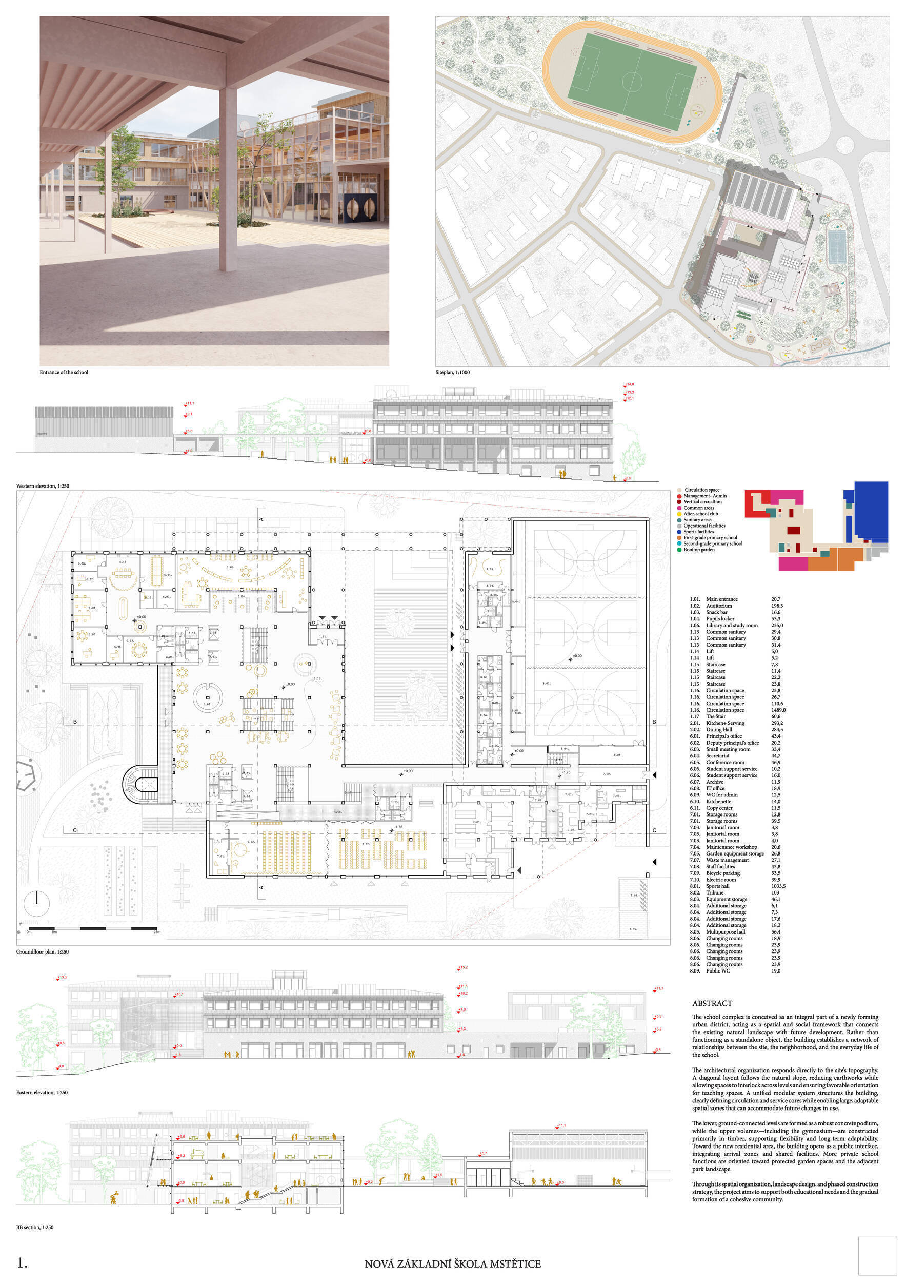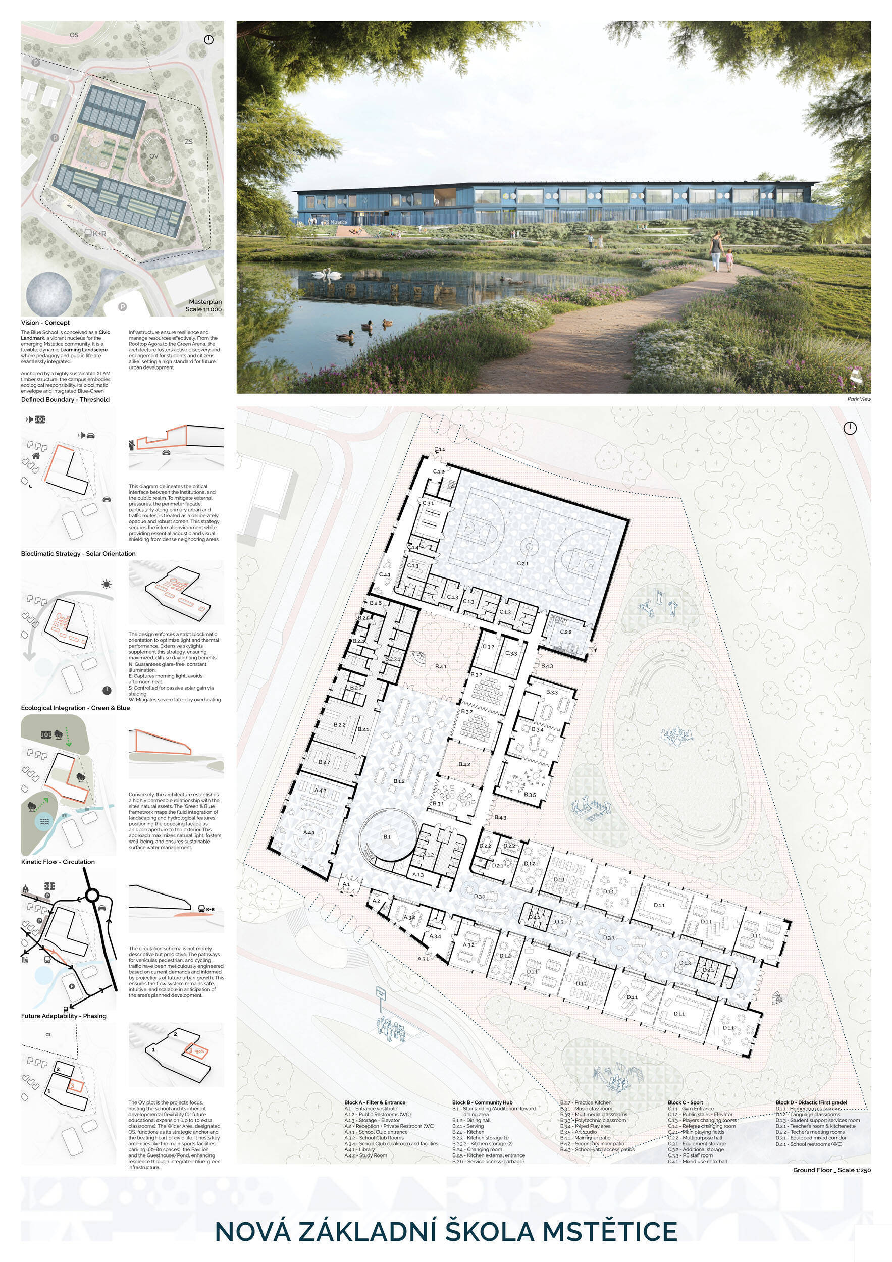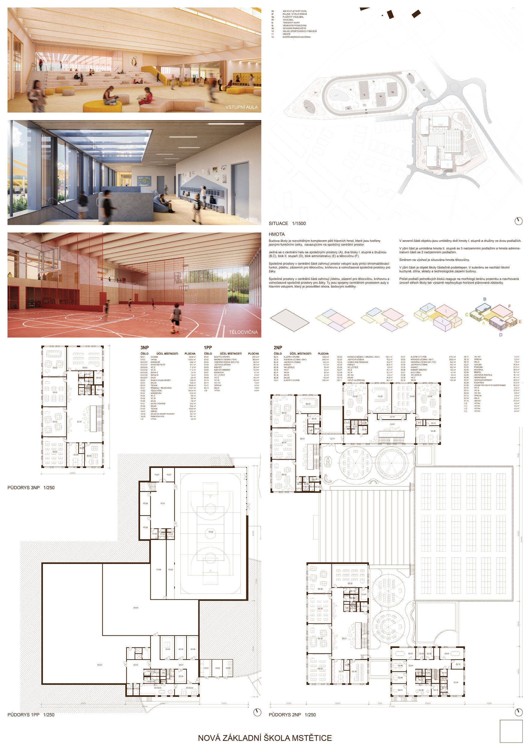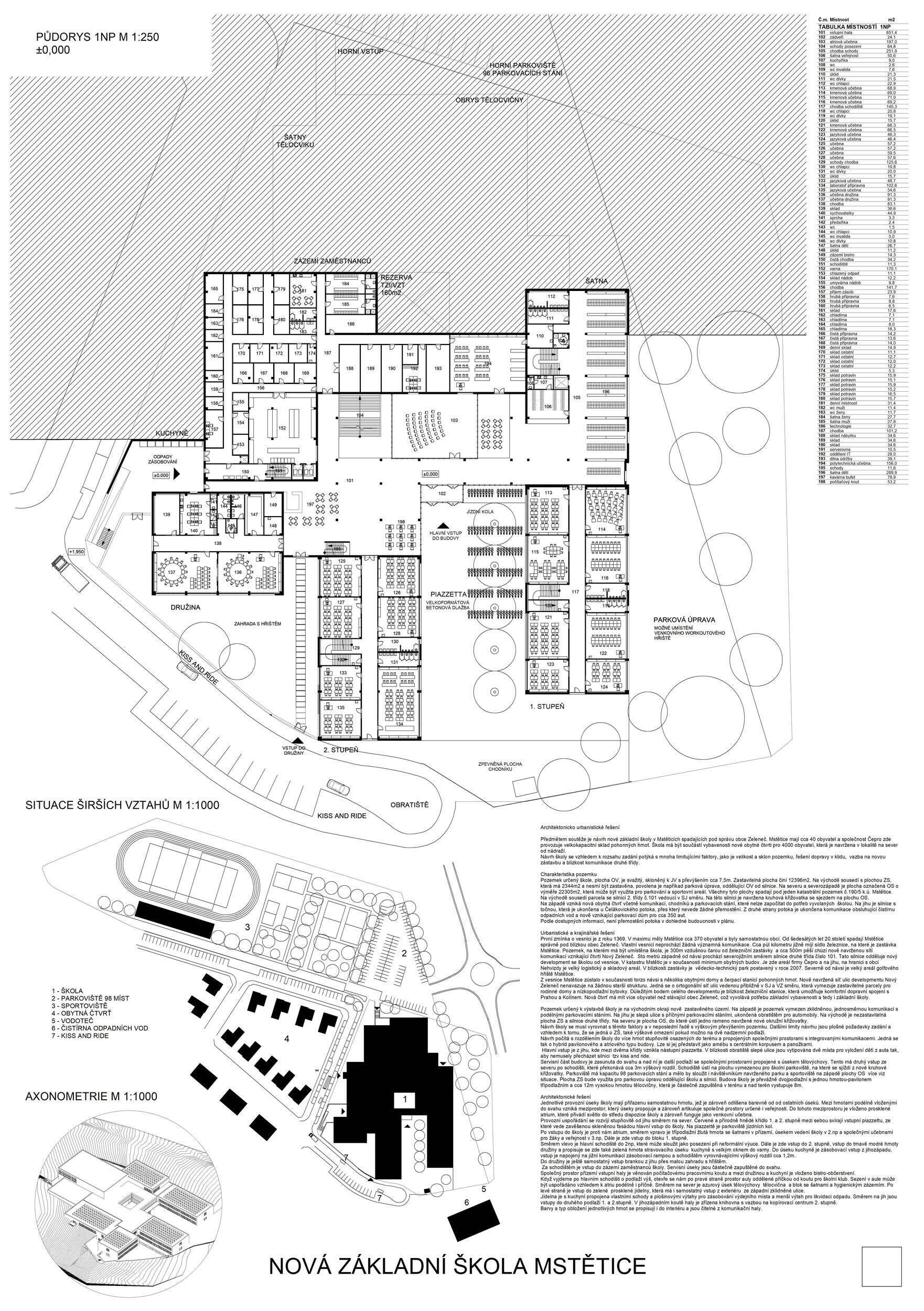 Návrh je vhodně orientován vůči světovým stranám, velmi dobře reaguje na svažitost terénu řešeného území a citlivě zasazuje hmotové řešení školy do sousedství rezidenční zástavby a vytváří na pozemku školy dostatečné prostory pro veřejná i neveřejná prostranství, sportoviště, či školní zahradu. Hlavní předprostor školy je koncipován jako přehledné veřejné prostranství přirozeně orientované směrem k budoucímu sídlu a vhodně navázaný na parkování K+R, přičemž krajinářské řešení zde uvážlivě kombinuje vzrostlou vegetaci se zpevněnými plochami. Promyšlené krajinářské řešení pak návrh přináší také v dalších částech exteriéru: školní zahradě, sportovních plochách a doplňkových prostorách, vše v logických a funkčních vzájemných vazbách. Prostorové a dispoziční vnitřní uspořádání školní budovy je další vysokou kvalitou návrhu. Dispoziční řešení je logické a kompaktní, klastrové uspořádání párů učeben s důsledným propojením prostor s vnějším prostředím vytváří prostředí s žádoucí kvalitou pro výuku. Návrh nachází optimum mezi komfortem pro výuku i mimovýukové aktivity uživatelů školy a prostorovou úsporností návrhu, přitom respektuje požadovanou využitelnost školní budovy v různých režimech během i mimo vyučovací dobu, včetně zpřístupnění jednotlivých částí pro komunitní potřeby a akce. Porota ocenila navržené konstrukční a materiálové řešení vhodně kombinující masívní železobetonové a dřevěné nosné konstrukce a kvalitní, praktické, udržitelné, přitom esteticky velmi hodnotné materiály vnějšího pláště i vnitřních prostor. Energetická koncepce návrhu je realistická a odpovídá nárokům zadavatele a současné legislativy i praxe. Porota ocenila návrh jako nejlepší odpověď na průřez požadavků zadavatele a místních souvislostí.