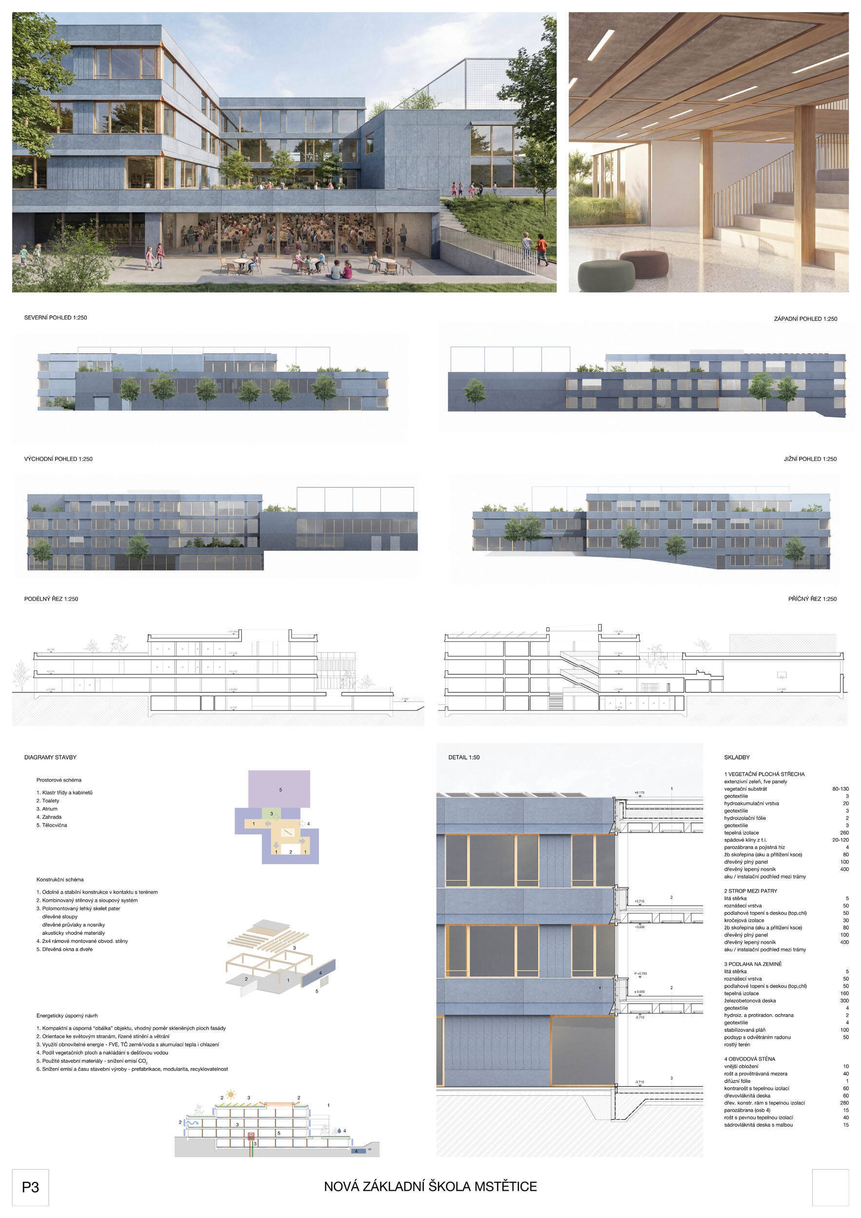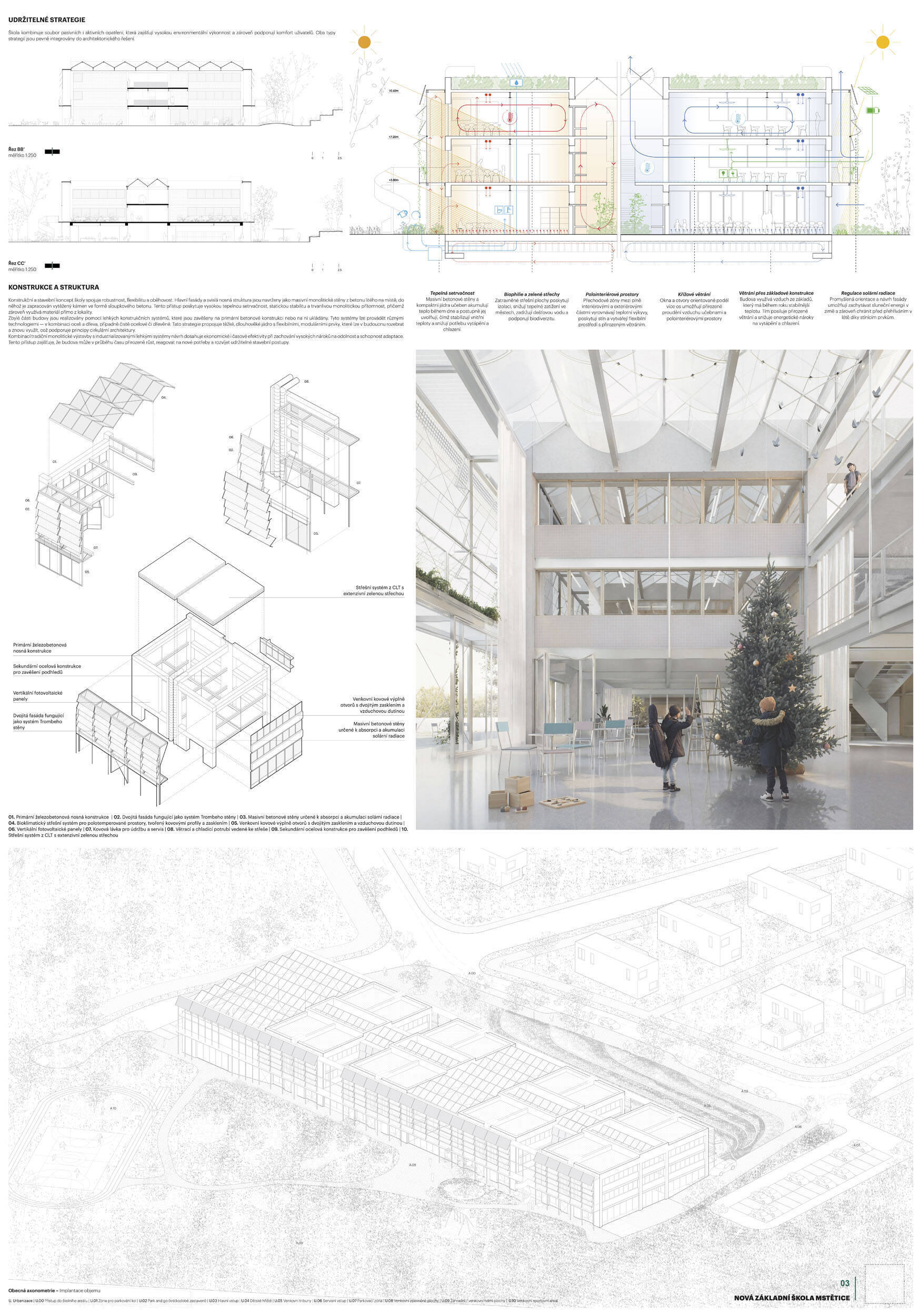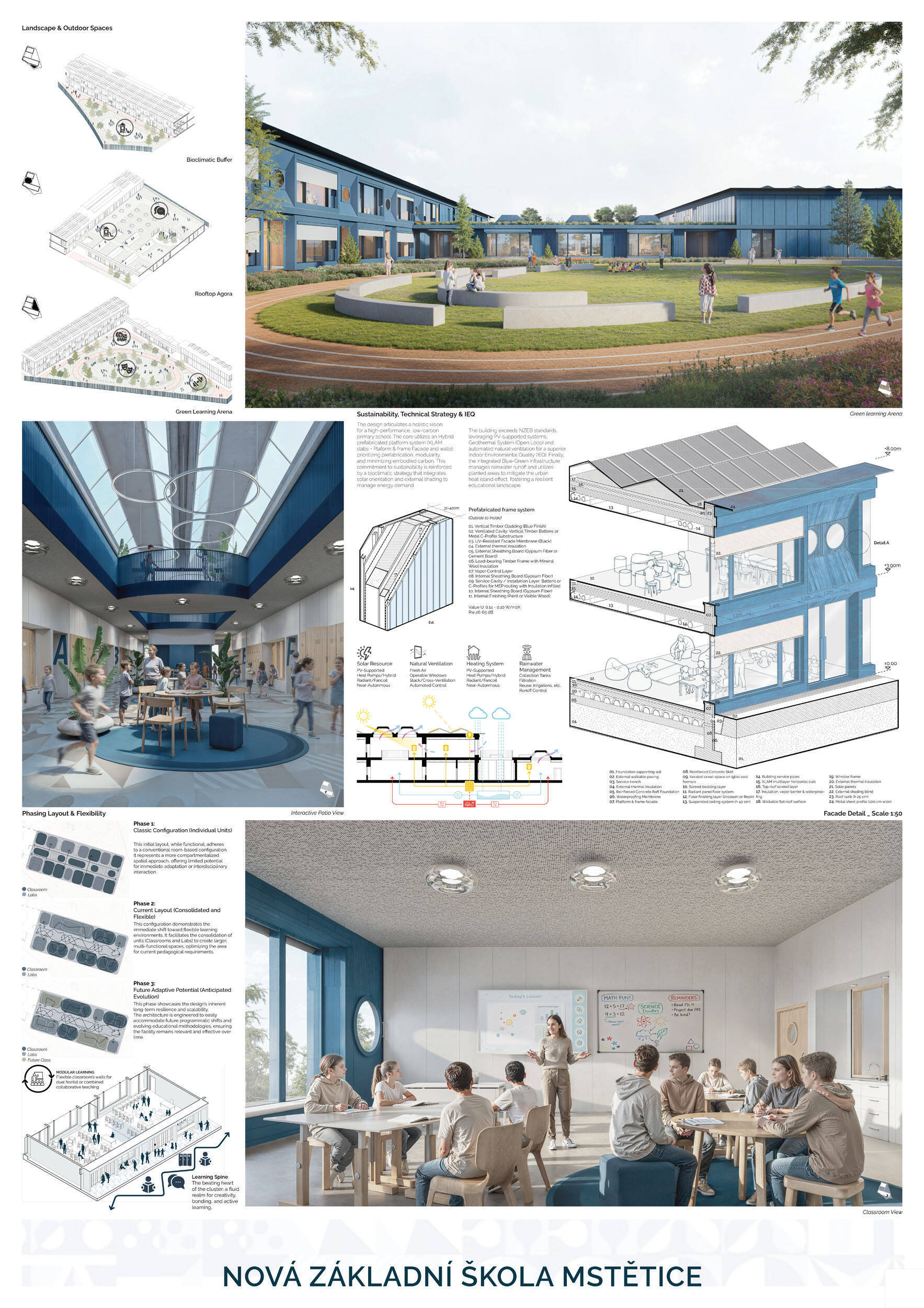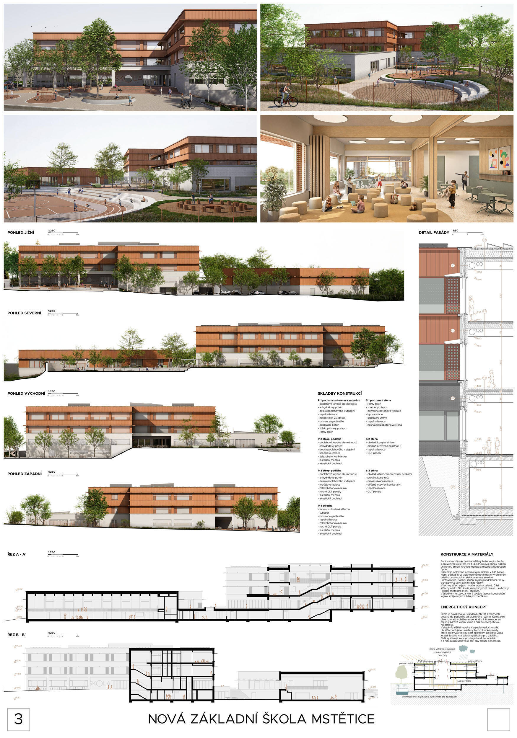 Návrh je vhodně orientován vůči světovým stranám, velmi dobře reaguje na svažitost terénu řešeného území a citlivě zasazuje hmotové řešení školy do sousedství rezidenční zástavby a vytváří na pozemku školy dostatečné prostory pro veřejná i neveřejná prostranství, sportoviště, či školní zahradu. Hlavní předprostor školy je koncipován jako přehledné veřejné prostranství přirozeně orientované směrem k budoucímu sídlu a vhodně navázaný na parkování K+R, přičemž krajinářské řešení zde uvážlivě kombinuje vzrostlou vegetaci se zpevněnými plochami. Promyšlené krajinářské řešení pak návrh přináší také v dalších částech exteriéru: školní zahradě, sportovních plochách a doplňkových prostorách, vše v logických a funkčních vzájemných vazbách. Prostorové a dispoziční vnitřní uspořádání školní budovy je další vysokou kvalitou návrhu. Dispoziční řešení je logické a kompaktní, klastrové uspořádání párů učeben s důsledným propojením prostor s vnějším prostředím vytváří prostředí s žádoucí kvalitou pro výuku. Návrh nachází optimum mezi komfortem pro výuku i mimovýukové aktivity uživatelů školy a prostorovou úsporností návrhu, přitom respektuje požadovanou využitelnost školní budovy v různých režimech během i mimo vyučovací dobu, včetně zpřístupnění jednotlivých částí pro komunitní potřeby a akce. Porota ocenila navržené konstrukční a materiálové řešení vhodně kombinující masívní železobetonové a dřevěné nosné konstrukce a kvalitní, praktické, udržitelné, přitom esteticky velmi hodnotné materiály vnějšího pláště i vnitřních prostor. Energetická koncepce návrhu je realistická a odpovídá nárokům zadavatele a současné legislativy i praxe. Porota ocenila návrh jako nejlepší odpověď na průřez požadavků zadavatele a místních souvislostí.