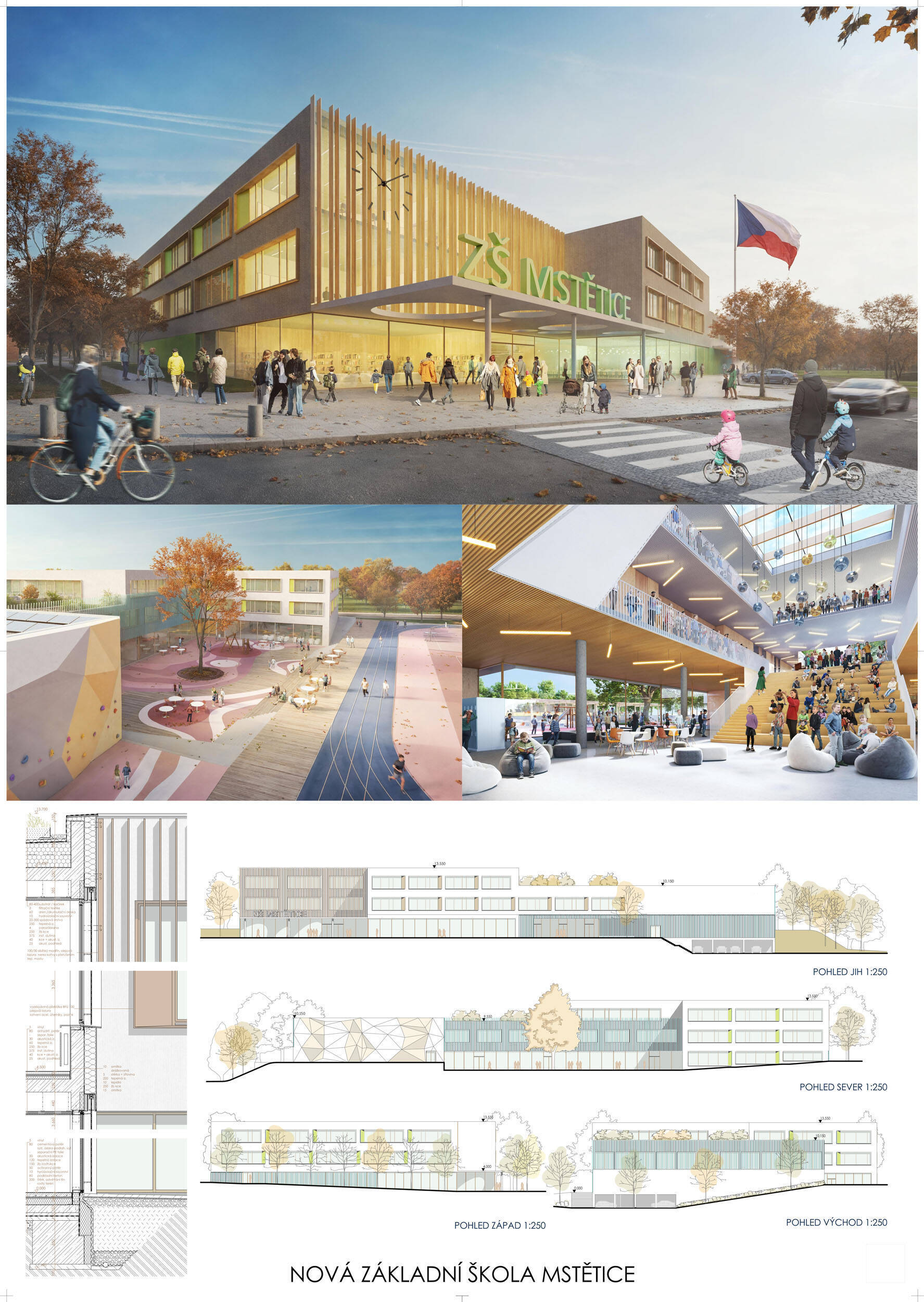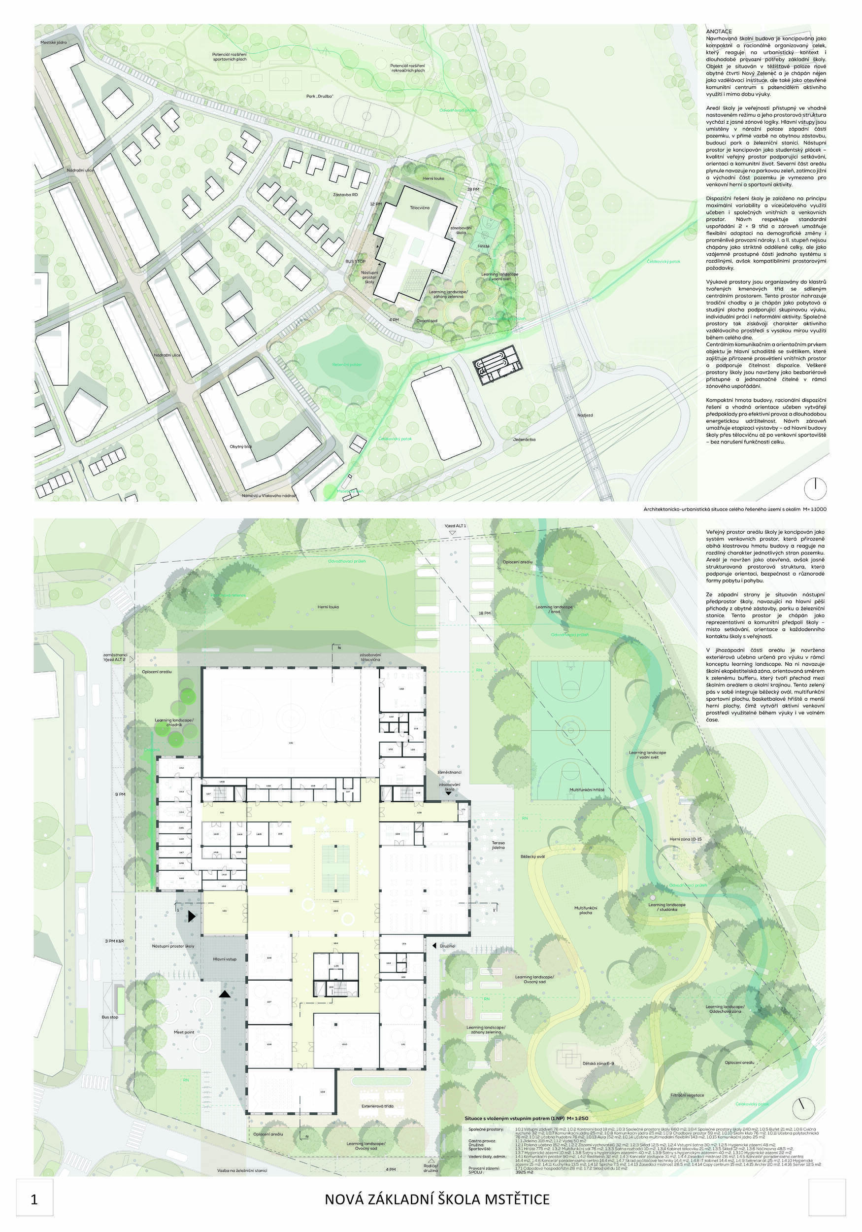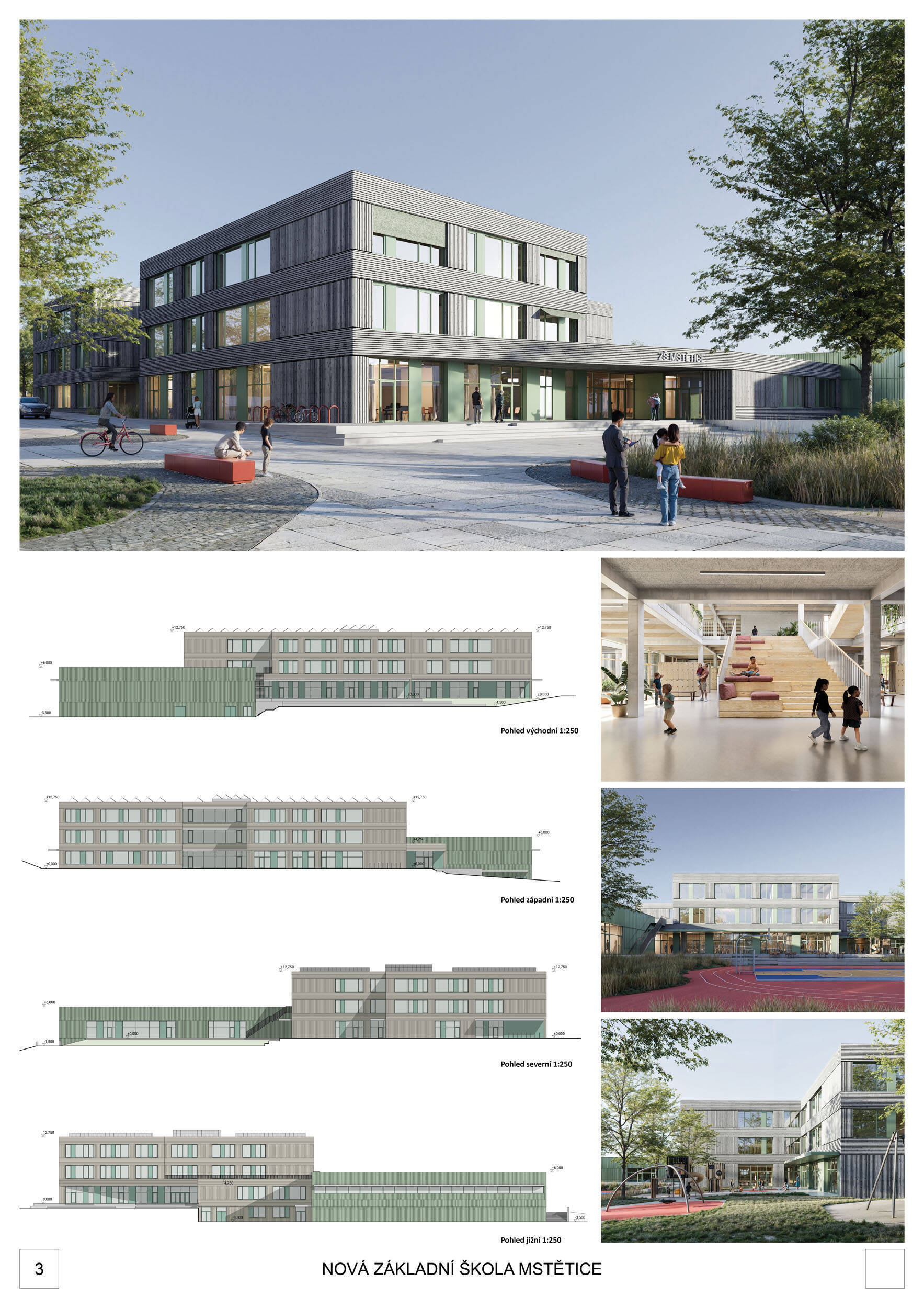 Trojtisícová stredočeská obec Zeleneč hľadala návrh novej základnej školy v miestnej časti Mstětice prostredníctvom otvorenej architektonickej súťaže. Zadanie rátalo s novostavbou školy s kapacitou 600 žiakov, vrátane nadväzujúcich spevnených a športových plôch, dopravnej obsluhy a napojenia na technickú infraštruktúru.