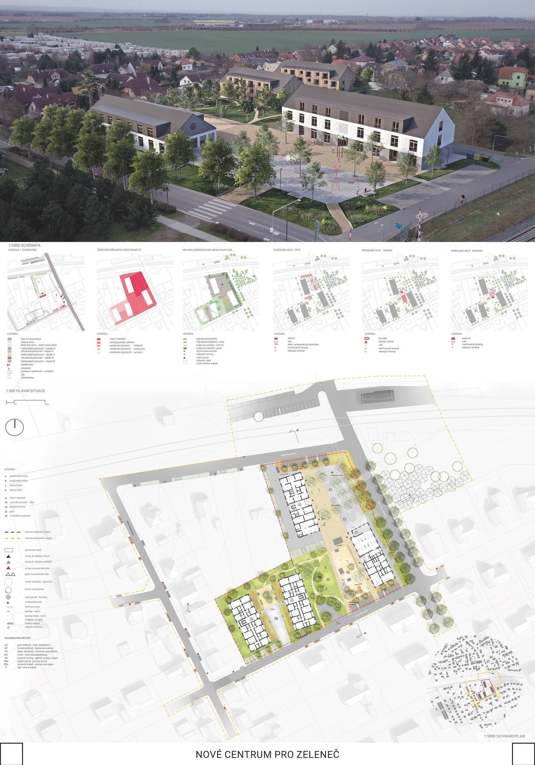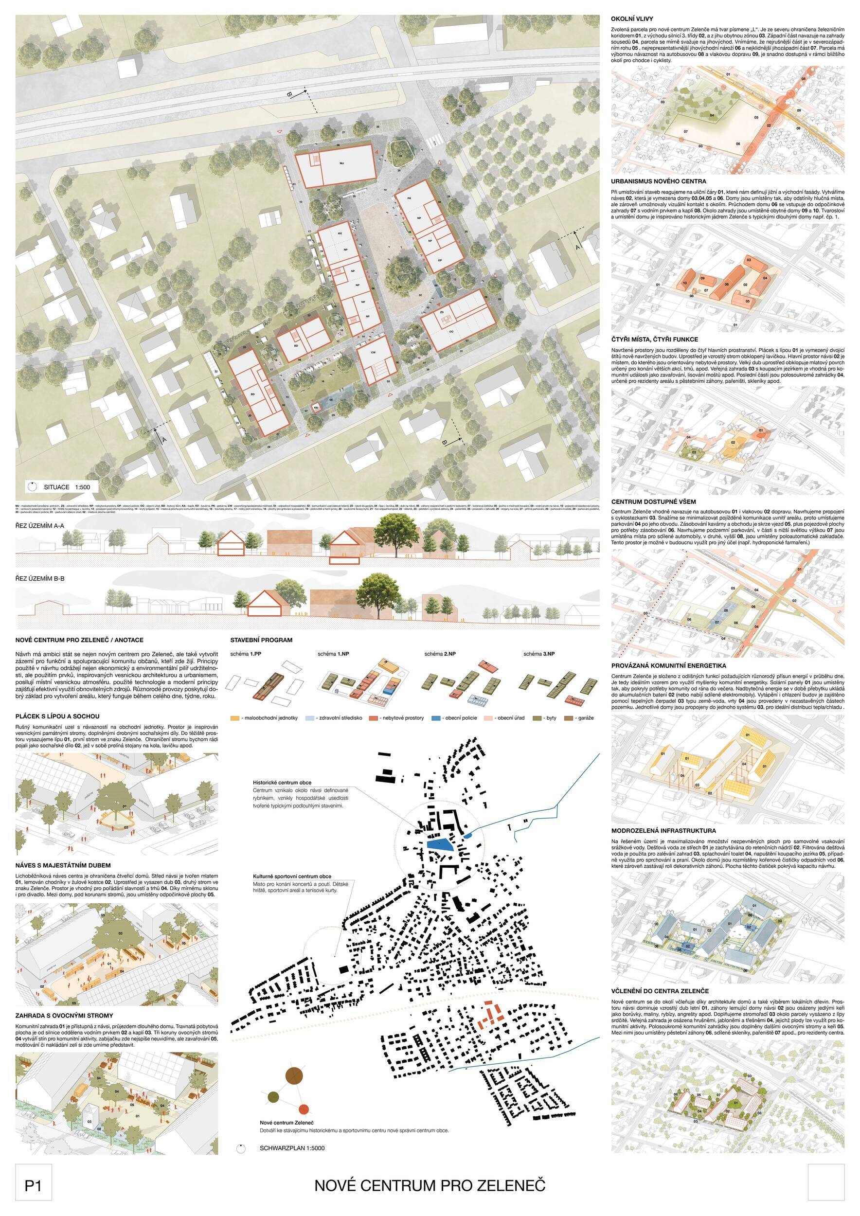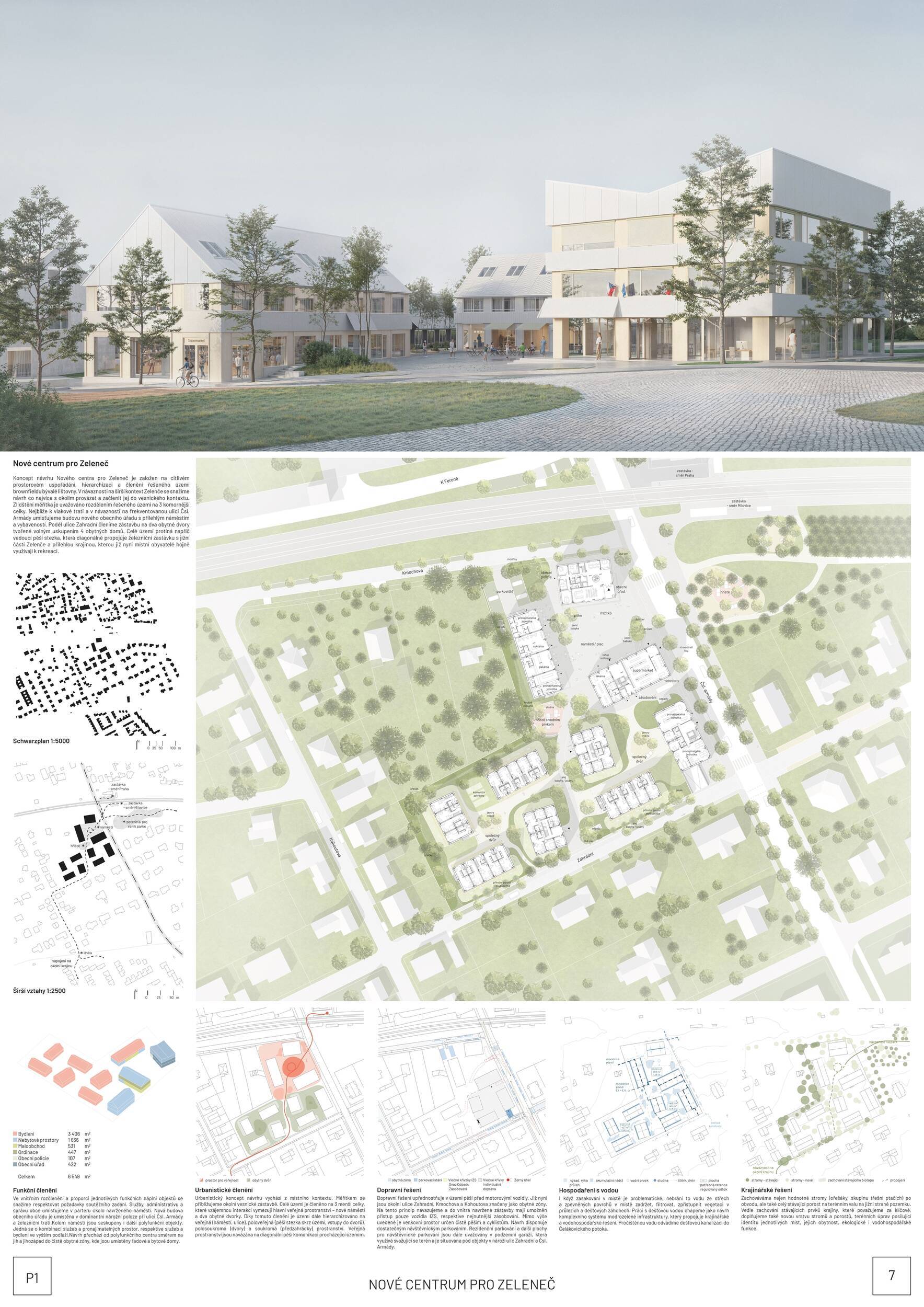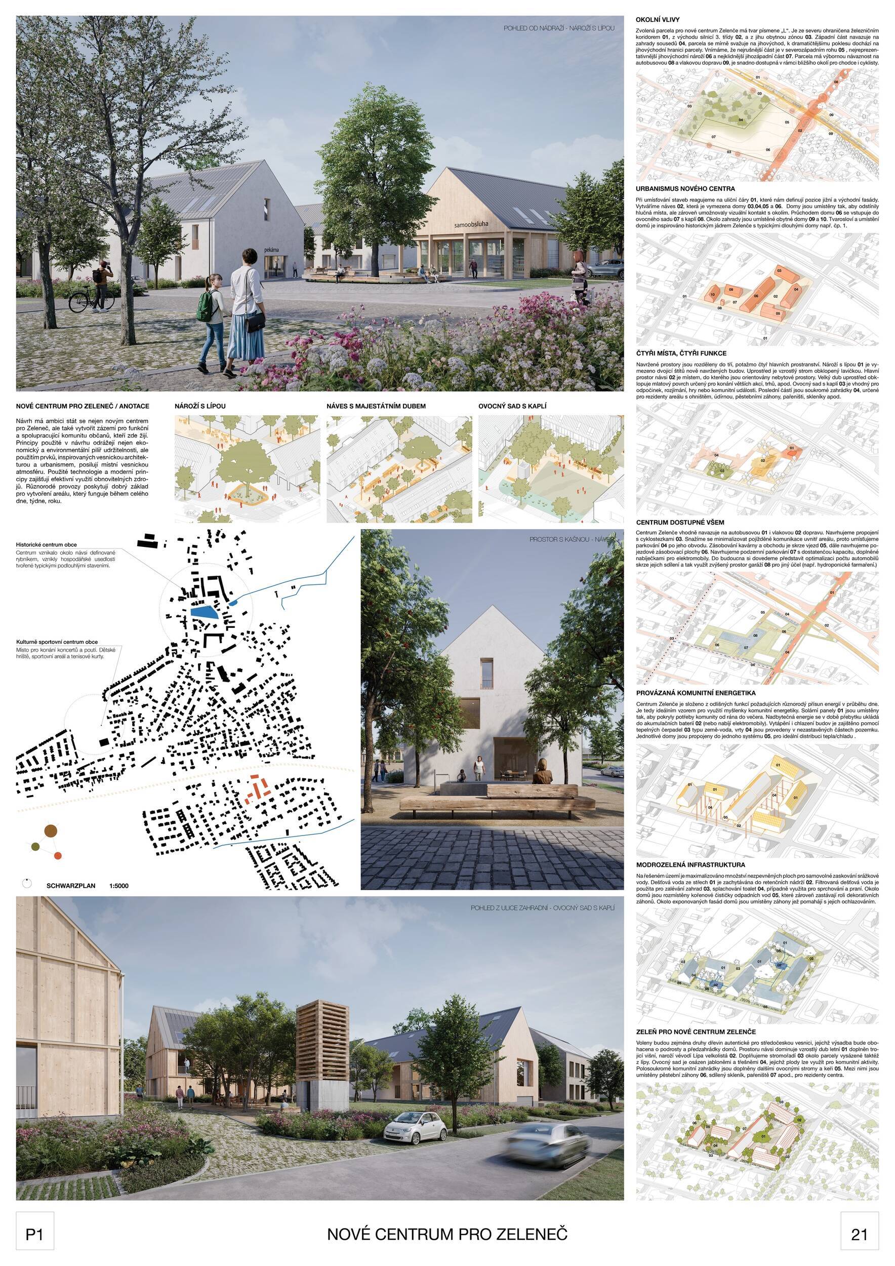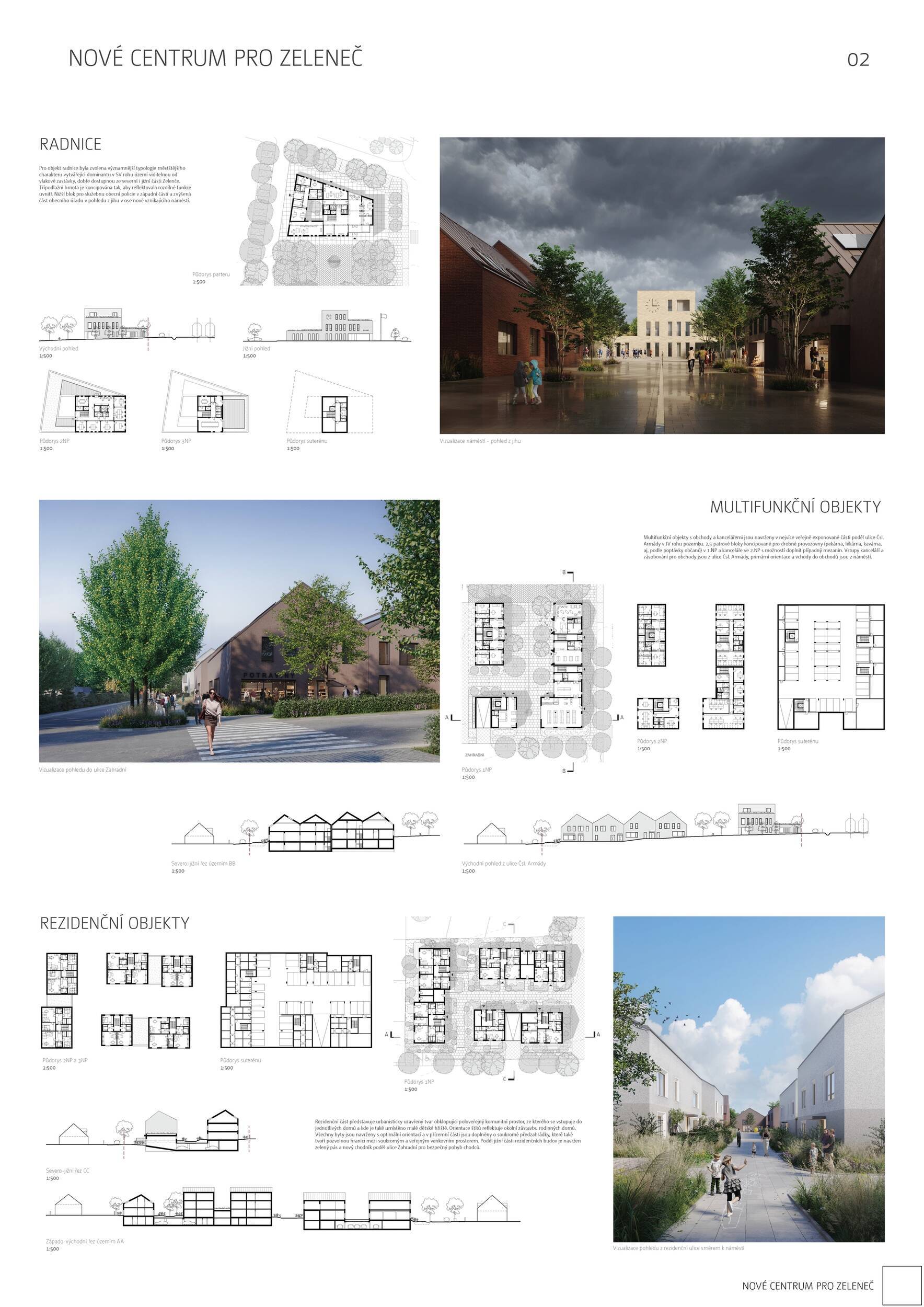Nejsilnější stránkou soutěžního projektu č. 1 je měřítko jednotlivých budov, které odpovídá měřítku okolní zástavby obce Zeleneč, tvořené převážně rodinnými domy. Vzájemné uspořádání budov však působí rigidně a nevytváří přirozený, organický urbanismus, který by plně odpovídal požadavkům obce. Přestože byli autoři v prvním kole upozorněni na přílišnou tuhost celkového řešení, návrh ve druhém kole neprošel zásadní úpravou ani revizí. Progres tak zůstal omezen pouze na dílčí detaily a formální dopracování. Urbanistické řešení je založeno na dvou průhledových osách, které se vzájemně protínají. První osa je zakončena akcentovaným obecním úřadem, druhá směřuje do obytné zástavby bytových domů. První osu vyplňuje především náměstí s vodním prvkem a zelení po stranách veřejného prostoru. Druhá osa slouží jako pěší komunikace mezi domy s předzahrádkami. Skutečnost, že se pod oběma prostory nachází podzemní parkoviště, však výrazně omezuje možnosti výsadby, zejména stromů, což má negativní dopad na budoucí kvalitu a využitelnost těchto prostor. Obecní úřad tvoří dominantu náměstí a určuje jeho prostorovou orientaci. Tato orientace se však nejeví jako vhodná při pohledu od nádraží – směru, odkud bude přicházet většina návštěvníků nového centra. Úřad je vůči tomuto směru natočen spíše bokem a nedostatečně s příchozími komunikuje. Multifunkční objekty a zdravotní středisko, obklopující náměstí, tvoří funkční celek napojený na podzemní garáže. Toto řešení lze považovat za zdařilé, určitou slabinou je však umístění prodejny potravin. Nachází se v rohu náměstí, poměrně daleko od železniční zastávky, čímž se její využití zbytečně omezuje. Architektonický výraz vychází z tradičního tvarosloví, které je posunuto do současnější podoby. Bytové domy rovněž tvoří kompaktní celek s napojením na podzemní garáže a sklepní prostory, což představuje uživatelsky komfortní řešení. Dispozice působí spíše standardně a postrádají kreativitu. Největší limity mají byty ve druhém a třetím nadzemním podlaží, které jsou řešeny jako podkrovní. Jejich osvětlení a větrání je zajištěno výhradně střešními okny, což je zejména v letních měsících nevhodné. Umístění kočárkárny mimo samotné obytné objekty je velmi nepraktické a přispívá k celkové nepřesvědčivosti dispozičního řešení. Dopravní a parkovací schéma je řešeno logicky – jak s ohledem na návaznost na stávající komunikace, tak na jednotlivé objekty. Koncept zeleně a modrozelené infrastruktury je mimo prostory nad podzemními garážemi zpracován vhodně a podporuje příjemné užívání veřejných prostor prostřednictvím promyšlené výsadby.