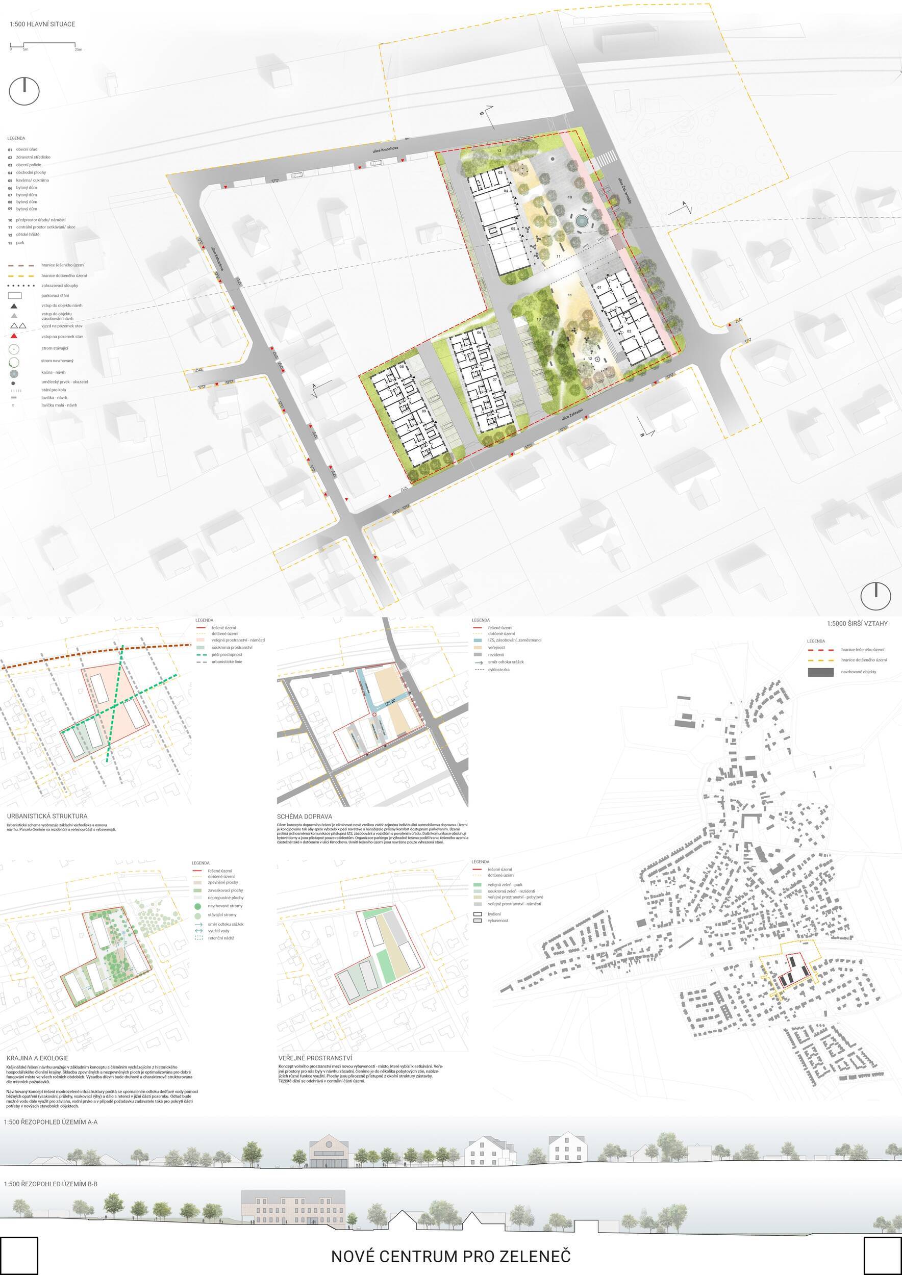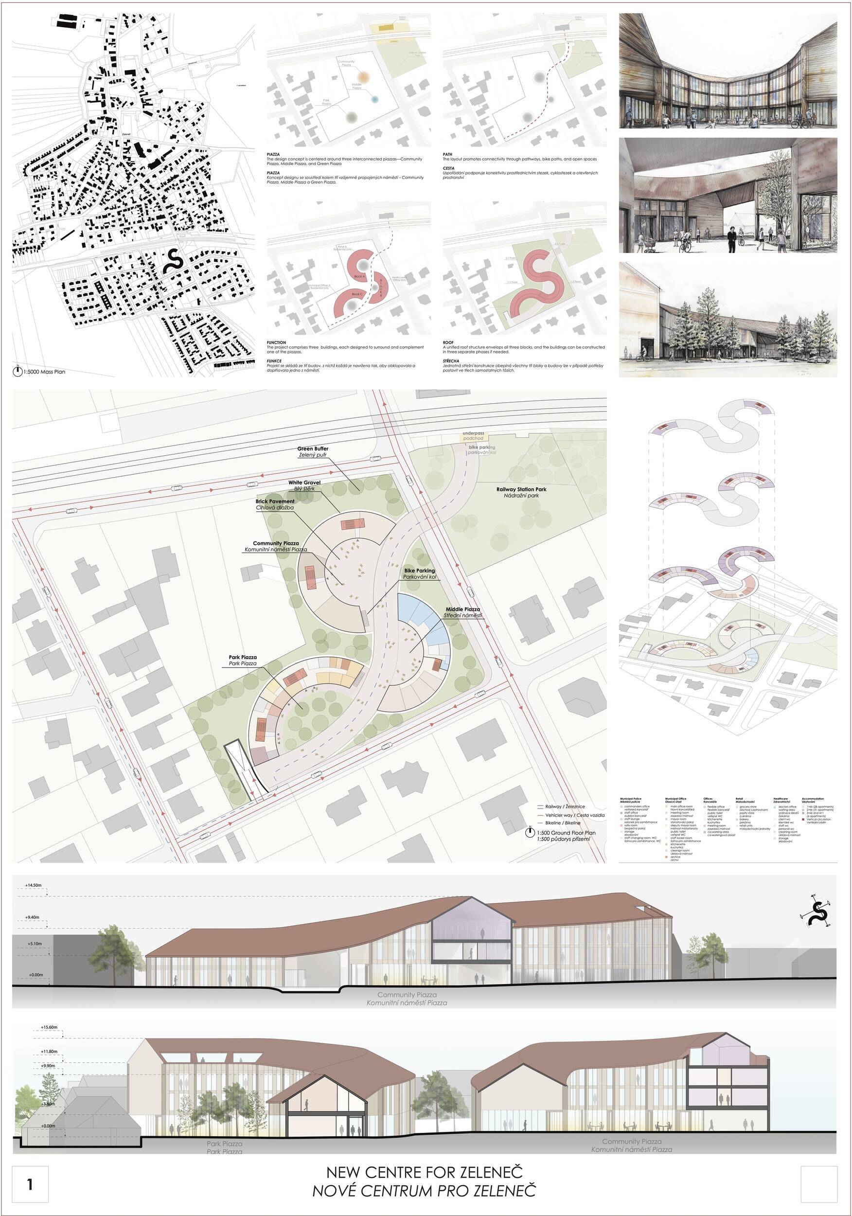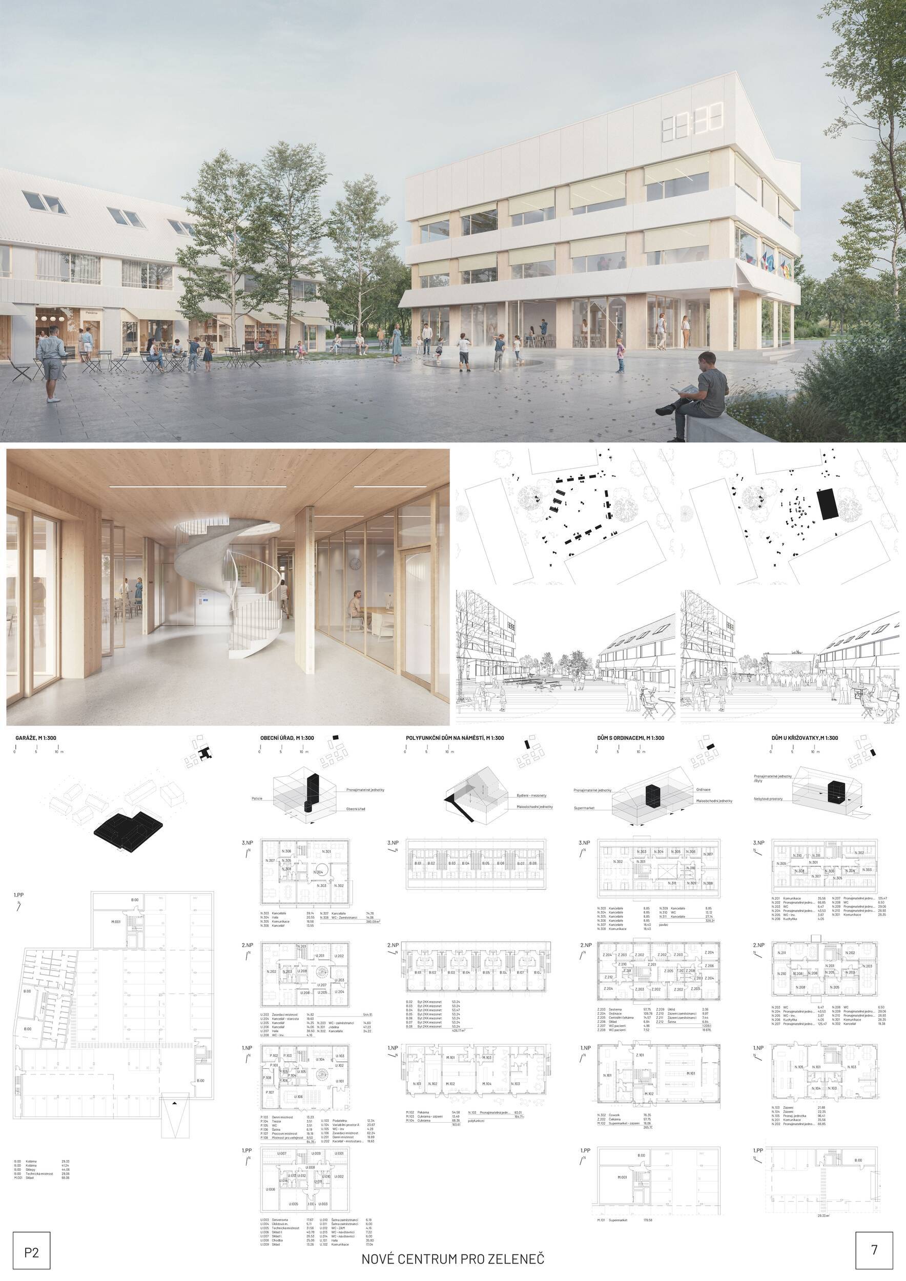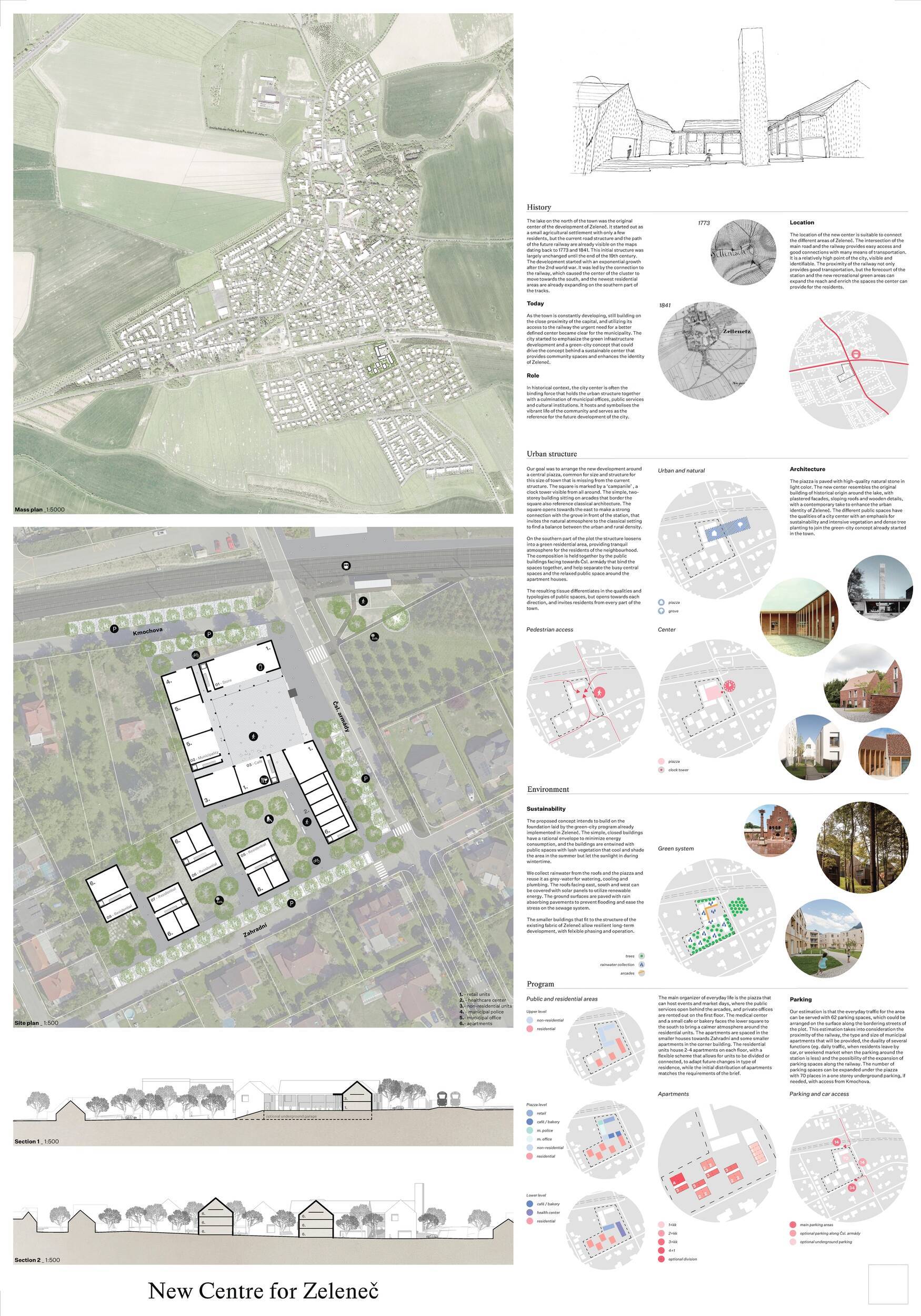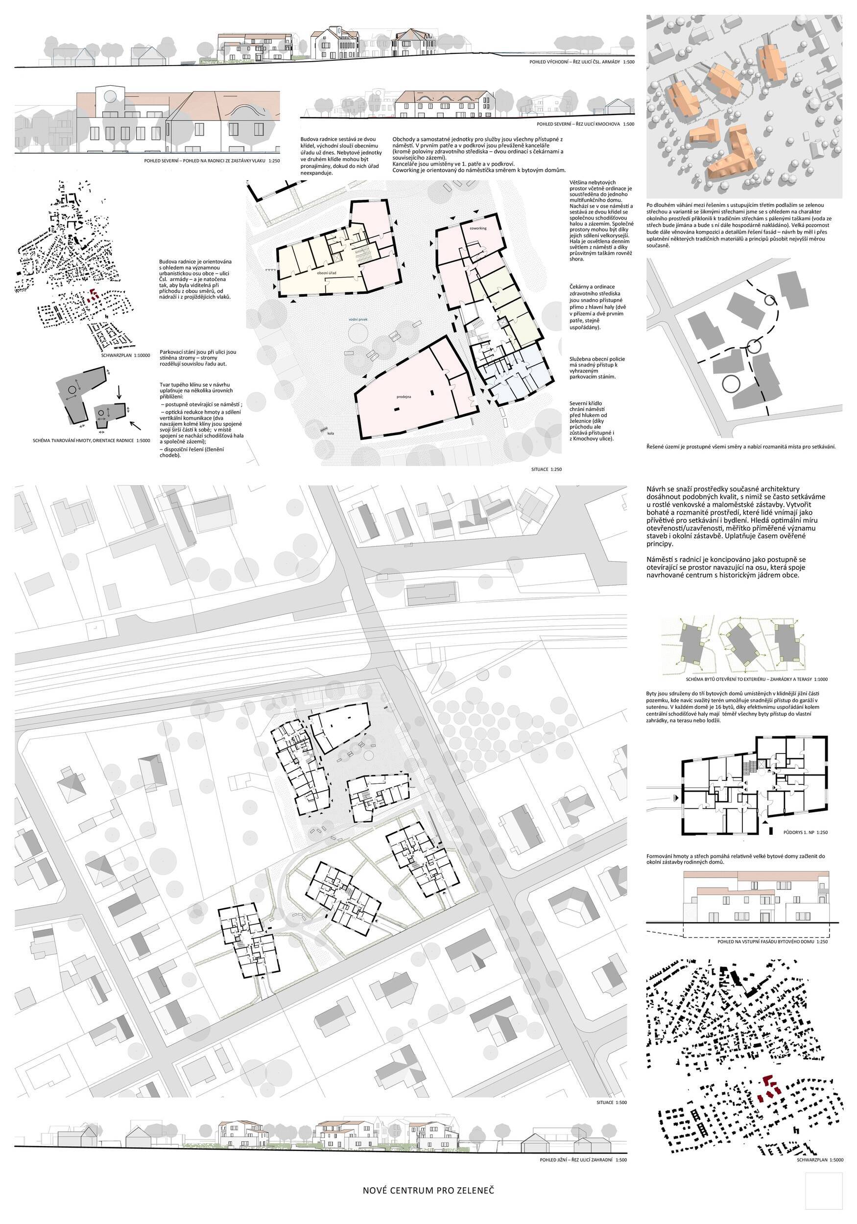 Nejsilnější stránkou soutěžního projektu č. 1 je měřítko jednotlivých budov, které odpovídá měřítku okolní zástavby obce Zeleneč, tvořené převážně rodinnými domy. Vzájemné uspořádání budov však působí rigidně a nevytváří přirozený, organický urbanismus, který by plně odpovídal požadavkům obce. Přestože byli autoři v prvním kole upozorněni na přílišnou tuhost celkového řešení, návrh ve druhém kole neprošel zásadní úpravou ani revizí. Progres tak zůstal omezen pouze na dílčí detaily a formální dopracování. Urbanistické řešení je založeno na dvou průhledových osách, které se vzájemně protínají. První osa je zakončena akcentovaným obecním úřadem, druhá směřuje do obytné zástavby bytových domů. První osu vyplňuje především náměstí s vodním prvkem a zelení po stranách veřejného prostoru. Druhá osa slouží jako pěší komunikace mezi domy s předzahrádkami. Skutečnost, že se pod oběma prostory nachází podzemní parkoviště, však výrazně omezuje možnosti výsadby, zejména stromů, což má negativní dopad na budoucí kvalitu a využitelnost těchto prostor. Obecní úřad tvoří dominantu náměstí a určuje jeho prostorovou orientaci. Tato orientace se však nejeví jako vhodná při pohledu od nádraží – směru, odkud bude přicházet většina návštěvníků nového centra. Úřad je vůči tomuto směru natočen spíše bokem a nedostatečně s příchozími komunikuje. Multifunkční objekty a zdravotní středisko, obklopující náměstí, tvoří funkční celek napojený na podzemní garáže. Toto řešení lze považovat za zdařilé, určitou slabinou je však umístění prodejny potravin. Nachází se v rohu náměstí, poměrně daleko od železniční zastávky, čímž se její využití zbytečně omezuje. Architektonický výraz vychází z tradičního tvarosloví, které je posunuto do současnější podoby. Bytové domy rovněž tvoří kompaktní celek s napojením na podzemní garáže a sklepní prostory, což představuje uživatelsky komfortní řešení. Dispozice působí spíše standardně a postrádají kreativitu. Největší limity mají byty ve druhém a třetím nadzemním podlaží, které jsou řešeny jako podkrovní. Jejich osvětlení a větrání je zajištěno výhradně střešními okny, což je zejména v letních měsících nevhodné. Umístění kočárkárny mimo samotné obytné objekty je velmi nepraktické a přispívá k celkové nepřesvědčivosti dispozičního řešení. Dopravní a parkovací schéma je řešeno logicky – jak s ohledem na návaznost na stávající komunikace, tak na jednotlivé objekty. Koncept zeleně a modrozelené infrastruktury je mimo prostory nad podzemními garážemi zpracován vhodně a podporuje příjemné užívání veřejných prostor prostřednictvím promyšlené výsadby.