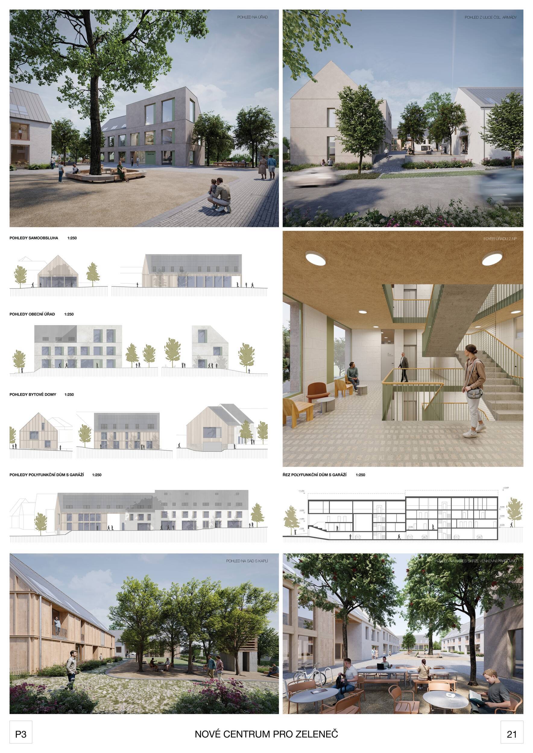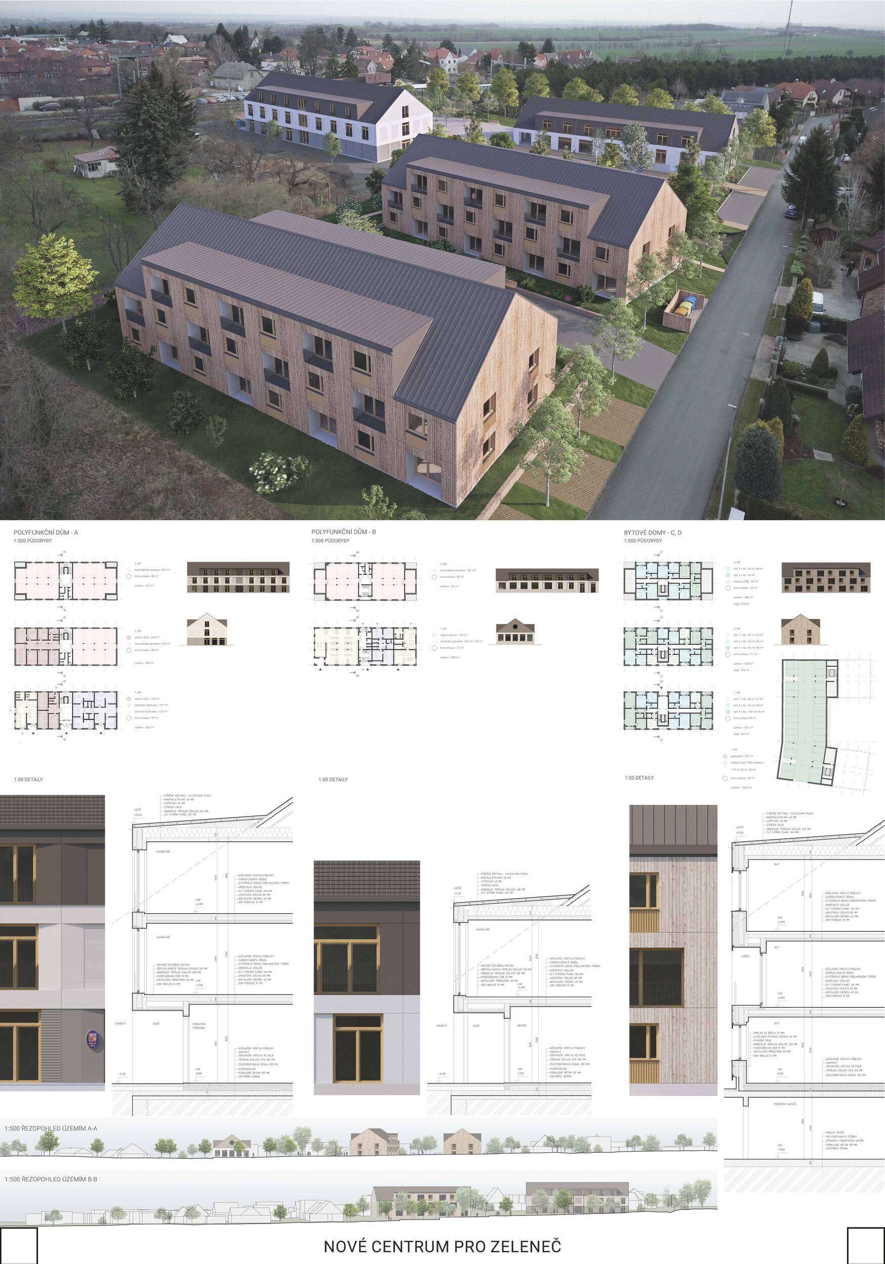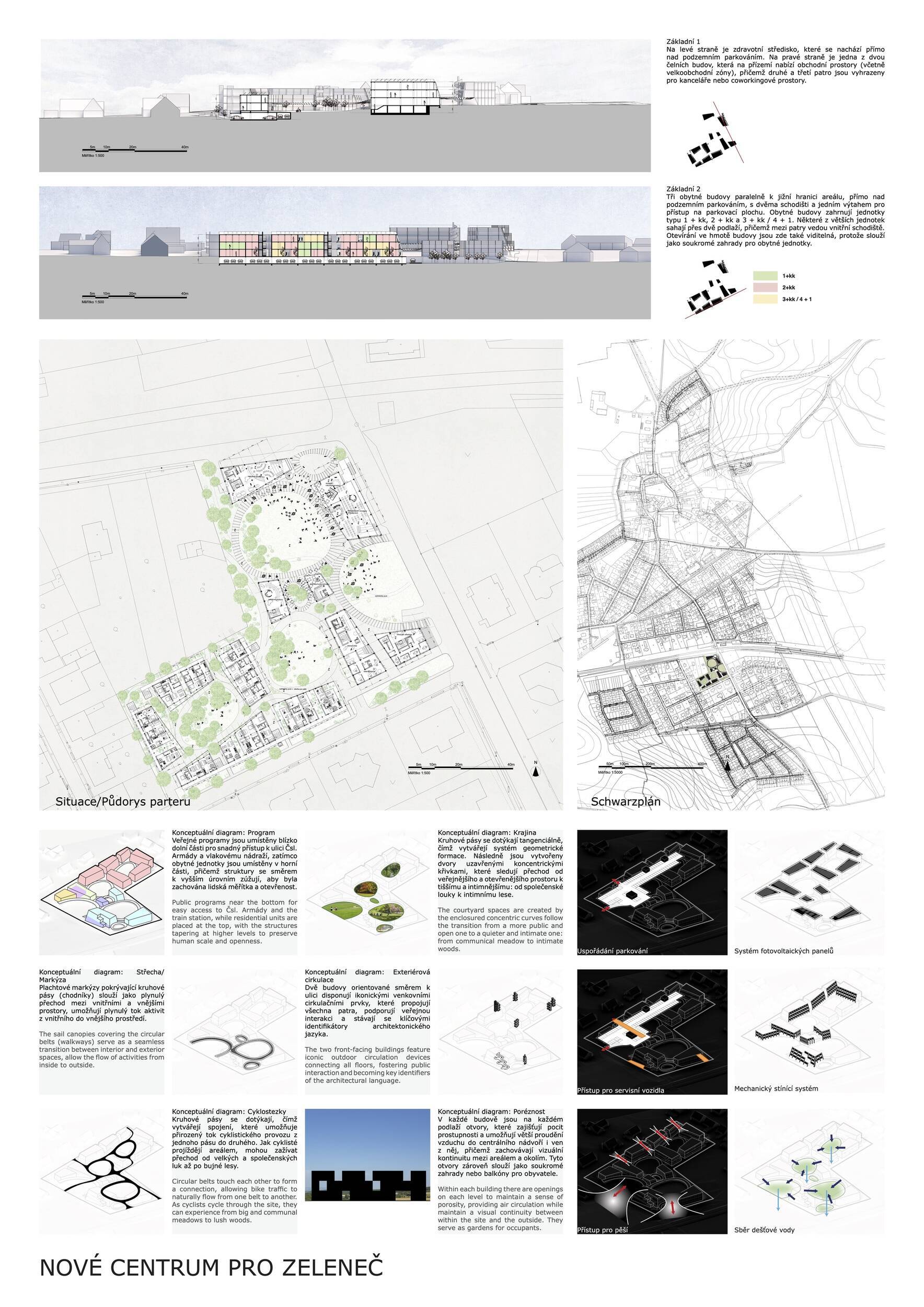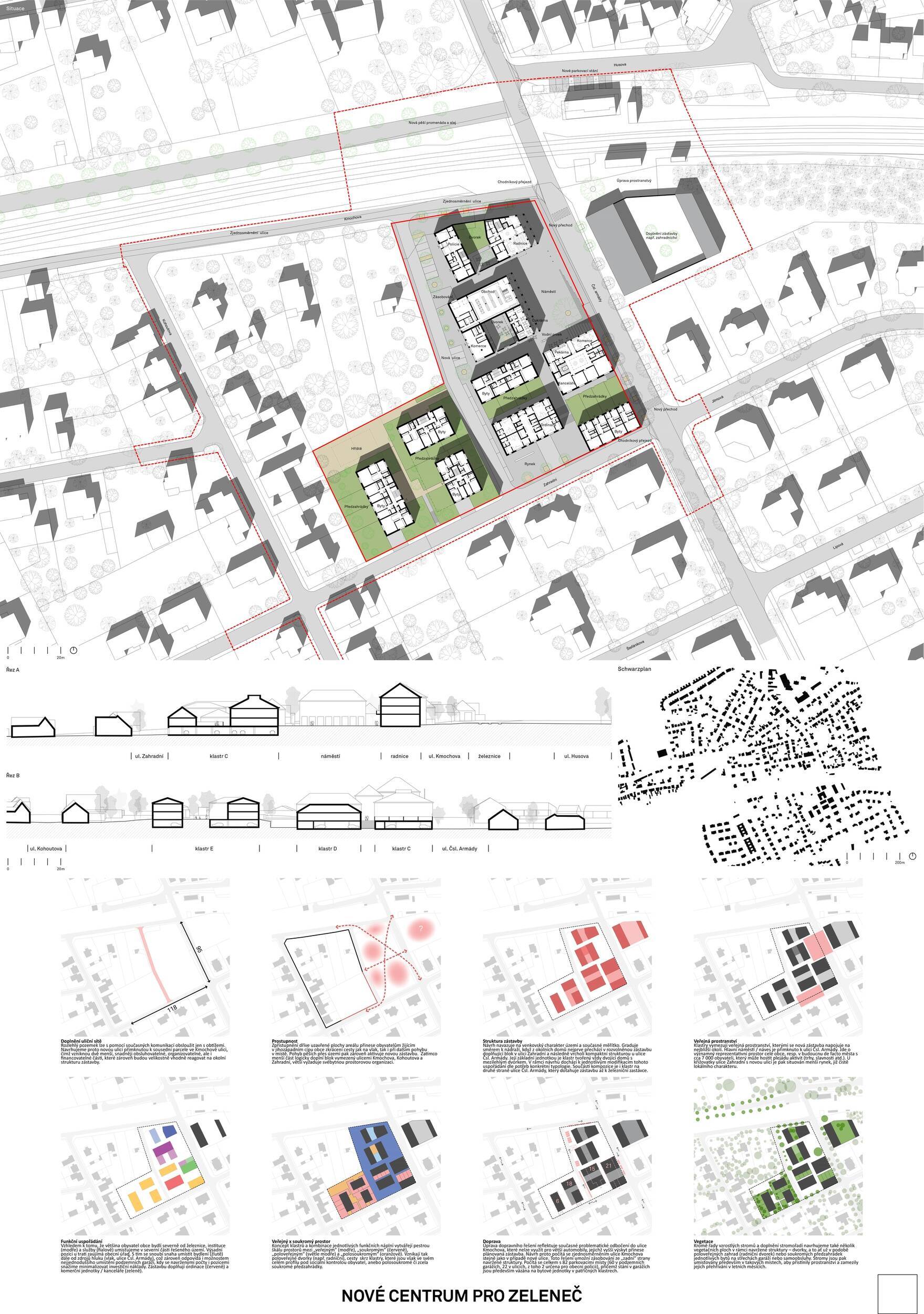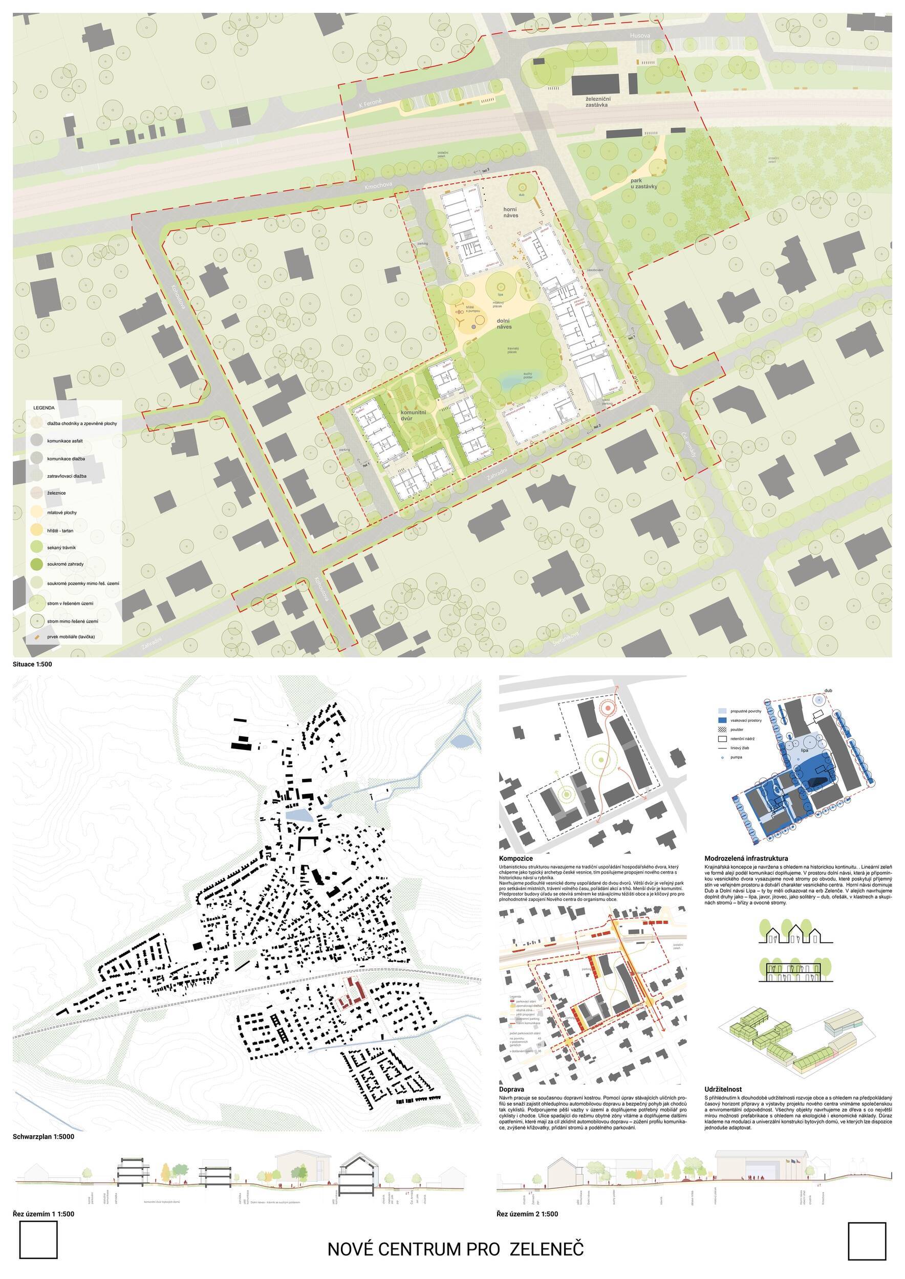 Nejsilnější stránkou soutěžního projektu č. 1 je měřítko jednotlivých budov, které odpovídá měřítku okolní zástavby obce Zeleneč, tvořené převážně rodinnými domy. Vzájemné uspořádání budov však působí rigidně a nevytváří přirozený, organický urbanismus, který by plně odpovídal požadavkům obce. Přestože byli autoři v prvním kole upozorněni na přílišnou tuhost celkového řešení, návrh ve druhém kole neprošel zásadní úpravou ani revizí. Progres tak zůstal omezen pouze na dílčí detaily a formální dopracování. Urbanistické řešení je založeno na dvou průhledových osách, které se vzájemně protínají. První osa je zakončena akcentovaným obecním úřadem, druhá směřuje do obytné zástavby bytových domů. První osu vyplňuje především náměstí s vodním prvkem a zelení po stranách veřejného prostoru. Druhá osa slouží jako pěší komunikace mezi domy s předzahrádkami. Skutečnost, že se pod oběma prostory nachází podzemní parkoviště, však výrazně omezuje možnosti výsadby, zejména stromů, což má negativní dopad na budoucí kvalitu a využitelnost těchto prostor. Obecní úřad tvoří dominantu náměstí a určuje jeho prostorovou orientaci. Tato orientace se však nejeví jako vhodná při pohledu od nádraží – směru, odkud bude přicházet většina návštěvníků nového centra. Úřad je vůči tomuto směru natočen spíše bokem a nedostatečně s příchozími komunikuje. Multifunkční objekty a zdravotní středisko, obklopující náměstí, tvoří funkční celek napojený na podzemní garáže. Toto řešení lze považovat za zdařilé, určitou slabinou je však umístění prodejny potravin. Nachází se v rohu náměstí, poměrně daleko od železniční zastávky, čímž se její využití zbytečně omezuje. Architektonický výraz vychází z tradičního tvarosloví, které je posunuto do současnější podoby. Bytové domy rovněž tvoří kompaktní celek s napojením na podzemní garáže a sklepní prostory, což představuje uživatelsky komfortní řešení. Dispozice působí spíše standardně a postrádají kreativitu. Největší limity mají byty ve druhém a třetím nadzemním podlaží, které jsou řešeny jako podkrovní. Jejich osvětlení a větrání je zajištěno výhradně střešními okny, což je zejména v letních měsících nevhodné. Umístění kočárkárny mimo samotné obytné objekty je velmi nepraktické a přispívá k celkové nepřesvědčivosti dispozičního řešení. Dopravní a parkovací schéma je řešeno logicky – jak s ohledem na návaznost na stávající komunikace, tak na jednotlivé objekty. Koncept zeleně a modrozelené infrastruktury je mimo prostory nad podzemními garážemi zpracován vhodně a podporuje příjemné užívání veřejných prostor prostřednictvím promyšlené výsadby.