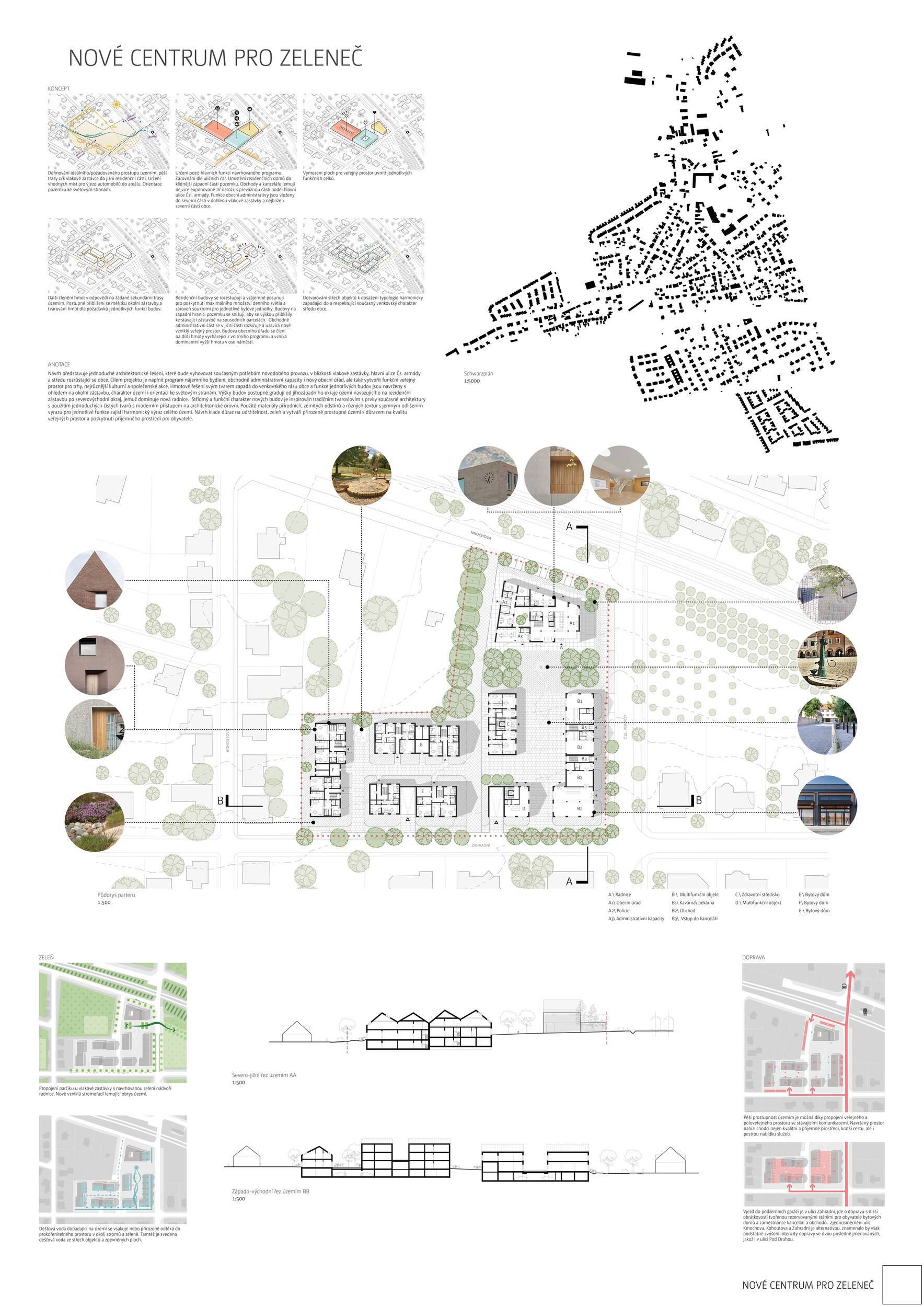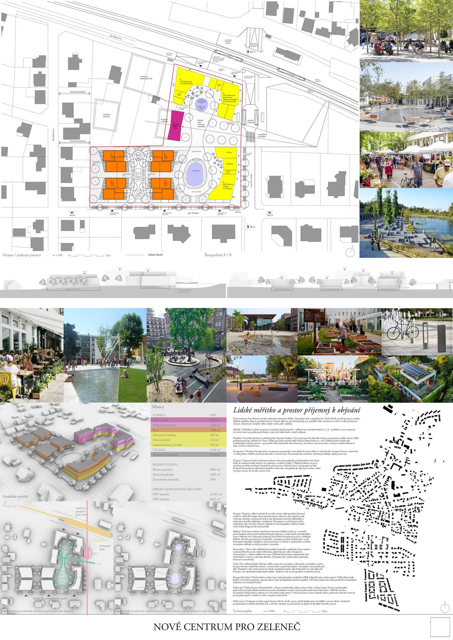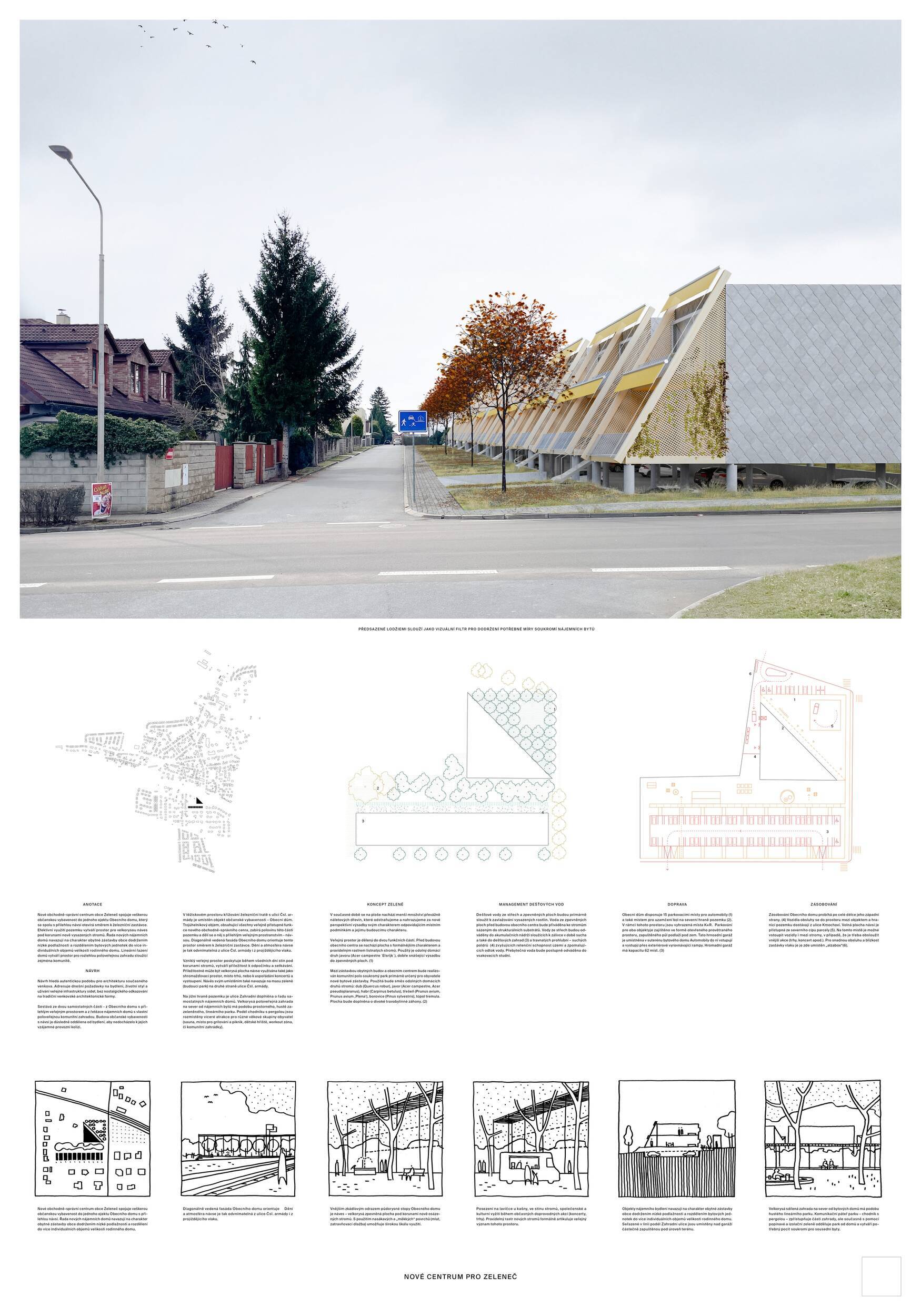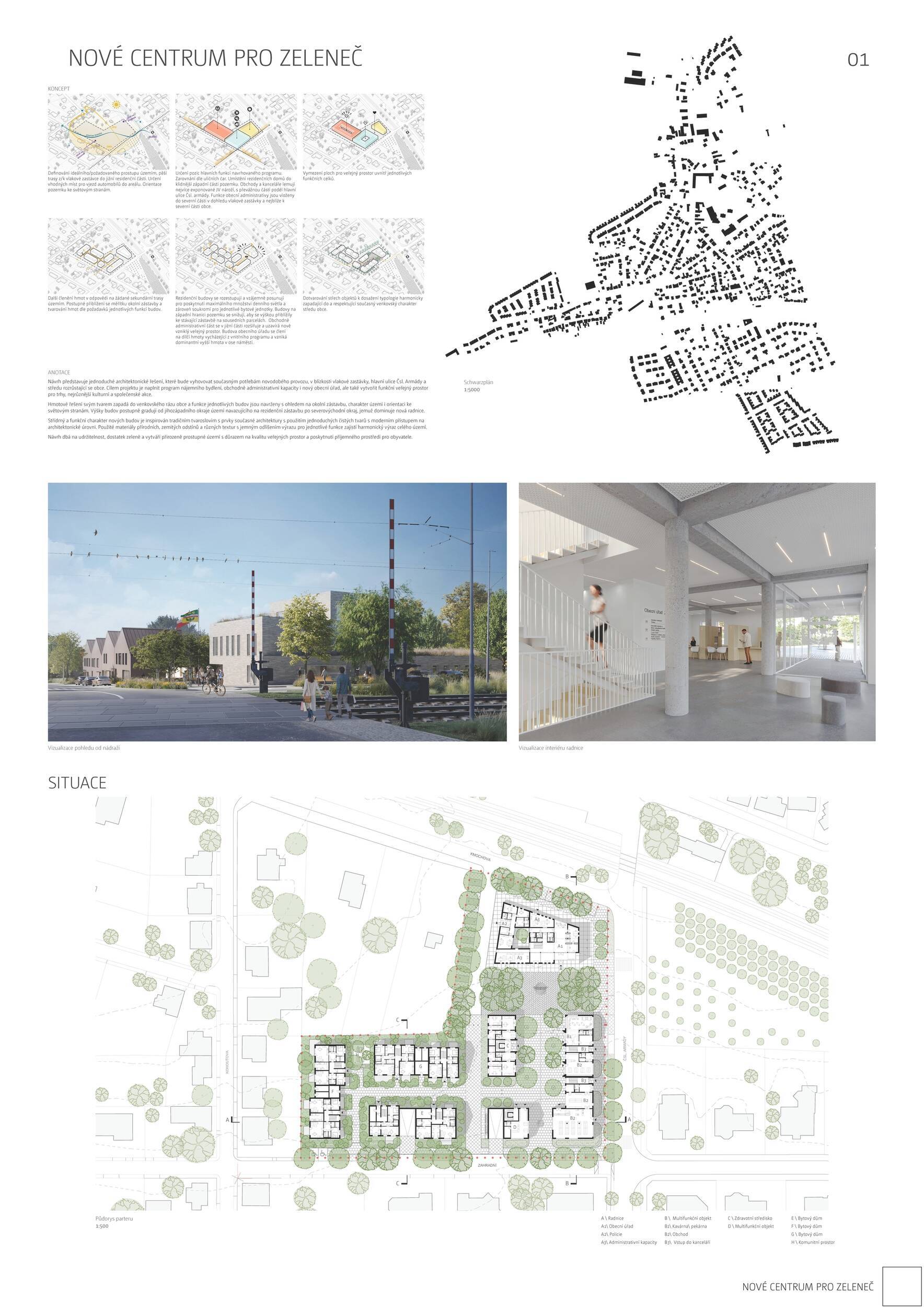 Nejsilnější stránkou soutěžního projektu č. 1 je měřítko jednotlivých budov, které odpovídá měřítku okolní zástavby obce Zeleneč, tvořené převážně rodinnými domy. Vzájemné uspořádání budov však působí rigidně a nevytváří přirozený, organický urbanismus, který by plně odpovídal požadavkům obce. Přestože byli autoři v prvním kole upozorněni na přílišnou tuhost celkového řešení, návrh ve druhém kole neprošel zásadní úpravou ani revizí. Progres tak zůstal omezen pouze na dílčí detaily a formální dopracování. Urbanistické řešení je založeno na dvou průhledových osách, které se vzájemně protínají. První osa je zakončena akcentovaným obecním úřadem, druhá směřuje do obytné zástavby bytových domů. První osu vyplňuje především náměstí s vodním prvkem a zelení po stranách veřejného prostoru. Druhá osa slouží jako pěší komunikace mezi domy s předzahrádkami. Skutečnost, že se pod oběma prostory nachází podzemní parkoviště, však výrazně omezuje možnosti výsadby, zejména stromů, což má negativní dopad na budoucí kvalitu a využitelnost těchto prostor. Obecní úřad tvoří dominantu náměstí a určuje jeho prostorovou orientaci. Tato orientace se však nejeví jako vhodná při pohledu od nádraží – směru, odkud bude přicházet většina návštěvníků nového centra. Úřad je vůči tomuto směru natočen spíše bokem a nedostatečně s příchozími komunikuje. Multifunkční objekty a zdravotní středisko, obklopující náměstí, tvoří funkční celek napojený na podzemní garáže. Toto řešení lze považovat za zdařilé, určitou slabinou je však umístění prodejny potravin. Nachází se v rohu náměstí, poměrně daleko od železniční zastávky, čímž se její využití zbytečně omezuje. Architektonický výraz vychází z tradičního tvarosloví, které je posunuto do současnější podoby. Bytové domy rovněž tvoří kompaktní celek s napojením na podzemní garáže a sklepní prostory, což představuje uživatelsky komfortní řešení. Dispozice působí spíše standardně a postrádají kreativitu. Největší limity mají byty ve druhém a třetím nadzemním podlaží, které jsou řešeny jako podkrovní. Jejich osvětlení a větrání je zajištěno výhradně střešními okny, což je zejména v letních měsících nevhodné. Umístění kočárkárny mimo samotné obytné objekty je velmi nepraktické a přispívá k celkové nepřesvědčivosti dispozičního řešení. Dopravní a parkovací schéma je řešeno logicky – jak s ohledem na návaznost na stávající komunikace, tak na jednotlivé objekty. Koncept zeleně a modrozelené infrastruktury je mimo prostory nad podzemními garážemi zpracován vhodně a podporuje příjemné užívání veřejných prostor prostřednictvím promyšlené výsadby.