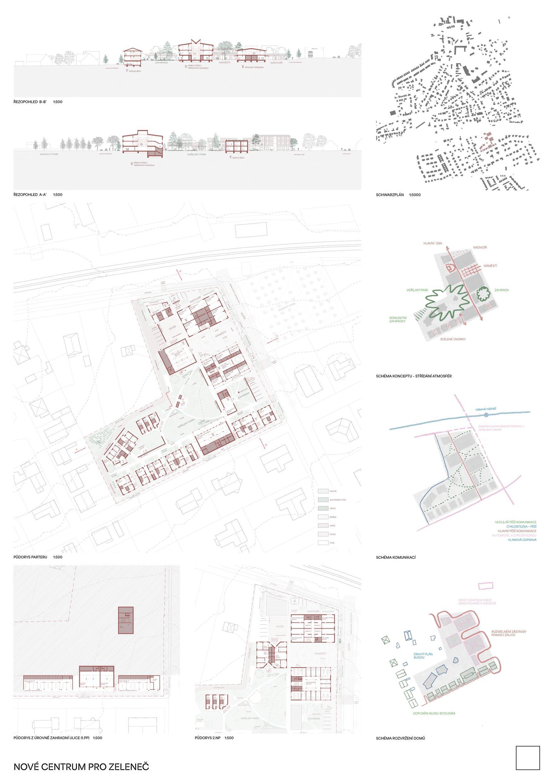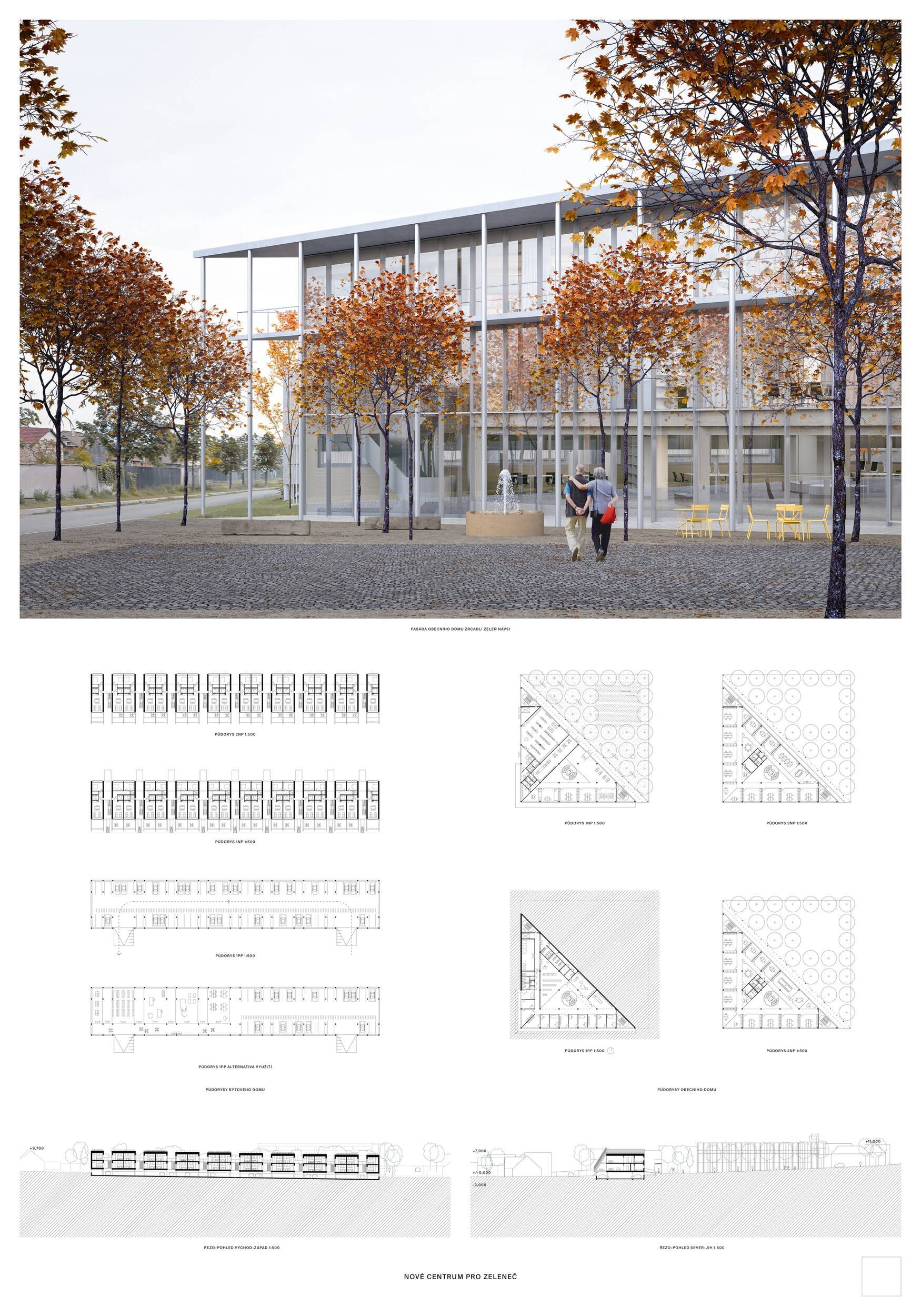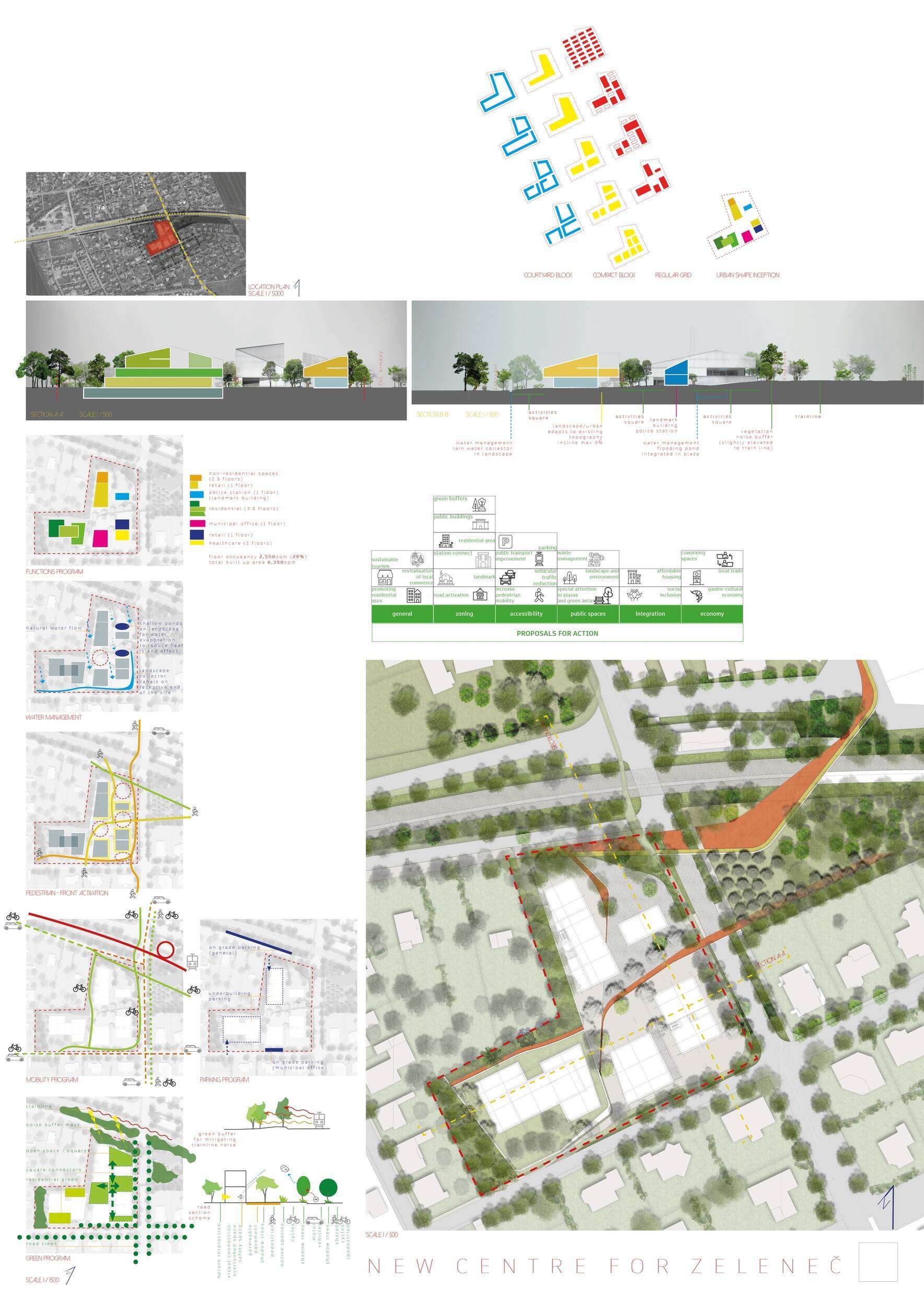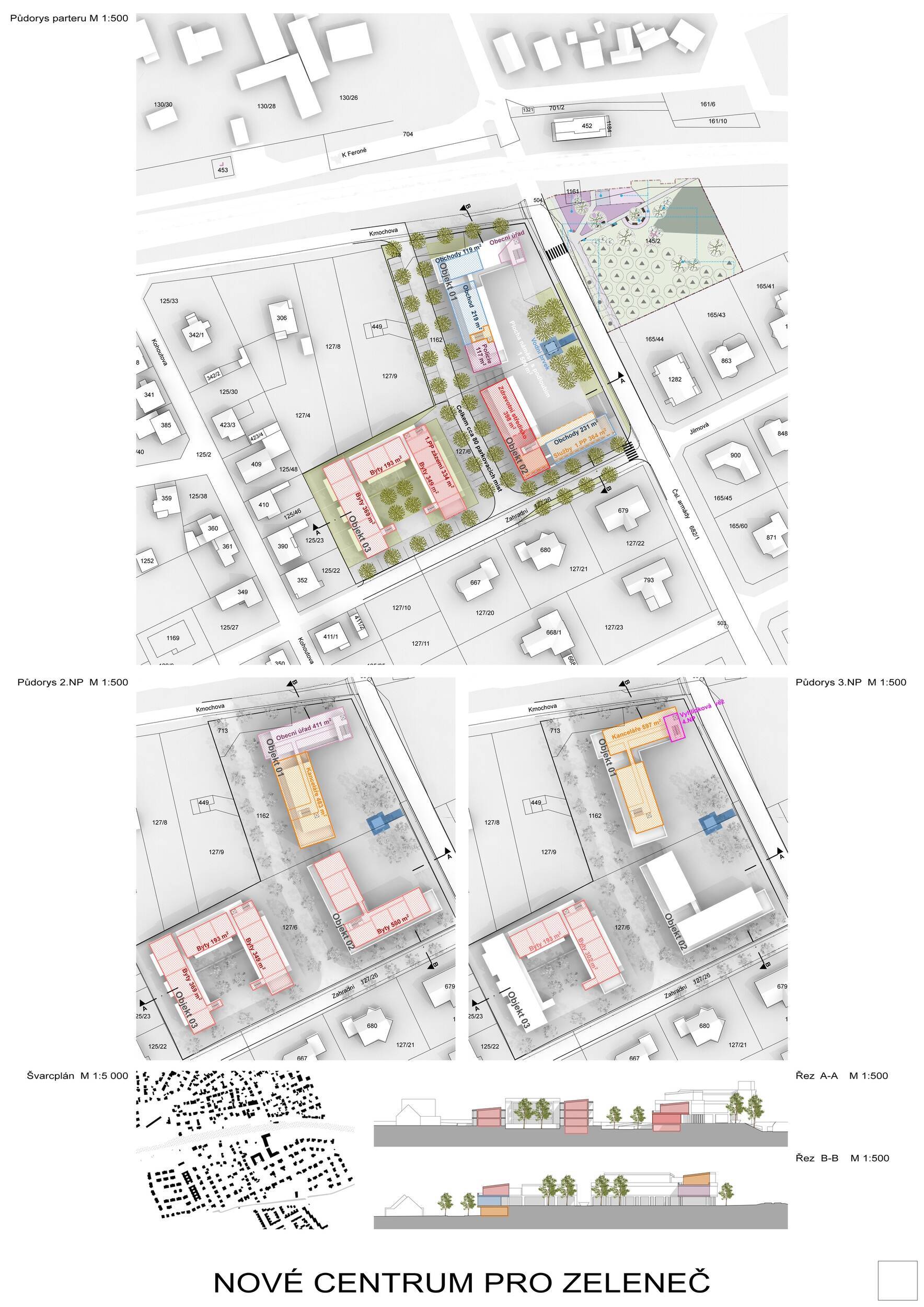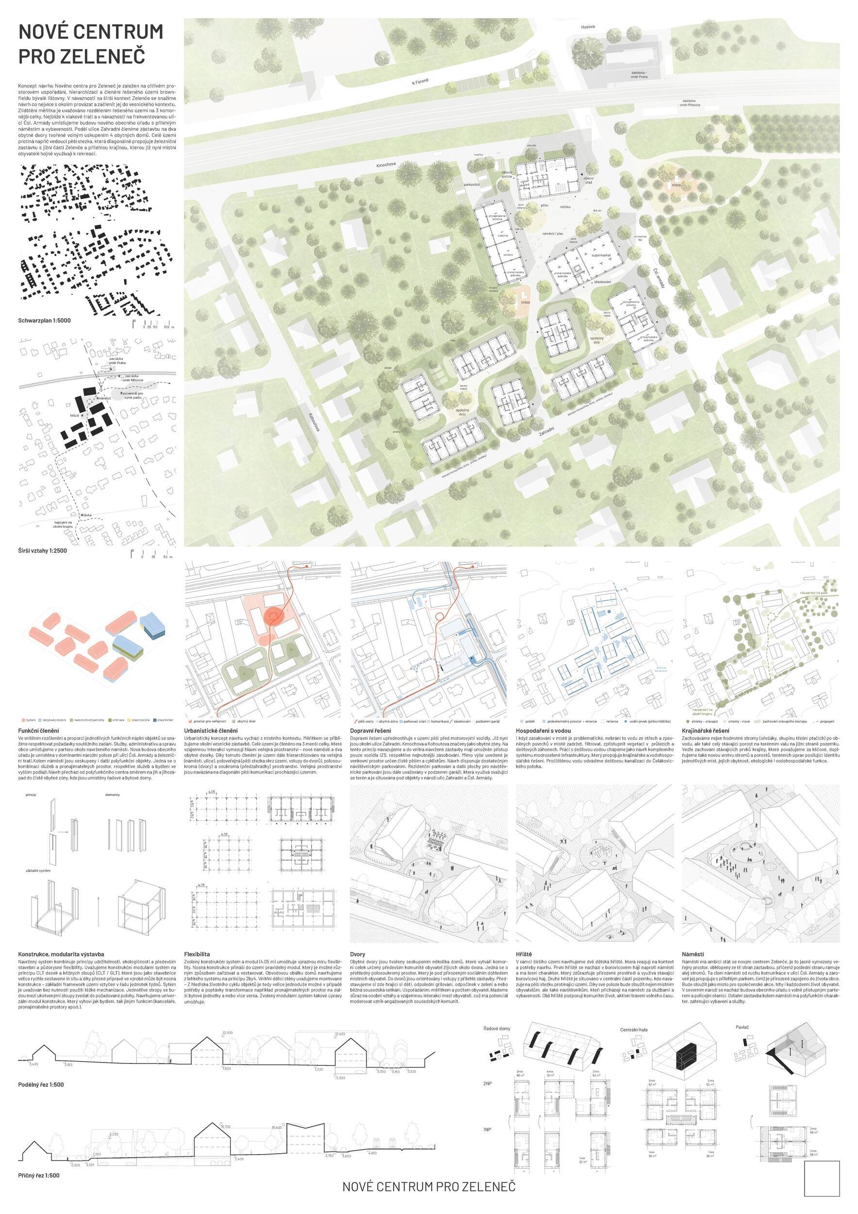 Nejsilnější stránkou soutěžního projektu č. 1 je měřítko jednotlivých budov, které odpovídá měřítku okolní zástavby obce Zeleneč, tvořené převážně rodinnými domy. Vzájemné uspořádání budov však působí rigidně a nevytváří přirozený, organický urbanismus, který by plně odpovídal požadavkům obce. Přestože byli autoři v prvním kole upozorněni na přílišnou tuhost celkového řešení, návrh ve druhém kole neprošel zásadní úpravou ani revizí. Progres tak zůstal omezen pouze na dílčí detaily a formální dopracování. Urbanistické řešení je založeno na dvou průhledových osách, které se vzájemně protínají. První osa je zakončena akcentovaným obecním úřadem, druhá směřuje do obytné zástavby bytových domů. První osu vyplňuje především náměstí s vodním prvkem a zelení po stranách veřejného prostoru. Druhá osa slouží jako pěší komunikace mezi domy s předzahrádkami. Skutečnost, že se pod oběma prostory nachází podzemní parkoviště, však výrazně omezuje možnosti výsadby, zejména stromů, což má negativní dopad na budoucí kvalitu a využitelnost těchto prostor. Obecní úřad tvoří dominantu náměstí a určuje jeho prostorovou orientaci. Tato orientace se však nejeví jako vhodná při pohledu od nádraží – směru, odkud bude přicházet většina návštěvníků nového centra. Úřad je vůči tomuto směru natočen spíše bokem a nedostatečně s příchozími komunikuje. Multifunkční objekty a zdravotní středisko, obklopující náměstí, tvoří funkční celek napojený na podzemní garáže. Toto řešení lze považovat za zdařilé, určitou slabinou je však umístění prodejny potravin. Nachází se v rohu náměstí, poměrně daleko od železniční zastávky, čímž se její využití zbytečně omezuje. Architektonický výraz vychází z tradičního tvarosloví, které je posunuto do současnější podoby. Bytové domy rovněž tvoří kompaktní celek s napojením na podzemní garáže a sklepní prostory, což představuje uživatelsky komfortní řešení. Dispozice působí spíše standardně a postrádají kreativitu. Největší limity mají byty ve druhém a třetím nadzemním podlaží, které jsou řešeny jako podkrovní. Jejich osvětlení a větrání je zajištěno výhradně střešními okny, což je zejména v letních měsících nevhodné. Umístění kočárkárny mimo samotné obytné objekty je velmi nepraktické a přispívá k celkové nepřesvědčivosti dispozičního řešení. Dopravní a parkovací schéma je řešeno logicky – jak s ohledem na návaznost na stávající komunikace, tak na jednotlivé objekty. Koncept zeleně a modrozelené infrastruktury je mimo prostory nad podzemními garážemi zpracován vhodně a podporuje příjemné užívání veřejných prostor prostřednictvím promyšlené výsadby.
