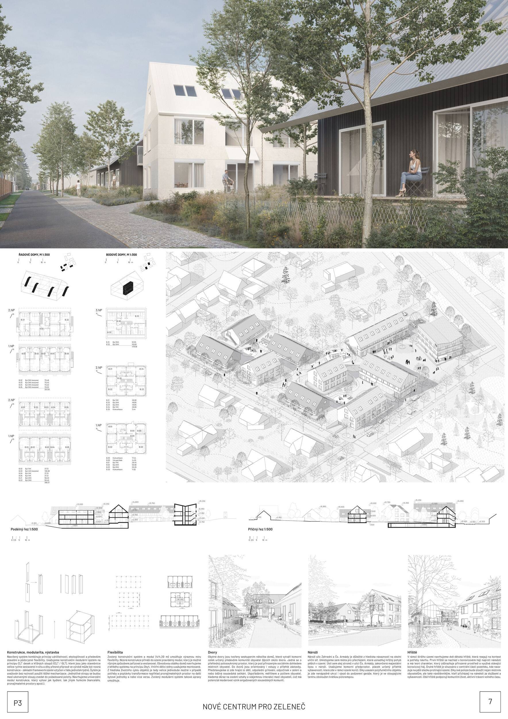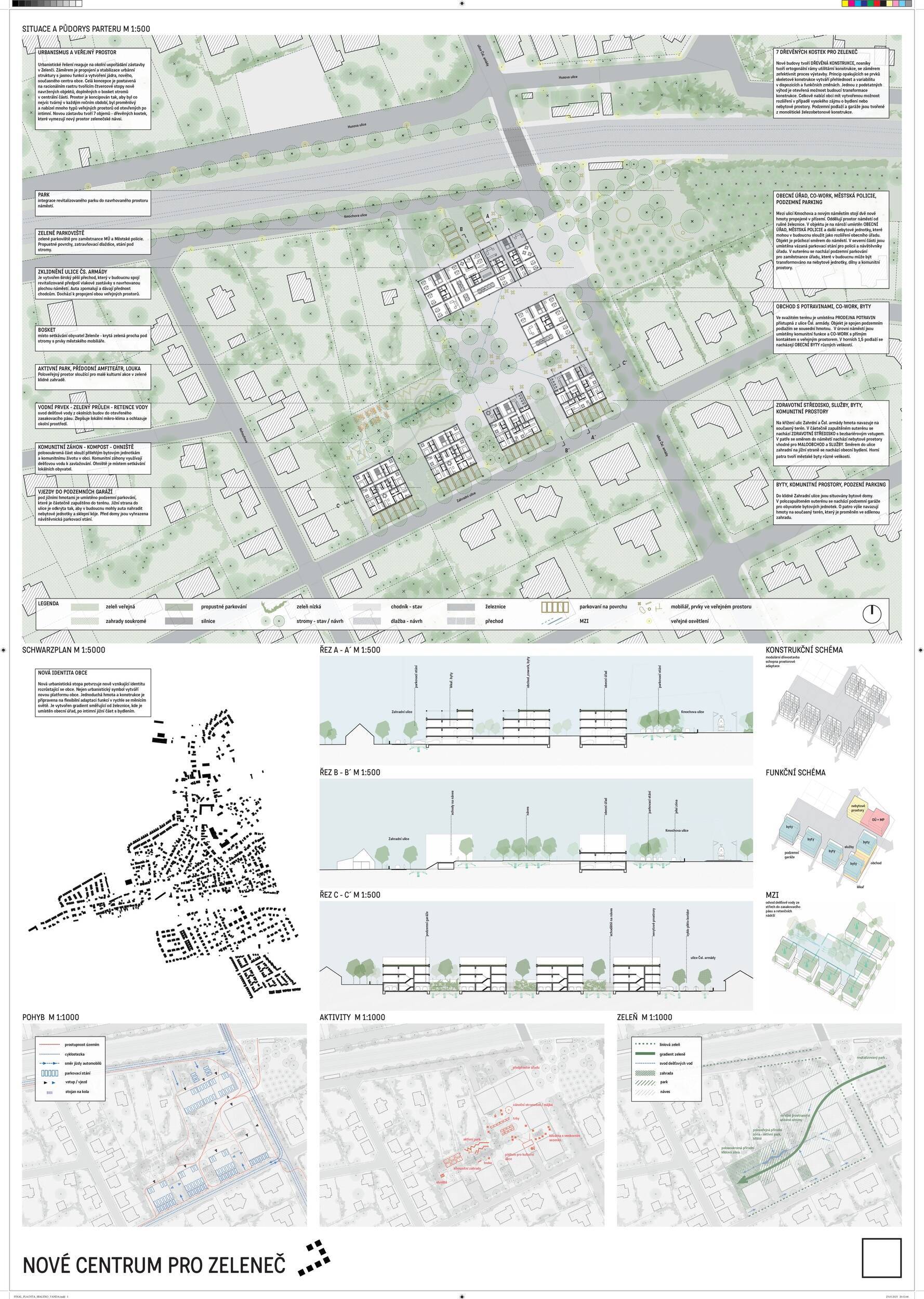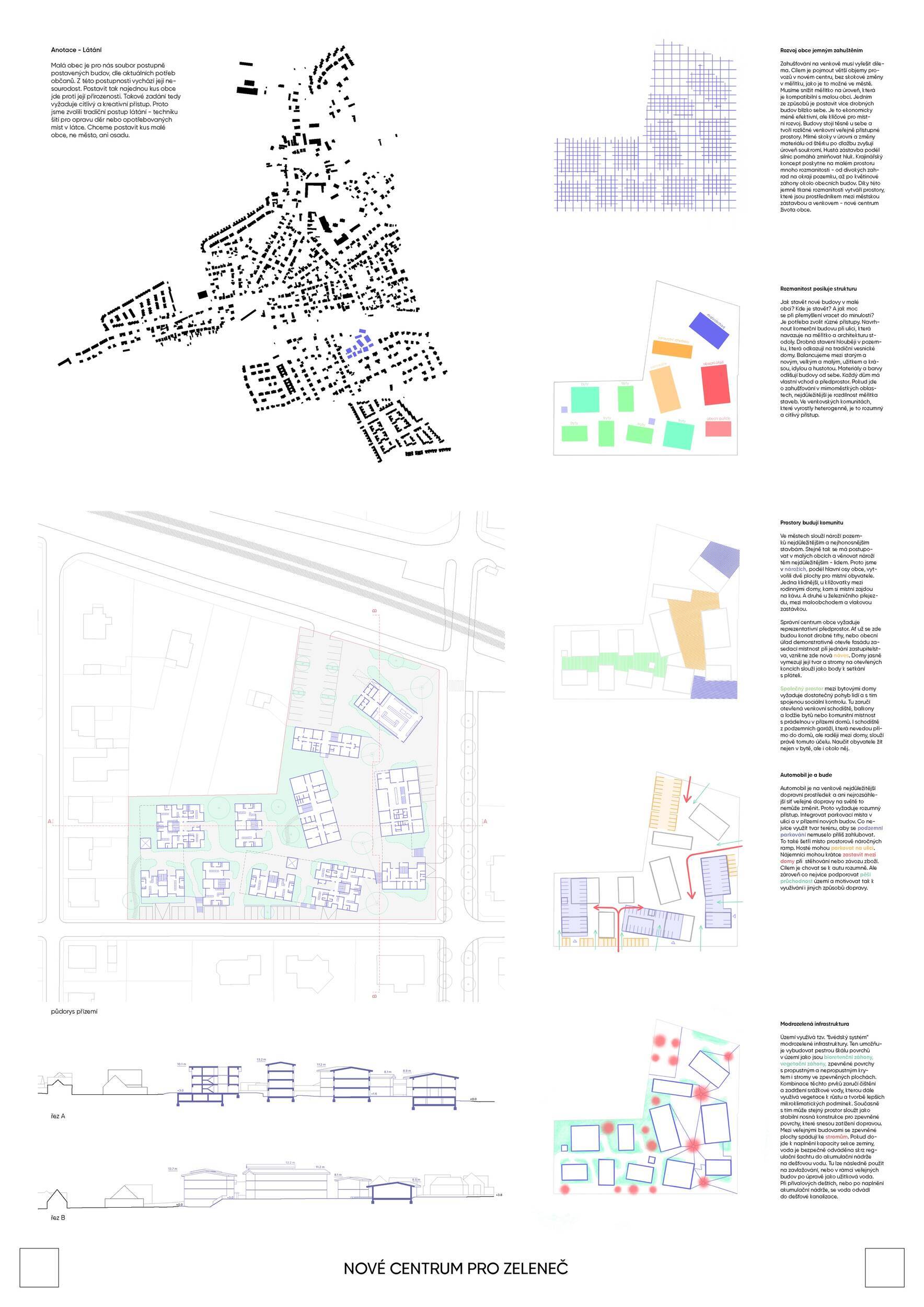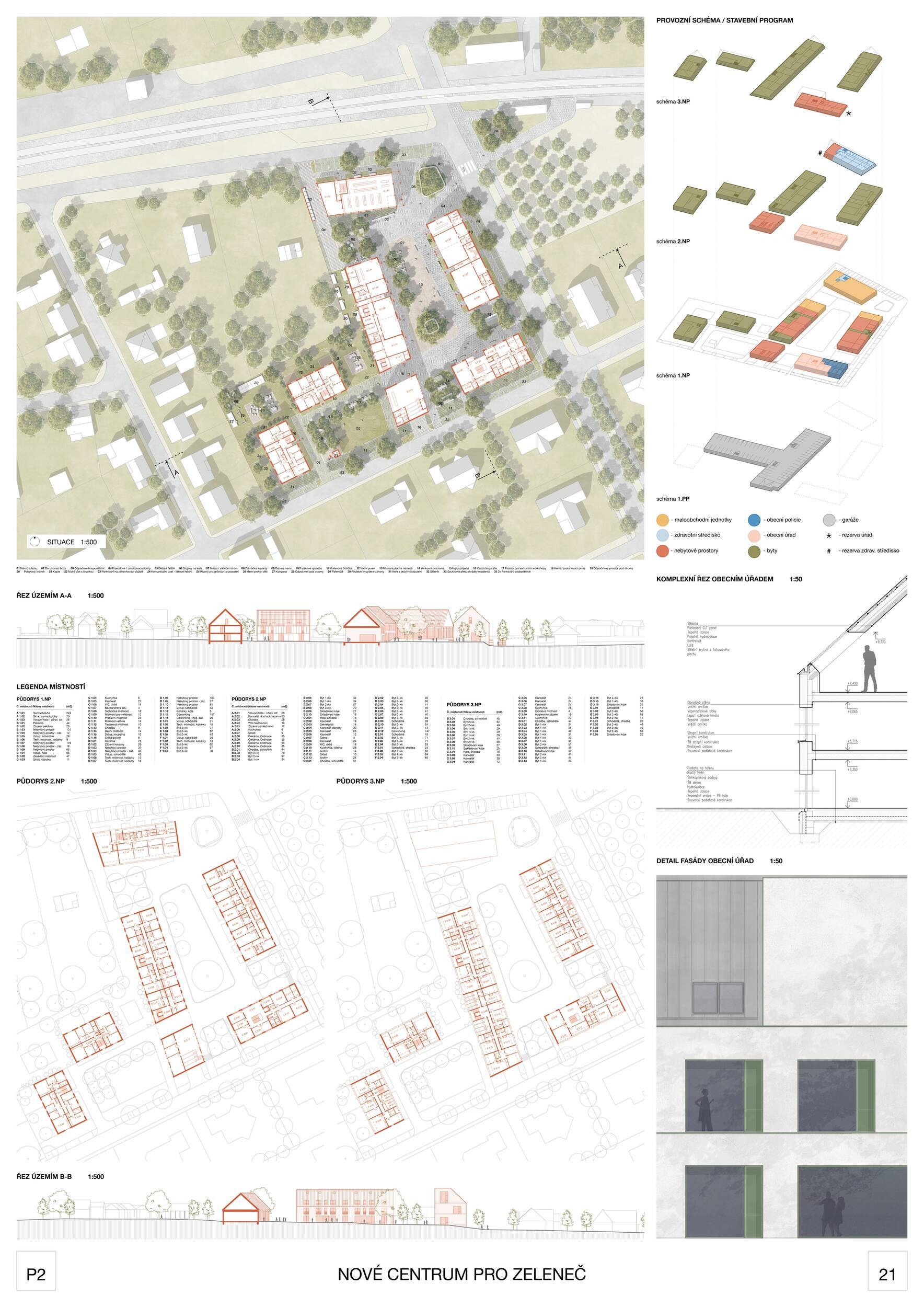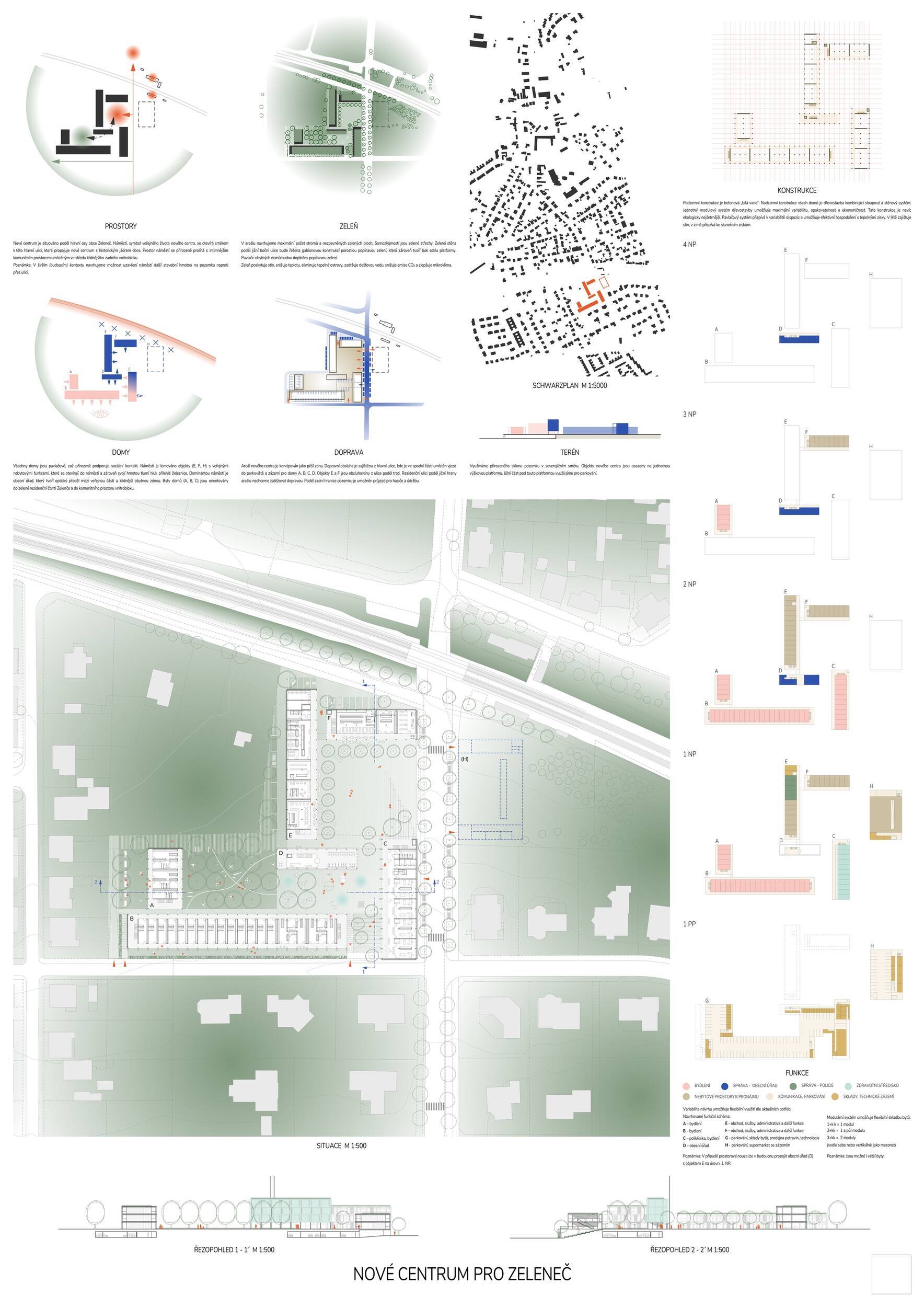 Nejsilnější stránkou soutěžního projektu č. 1 je měřítko jednotlivých budov, které odpovídá měřítku okolní zástavby obce Zeleneč, tvořené převážně rodinnými domy. Vzájemné uspořádání budov však působí rigidně a nevytváří přirozený, organický urbanismus, který by plně odpovídal požadavkům obce. Přestože byli autoři v prvním kole upozorněni na přílišnou tuhost celkového řešení, návrh ve druhém kole neprošel zásadní úpravou ani revizí. Progres tak zůstal omezen pouze na dílčí detaily a formální dopracování. Urbanistické řešení je založeno na dvou průhledových osách, které se vzájemně protínají. První osa je zakončena akcentovaným obecním úřadem, druhá směřuje do obytné zástavby bytových domů. První osu vyplňuje především náměstí s vodním prvkem a zelení po stranách veřejného prostoru. Druhá osa slouží jako pěší komunikace mezi domy s předzahrádkami. Skutečnost, že se pod oběma prostory nachází podzemní parkoviště, však výrazně omezuje možnosti výsadby, zejména stromů, což má negativní dopad na budoucí kvalitu a využitelnost těchto prostor. Obecní úřad tvoří dominantu náměstí a určuje jeho prostorovou orientaci. Tato orientace se však nejeví jako vhodná při pohledu od nádraží – směru, odkud bude přicházet většina návštěvníků nového centra. Úřad je vůči tomuto směru natočen spíše bokem a nedostatečně s příchozími komunikuje. Multifunkční objekty a zdravotní středisko, obklopující náměstí, tvoří funkční celek napojený na podzemní garáže. Toto řešení lze považovat za zdařilé, určitou slabinou je však umístění prodejny potravin. Nachází se v rohu náměstí, poměrně daleko od železniční zastávky, čímž se její využití zbytečně omezuje. Architektonický výraz vychází z tradičního tvarosloví, které je posunuto do současnější podoby. Bytové domy rovněž tvoří kompaktní celek s napojením na podzemní garáže a sklepní prostory, což představuje uživatelsky komfortní řešení. Dispozice působí spíše standardně a postrádají kreativitu. Největší limity mají byty ve druhém a třetím nadzemním podlaží, které jsou řešeny jako podkrovní. Jejich osvětlení a větrání je zajištěno výhradně střešními okny, což je zejména v letních měsících nevhodné. Umístění kočárkárny mimo samotné obytné objekty je velmi nepraktické a přispívá k celkové nepřesvědčivosti dispozičního řešení. Dopravní a parkovací schéma je řešeno logicky – jak s ohledem na návaznost na stávající komunikace, tak na jednotlivé objekty. Koncept zeleně a modrozelené infrastruktury je mimo prostory nad podzemními garážemi zpracován vhodně a podporuje příjemné užívání veřejných prostor prostřednictvím promyšlené výsadby.