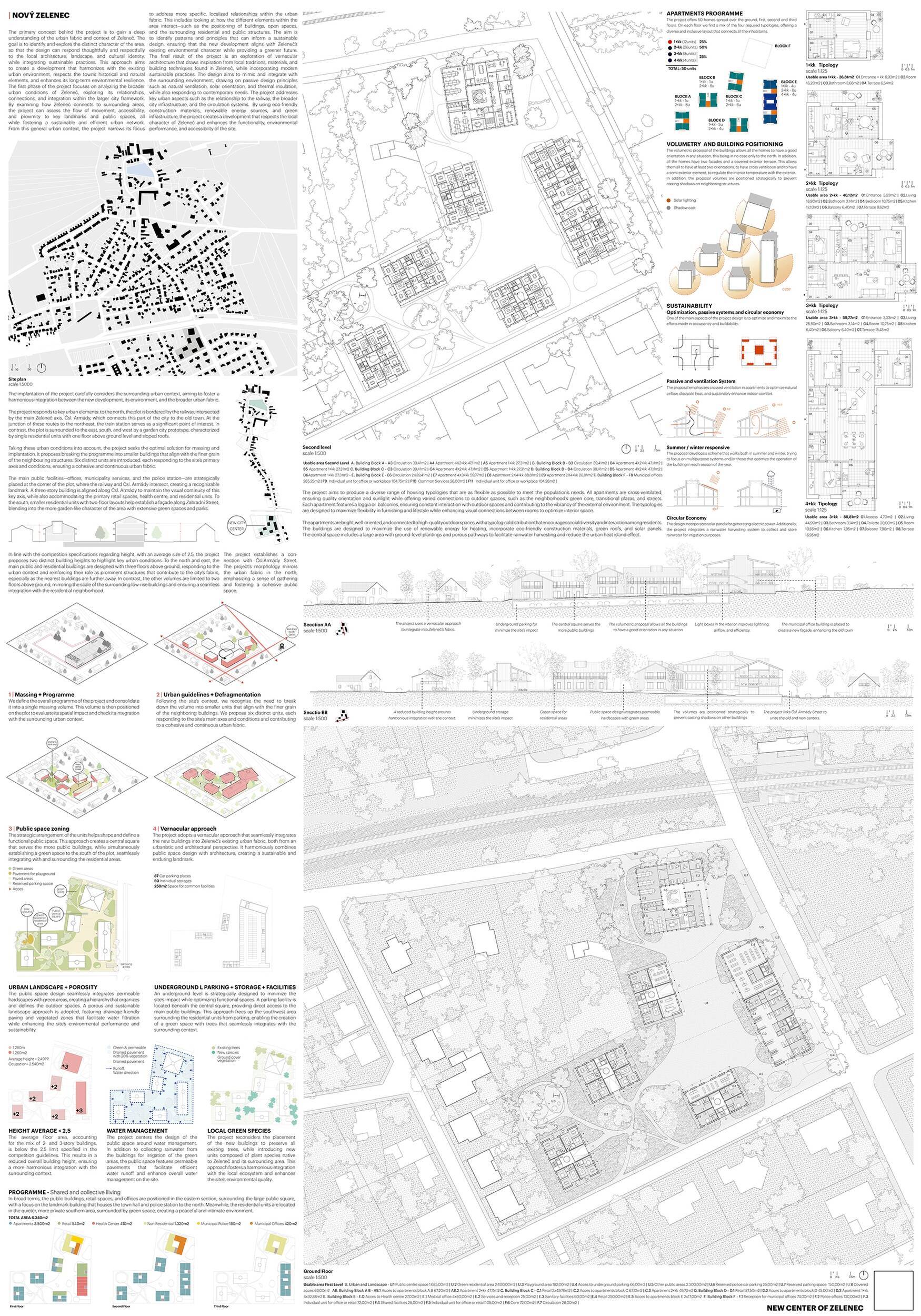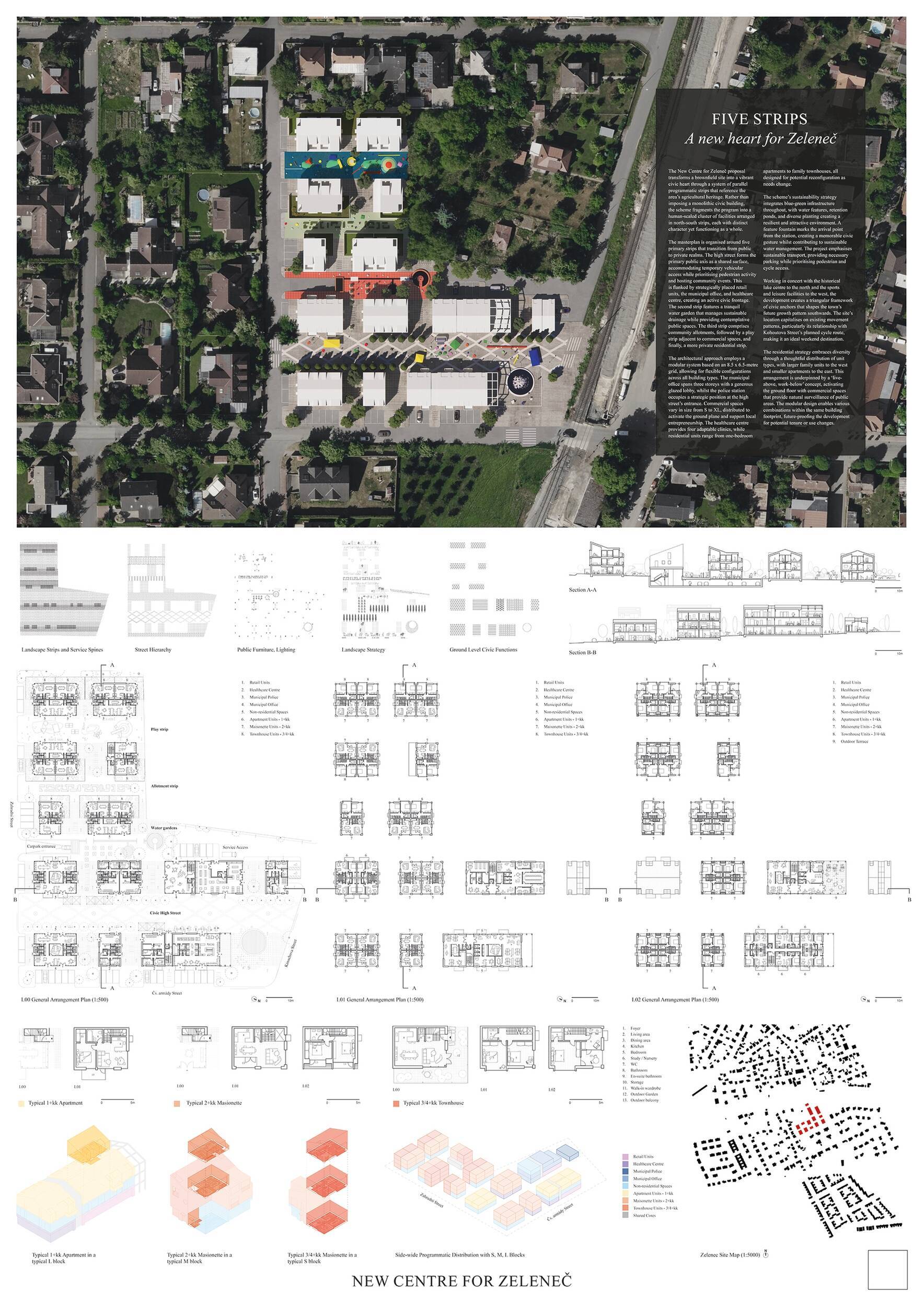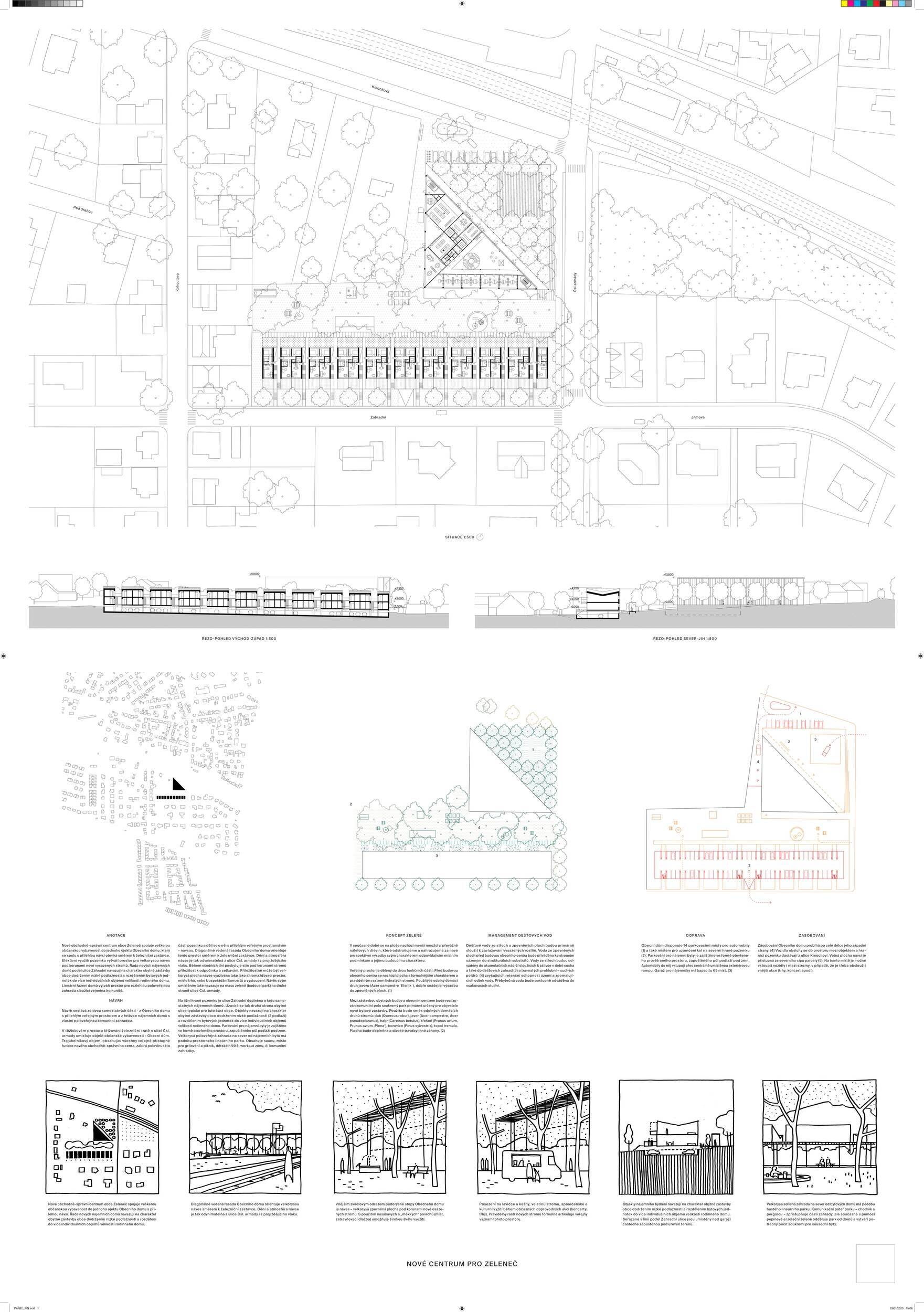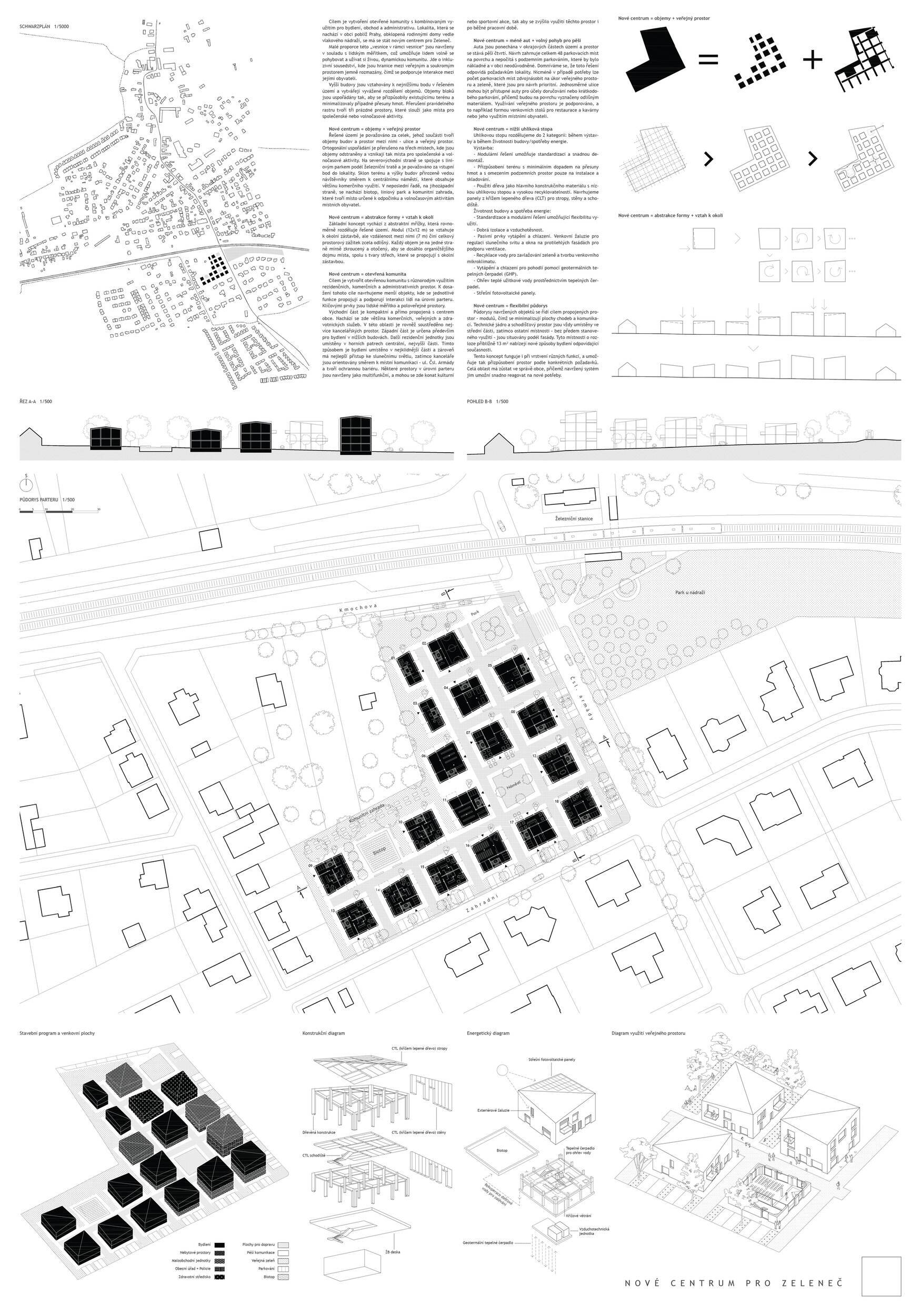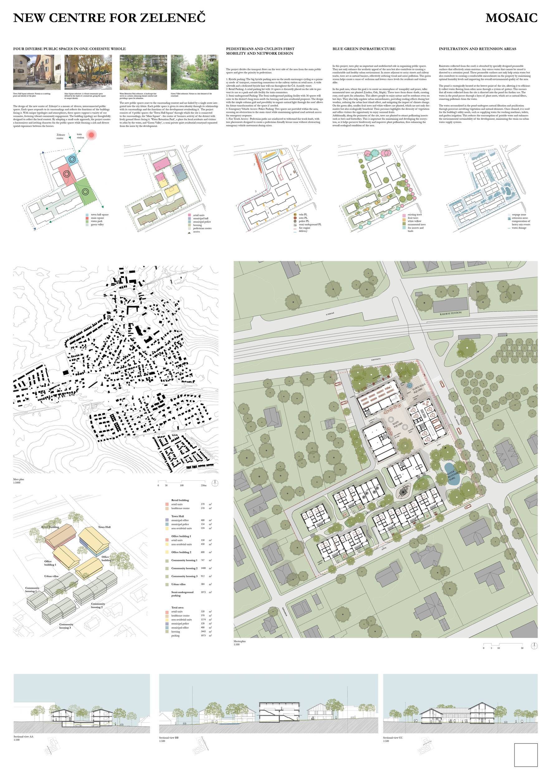 Nejsilnější stránkou soutěžního projektu č. 1 je měřítko jednotlivých budov, které odpovídá měřítku okolní zástavby obce Zeleneč, tvořené převážně rodinnými domy. Vzájemné uspořádání budov však působí rigidně a nevytváří přirozený, organický urbanismus, který by plně odpovídal požadavkům obce. Přestože byli autoři v prvním kole upozorněni na přílišnou tuhost celkového řešení, návrh ve druhém kole neprošel zásadní úpravou ani revizí. Progres tak zůstal omezen pouze na dílčí detaily a formální dopracování. Urbanistické řešení je založeno na dvou průhledových osách, které se vzájemně protínají. První osa je zakončena akcentovaným obecním úřadem, druhá směřuje do obytné zástavby bytových domů. První osu vyplňuje především náměstí s vodním prvkem a zelení po stranách veřejného prostoru. Druhá osa slouží jako pěší komunikace mezi domy s předzahrádkami. Skutečnost, že se pod oběma prostory nachází podzemní parkoviště, však výrazně omezuje možnosti výsadby, zejména stromů, což má negativní dopad na budoucí kvalitu a využitelnost těchto prostor. Obecní úřad tvoří dominantu náměstí a určuje jeho prostorovou orientaci. Tato orientace se však nejeví jako vhodná při pohledu od nádraží – směru, odkud bude přicházet většina návštěvníků nového centra. Úřad je vůči tomuto směru natočen spíše bokem a nedostatečně s příchozími komunikuje. Multifunkční objekty a zdravotní středisko, obklopující náměstí, tvoří funkční celek napojený na podzemní garáže. Toto řešení lze považovat za zdařilé, určitou slabinou je však umístění prodejny potravin. Nachází se v rohu náměstí, poměrně daleko od železniční zastávky, čímž se její využití zbytečně omezuje. Architektonický výraz vychází z tradičního tvarosloví, které je posunuto do současnější podoby. Bytové domy rovněž tvoří kompaktní celek s napojením na podzemní garáže a sklepní prostory, což představuje uživatelsky komfortní řešení. Dispozice působí spíše standardně a postrádají kreativitu. Největší limity mají byty ve druhém a třetím nadzemním podlaží, které jsou řešeny jako podkrovní. Jejich osvětlení a větrání je zajištěno výhradně střešními okny, což je zejména v letních měsících nevhodné. Umístění kočárkárny mimo samotné obytné objekty je velmi nepraktické a přispívá k celkové nepřesvědčivosti dispozičního řešení. Dopravní a parkovací schéma je řešeno logicky – jak s ohledem na návaznost na stávající komunikace, tak na jednotlivé objekty. Koncept zeleně a modrozelené infrastruktury je mimo prostory nad podzemními garážemi zpracován vhodně a podporuje příjemné užívání veřejných prostor prostřednictvím promyšlené výsadby.