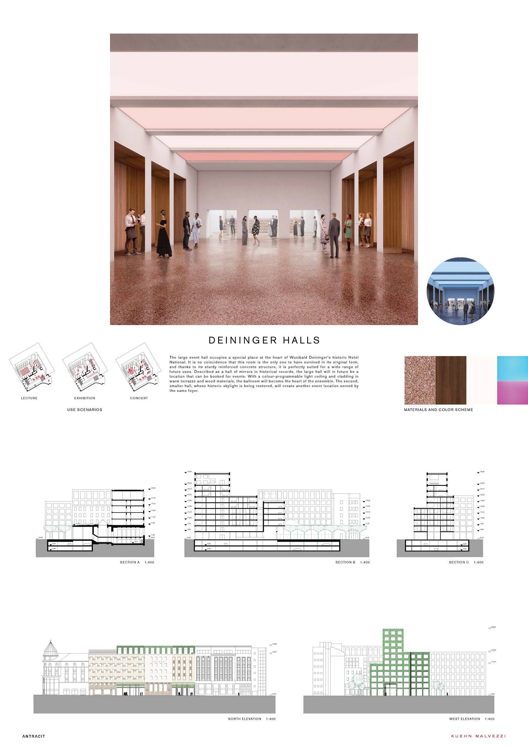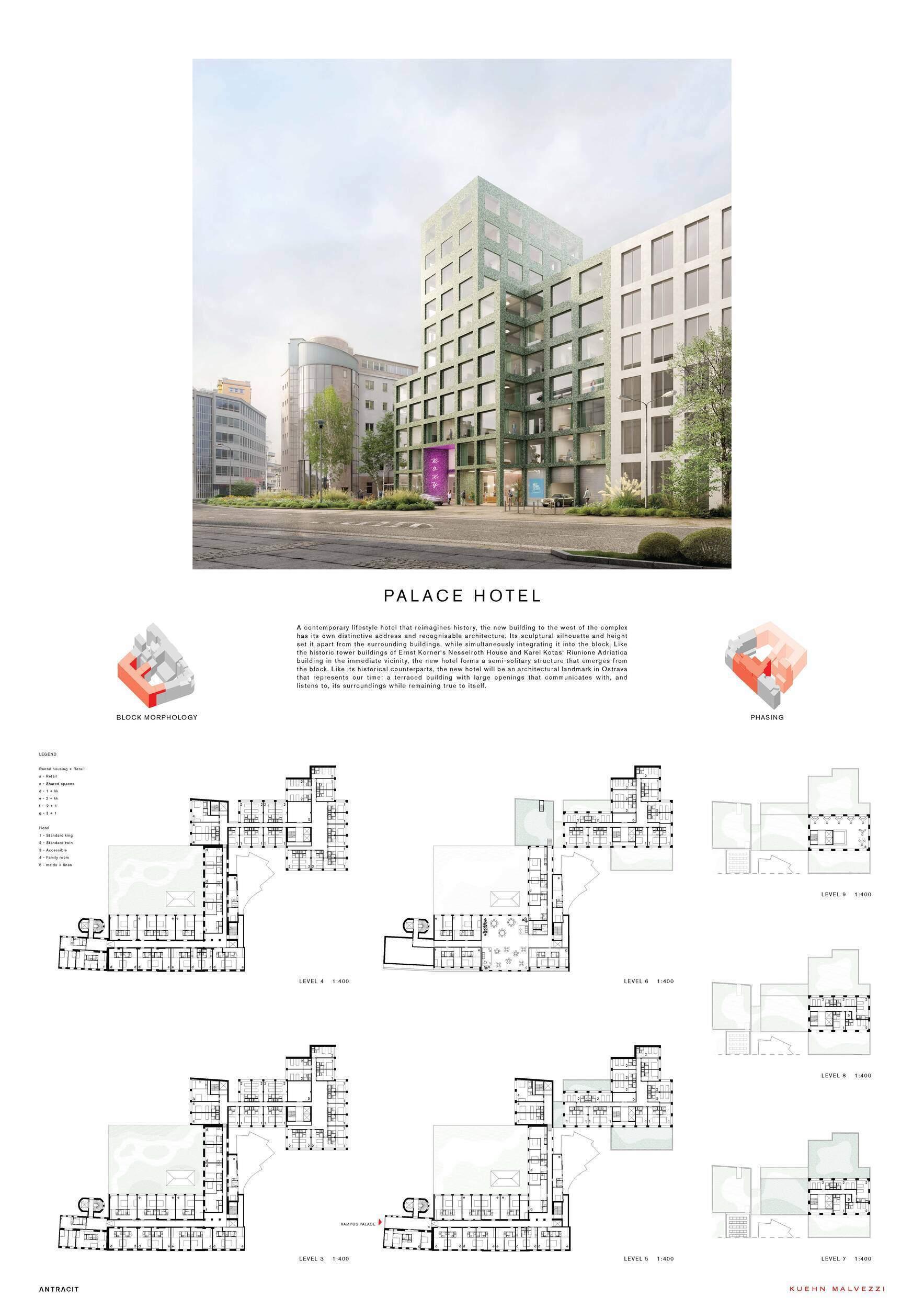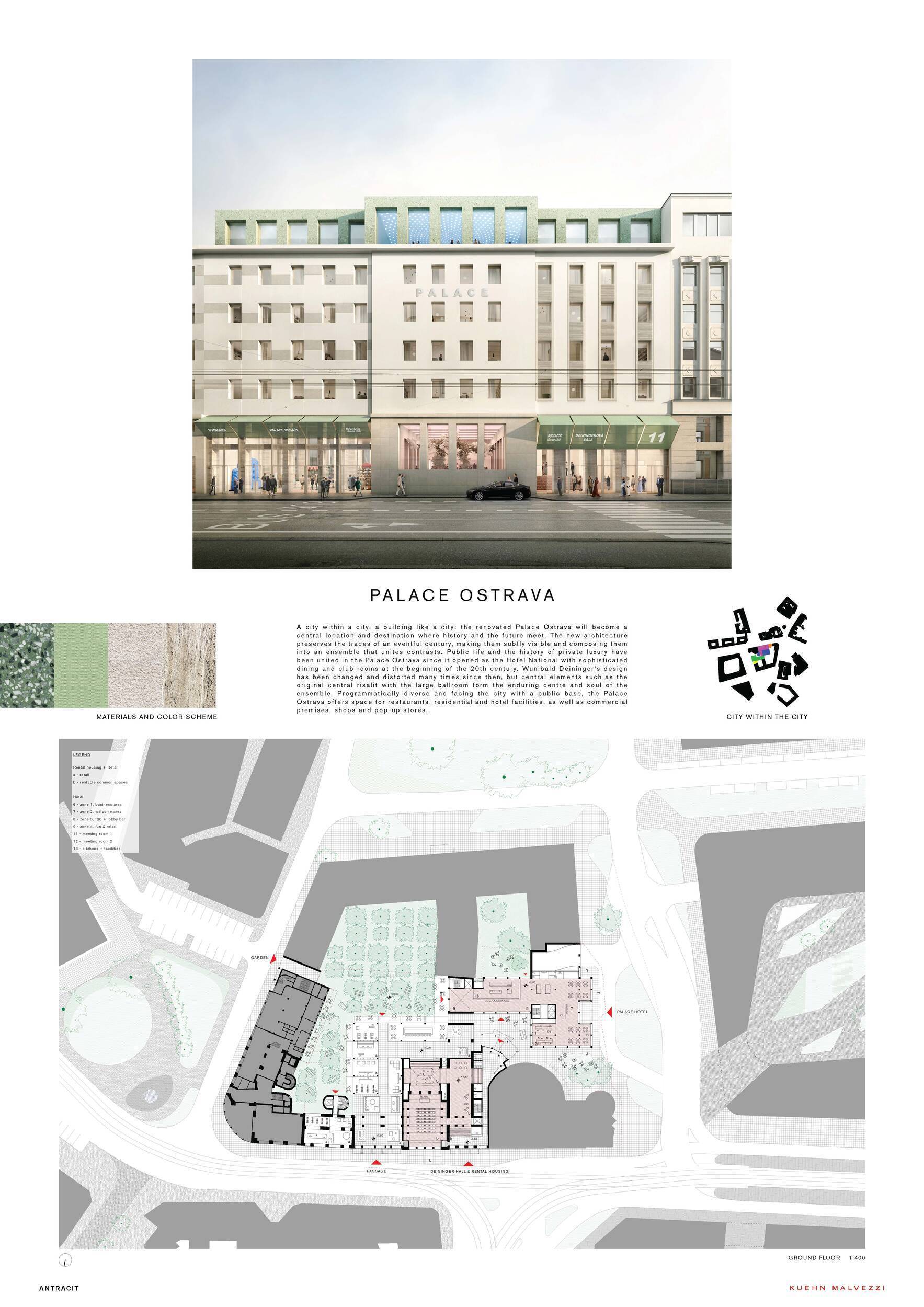 Projekt v příkladné míře ukazuje, jak pracovat v komplexní městské situaci utvářené fragmenty, historickými stopami a zaniklými strukturami. Architektům se daří nejen reinterpretovat původní funkce a znovu je zpřítomnit, ale také redefinovat celý městský blok vložením jediné kompozitní figury. Ta propojuje zachovanou strukturu podél ulice 28. října s novým objemem, který na západním okraji bloku vrcholí hotelovou věží. Druhá fáze na jižní části území pak blok dotváří pomocí dvou jasně vymezených vnitřních dvorů. Krytý pasážový průchod propojuje obě strany bloku, aniž by narušoval zelené plochy. Sjednocení programových f unkcí do jedné kompozitní hmoty navíc umožňuje flexibilní rozdělování ploch mezi bydlení a hotel. Urbanistická figura vychází ze stávající morfologie, kdy nižší zástavba kolem dvorů graduje do volně stojící, sochařsky pojaté hotelové věže. Porota podporuje toto čtení okolní městské struktury, které připouští jediný objemový akcent přesahující běžnou výšku okolních budov. Navržená věž nicméně překračuje výškové limity uvedené v dokumentu vydaném pro soutěž Útvarem hlavního architekta města Ostravy (ÚHA MMO). Její přesná výška a proporce budou muset být dále zpřesněny ve spolupráci s investorem a lokálními orgány, aby se našla vhodná rovnováha mezi samostatným orientačním bodem a integrovaným výškovým akcentem v rámci blokové struktury. Porota oceňuje nejen analytickou práci s městskou morfologií, ale také výzkum a reflexi tvorby Wunibalda Deiningera, architekta původního Hotelu National. Na základě této analýzy si Kuehn Malvezzi vytvořili soubor architektonických nástrojů pro reinterpretaci a strukturování nových zásahů. Tyto nástroje mohou dále sloužit při navazujícím rozvoji návrhu, zejména v oblasti materiálového řešení fasád, detailu a interiérové architektury, a tím přispět k vyšší atmosférické i architektonické kvalitě. V parteru jsou vstupní sekvence i pasáž s navrženými obchodními jednotkami jasně strukturovány a prokazují flexibilitu pro různé typologie retailu. Celkově je projekt přesvědčivý svou reinterpretací historické morfologie Ostravy, výrazným uličním projevem a samostatně fungujícím hotelem s působivým objemovým výrazem na západní straně bloku.