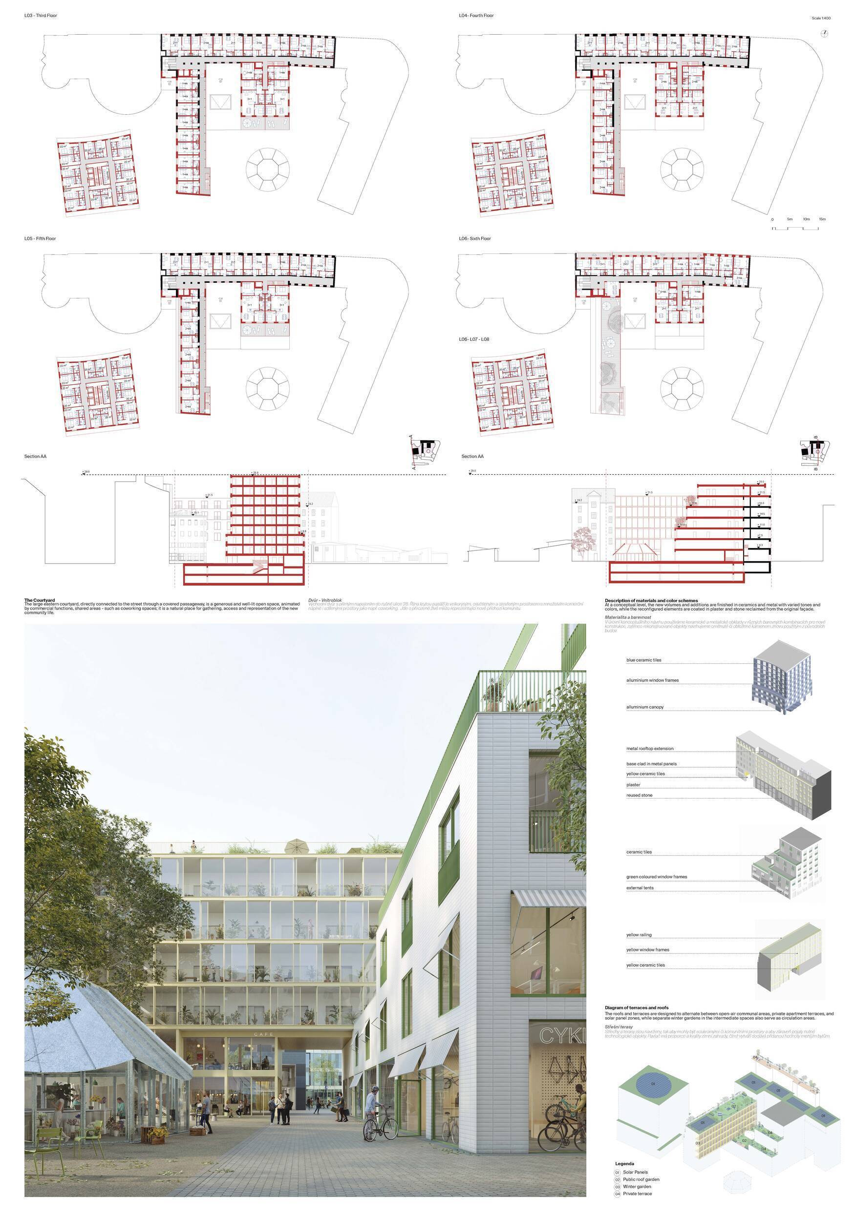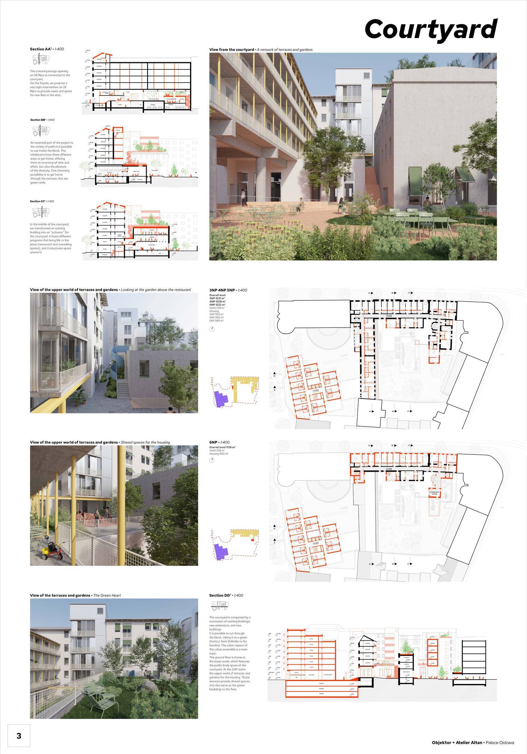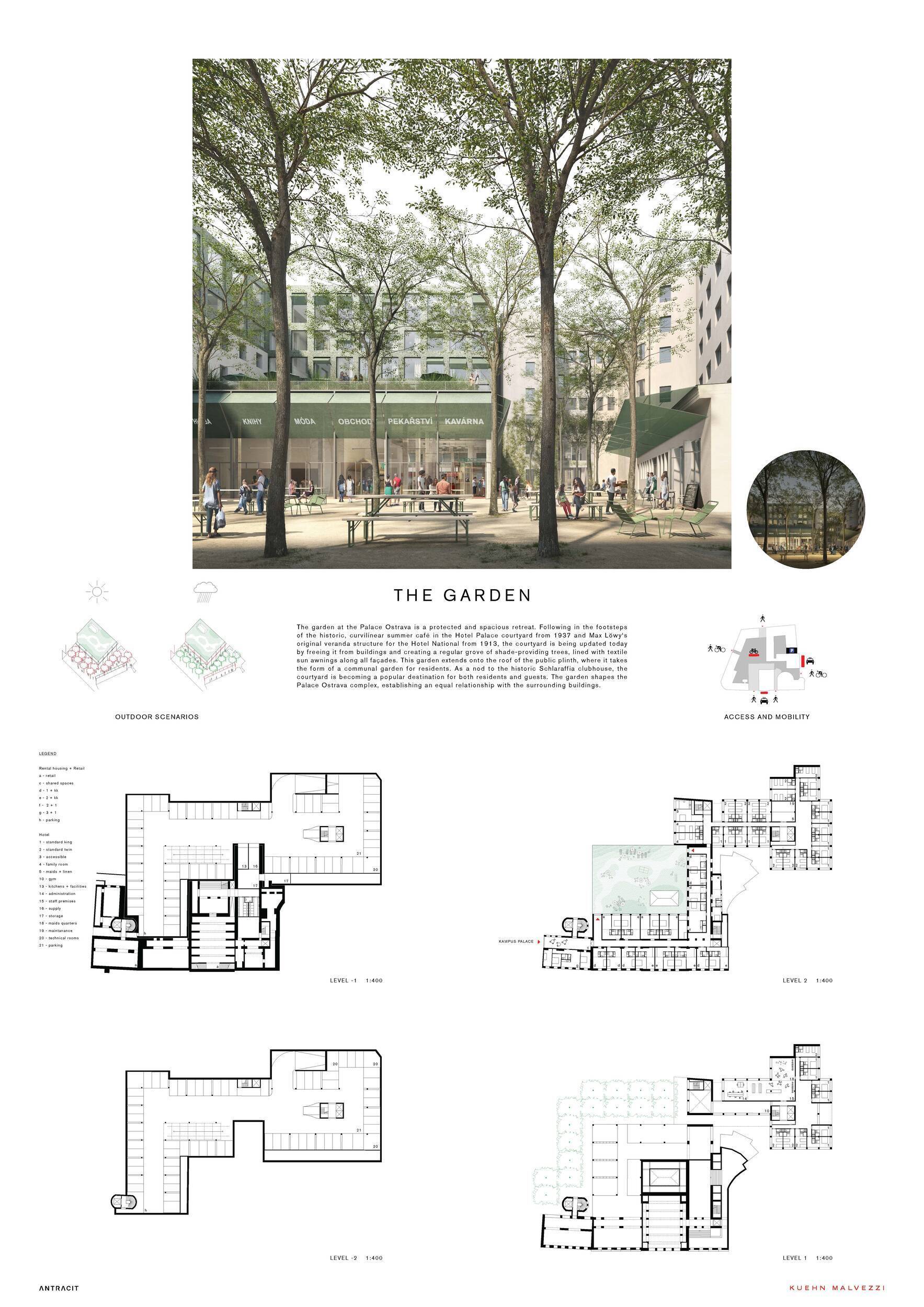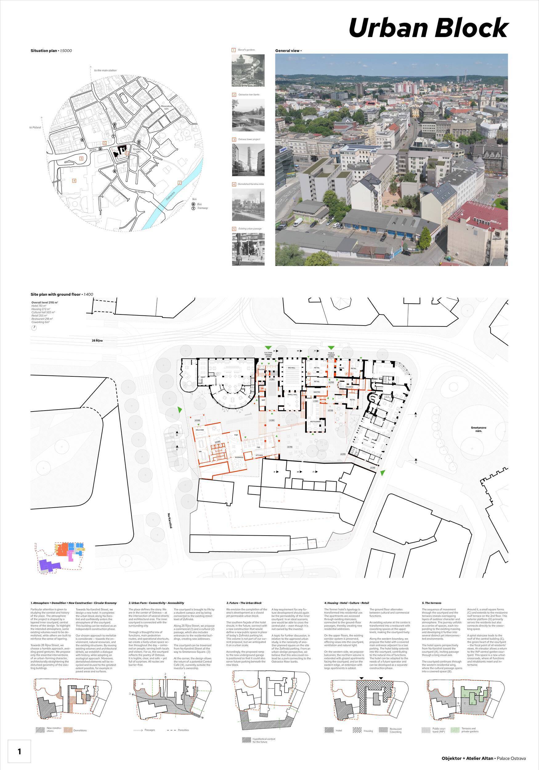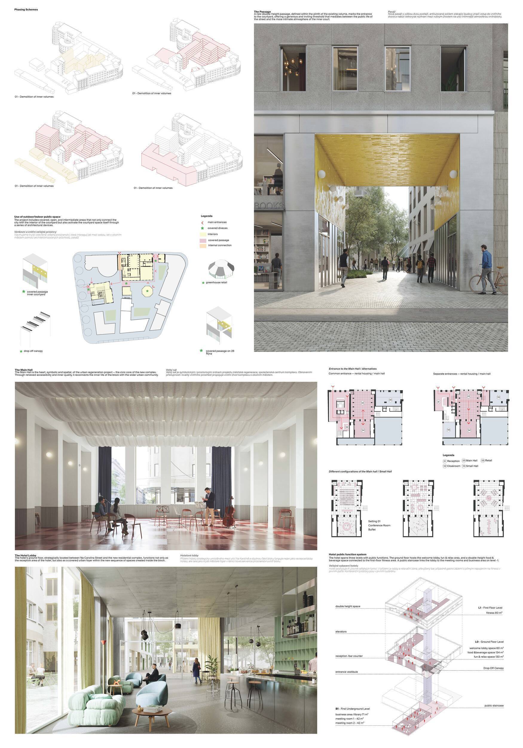 Projekt se opírá o dvě hlavní strategie: na jedné straně usiluje o zachování co největší části původní struktury podél ulice 28. října prostře dnictvím pečlivého výběru prvků k ponechání a doplnění; na straně druhé navrhuje nový objem hotelu na jihozápadní hraně, čímž definuje budoucí okraj bloku směrem k ulici Na Karolině. Hlavní navržený dvůr, situovaný paralelně s ulicí 28. října, je pojat jak o veřejný průchod a městský prostor propojující ulici Na Karolině se Smetanovým náměstím. Je citlivě členěn a právě zde má být umístěn nový maloobchodní program. Stávající centrální objem ve dvoře je přetvořen v restauraci s výrazným společenským potenciálem a ve dvou vyšších podlažích doplněn o coworkingové prostory. Historické fotografie Šlárrafovy zahrady, zachycující původní venkovní kavárnu a restauraci, jsou deklarovanou inspirací pro charakter pasáže i celé prostorové koncepce. Napojení na ulici 28. října je řešeno pomocí kulturních a obchodních krytých pasáží. Maloobchod je rozložen do dvou úrovní a propojen vlastním vertikálním jádrem. Přístup do bytové části je možný z obou pasáží, bez přímého propojení se stávajícím studentským bydlením. Zatímco h lavní venkovní prostor je veřejný, řada střešních zahrad a přístupových balkonů zajišťuje obyvatelům kontakt se zelení na různých úrovních. Vnitřní chodby bytového domu mají okna – zajišťují přirozené světlo i větrání a zlepšují kvalitu společných prostor. Hotel má terasovitý půdorys a uzavřenou fasádu směrem k jihu, aby umožnil budoucí doplnění bloku. V přízemí však objem zasahuje podél dvorní pasáže a pod jednu z „prstových“ hmot, což částečně omezuje rozvojové možnosti v této části území. Garáž je umístěna na stávající parkovací ploše a má tři podzemní podlaží. Projekt zaujímá jasný a oceňovaný postoj k potřebě minimalizovat dopady demolic i k maximálnímu využívání existujících zdrojů. Výsledná urbanistická strategie je rozumná a kvalitní; po úpravách ve druhé fázi soutěže se rozmístění hmot zpřesnilo a působí soudržněji. Detailní přístup však vede i k určité fragmentaci prostorů a snížené čitelnosti, což porota vnímá jako problematičtější aspekt návrhu. Urbanistické řešení hotelu nepůsobí zcela přesvědčivě – jižní napojení na budoucí část bloku zůstává nevyřešené, rozšíření přízemní hmoty je z hlediska úrovní a polohy obtížné a vztah mezi novou a stávající objemovou koncepcí je podle poroty stále příliš rozdílný. Strategie garáže je naopak zajímavá, i přes vyšší náklady související s omezeným rozsahem podlaží a hlubším výkopem. V oblasti materiálového a konstrukčního řešení návrh přináší několik inspirativních podnětů, avšak některé detaily – například zdůrazněné spodní desky ve dvoře nebo zapuštěná okna v historických fasádách – působí méně přesvědčivě. Celkově projekt představuje hodnotný příspěvek do odborné diskuse, i když zatím nenabízí plně celistvou a přesvědčivou strategii.
