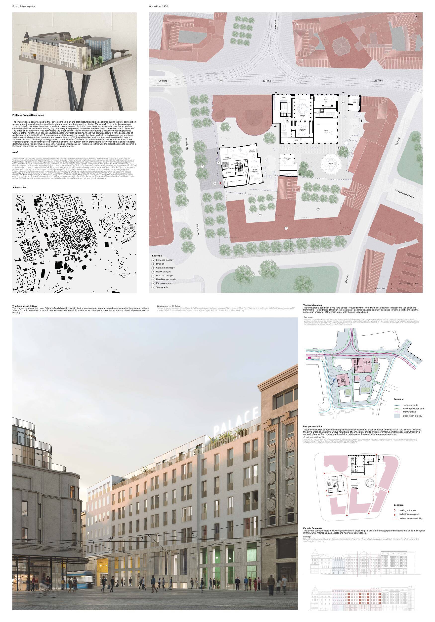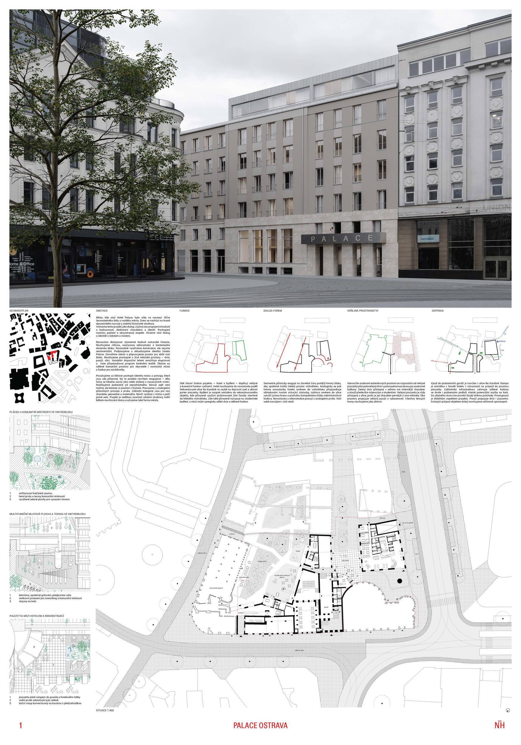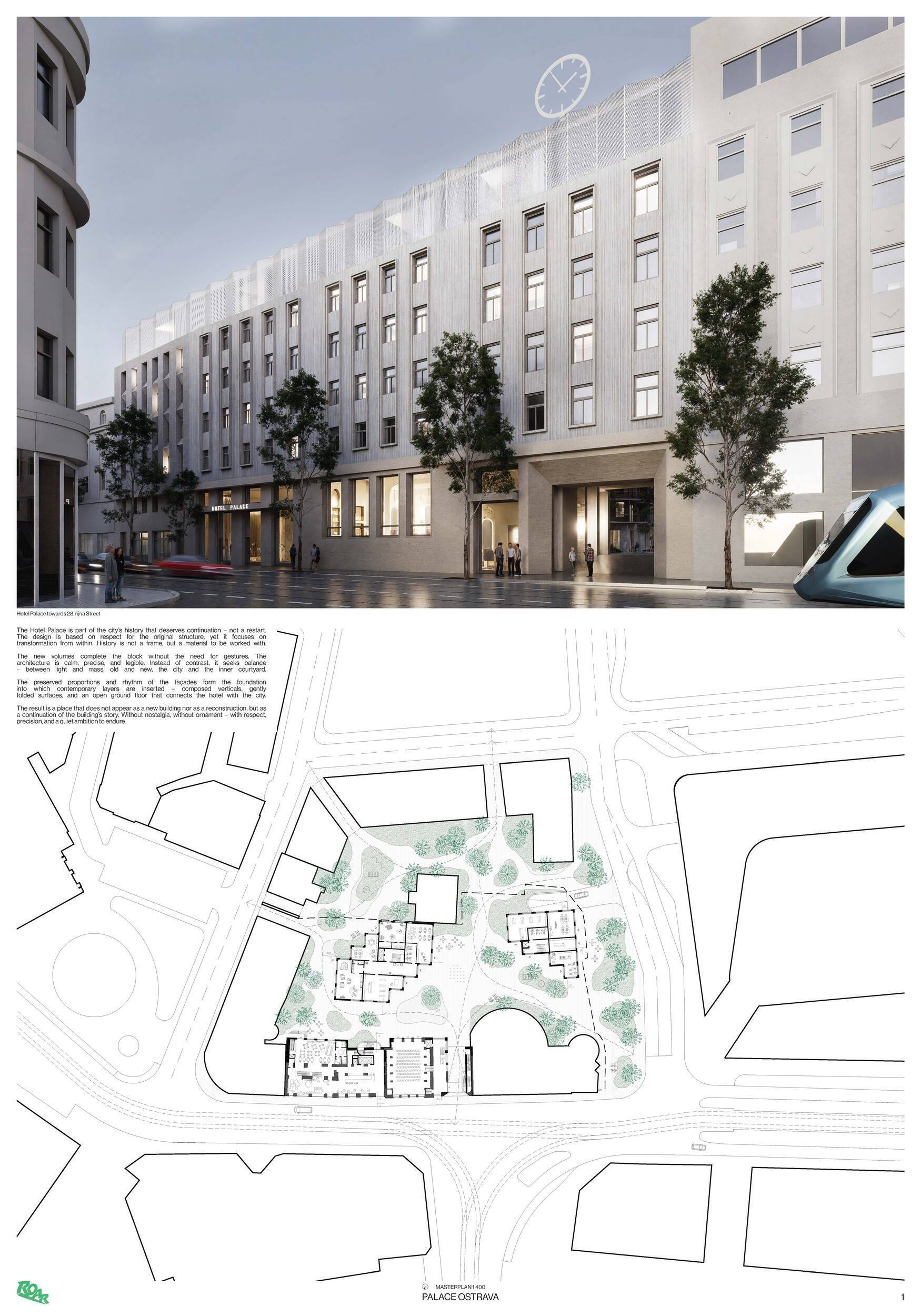 Návrh nakládá s historickou budovou hotelu Palace s vysokou mírou respektu a architektonické citlivosti. Koncept vychází z myšlenky pokračování příběhu – původní stavbu neničí ani výrazně nepřepisuje, ale přetváří ji zejména zevnitř. Architekti usilují o harmonické propojení historie a současnosti prostřednictvím vrstvení nových objemů a jemné abstrakce ornamentu, čímž vzniká soudobá interpretace historické fasády. Z urbanistického hlediska návrh doplňuje blok mezi ulicemi 28. října a Na Karolíně dvěma novými solitérními objekty, které společně s existující zástavbou formují částečně otevřený dvůr. Do parteru je vložen veřejný průchod propojující ulici s vnitroblokem. Vnitřní funkční struktura kombinuje hotel v původním historickém objektu s bytovými domy v novostavbách. Architektura usiluje o klid, čitelnost a vyváženost mezi starým a novým, mezi městem a dvorem. Porota oceňuje kultivovaný přístup autorů k historické substanci, jejich zdrženlivost a schopnost nalézt rovnováhu mezi zachováním a reinterpretací. Pozitivně hodnotí také záměr otevřít dvůr veřejnosti novým průchodem skrze uliční parter. Umístění průchodu do osy ulice Nádražní vytváří atraktivní vizuální moment, avšak jeho poloha neodpovídá přechodu přes ulici 28. října, což může v praxi vést k méně přehlednému či nepraktickému využití. Naproti tomu vstup do hotelu označený nápisem Hotel Palace působí poněkud skrytě a méně reprezentativně. Funkční řešení hotelu v původním objektu, ačkoliv působivé a poetické, může být při současných standardech hotelového provozu náročnější na realizaci. Fázování výstavby je navíc závislé na dokončení hotelu jako první etapy, což snižuje celkovou proveditelnost. Prostor mezi solitérními objekty ve dvoře působí spíše jako volný parkový prostor než jako městský dvůr přiměřený měřítku místa. Umístění jednoho z objektů přímo na hranici pozemku může komplikovat realizaci, zejména z hlediska majetkových vztahů a požární bezpečnosti. Druhý solitér a volně umístěná rampa do podzemí mohou omezovat možnosti budoucí dostavby celého bloku. Z památkového hlediska je problematické použití perforovaného plechu na nástavbě historické budovy, které se může dostávat do výrazového i materiálového napětí s původní architekturou. Návrh je jasně zakotven v místě a pracuje s historickým odkazem spíše jemnou transformací než radikálním gestem. Porota oceňuje vysokou kvalitu prezentace, přehledné půdorysy hotelu i promyšlené řešení bytových domů. Z hlediska provozních a strategických vazeb však návrh nepůsobí zcela přesvědčivě.