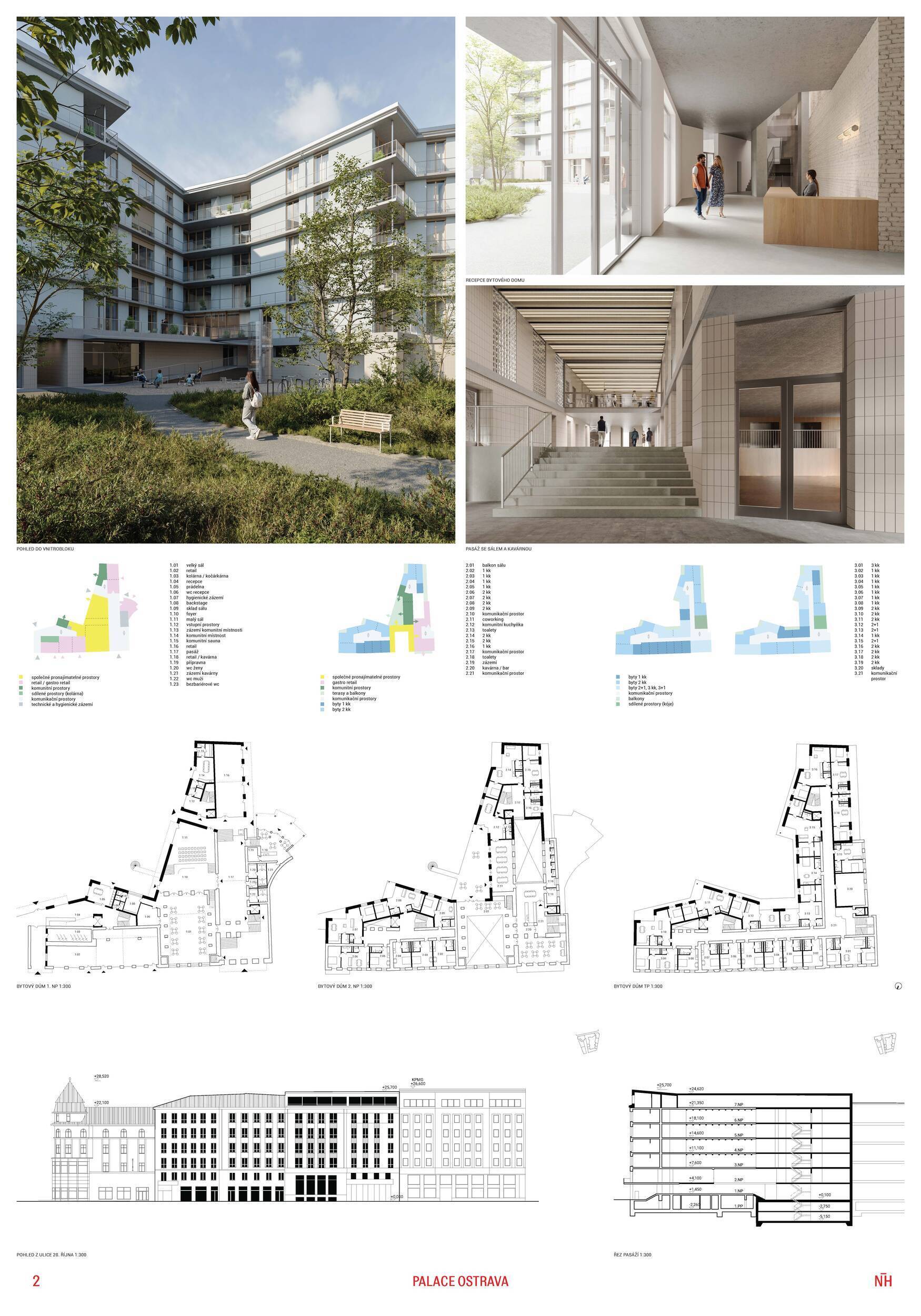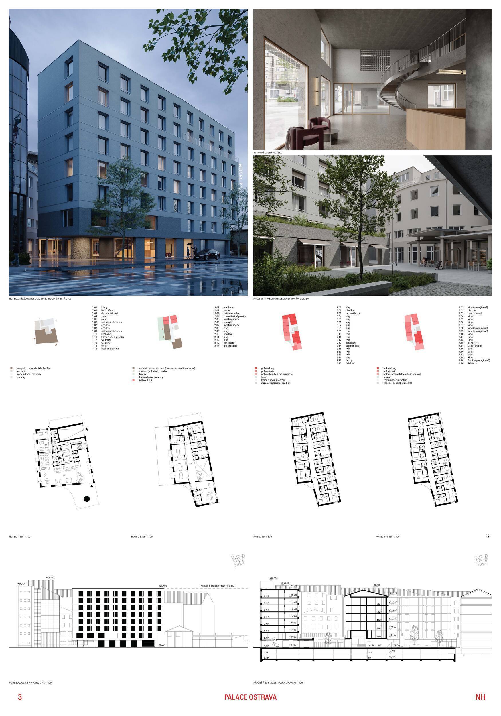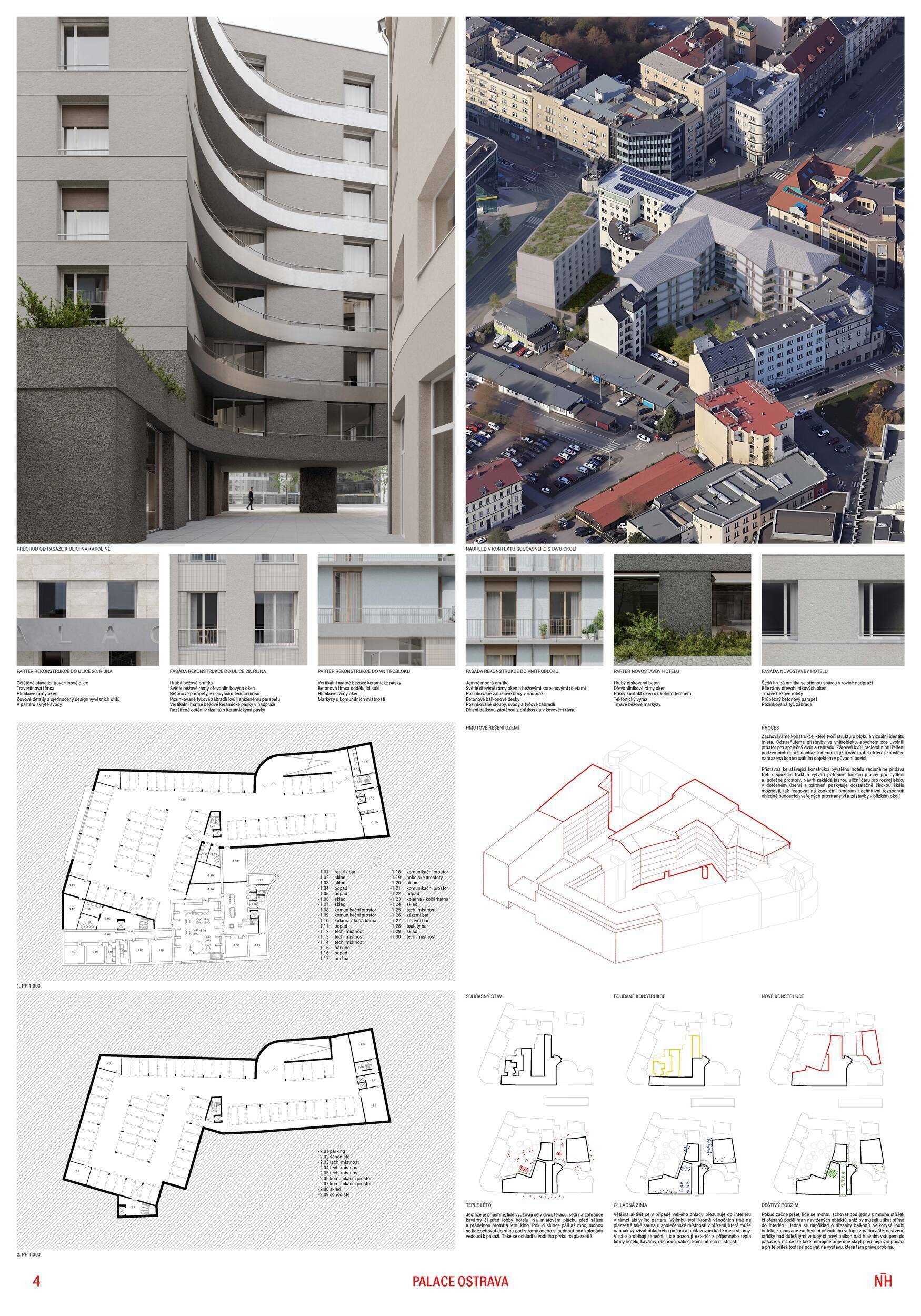 Návrh nakládá s historickou budovou hotelu Palace s vysokou mírou respektu a architektonické citlivosti. Koncept vychází z myšlenky pokračování příběhu – původní stavbu neničí ani výrazně nepřepisuje, ale přetváří ji zejména zevnitř. Architekti usilují o harmonické propojení historie a současnosti prostřednictvím vrstvení nových objemů a jemné abstrakce ornamentu, čímž vzniká soudobá interpretace historické fasády. Z urbanistického hlediska návrh doplňuje blok mezi ulicemi 28. října a Na Karolíně dvěma novými solitérními objekty, které společně s existující zástavbou formují částečně otevřený dvůr. Do parteru je vložen veřejný průchod propojující ulici s vnitroblokem. Vnitřní funkční struktura kombinuje hotel v původním historickém objektu s bytovými domy v novostavbách. Architektura usiluje o klid, čitelnost a vyváženost mezi starým a novým, mezi městem a dvorem. Porota oceňuje kultivovaný přístup autorů k historické substanci, jejich zdrženlivost a schopnost nalézt rovnováhu mezi zachováním a reinterpretací. Pozitivně hodnotí také záměr otevřít dvůr veřejnosti novým průchodem skrze uliční parter. Umístění průchodu do osy ulice Nádražní vytváří atraktivní vizuální moment, avšak jeho poloha neodpovídá přechodu přes ulici 28. října, což může v praxi vést k méně přehlednému či nepraktickému využití. Naproti tomu vstup do hotelu označený nápisem Hotel Palace působí poněkud skrytě a méně reprezentativně. Funkční řešení hotelu v původním objektu, ačkoliv působivé a poetické, může být při současných standardech hotelového provozu náročnější na realizaci. Fázování výstavby je navíc závislé na dokončení hotelu jako první etapy, což snižuje celkovou proveditelnost. Prostor mezi solitérními objekty ve dvoře působí spíše jako volný parkový prostor než jako městský dvůr přiměřený měřítku místa. Umístění jednoho z objektů přímo na hranici pozemku může komplikovat realizaci, zejména z hlediska majetkových vztahů a požární bezpečnosti. Druhý solitér a volně umístěná rampa do podzemí mohou omezovat možnosti budoucí dostavby celého bloku. Z památkového hlediska je problematické použití perforovaného plechu na nástavbě historické budovy, které se může dostávat do výrazového i materiálového napětí s původní architekturou. Návrh je jasně zakotven v místě a pracuje s historickým odkazem spíše jemnou transformací než radikálním gestem. Porota oceňuje vysokou kvalitu prezentace, přehledné půdorysy hotelu i promyšlené řešení bytových domů. Z hlediska provozních a strategických vazeb však návrh nepůsobí zcela přesvědčivě.