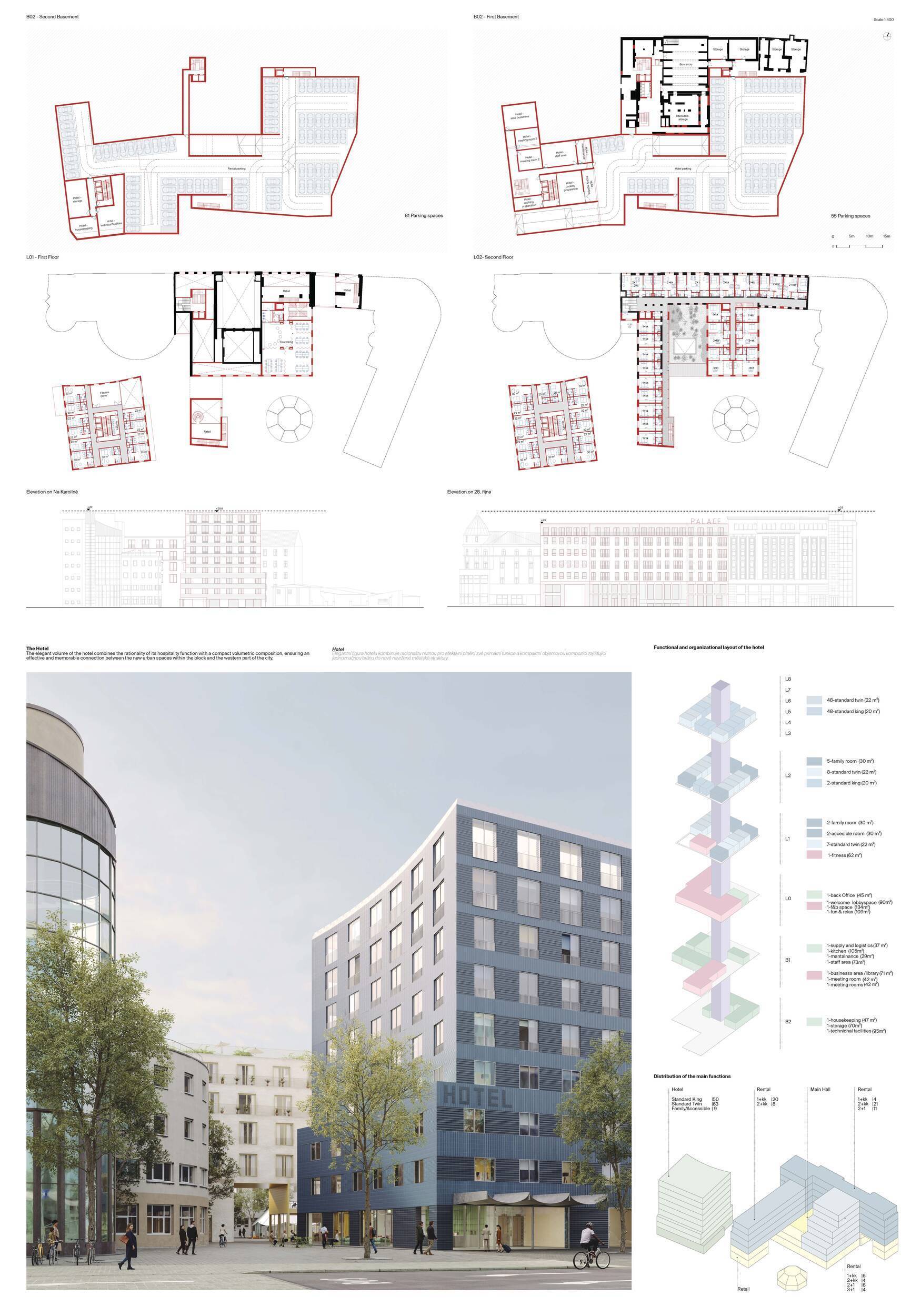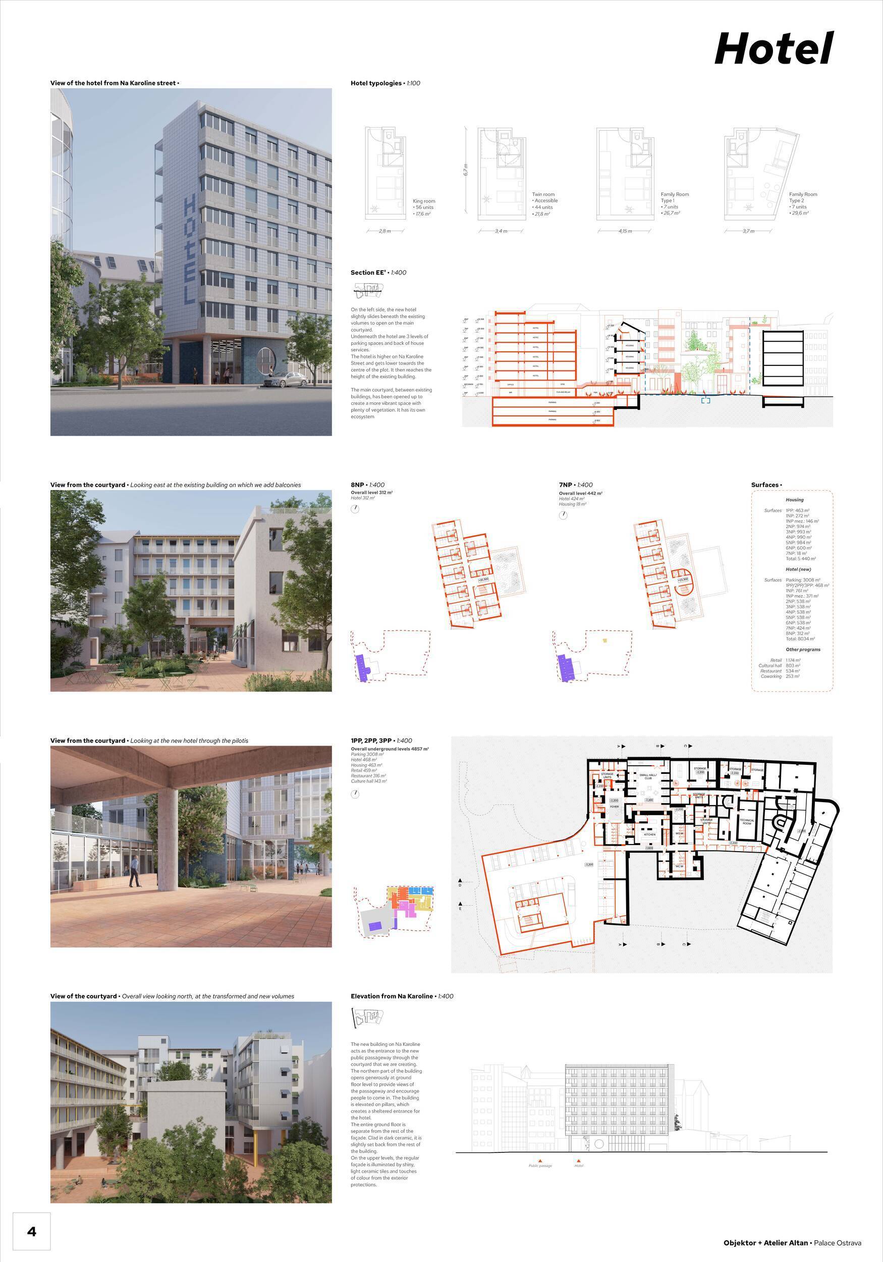 Porota oceňuje ideu umístění hotelu do zcela nové budovy, což je pro jeho budoucí provoz efektivnější než adaptace stávajících objektů. Některé aspekty řešení však podle poroty nenaplňují svůj potenciál. Novostavba působí hmotově výrazně, s menšími odstupy od okolní zástavby, což omezuje vznik kvalitnějších veřejných prostor a vede spíše k užším průchodům. Obecně navržená „všesměrová“ prostupnost bloku není plně zdůvodněna a místy oslabuje srozumitelnost celkového prostorového konceptu. Hierarchie i charakter veřejných prostor vnitrobloku nejsou zcela zřetelné, což by mohlo mít dopad na jejich atraktivitu pro návštěvníky i pro provoz obchodních ploch. Umístění samostatného obchodního pavilonu je navíc náročné zejména ve vztahu k sousedním pozemkům a reálným možnostem jeho dlouhodobého využití. Bytový program je rozumně situován do stávajících budov a doplněn dvorní vestavbou. Porota oceňuje velkorysé, světlé společné chodby, zároveň však vnímá objem i umístění dvorní dostavby jako potenciálně problematické z hlediska výhledů, soukromí a odstupů od okolní zástavby. Hotelová novostavba s přibližně čtvercovým půdorysem dobře reaguje mírným prohnutím na okolní zástavbu a vytváří jasný protipól, přesto však celková hmota působí poměrně výrazně. Dispozice typického podlaží je v porovnání s ostatními návrhy méně efektivní. Vstupní podlaží vhodně komunikuje s okolím a přispívá k oživení vnitrobloku, umístění konferenčních místností v suterénu však může být z hlediska provozu méně výhodné. Hlavní společenský sál původního hotelu je přístupný jak z ulice 28. října, tak z předprostoru nového hotelu. Vstupní a foyerové prostory jsou nicméně spíše skromnější. Uvítala by se také jasnější vazba sálu na vnitroblok a možnost přirozenějšího propojení s gastroprovozy při společens kých akcích. Porota upozorňuje i na riziko kombinace společného vstupu pro bydlení a sál, kde může docházet k provozním střetům – zejména ve večerních hodinách. Pro oživení pěší zóny na ulici 28. října by bylo přínosné orientovat větší část obchodních ploch směrem do ulice. Bydlení je vhodně situováno především do historických budov a doplněno dvorní vestavbou. Flexibilita bytů je řešena dobře, avšak podmínky v jednotkách orientovaných do dvora mohou být ovlivněny menšími odstupy a omezeným soukromím. Fasáda do ulice 28. října pracuje přesvědčivě s převýšeným parterem i členěním střešních nástaveb. Artikulace hlavní hmoty hotelu s dvojitými okny jako odkazem na původní arkýře však na porotu nepůsobí plně přesvědčivě a solitérní hotelová hmota vnímá v kontextu okolní zástavby jako poměrně výraznou. Porota oceňuje kultivovaný přístup autorů k historické substanci i městské struktuře.