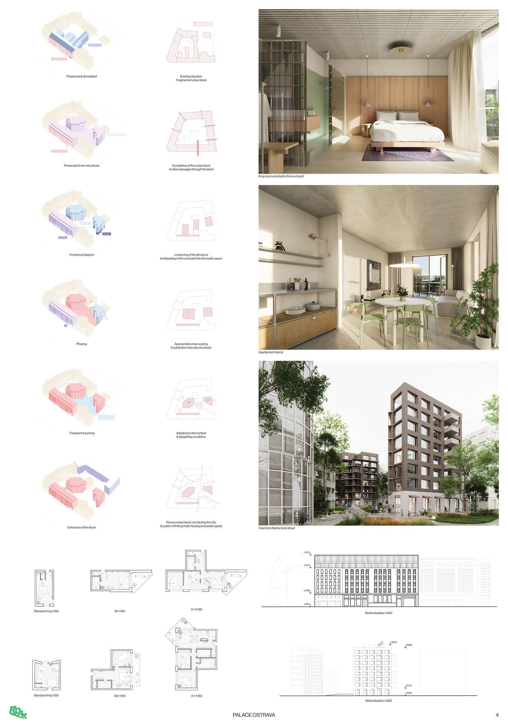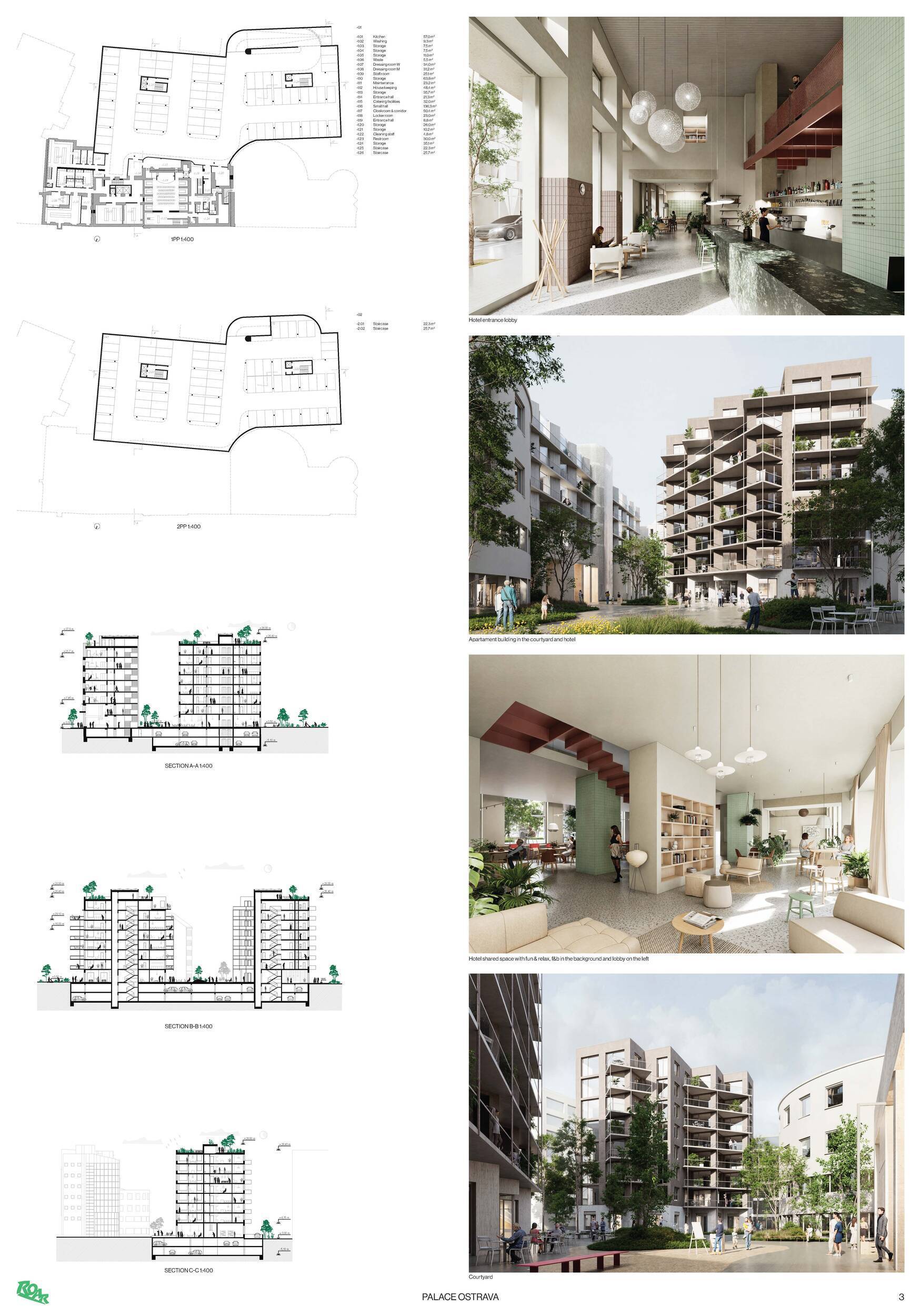 Medzinárodná architektonická súťaž, vypísaná vo forme súťažného dialógu, bola zameraná na transformáciu historického komplexu bývalého Hotela Palace v centre Ostravy. Cieľom bolo nájsť kvalitné architektonicko-urbanistické riešenie, ktoré prepojí bývanie, hotelové funkcie a verejný mestský život, a zároveň citlivo nadviaže na historickú hodnotu objektu a jeho význam v štruktúre mesta. Zo širokého medzinárodného poľa prihlásených tímov - až 89 kolektívov - bolo do ďalších fáz vybraných 5 účastníkov, ktorí svoje koncepty ďalej rozvinuli v rámci workshopov a konzultácií. Zaradil sa medzi ne aj bratislavský ateliér ROAR architekti, ktorý si vo výsledku odniesol 5. cenu. Zvíťazil návrh nemeckého kolektívu Kuehn Malvezzi Architects.