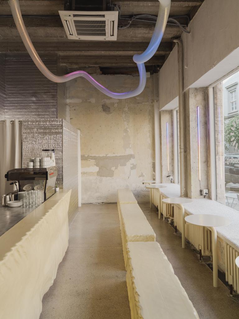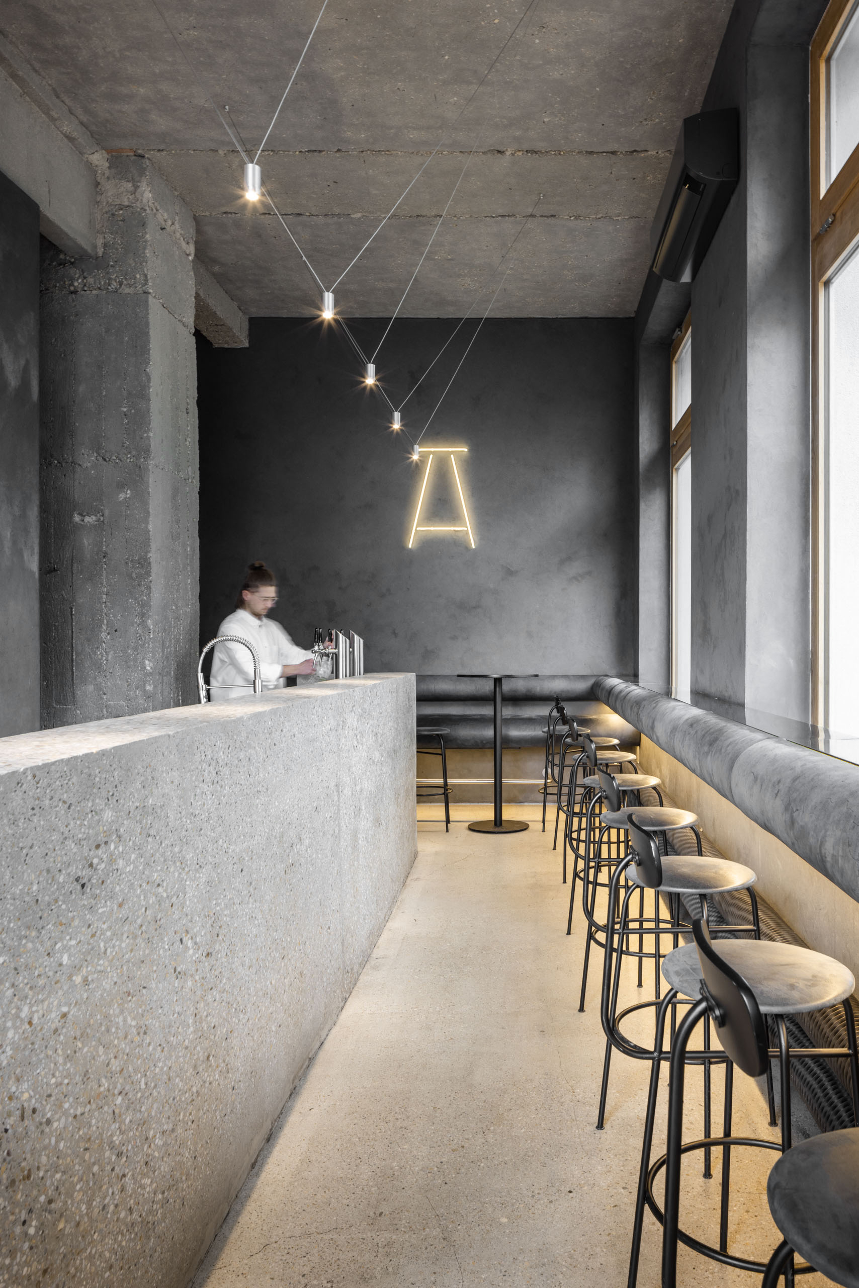 S ohľadom na skromné priestorové pomery je After komornou kompozíciou s jasne hierarchickou štruktúrou. Hlavnou esenciou je monolitický betónový bar, ktorému vhodne sekundujú ingrediencie v podobe autorského koženého mobiliáru a rafinovaných architektonických detailov.