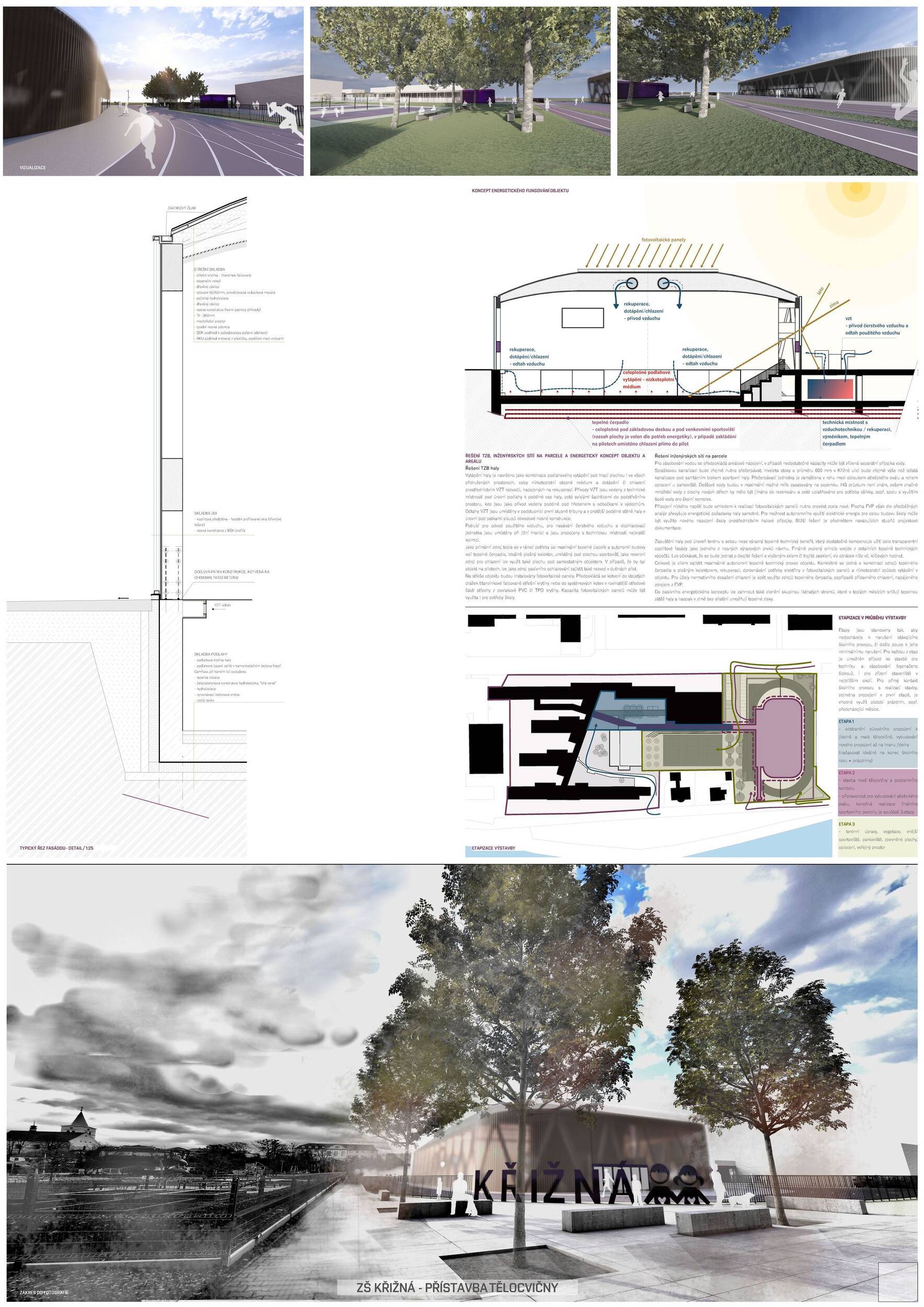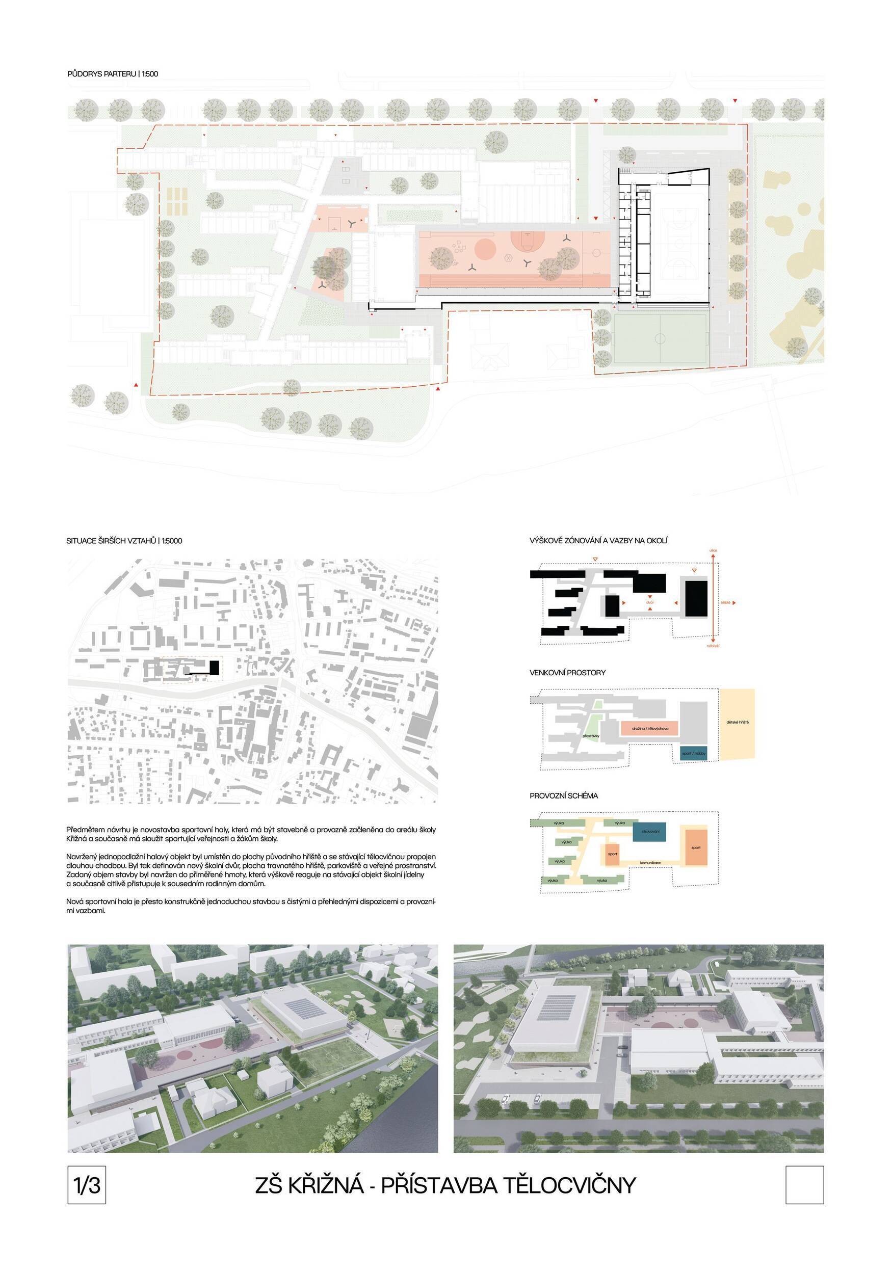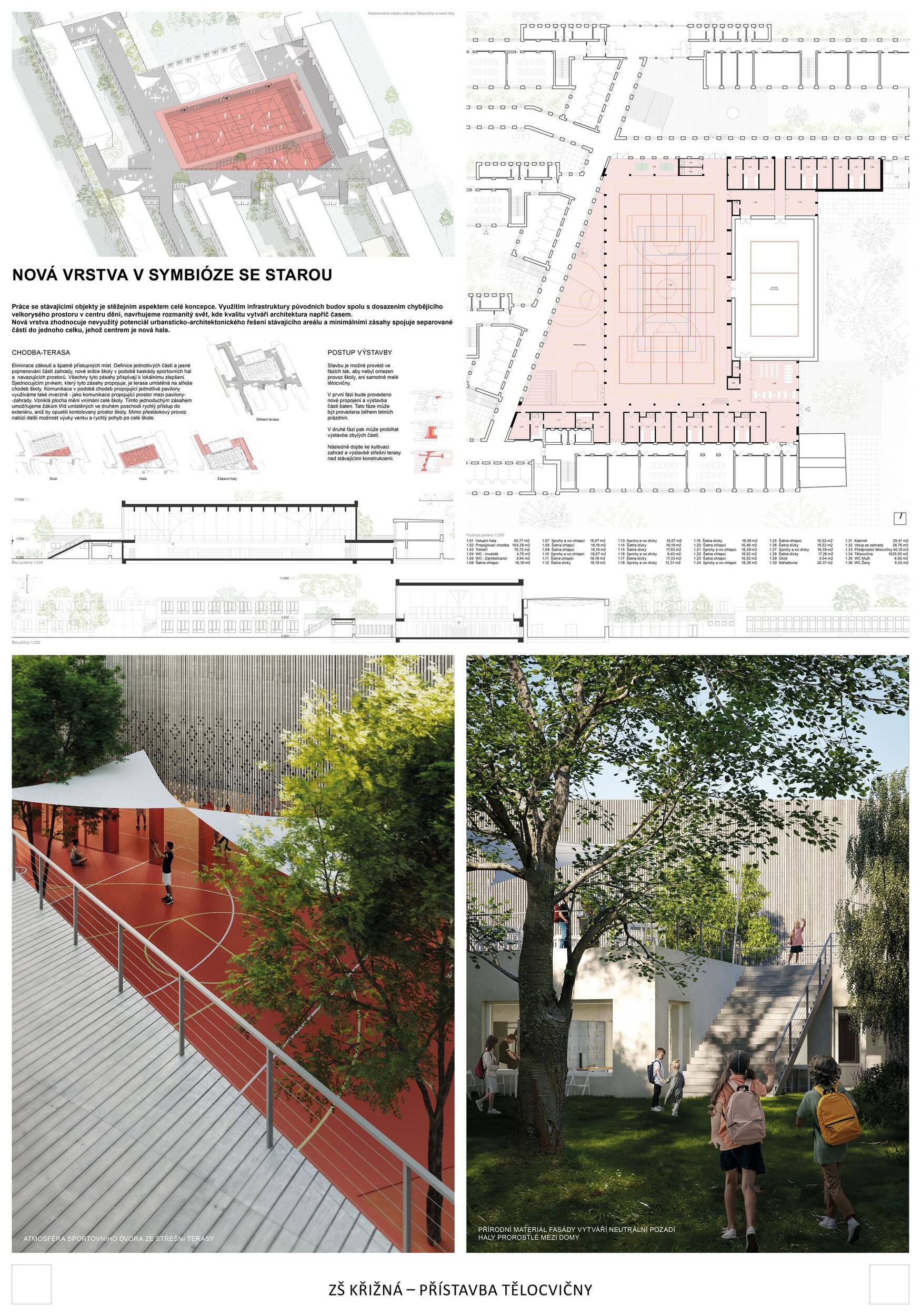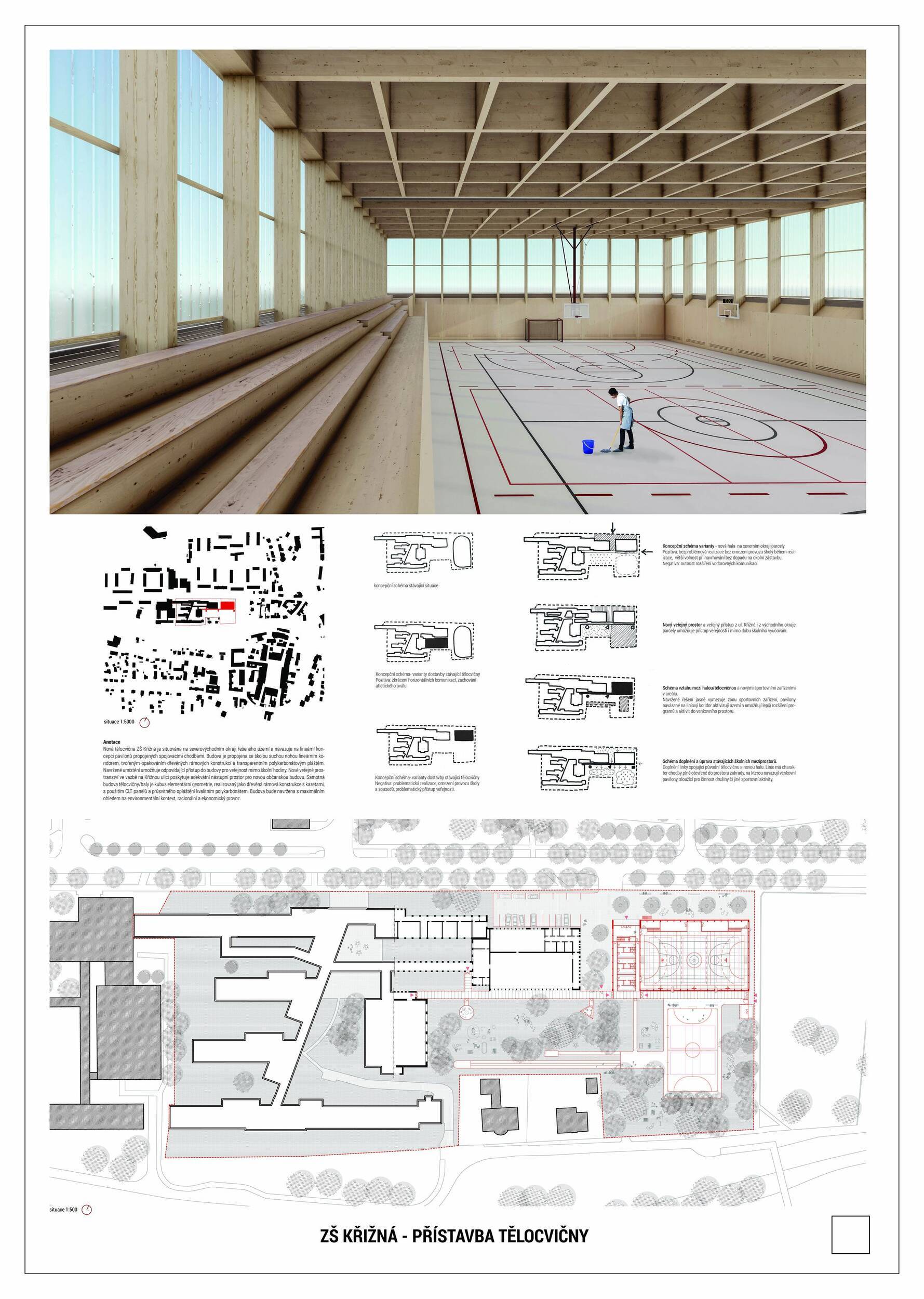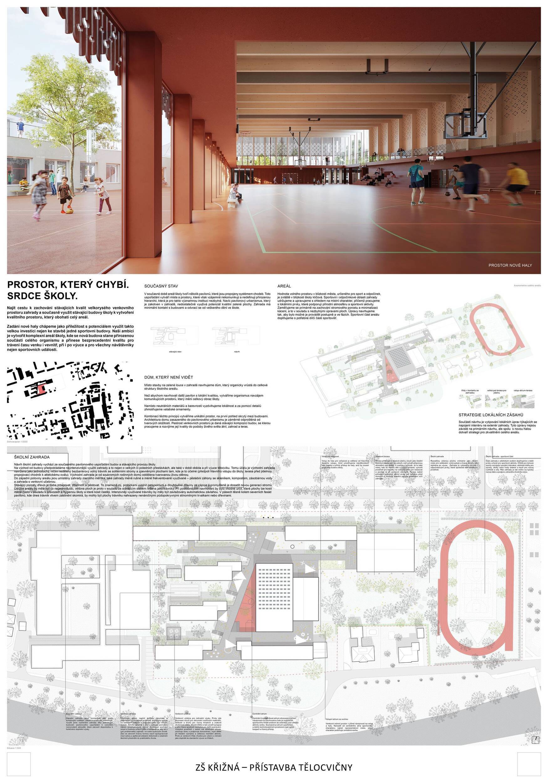 Návrh přináší změnu do celého areálu Základní školy Křižná. Umístěním sportovní haly přímo uprostřed dispozice vzniká široká paleta příležitostí a nových potenciálů, jak z poměrně zastaralé budovy s mnoha nepřehlednými koridory udělat funkční a moderní celek. Najednou vidíte jinou školu, která obstojí ve srovnání s novými budovami. Hlavním potenciálem návrhu je tak změna, která se nevyhýbá řešení stávajících problémů. Tento návrh dostavby tělocvičny jako jediný dokázal zachovat hřiště i zahradu se vzrostlými stromy a dává tímto rozhodnutím slušný prostor pro kultivované krajinářské řešení, které je v této fázi nabídnuto pouze v náznacích, které ovšem mají svou logiku. Návrh umožňuje i postupnou realizaci a je ke stávajícím stromům citlivý. Zpřístupnění střech je velice důležitou částí projektu a velká změna pro školu s doposud převládajícím vnitřním pohybem žáků. Dalším potenciálem návrhu je tak i práce se všemi koridory a zásadní zlepšení vnitřního prostředí pro žactvo, které se doposud pohybovalo v nepřehledných koridorech. Tato změna stávajícího stavu se logicky propíše do šaten, jídelny a může také lépe definovat vstup a vestibul školy. Umístění funkcí, jako je knihovna, počítačová učebna, družina, by mělo tuto změnu rovněž následovat a podpořit tak celkový koncept na vytvoření srdce Základní školy Křižná. Návrh má tak obrovskou přidanou hodnotu – do maximální míry využít a zlepšit stávající areál v moderní pulzující celek s kvalitním vnitřním i venkovním prostředím, které inspiruje budoucí generace.