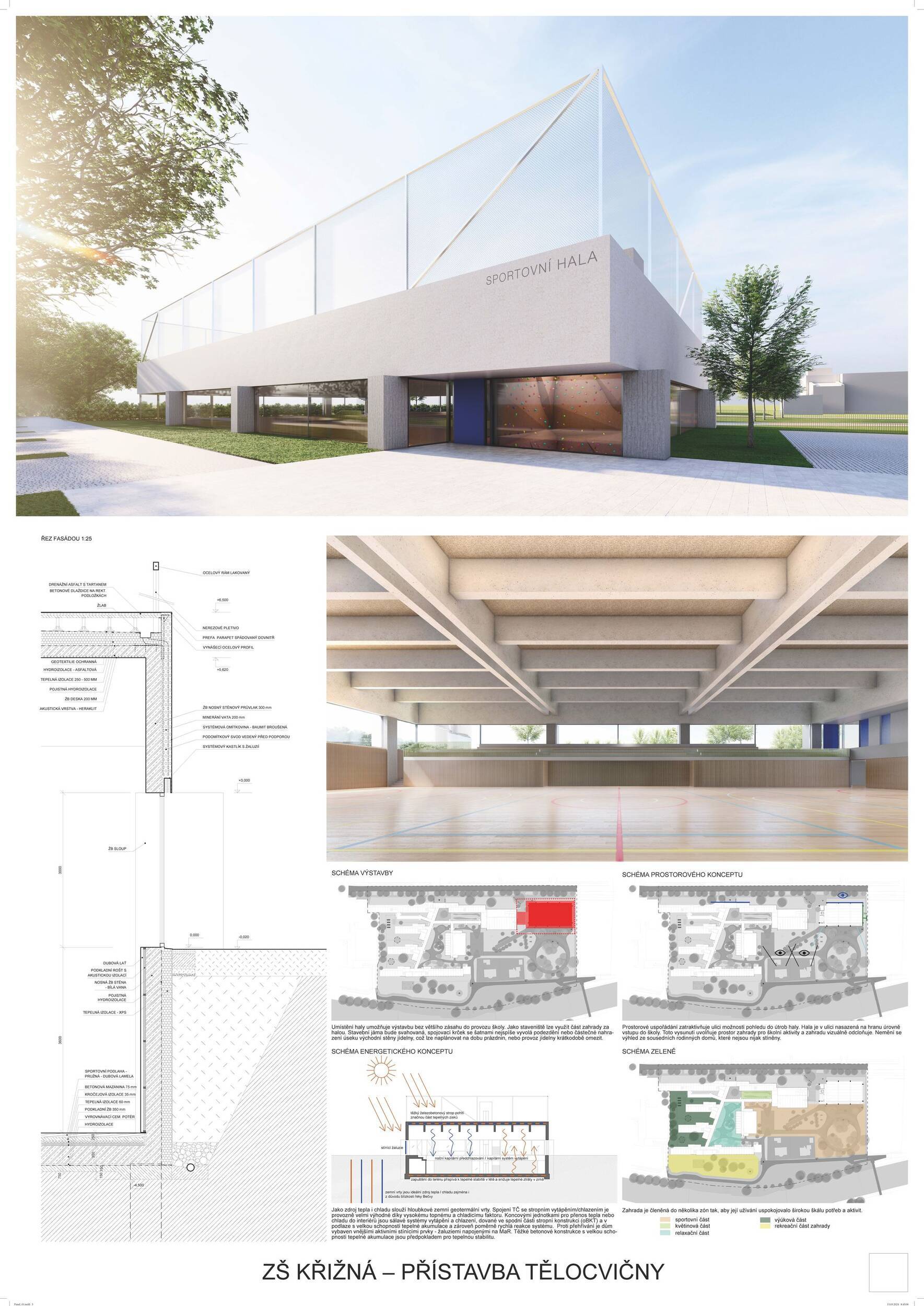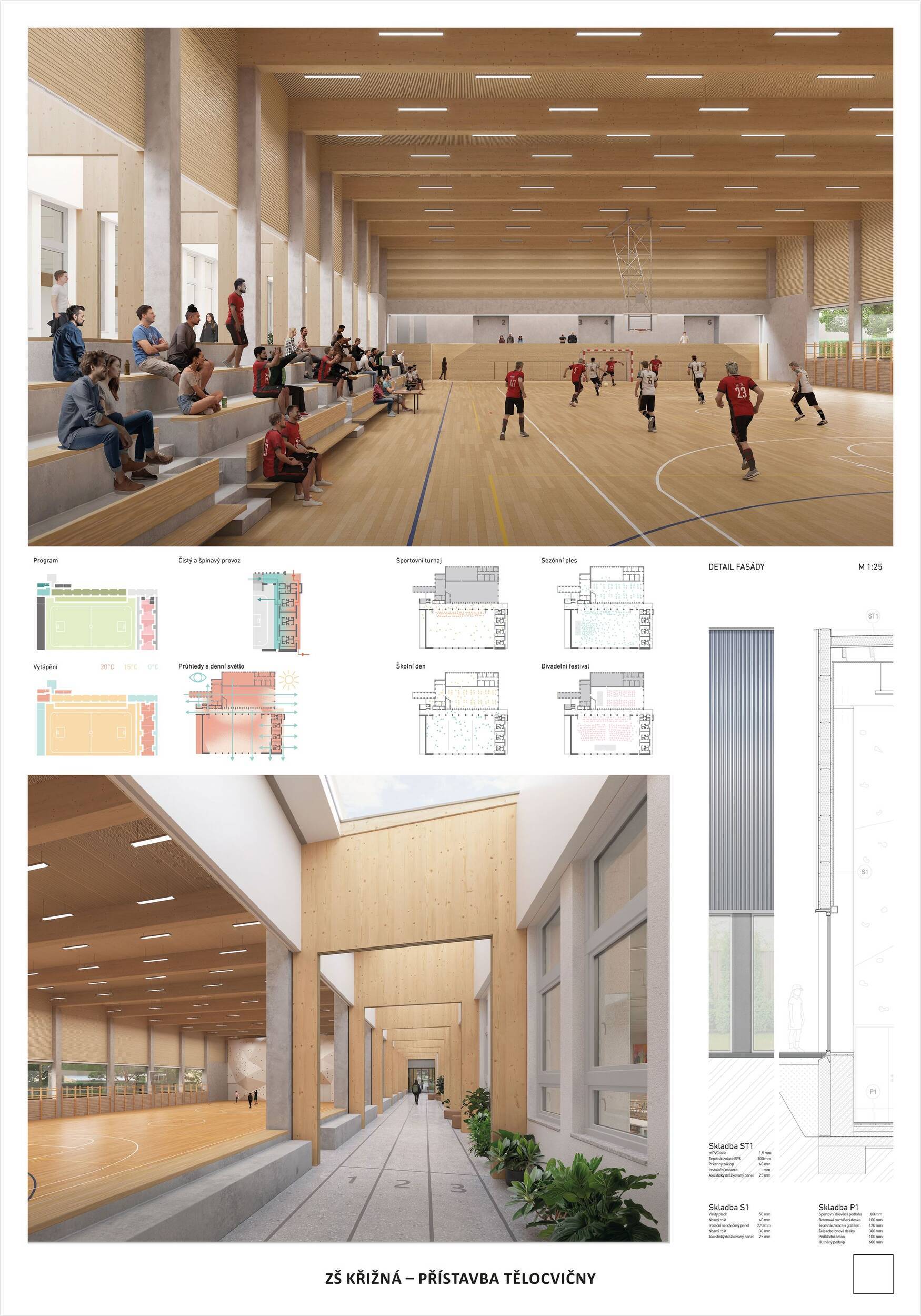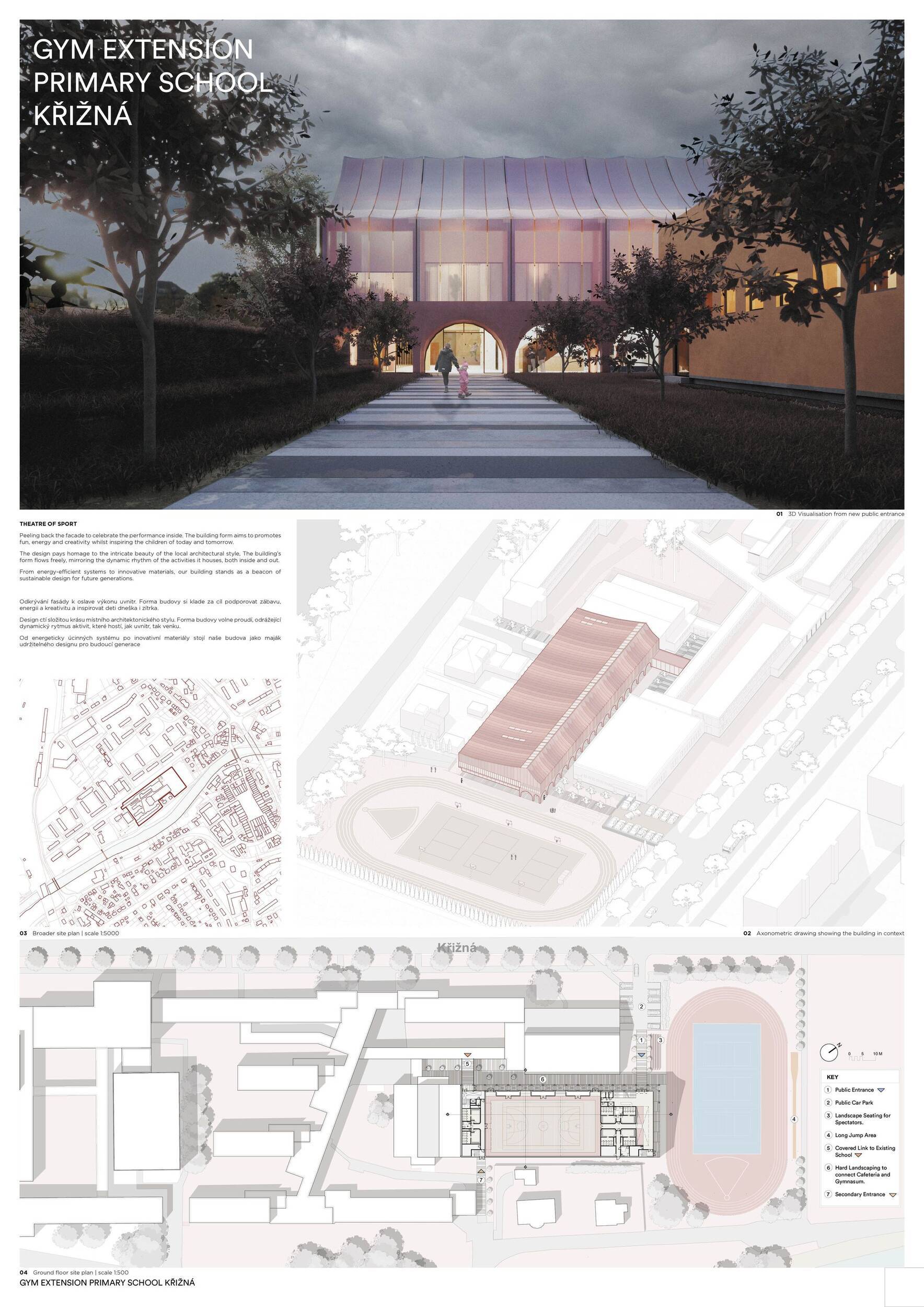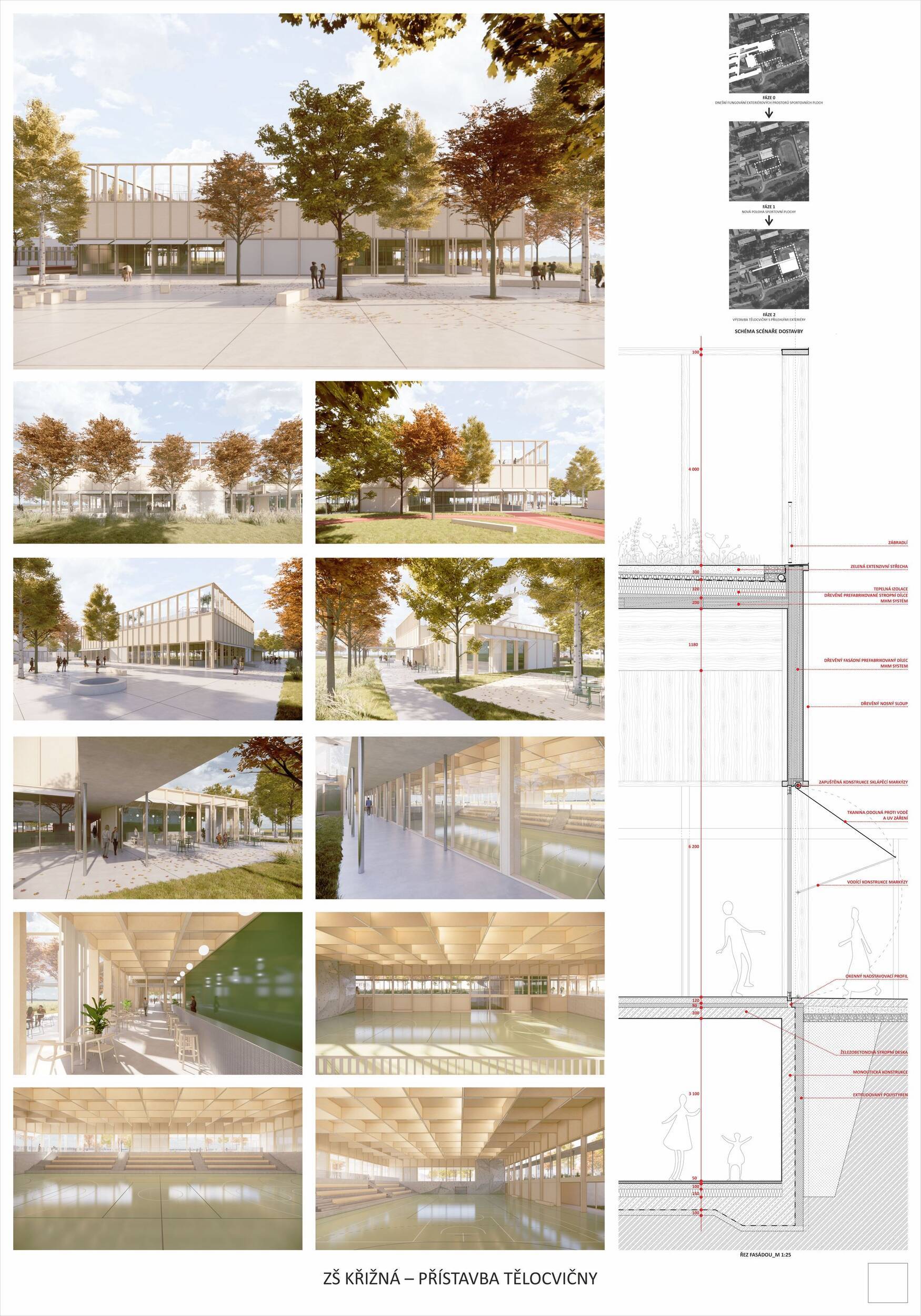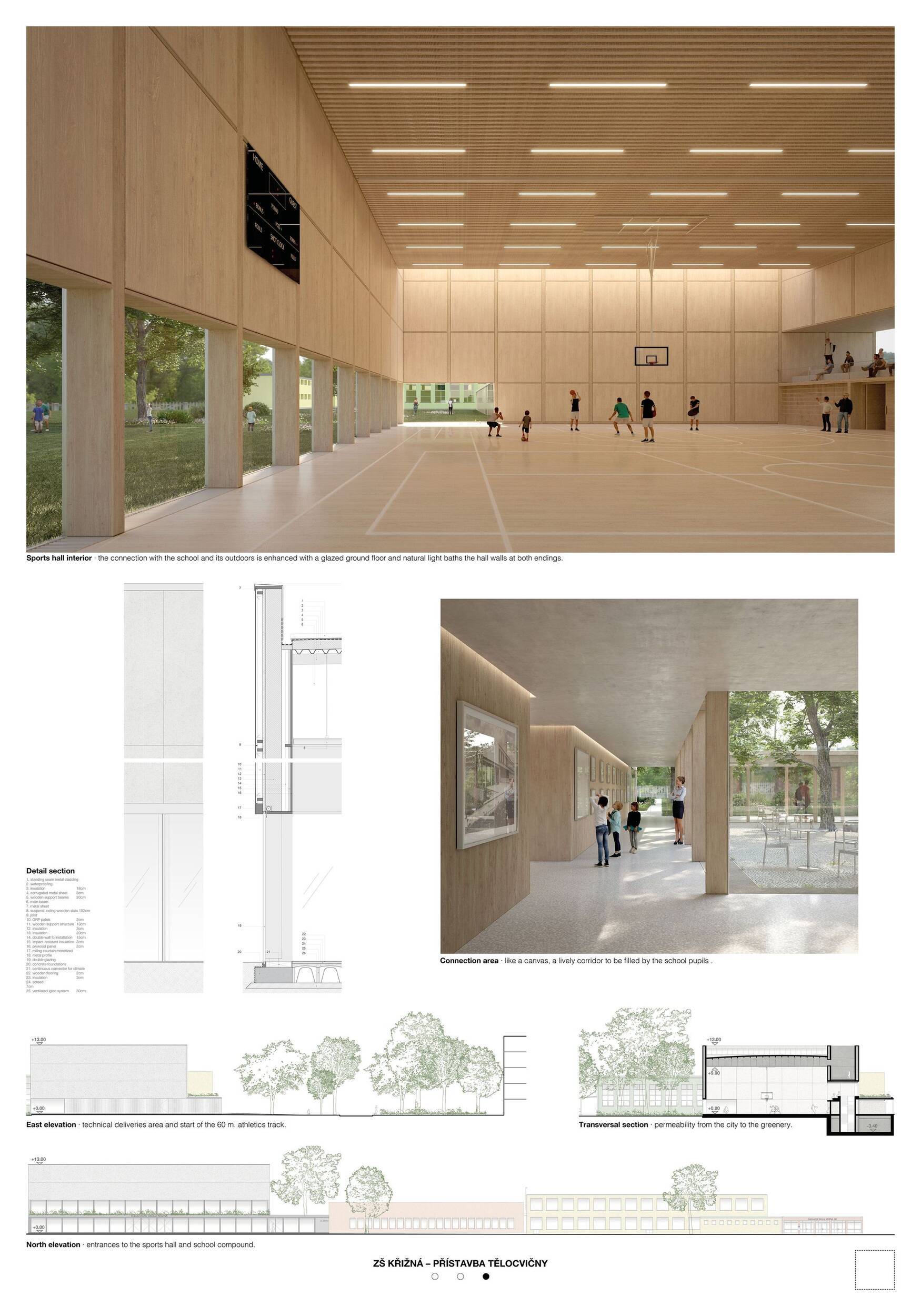Návrh přináší změnu do celého areálu Základní školy Křižná. Umístěním sportovní haly přímo uprostřed dispozice vzniká široká paleta příležitostí a nových potenciálů, jak z poměrně zastaralé budovy s mnoha nepřehlednými koridory udělat funkční a moderní celek. Najednou vidíte jinou školu, která obstojí ve srovnání s novými budovami. Hlavním potenciálem návrhu je tak změna, která se nevyhýbá řešení stávajících problémů. Tento návrh dostavby tělocvičny jako jediný dokázal zachovat hřiště i zahradu se vzrostlými stromy a dává tímto rozhodnutím slušný prostor pro kultivované krajinářské řešení, které je v této fázi nabídnuto pouze v náznacích, které ovšem mají svou logiku. Návrh umožňuje i postupnou realizaci a je ke stávajícím stromům citlivý. Zpřístupnění střech je velice důležitou částí projektu a velká změna pro školu s doposud převládajícím vnitřním pohybem žáků. Dalším potenciálem návrhu je tak i práce se všemi koridory a zásadní zlepšení vnitřního prostředí pro žactvo, které se doposud pohybovalo v nepřehledných koridorech. Tato změna stávajícího stavu se logicky propíše do šaten, jídelny a může také lépe definovat vstup a vestibul školy. Umístění funkcí, jako je knihovna, počítačová učebna, družina, by mělo tuto změnu rovněž následovat a podpořit tak celkový koncept na vytvoření srdce Základní školy Křižná. Návrh má tak obrovskou přidanou hodnotu – do maximální míry využít a zlepšit stávající areál v moderní pulzující celek s kvalitním vnitřním i venkovním prostředím, které inspiruje budoucí generace.