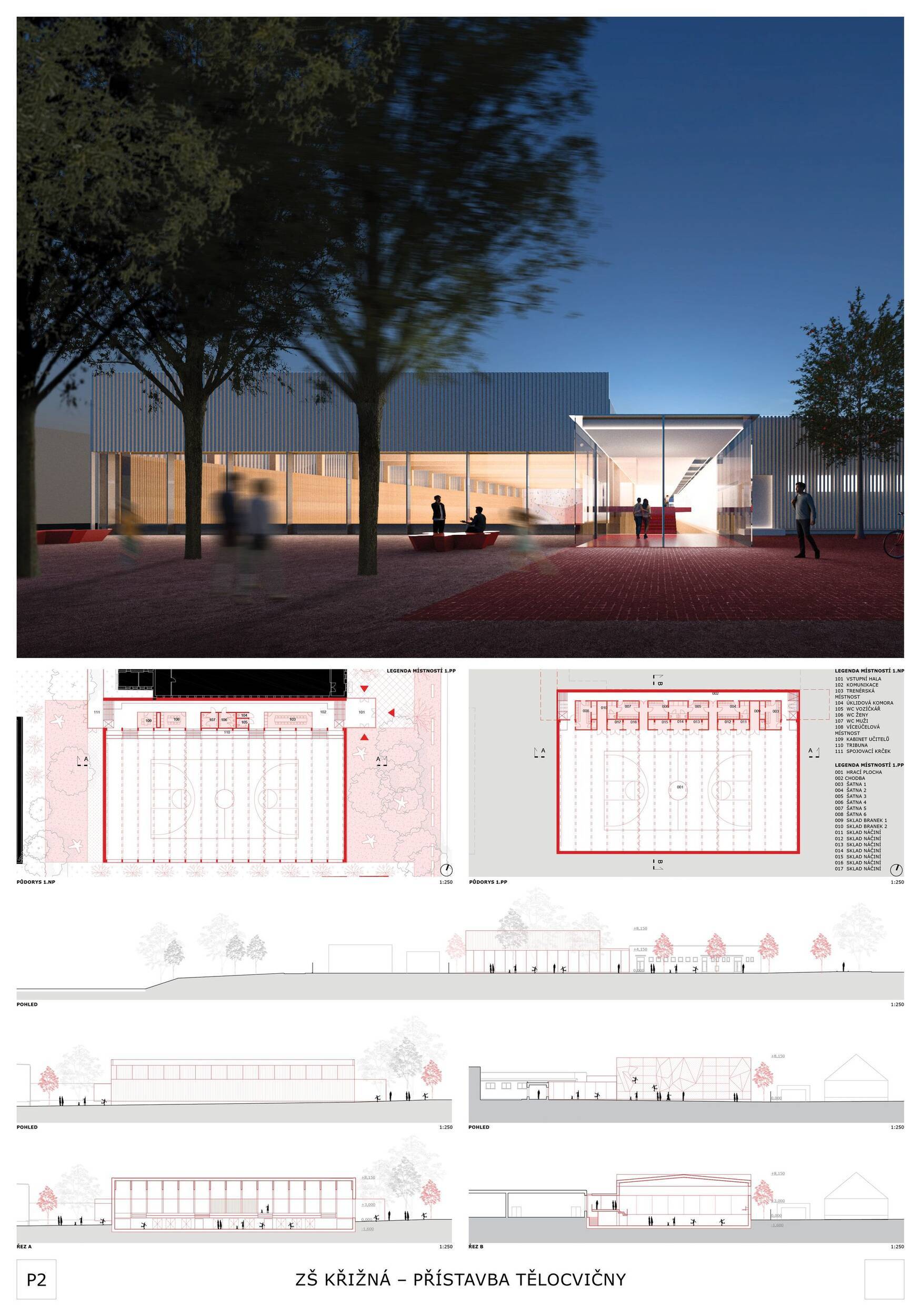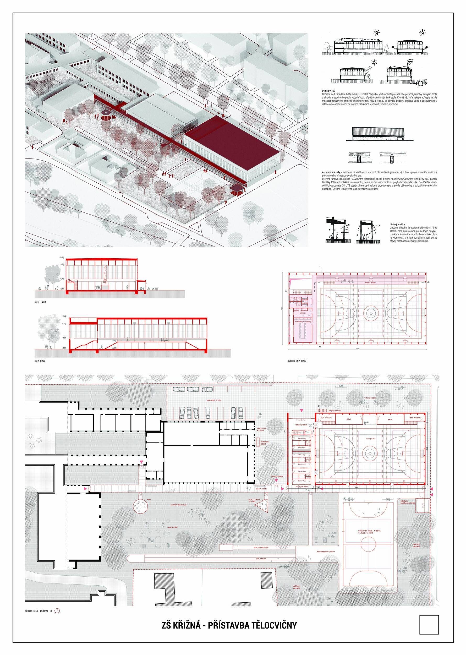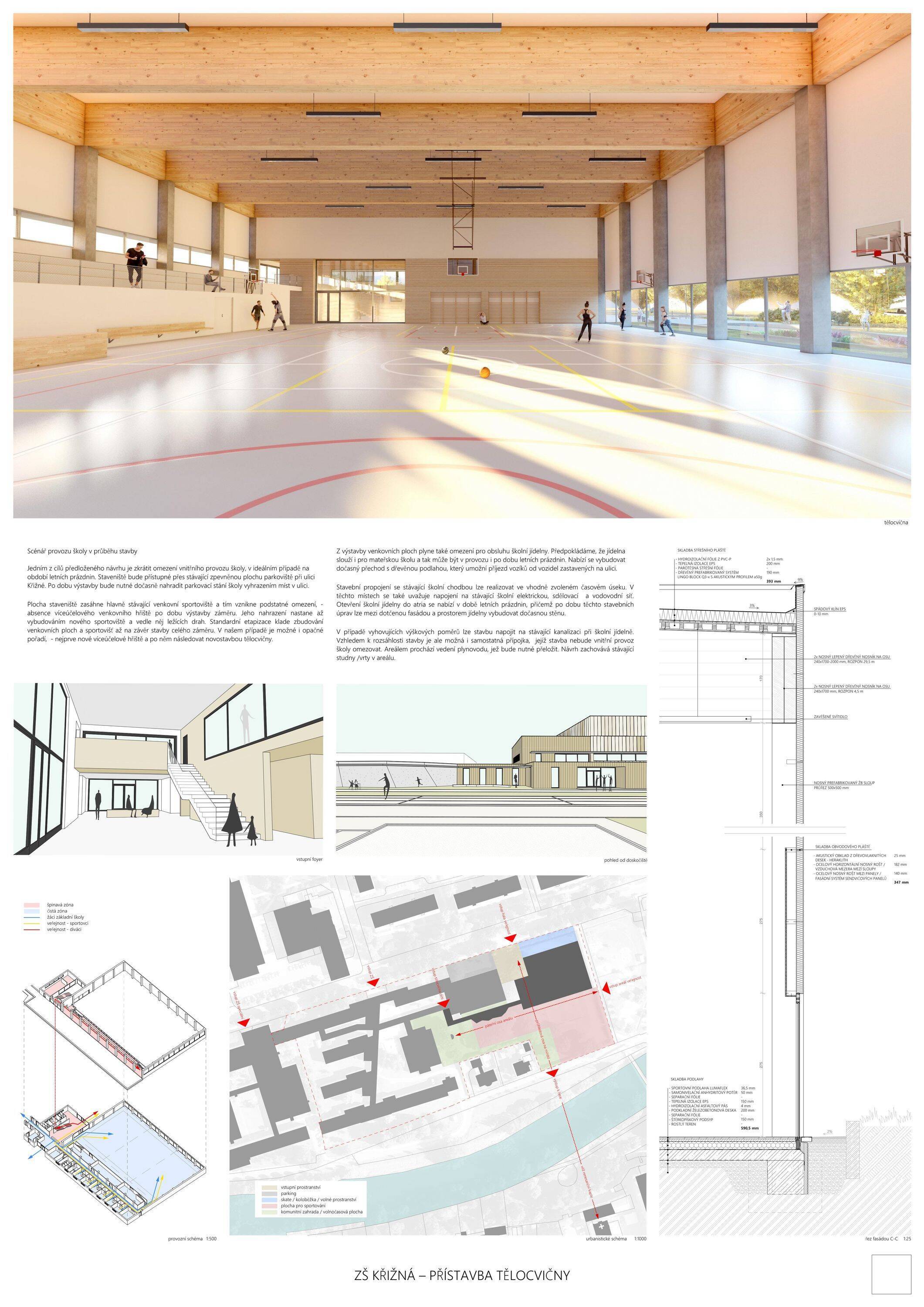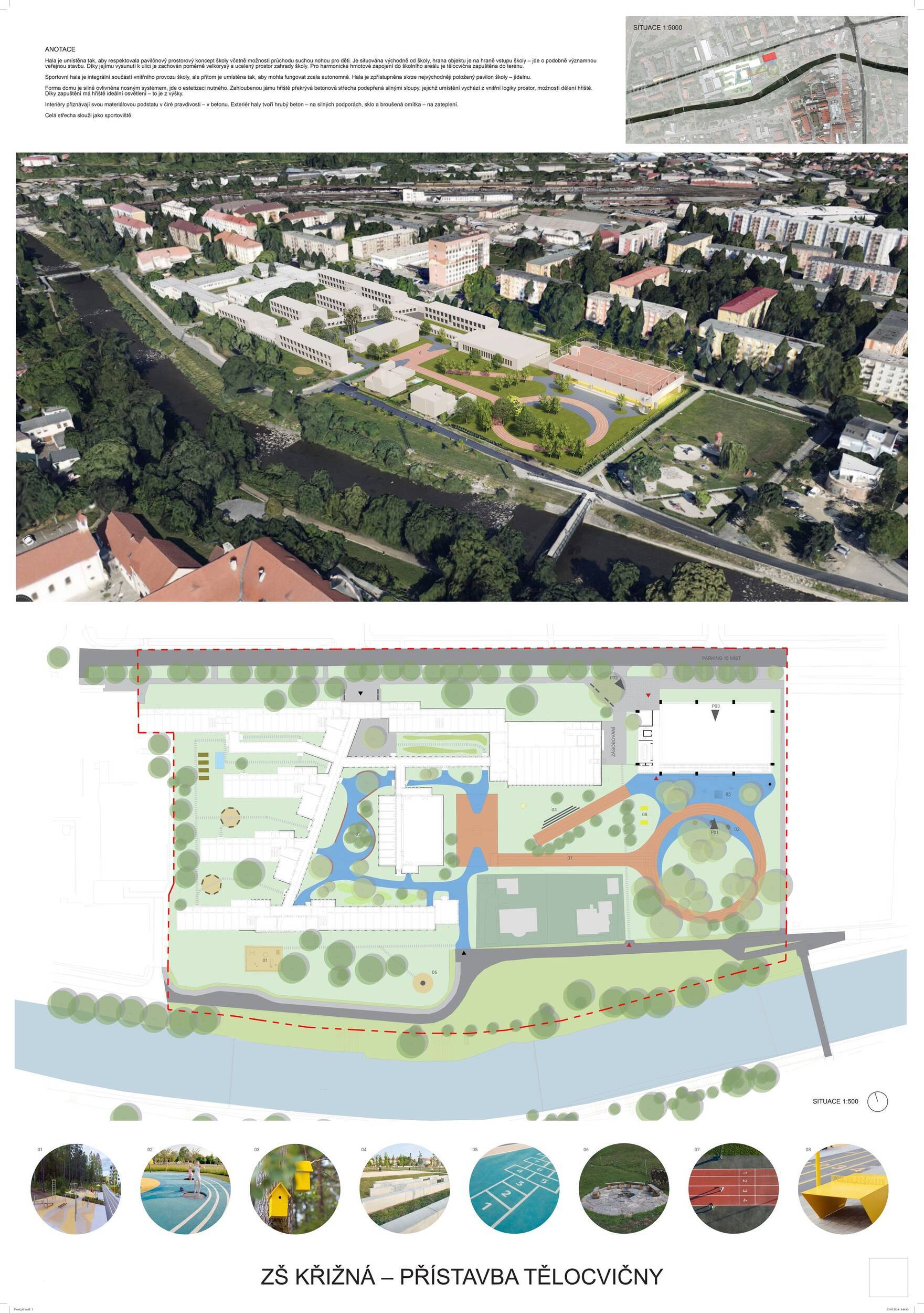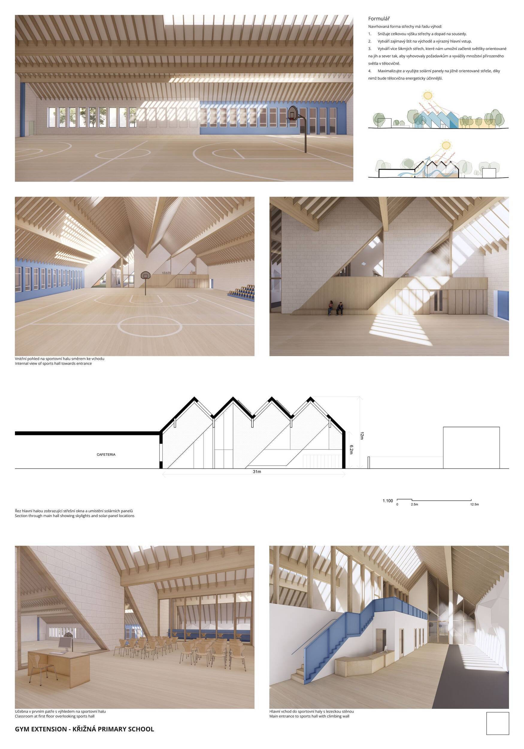 Návrh přináší změnu do celého areálu Základní školy Křižná. Umístěním sportovní haly přímo uprostřed dispozice vzniká široká paleta příležitostí a nových potenciálů, jak z poměrně zastaralé budovy s mnoha nepřehlednými koridory udělat funkční a moderní celek. Najednou vidíte jinou školu, která obstojí ve srovnání s novými budovami. Hlavním potenciálem návrhu je tak změna, která se nevyhýbá řešení stávajících problémů. Tento návrh dostavby tělocvičny jako jediný dokázal zachovat hřiště i zahradu se vzrostlými stromy a dává tímto rozhodnutím slušný prostor pro kultivované krajinářské řešení, které je v této fázi nabídnuto pouze v náznacích, které ovšem mají svou logiku. Návrh umožňuje i postupnou realizaci a je ke stávajícím stromům citlivý. Zpřístupnění střech je velice důležitou částí projektu a velká změna pro školu s doposud převládajícím vnitřním pohybem žáků. Dalším potenciálem návrhu je tak i práce se všemi koridory a zásadní zlepšení vnitřního prostředí pro žactvo, které se doposud pohybovalo v nepřehledných koridorech. Tato změna stávajícího stavu se logicky propíše do šaten, jídelny a může také lépe definovat vstup a vestibul školy. Umístění funkcí, jako je knihovna, počítačová učebna, družina, by mělo tuto změnu rovněž následovat a podpořit tak celkový koncept na vytvoření srdce Základní školy Křižná. Návrh má tak obrovskou přidanou hodnotu – do maximální míry využít a zlepšit stávající areál v moderní pulzující celek s kvalitním vnitřním i venkovním prostředím, které inspiruje budoucí generace.