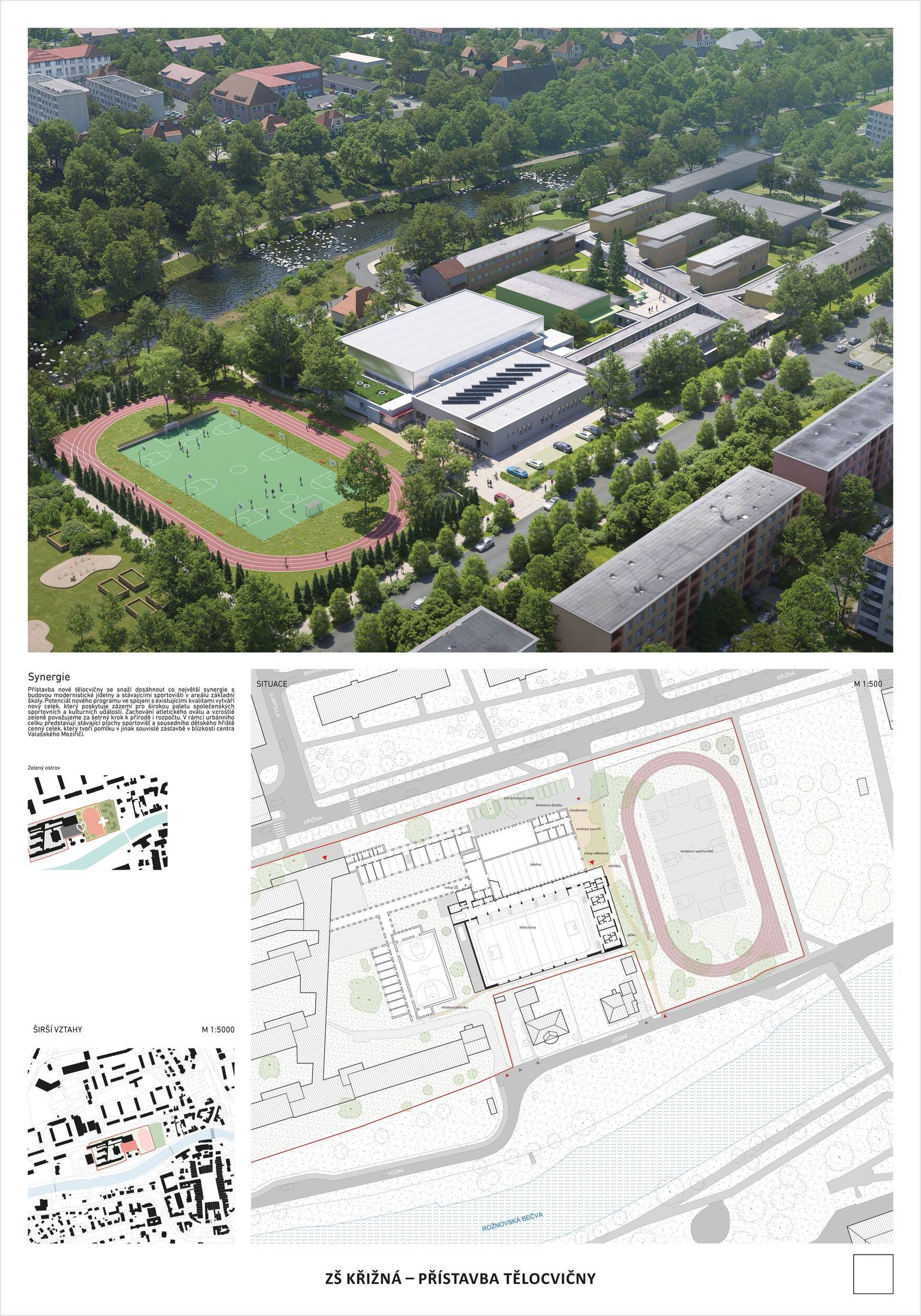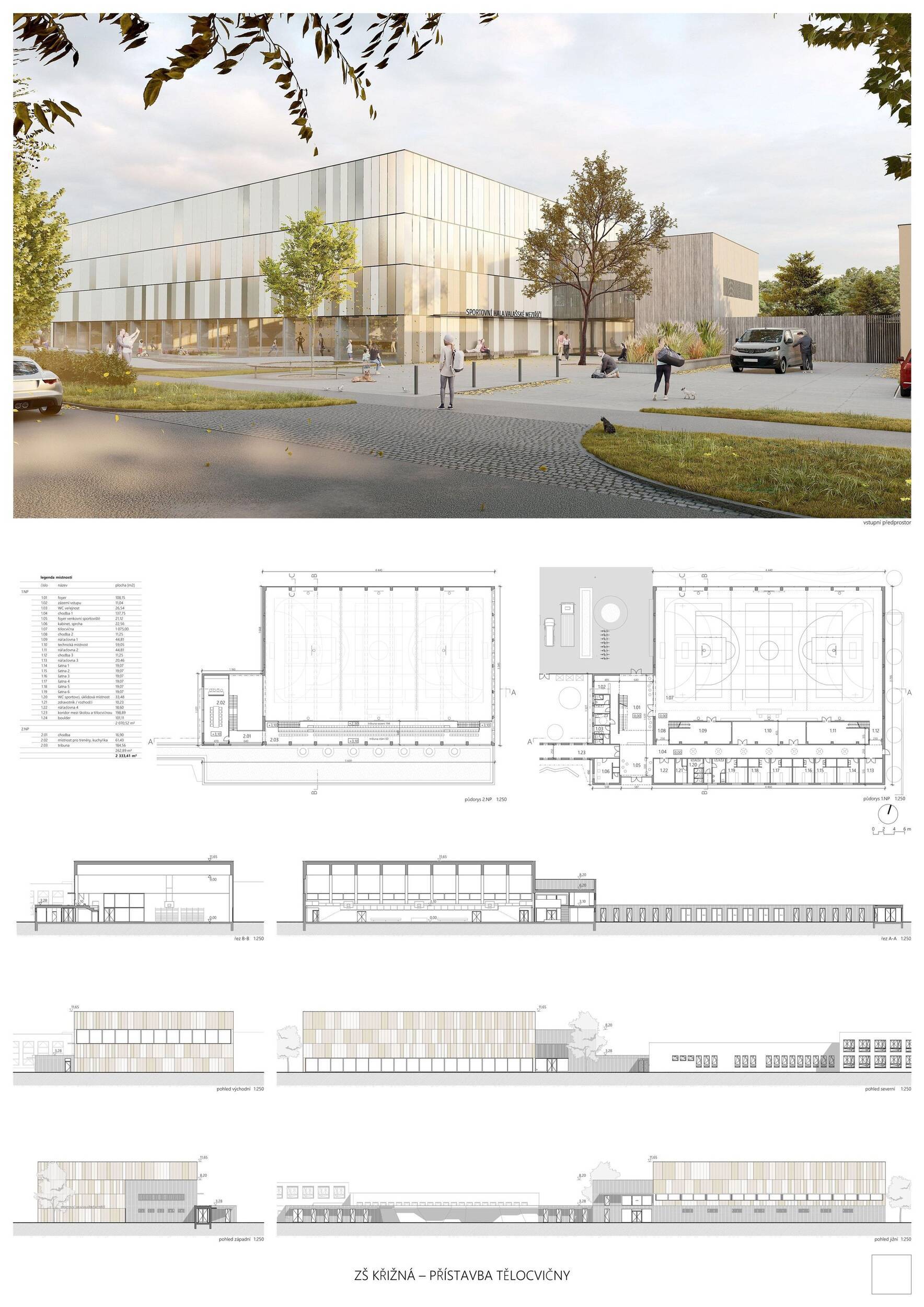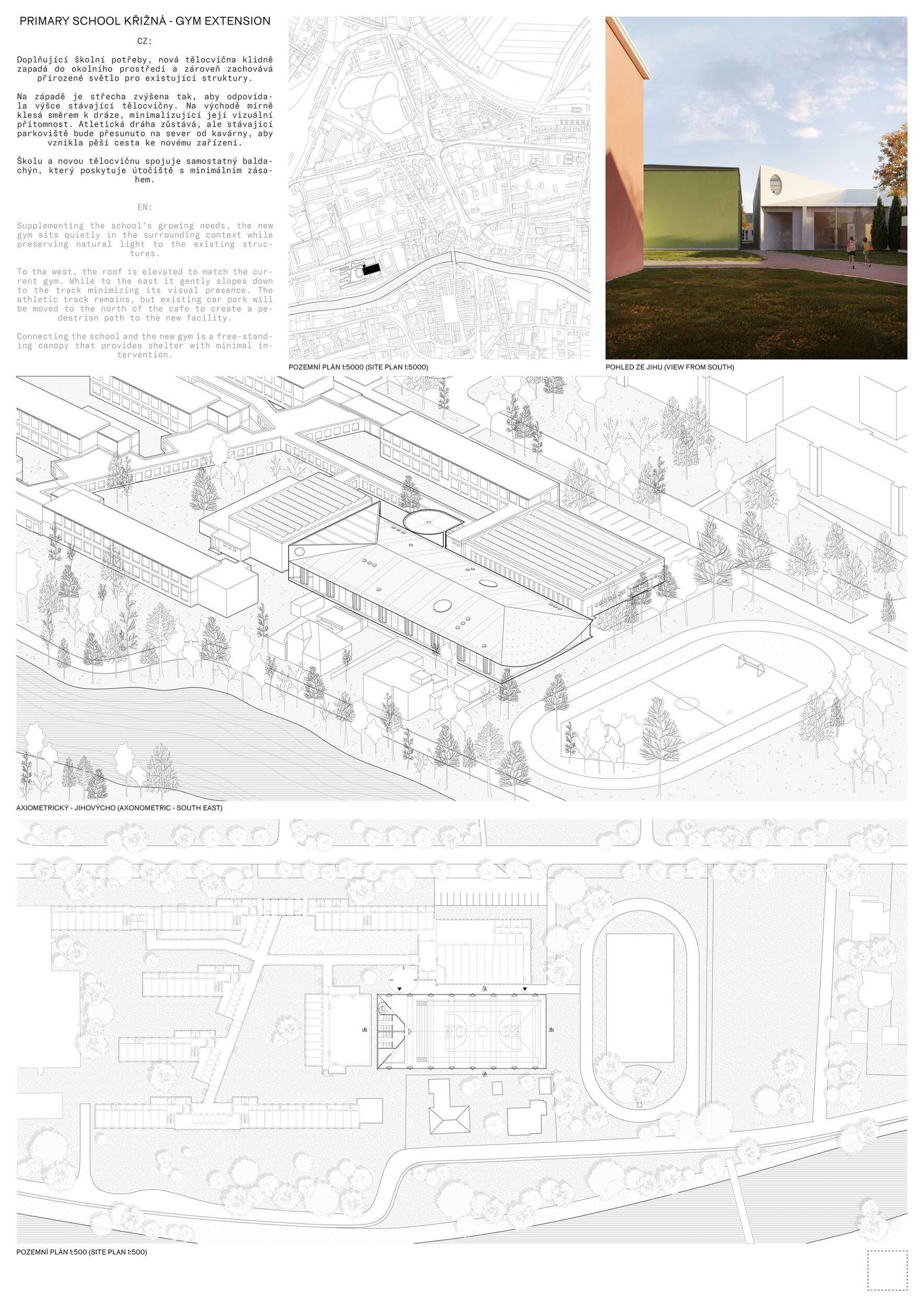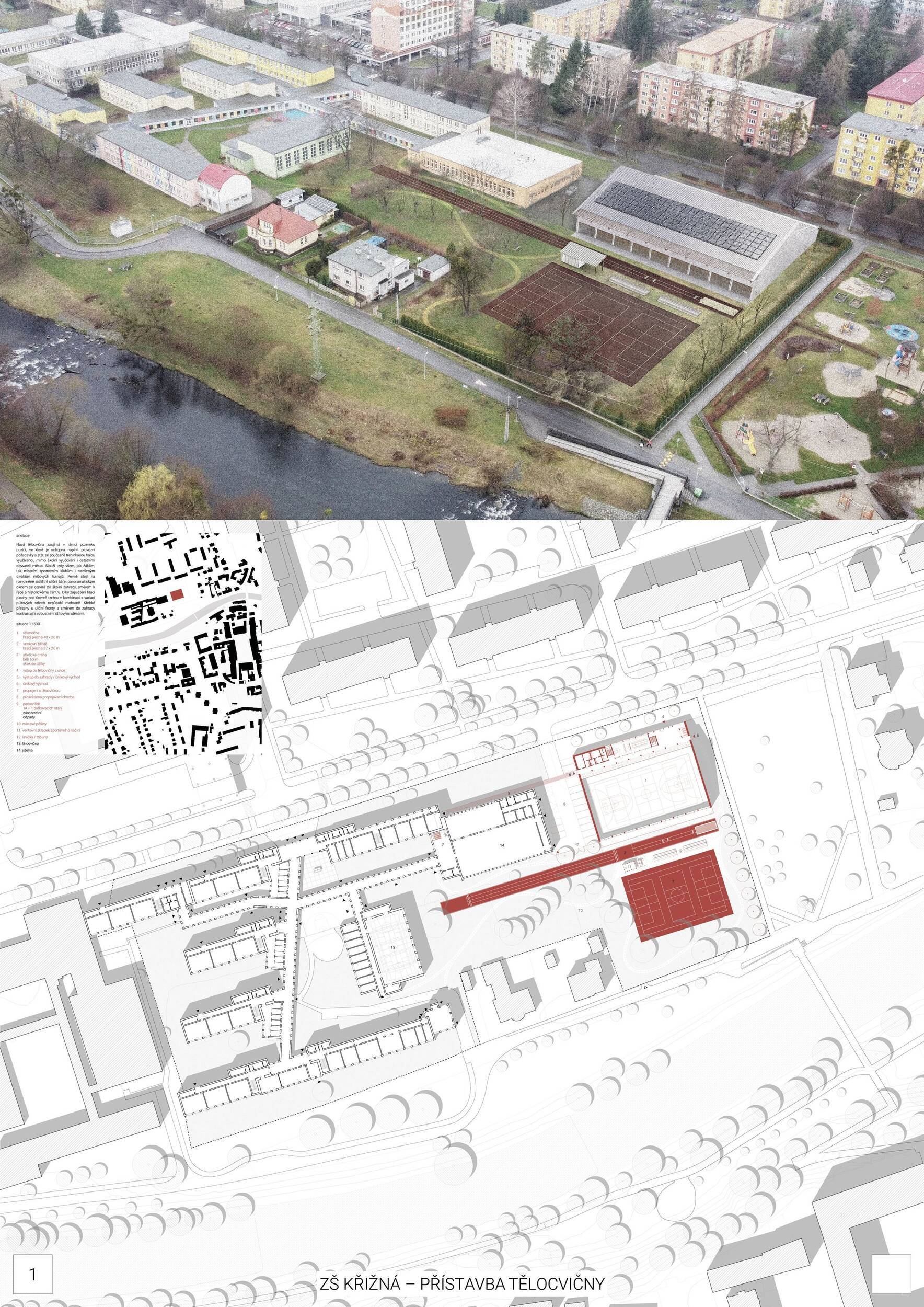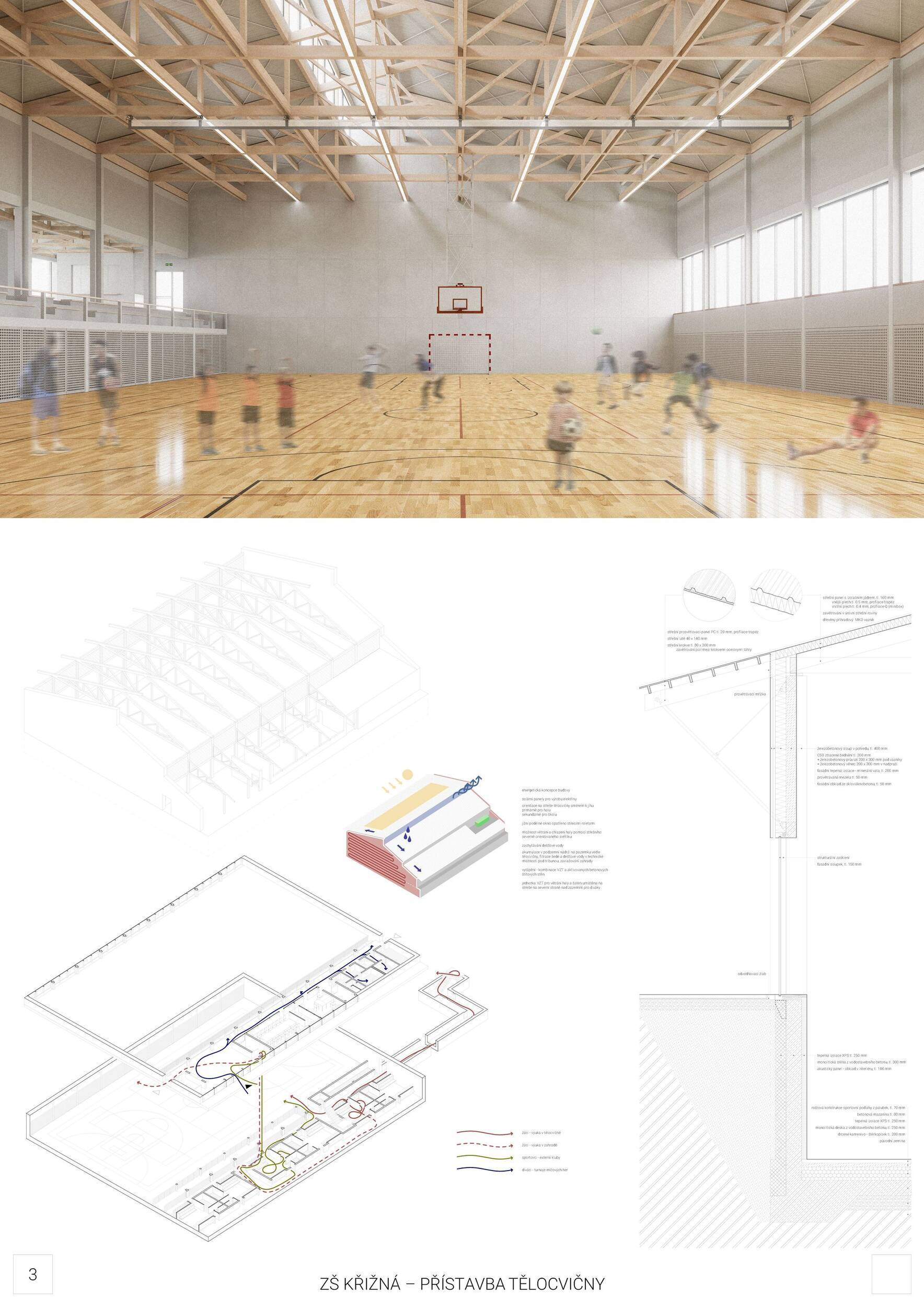 Návrh přináší změnu do celého areálu Základní školy Křižná. Umístěním sportovní haly přímo uprostřed dispozice vzniká široká paleta příležitostí a nových potenciálů, jak z poměrně zastaralé budovy s mnoha nepřehlednými koridory udělat funkční a moderní celek. Najednou vidíte jinou školu, která obstojí ve srovnání s novými budovami. Hlavním potenciálem návrhu je tak změna, která se nevyhýbá řešení stávajících problémů. Tento návrh dostavby tělocvičny jako jediný dokázal zachovat hřiště i zahradu se vzrostlými stromy a dává tímto rozhodnutím slušný prostor pro kultivované krajinářské řešení, které je v této fázi nabídnuto pouze v náznacích, které ovšem mají svou logiku. Návrh umožňuje i postupnou realizaci a je ke stávajícím stromům citlivý. Zpřístupnění střech je velice důležitou částí projektu a velká změna pro školu s doposud převládajícím vnitřním pohybem žáků. Dalším potenciálem návrhu je tak i práce se všemi koridory a zásadní zlepšení vnitřního prostředí pro žactvo, které se doposud pohybovalo v nepřehledných koridorech. Tato změna stávajícího stavu se logicky propíše do šaten, jídelny a může také lépe definovat vstup a vestibul školy. Umístění funkcí, jako je knihovna, počítačová učebna, družina, by mělo tuto změnu rovněž následovat a podpořit tak celkový koncept na vytvoření srdce Základní školy Křižná. Návrh má tak obrovskou přidanou hodnotu – do maximální míry využít a zlepšit stávající areál v moderní pulzující celek s kvalitním vnitřním i venkovním prostředím, které inspiruje budoucí generace.