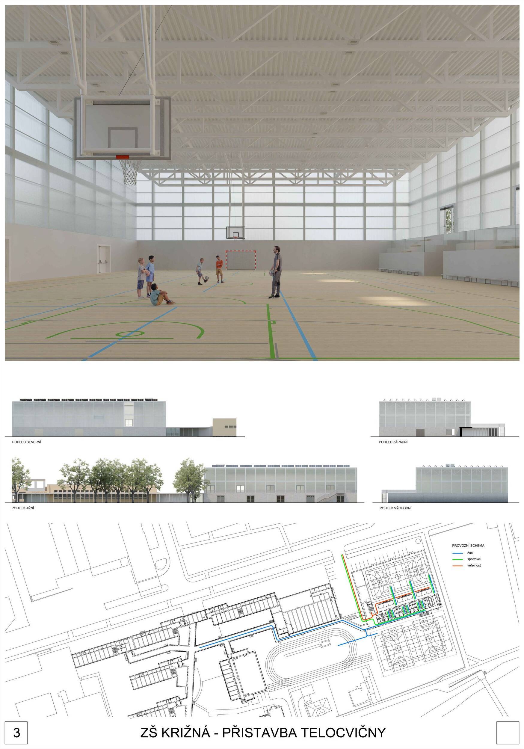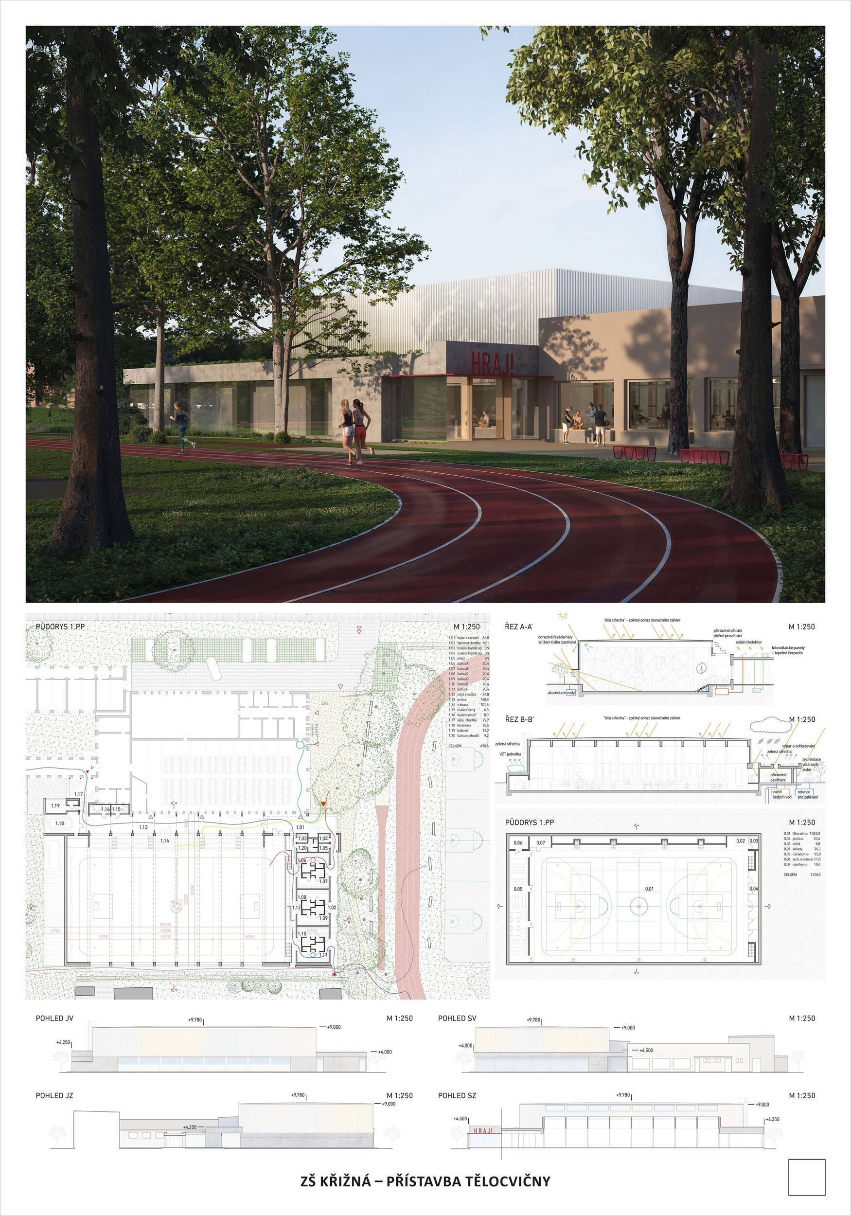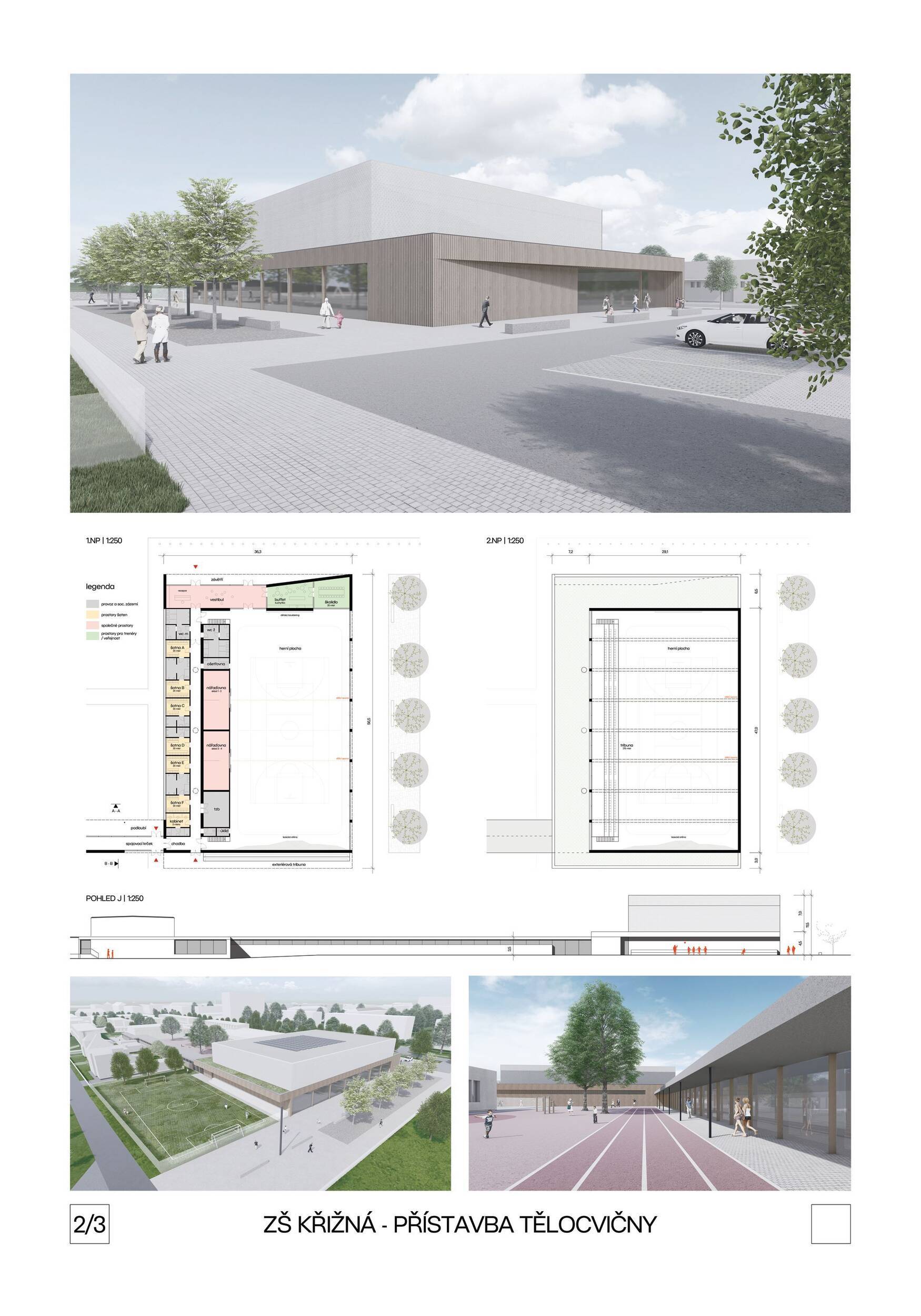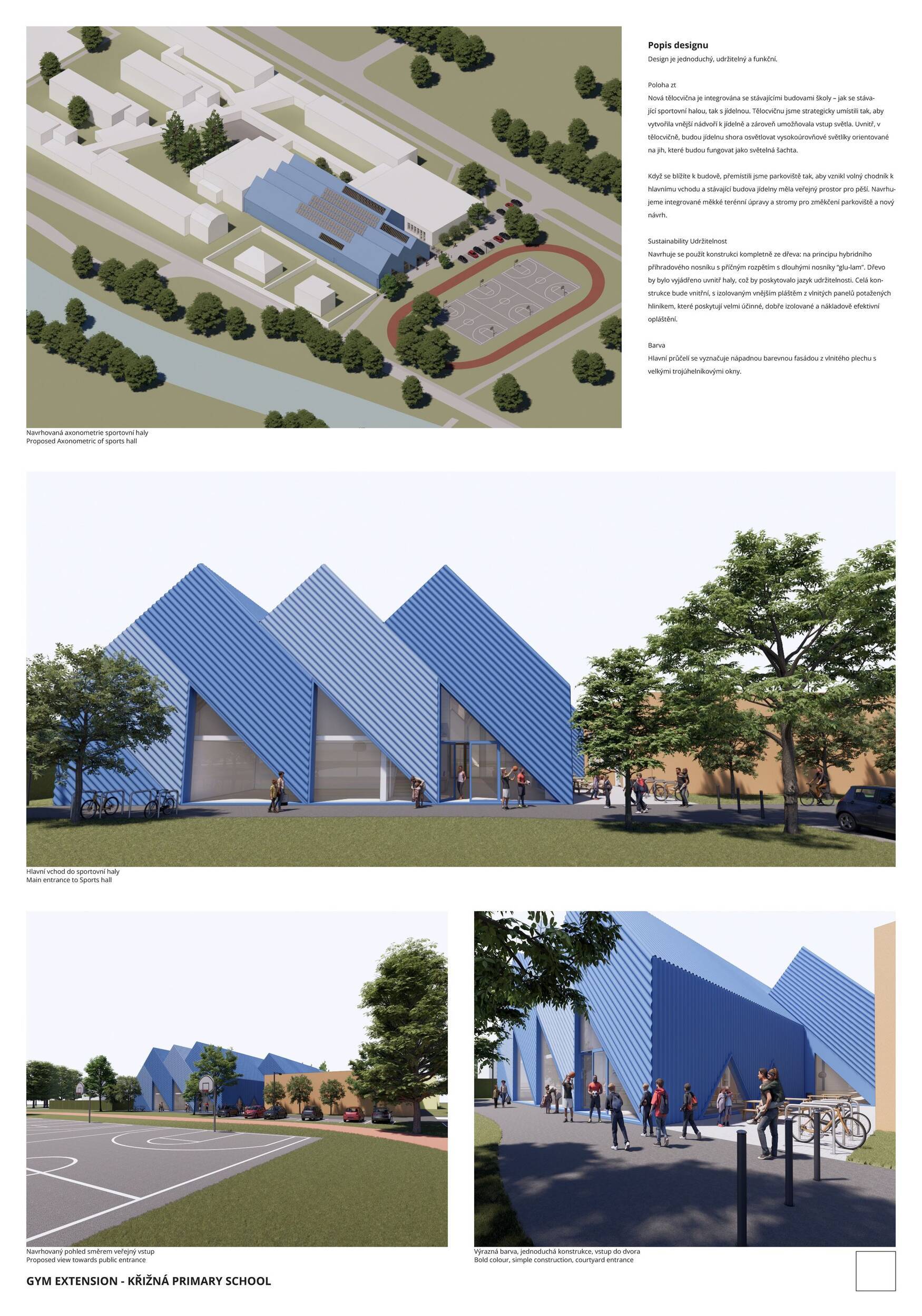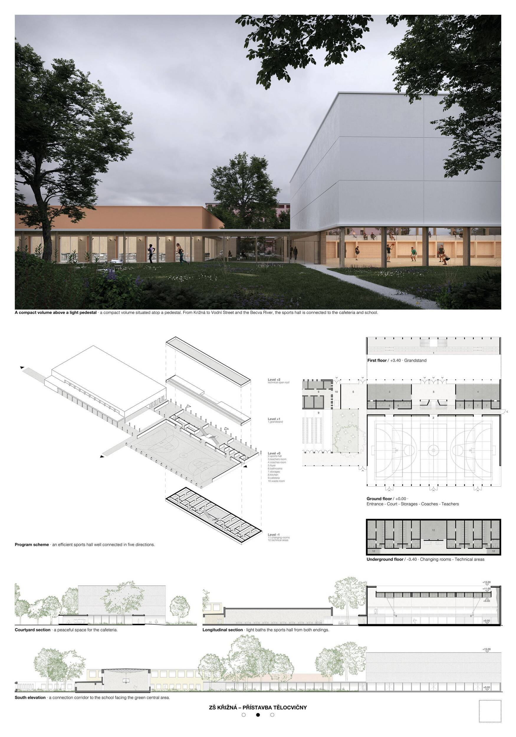 Návrh přináší změnu do celého areálu Základní školy Křižná. Umístěním sportovní haly přímo uprostřed dispozice vzniká široká paleta příležitostí a nových potenciálů, jak z poměrně zastaralé budovy s mnoha nepřehlednými koridory udělat funkční a moderní celek. Najednou vidíte jinou školu, která obstojí ve srovnání s novými budovami. Hlavním potenciálem návrhu je tak změna, která se nevyhýbá řešení stávajících problémů. Tento návrh dostavby tělocvičny jako jediný dokázal zachovat hřiště i zahradu se vzrostlými stromy a dává tímto rozhodnutím slušný prostor pro kultivované krajinářské řešení, které je v této fázi nabídnuto pouze v náznacích, které ovšem mají svou logiku. Návrh umožňuje i postupnou realizaci a je ke stávajícím stromům citlivý. Zpřístupnění střech je velice důležitou částí projektu a velká změna pro školu s doposud převládajícím vnitřním pohybem žáků. Dalším potenciálem návrhu je tak i práce se všemi koridory a zásadní zlepšení vnitřního prostředí pro žactvo, které se doposud pohybovalo v nepřehledných koridorech. Tato změna stávajícího stavu se logicky propíše do šaten, jídelny a může také lépe definovat vstup a vestibul školy. Umístění funkcí, jako je knihovna, počítačová učebna, družina, by mělo tuto změnu rovněž následovat a podpořit tak celkový koncept na vytvoření srdce Základní školy Křižná. Návrh má tak obrovskou přidanou hodnotu – do maximální míry využít a zlepšit stávající areál v moderní pulzující celek s kvalitním vnitřním i venkovním prostředím, které inspiruje budoucí generace.
