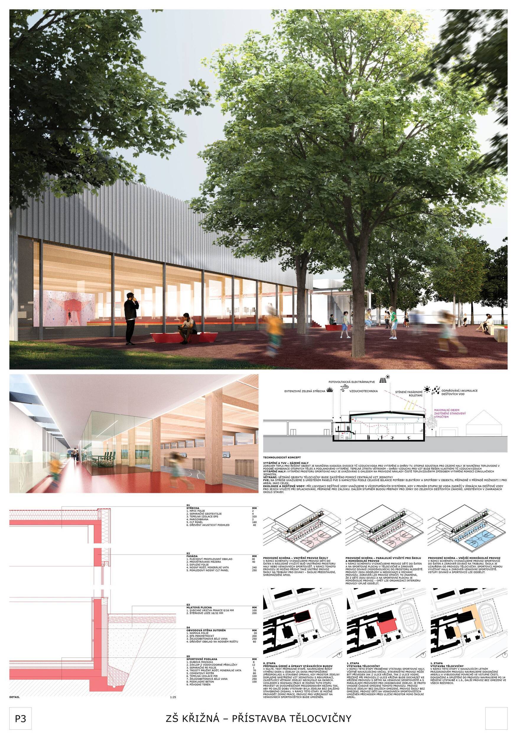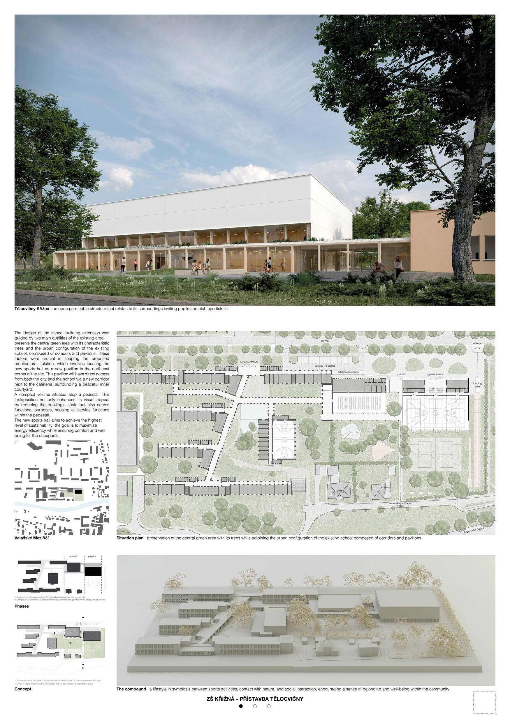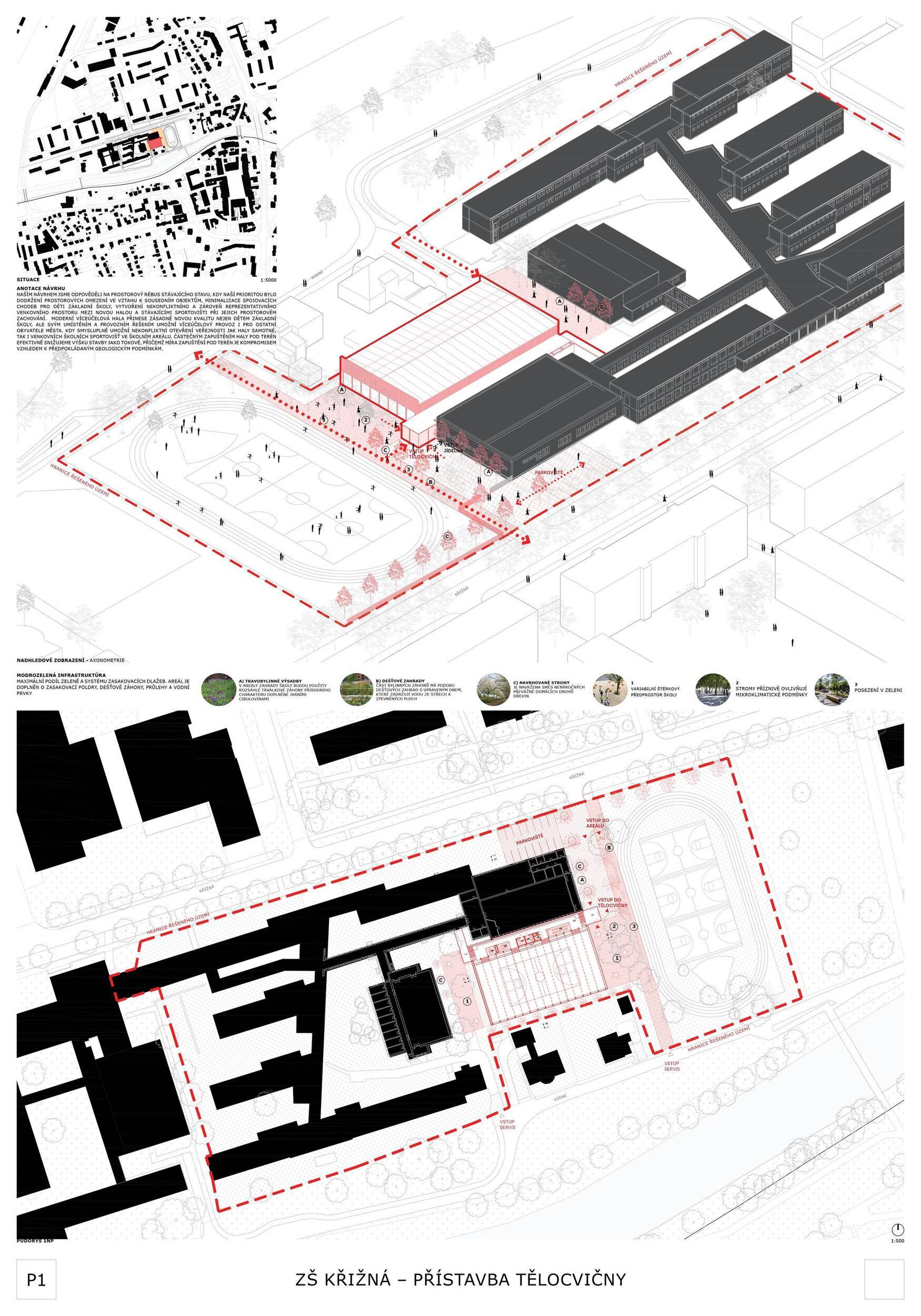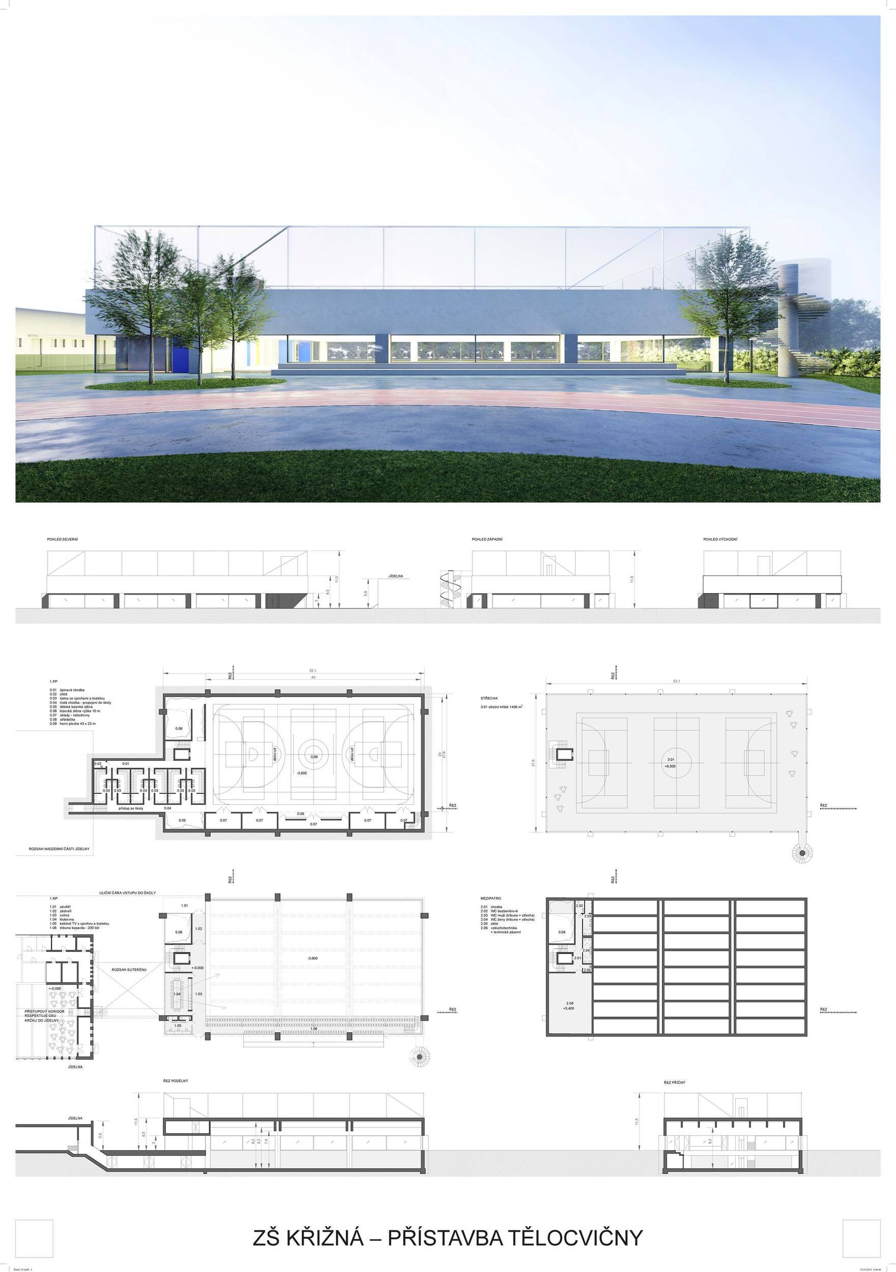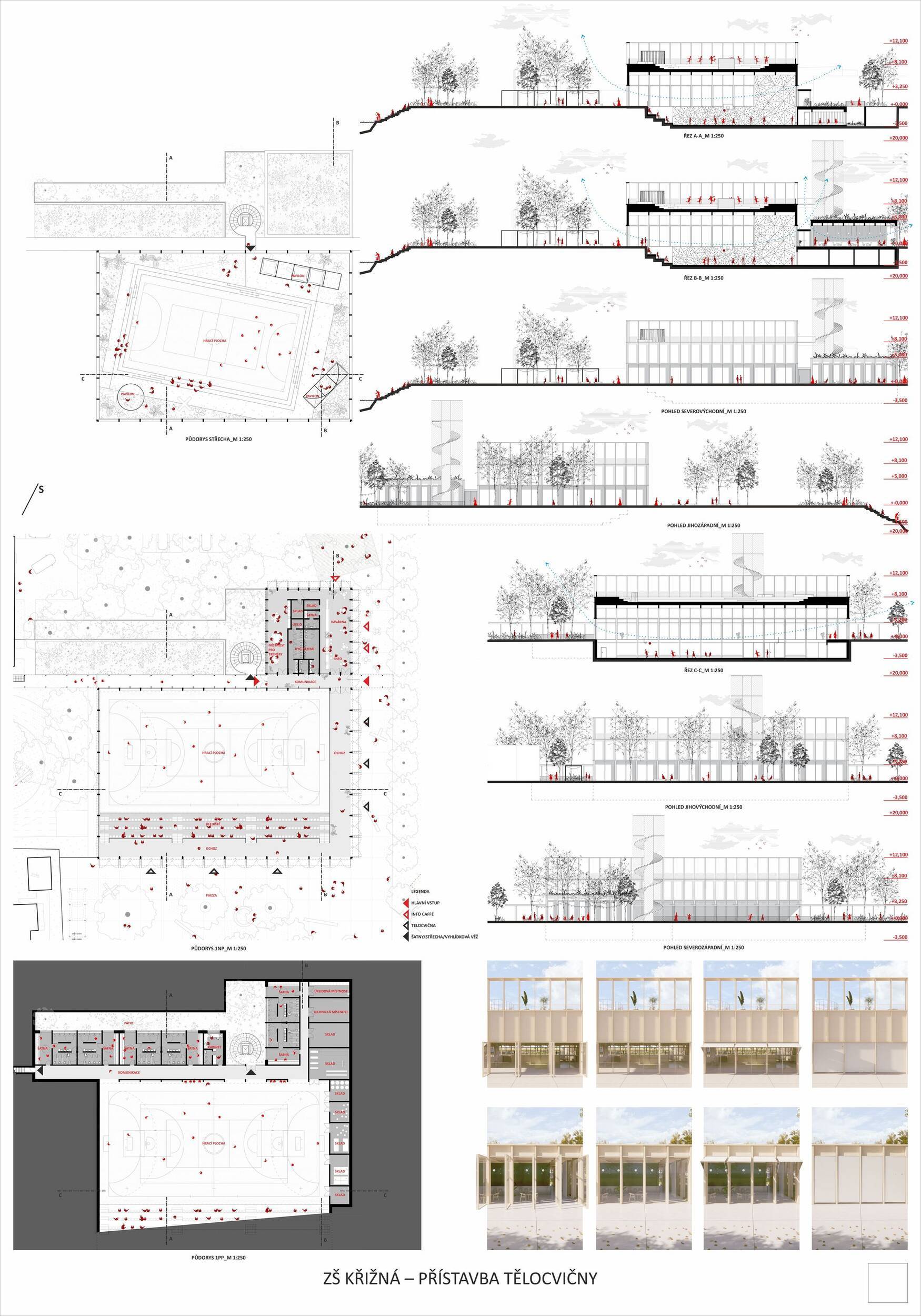 Návrh přináší změnu do celého areálu Základní školy Křižná. Umístěním sportovní haly přímo uprostřed dispozice vzniká široká paleta příležitostí a nových potenciálů, jak z poměrně zastaralé budovy s mnoha nepřehlednými koridory udělat funkční a moderní celek. Najednou vidíte jinou školu, která obstojí ve srovnání s novými budovami. Hlavním potenciálem návrhu je tak změna, která se nevyhýbá řešení stávajících problémů. Tento návrh dostavby tělocvičny jako jediný dokázal zachovat hřiště i zahradu se vzrostlými stromy a dává tímto rozhodnutím slušný prostor pro kultivované krajinářské řešení, které je v této fázi nabídnuto pouze v náznacích, které ovšem mají svou logiku. Návrh umožňuje i postupnou realizaci a je ke stávajícím stromům citlivý. Zpřístupnění střech je velice důležitou částí projektu a velká změna pro školu s doposud převládajícím vnitřním pohybem žáků. Dalším potenciálem návrhu je tak i práce se všemi koridory a zásadní zlepšení vnitřního prostředí pro žactvo, které se doposud pohybovalo v nepřehledných koridorech. Tato změna stávajícího stavu se logicky propíše do šaten, jídelny a může také lépe definovat vstup a vestibul školy. Umístění funkcí, jako je knihovna, počítačová učebna, družina, by mělo tuto změnu rovněž následovat a podpořit tak celkový koncept na vytvoření srdce Základní školy Křižná. Návrh má tak obrovskou přidanou hodnotu – do maximální míry využít a zlepšit stávající areál v moderní pulzující celek s kvalitním vnitřním i venkovním prostředím, které inspiruje budoucí generace.