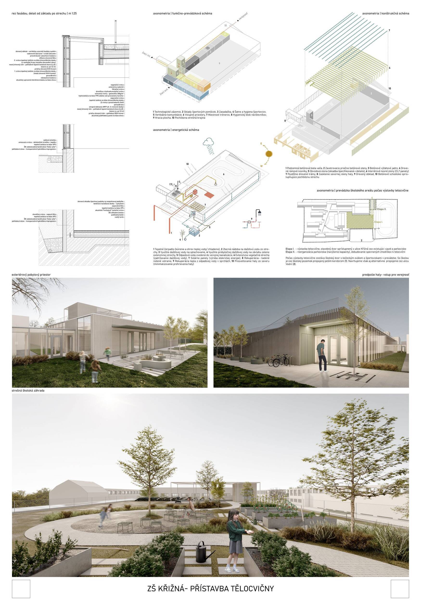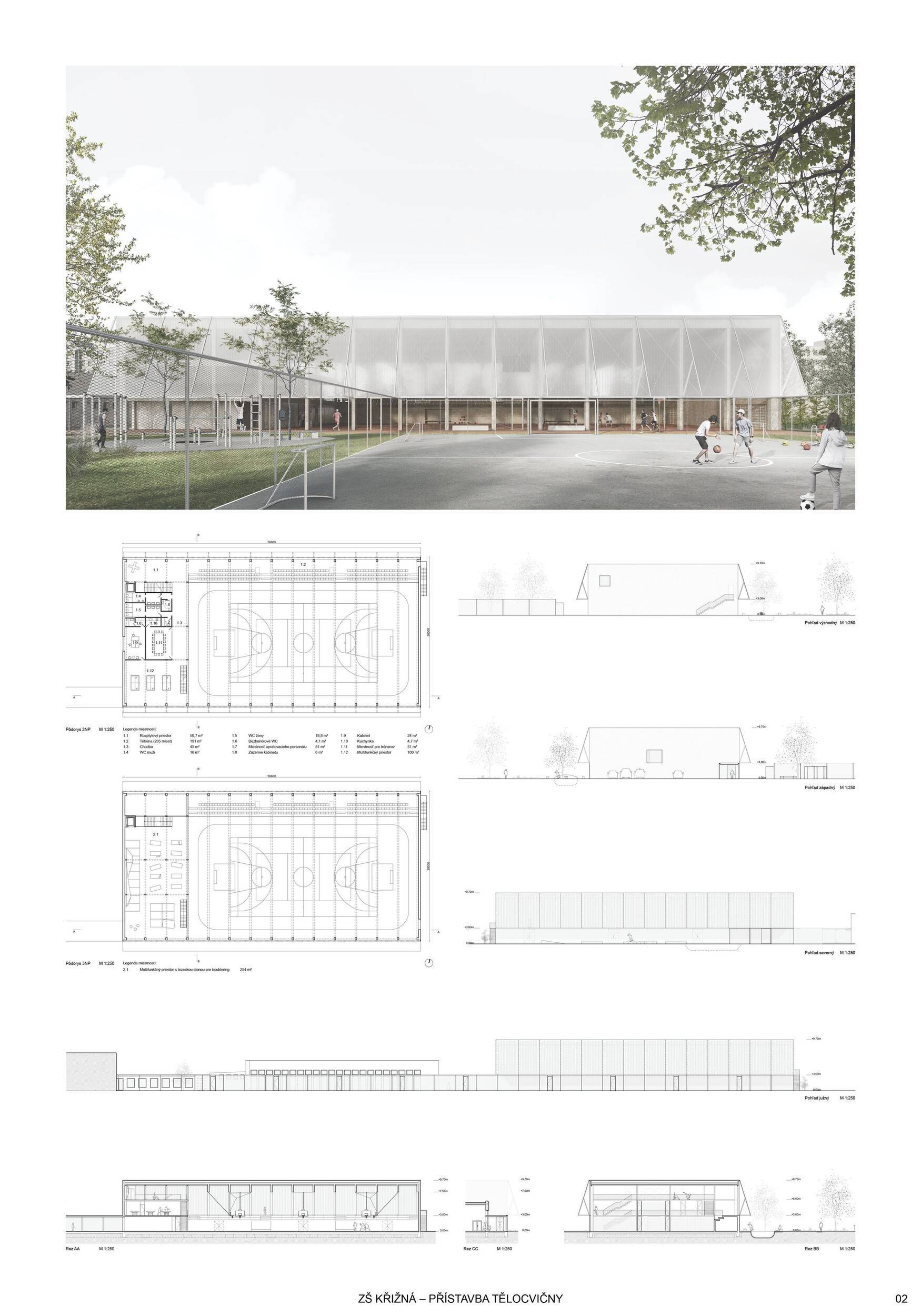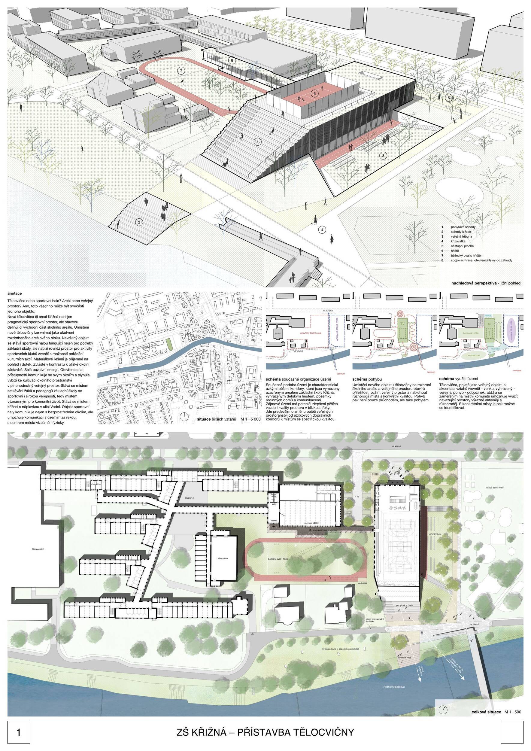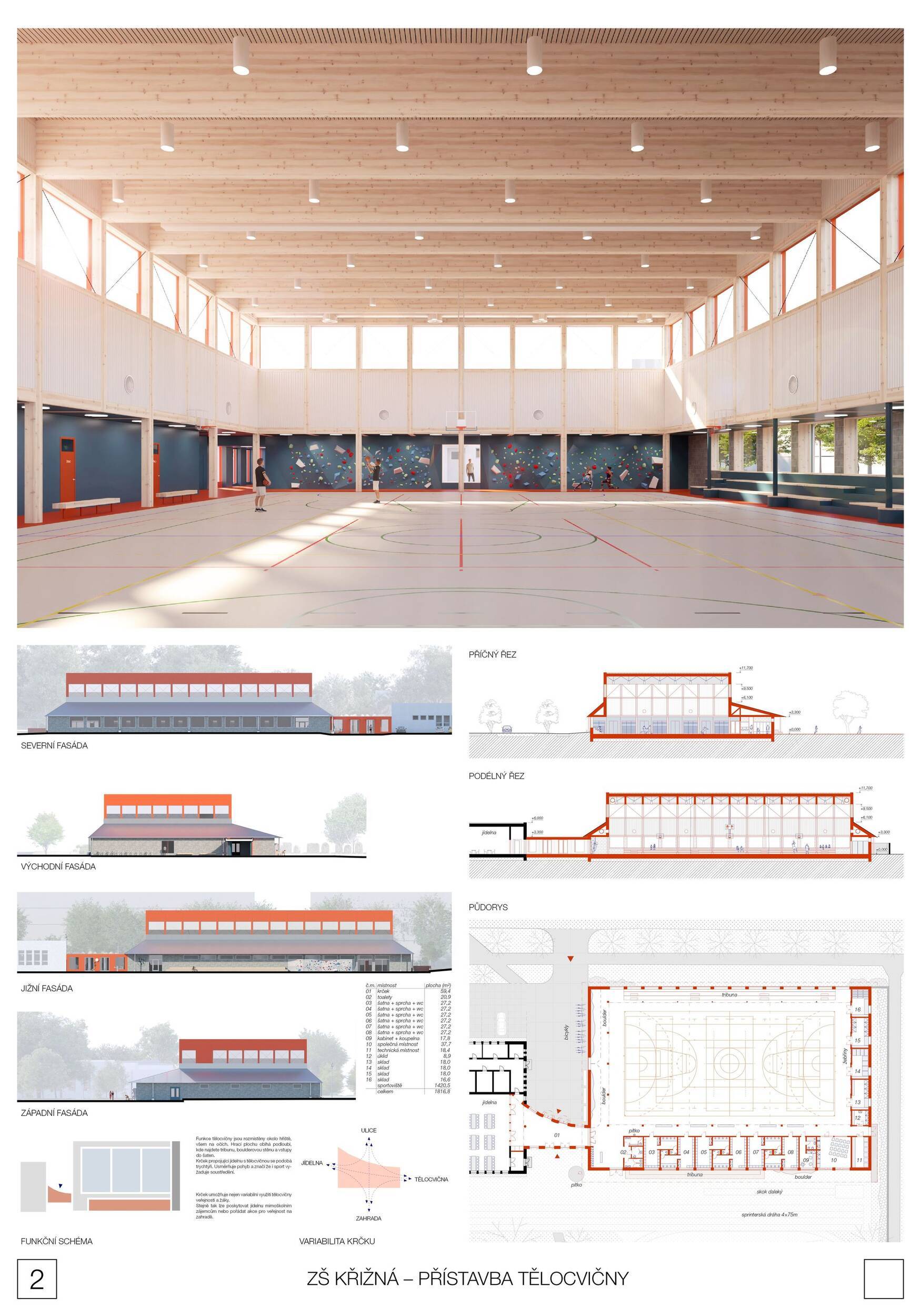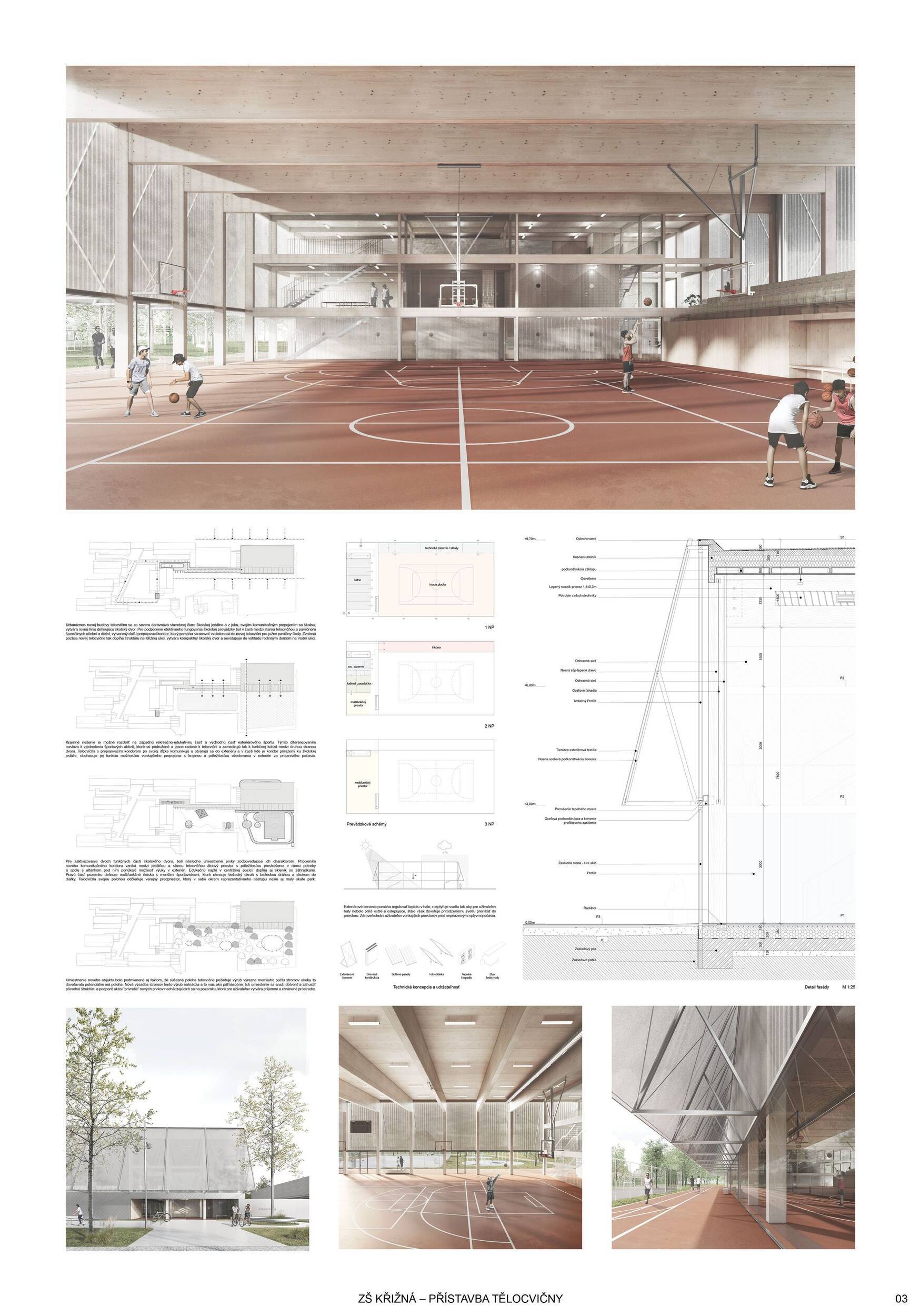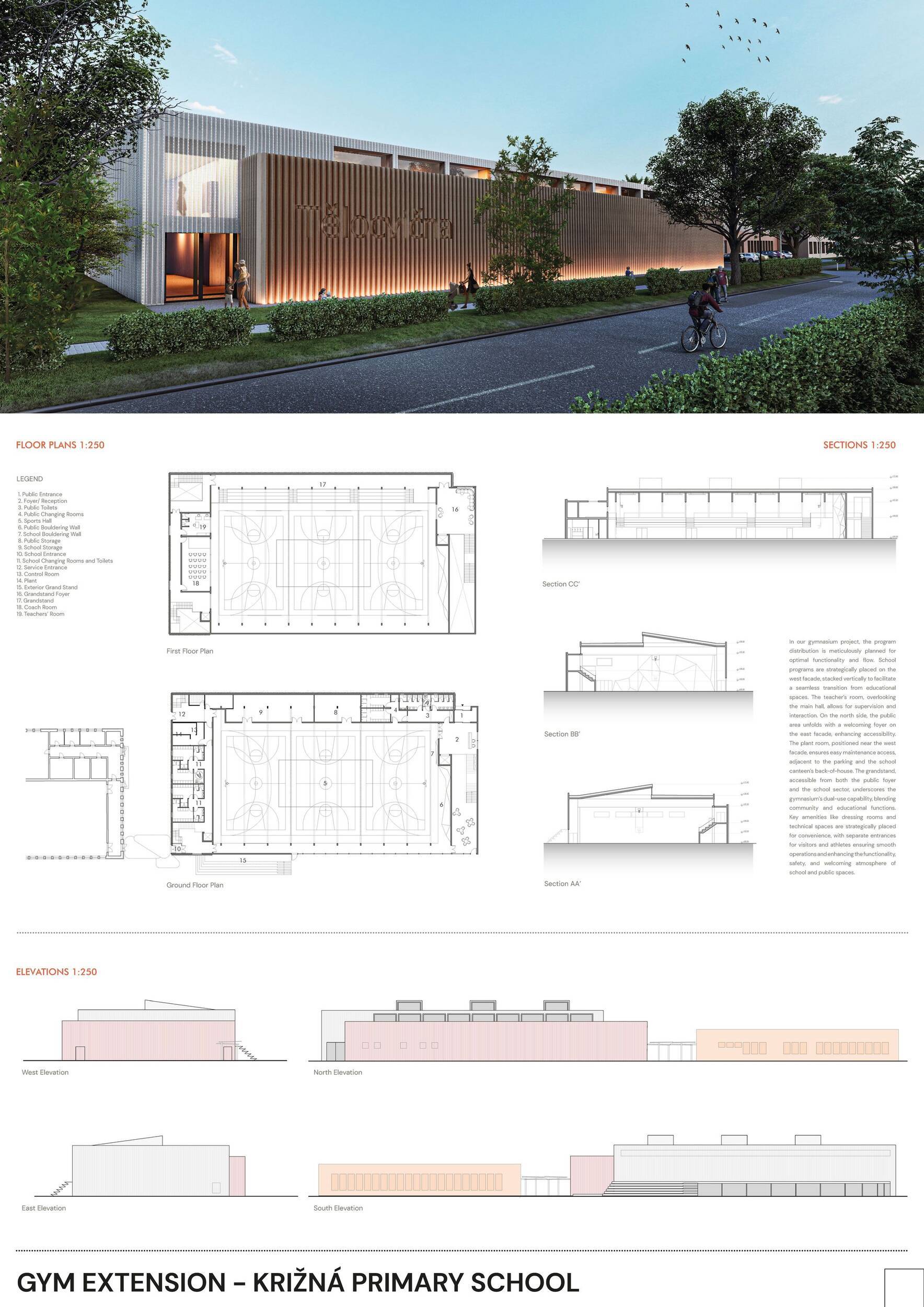 Návrh přináší změnu do celého areálu Základní školy Křižná. Umístěním sportovní haly přímo uprostřed dispozice vzniká široká paleta příležitostí a nových potenciálů, jak z poměrně zastaralé budovy s mnoha nepřehlednými koridory udělat funkční a moderní celek. Najednou vidíte jinou školu, která obstojí ve srovnání s novými budovami. Hlavním potenciálem návrhu je tak změna, která se nevyhýbá řešení stávajících problémů. Tento návrh dostavby tělocvičny jako jediný dokázal zachovat hřiště i zahradu se vzrostlými stromy a dává tímto rozhodnutím slušný prostor pro kultivované krajinářské řešení, které je v této fázi nabídnuto pouze v náznacích, které ovšem mají svou logiku. Návrh umožňuje i postupnou realizaci a je ke stávajícím stromům citlivý. Zpřístupnění střech je velice důležitou částí projektu a velká změna pro školu s doposud převládajícím vnitřním pohybem žáků. Dalším potenciálem návrhu je tak i práce se všemi koridory a zásadní zlepšení vnitřního prostředí pro žactvo, které se doposud pohybovalo v nepřehledných koridorech. Tato změna stávajícího stavu se logicky propíše do šaten, jídelny a může také lépe definovat vstup a vestibul školy. Umístění funkcí, jako je knihovna, počítačová učebna, družina, by mělo tuto změnu rovněž následovat a podpořit tak celkový koncept na vytvoření srdce Základní školy Křižná. Návrh má tak obrovskou přidanou hodnotu – do maximální míry využít a zlepšit stávající areál v moderní pulzující celek s kvalitním vnitřním i venkovním prostředím, které inspiruje budoucí generace.