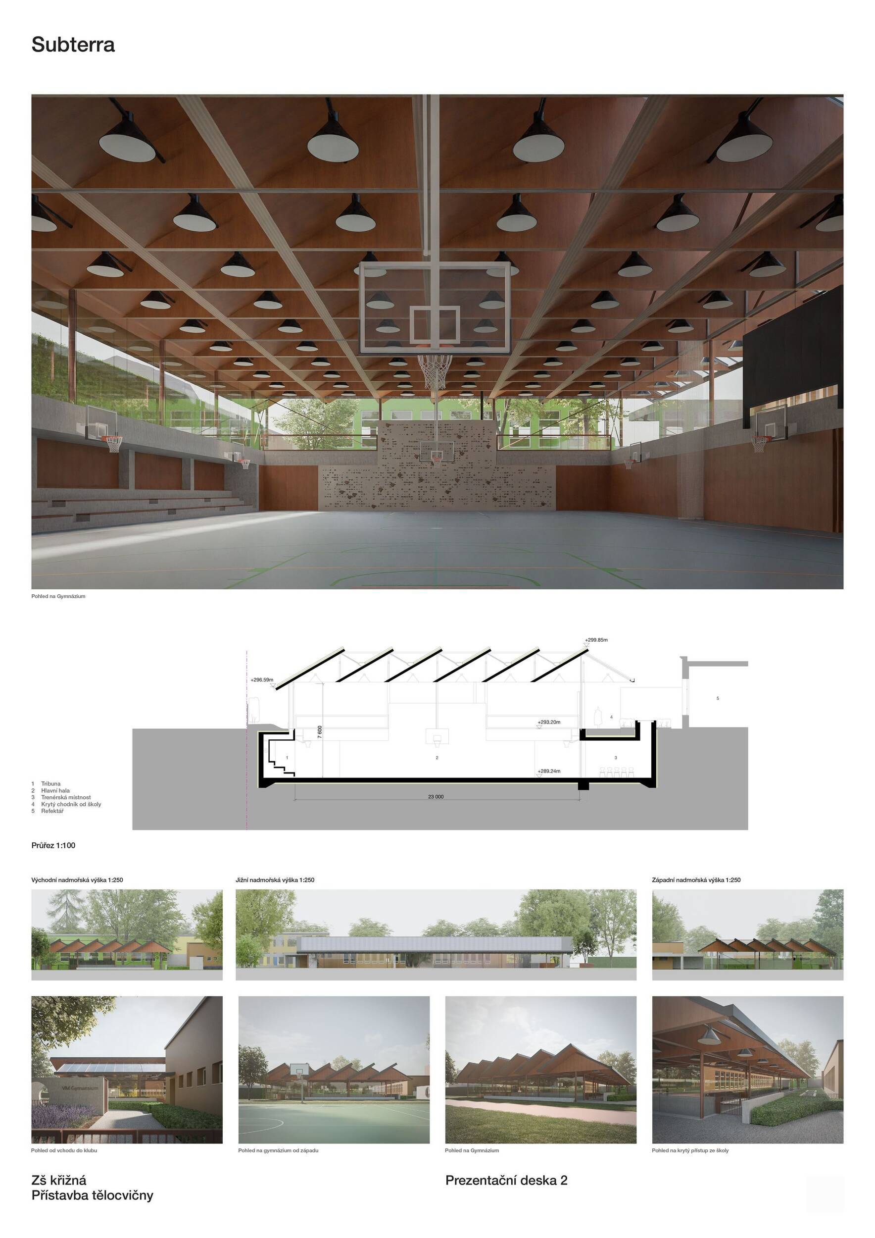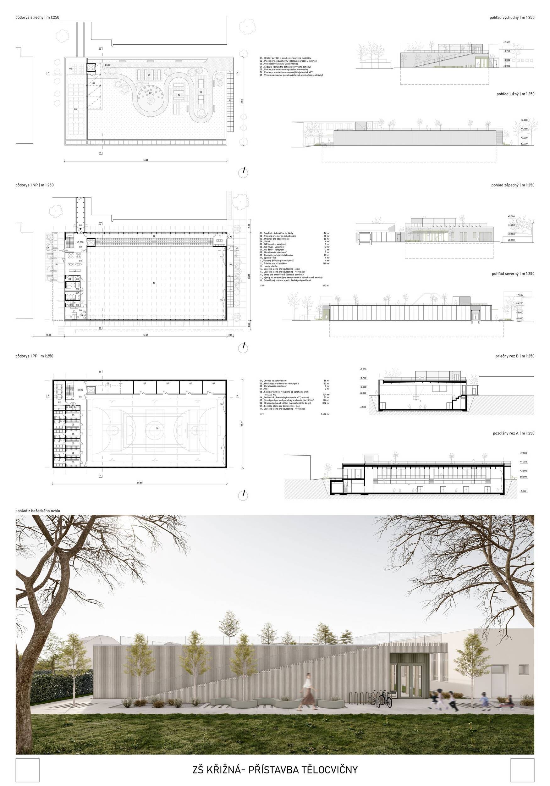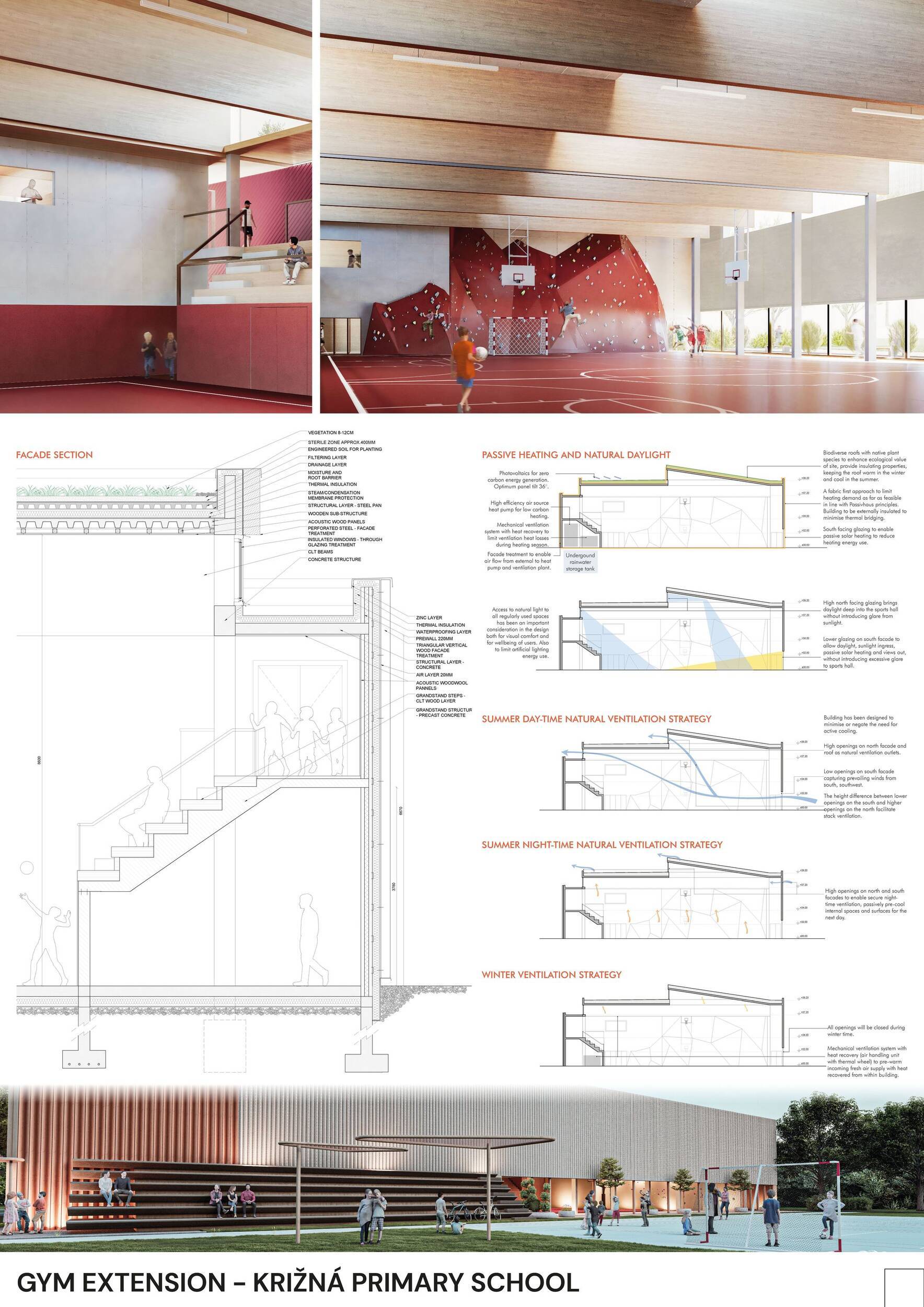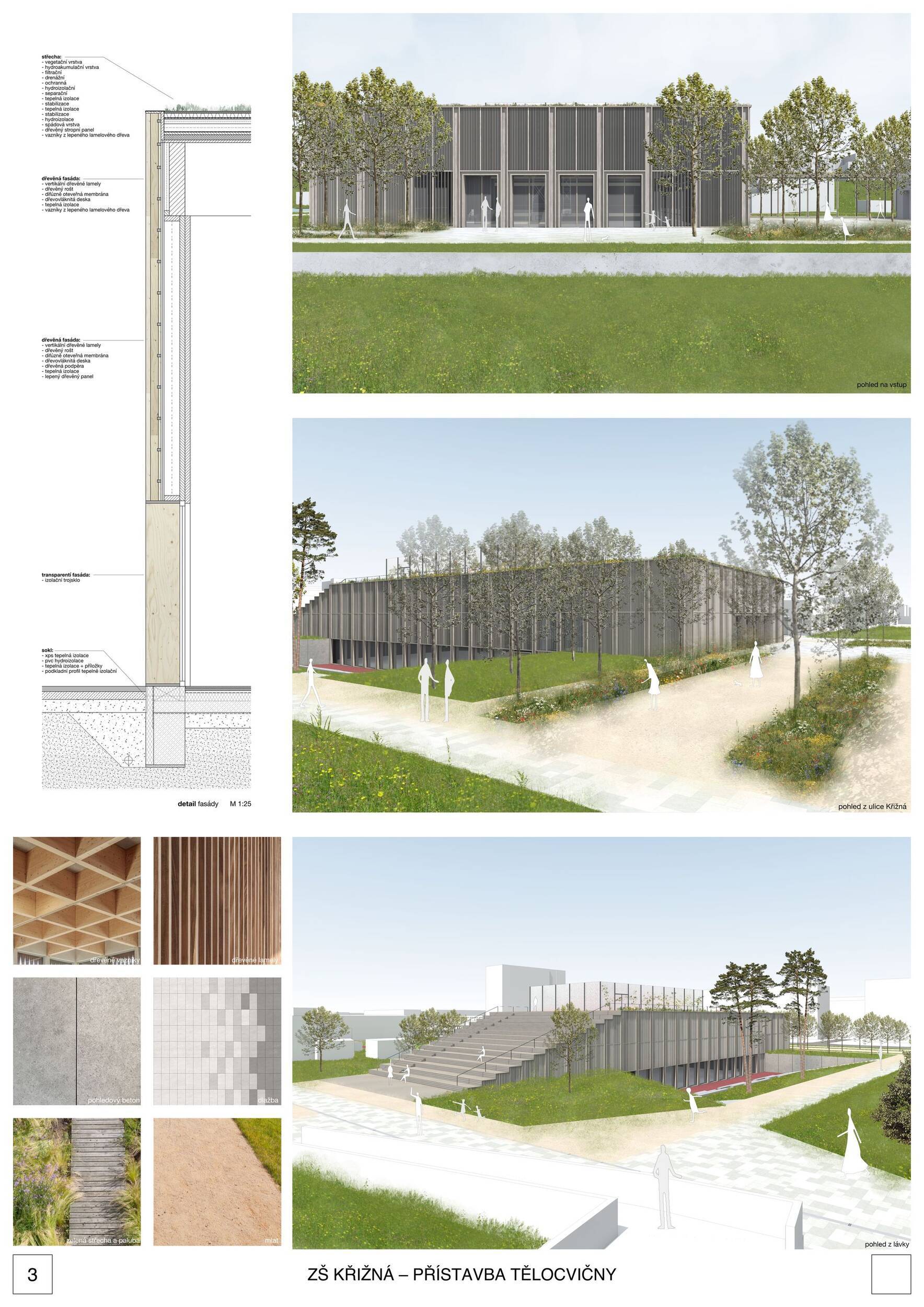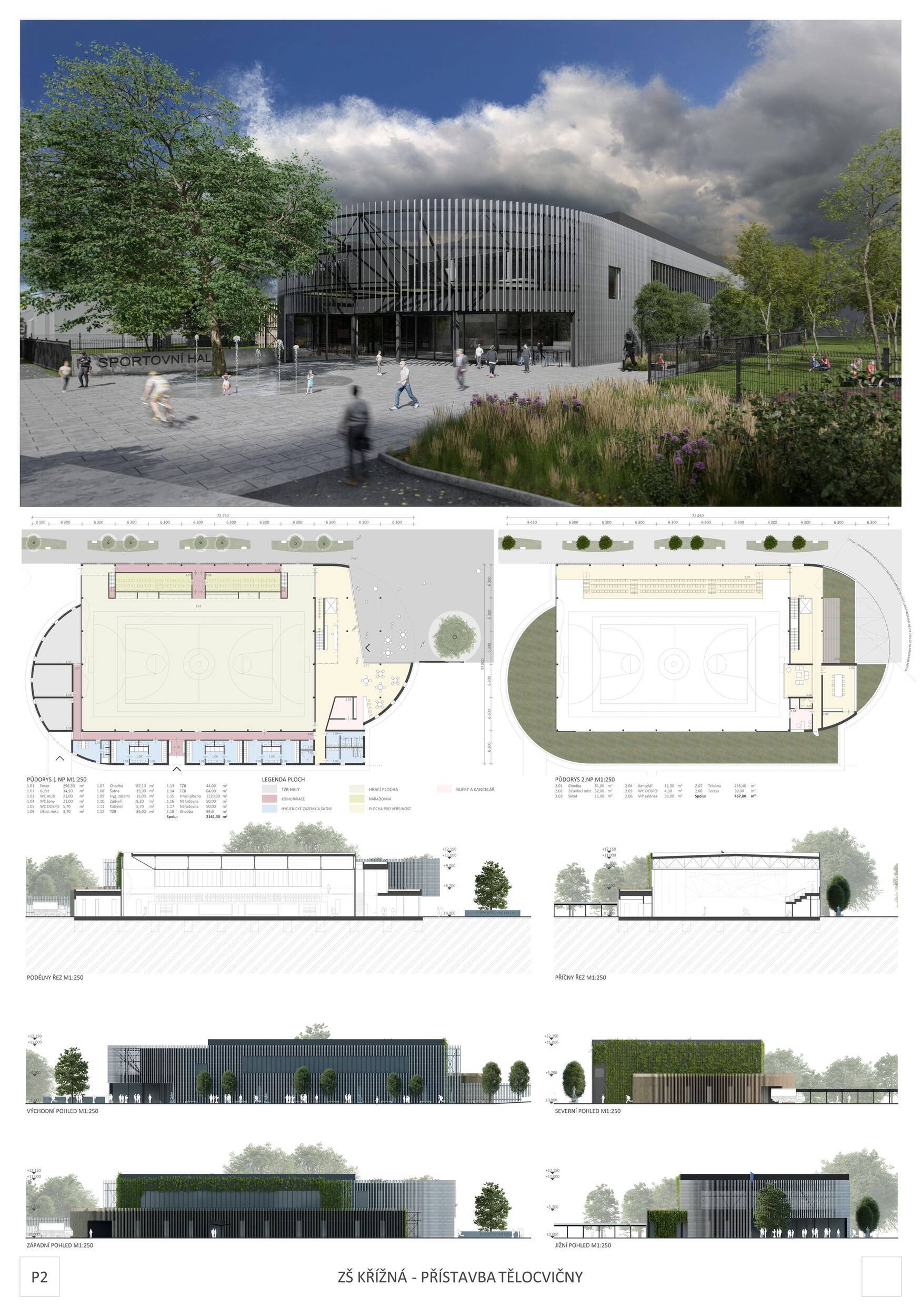 Návrh přináší změnu do celého areálu Základní školy Křižná. Umístěním sportovní haly přímo uprostřed dispozice vzniká široká paleta příležitostí a nových potenciálů, jak z poměrně zastaralé budovy s mnoha nepřehlednými koridory udělat funkční a moderní celek. Najednou vidíte jinou školu, která obstojí ve srovnání s novými budovami. Hlavním potenciálem návrhu je tak změna, která se nevyhýbá řešení stávajících problémů. Tento návrh dostavby tělocvičny jako jediný dokázal zachovat hřiště i zahradu se vzrostlými stromy a dává tímto rozhodnutím slušný prostor pro kultivované krajinářské řešení, které je v této fázi nabídnuto pouze v náznacích, které ovšem mají svou logiku. Návrh umožňuje i postupnou realizaci a je ke stávajícím stromům citlivý. Zpřístupnění střech je velice důležitou částí projektu a velká změna pro školu s doposud převládajícím vnitřním pohybem žáků. Dalším potenciálem návrhu je tak i práce se všemi koridory a zásadní zlepšení vnitřního prostředí pro žactvo, které se doposud pohybovalo v nepřehledných koridorech. Tato změna stávajícího stavu se logicky propíše do šaten, jídelny a může také lépe definovat vstup a vestibul školy. Umístění funkcí, jako je knihovna, počítačová učebna, družina, by mělo tuto změnu rovněž následovat a podpořit tak celkový koncept na vytvoření srdce Základní školy Křižná. Návrh má tak obrovskou přidanou hodnotu – do maximální míry využít a zlepšit stávající areál v moderní pulzující celek s kvalitním vnitřním i venkovním prostředím, které inspiruje budoucí generace.