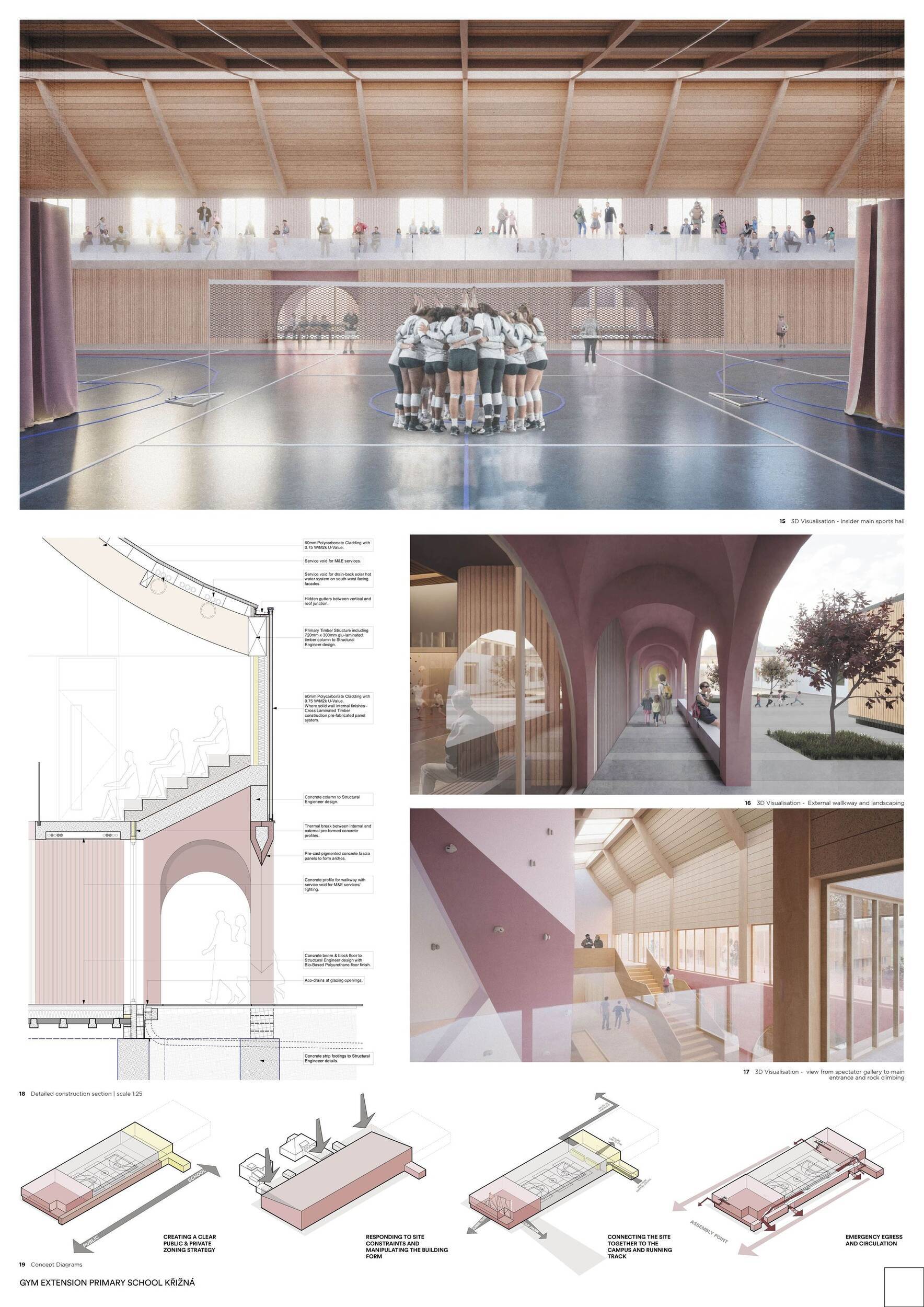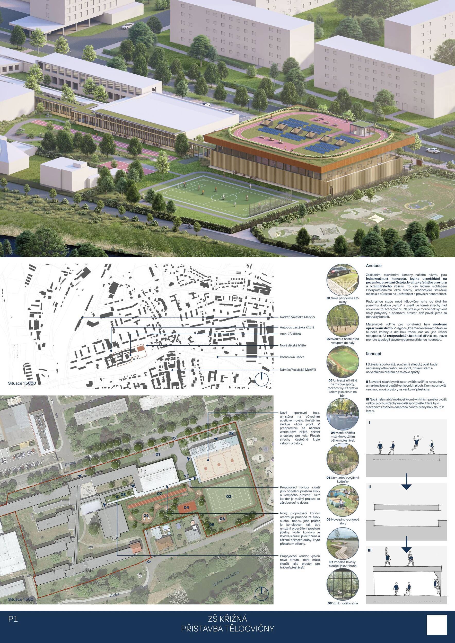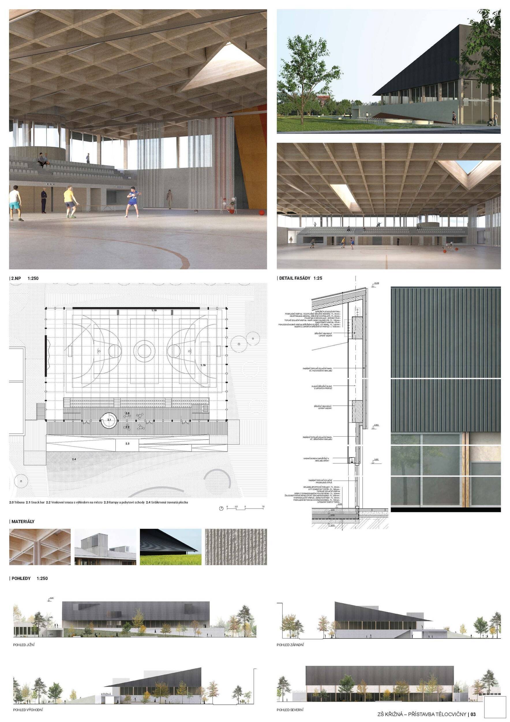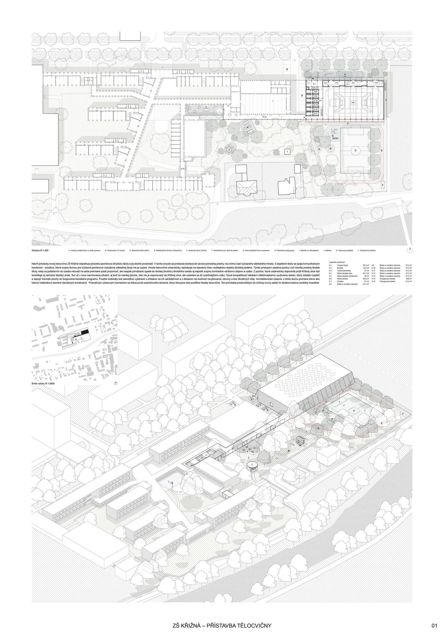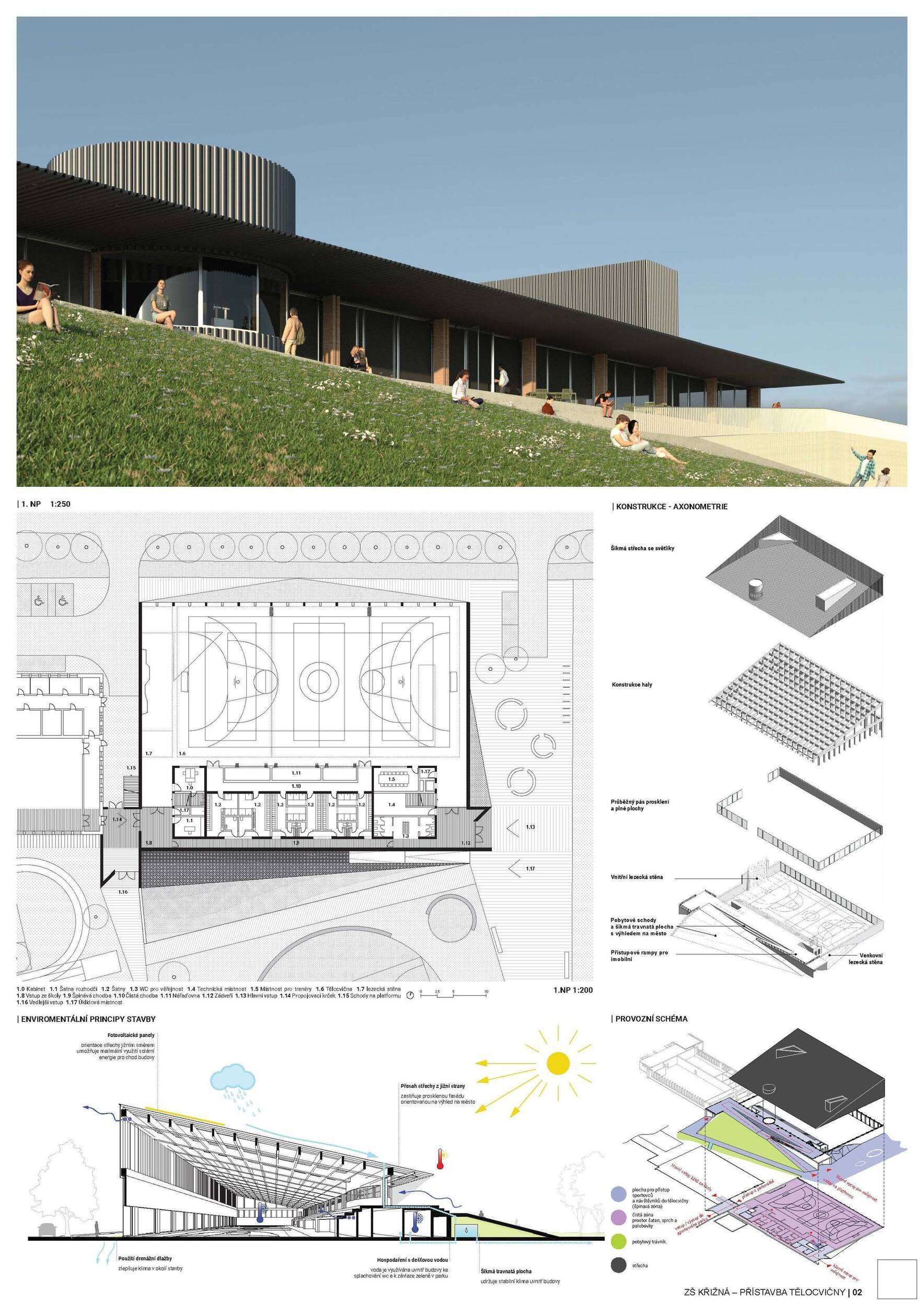 Návrh přináší změnu do celého areálu Základní školy Křižná. Umístěním sportovní haly přímo uprostřed dispozice vzniká široká paleta příležitostí a nových potenciálů, jak z poměrně zastaralé budovy s mnoha nepřehlednými koridory udělat funkční a moderní celek. Najednou vidíte jinou školu, která obstojí ve srovnání s novými budovami. Hlavním potenciálem návrhu je tak změna, která se nevyhýbá řešení stávajících problémů. Tento návrh dostavby tělocvičny jako jediný dokázal zachovat hřiště i zahradu se vzrostlými stromy a dává tímto rozhodnutím slušný prostor pro kultivované krajinářské řešení, které je v této fázi nabídnuto pouze v náznacích, které ovšem mají svou logiku. Návrh umožňuje i postupnou realizaci a je ke stávajícím stromům citlivý. Zpřístupnění střech je velice důležitou částí projektu a velká změna pro školu s doposud převládajícím vnitřním pohybem žáků. Dalším potenciálem návrhu je tak i práce se všemi koridory a zásadní zlepšení vnitřního prostředí pro žactvo, které se doposud pohybovalo v nepřehledných koridorech. Tato změna stávajícího stavu se logicky propíše do šaten, jídelny a může také lépe definovat vstup a vestibul školy. Umístění funkcí, jako je knihovna, počítačová učebna, družina, by mělo tuto změnu rovněž následovat a podpořit tak celkový koncept na vytvoření srdce Základní školy Křižná. Návrh má tak obrovskou přidanou hodnotu – do maximální míry využít a zlepšit stávající areál v moderní pulzující celek s kvalitním vnitřním i venkovním prostředím, které inspiruje budoucí generace.