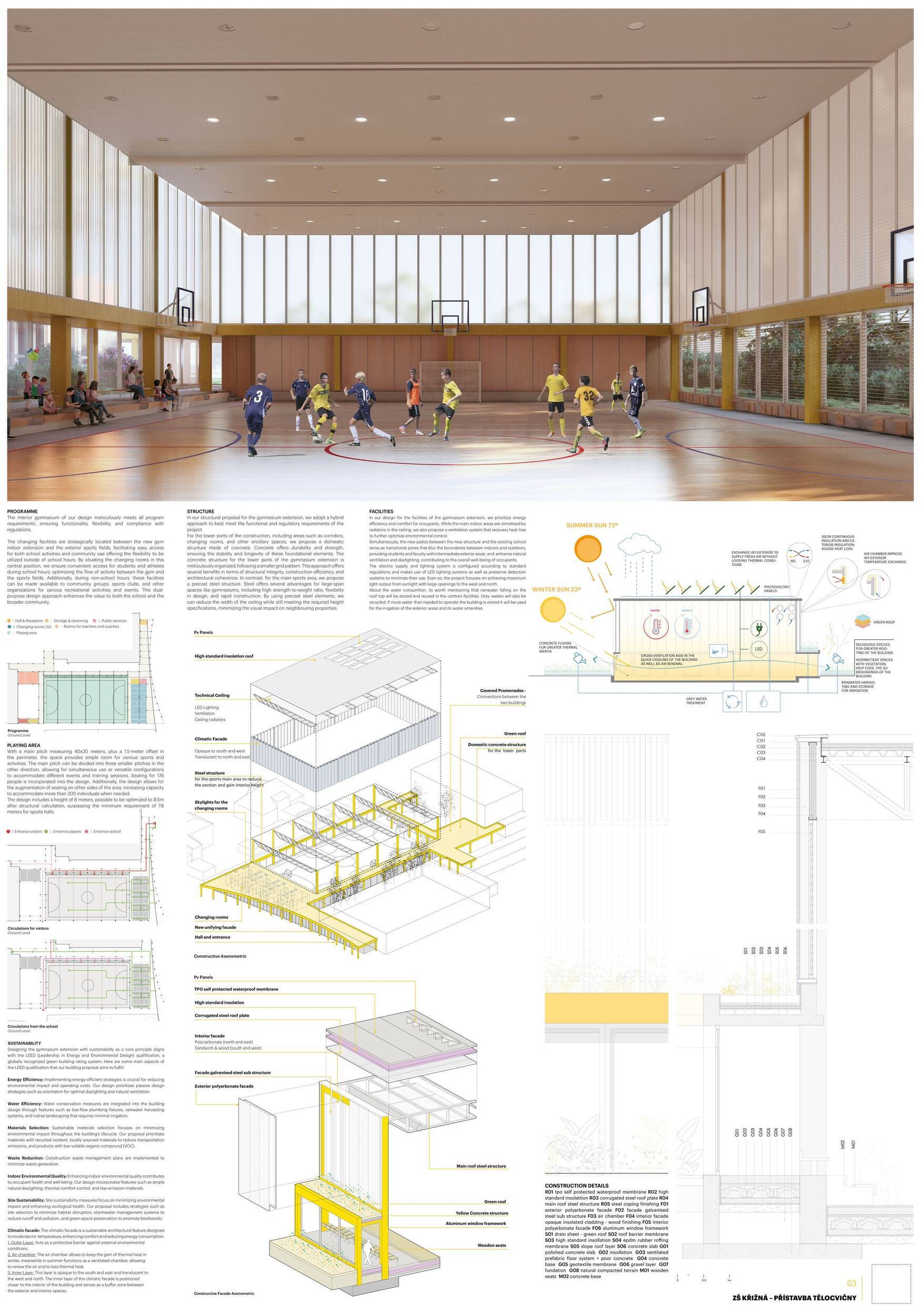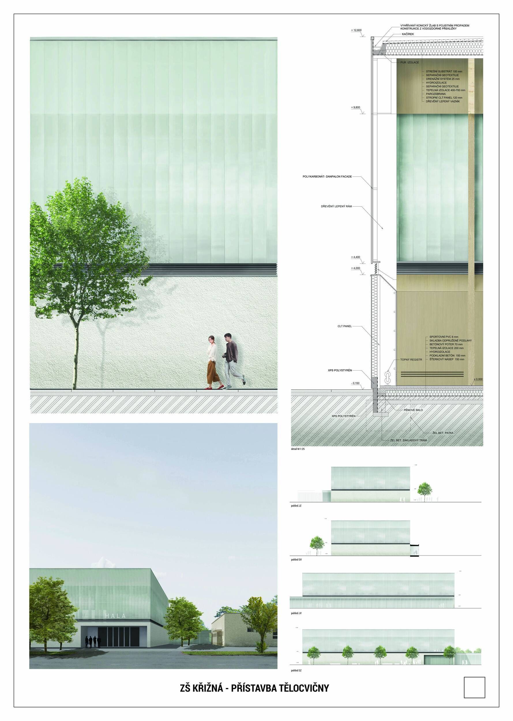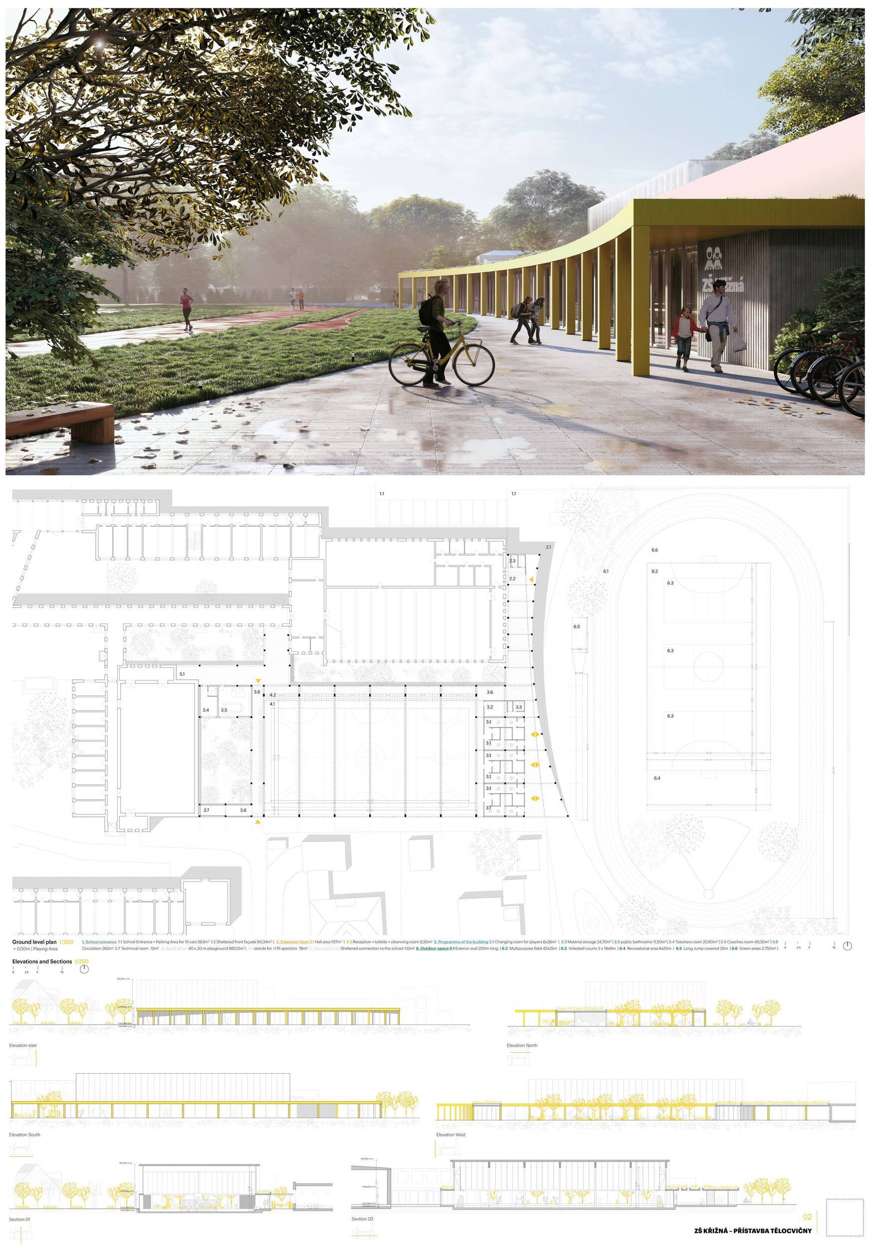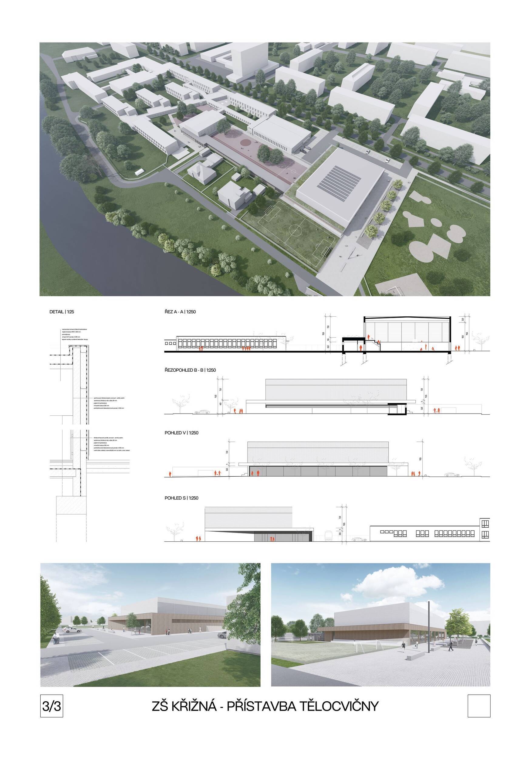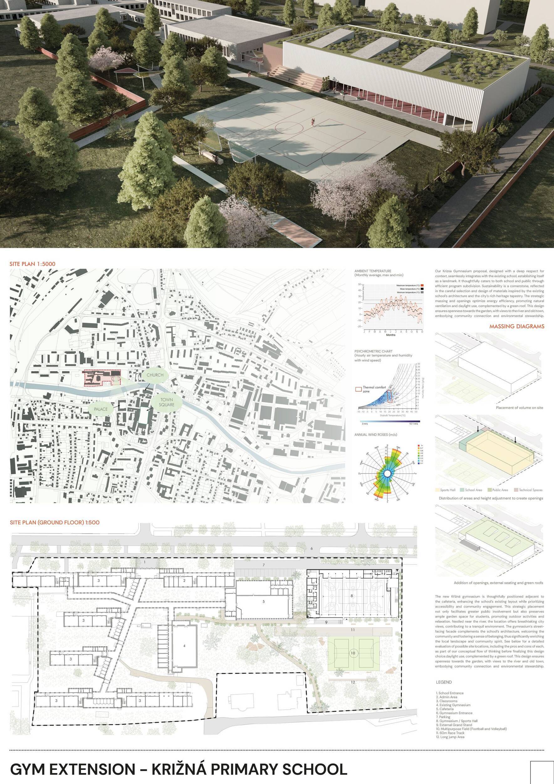 Návrh přináší změnu do celého areálu Základní školy Křižná. Umístěním sportovní haly přímo uprostřed dispozice vzniká široká paleta příležitostí a nových potenciálů, jak z poměrně zastaralé budovy s mnoha nepřehlednými koridory udělat funkční a moderní celek. Najednou vidíte jinou školu, která obstojí ve srovnání s novými budovami. Hlavním potenciálem návrhu je tak změna, která se nevyhýbá řešení stávajících problémů. Tento návrh dostavby tělocvičny jako jediný dokázal zachovat hřiště i zahradu se vzrostlými stromy a dává tímto rozhodnutím slušný prostor pro kultivované krajinářské řešení, které je v této fázi nabídnuto pouze v náznacích, které ovšem mají svou logiku. Návrh umožňuje i postupnou realizaci a je ke stávajícím stromům citlivý. Zpřístupnění střech je velice důležitou částí projektu a velká změna pro školu s doposud převládajícím vnitřním pohybem žáků. Dalším potenciálem návrhu je tak i práce se všemi koridory a zásadní zlepšení vnitřního prostředí pro žactvo, které se doposud pohybovalo v nepřehledných koridorech. Tato změna stávajícího stavu se logicky propíše do šaten, jídelny a může také lépe definovat vstup a vestibul školy. Umístění funkcí, jako je knihovna, počítačová učebna, družina, by mělo tuto změnu rovněž následovat a podpořit tak celkový koncept na vytvoření srdce Základní školy Křižná. Návrh má tak obrovskou přidanou hodnotu – do maximální míry využít a zlepšit stávající areál v moderní pulzující celek s kvalitním vnitřním i venkovním prostředím, které inspiruje budoucí generace.