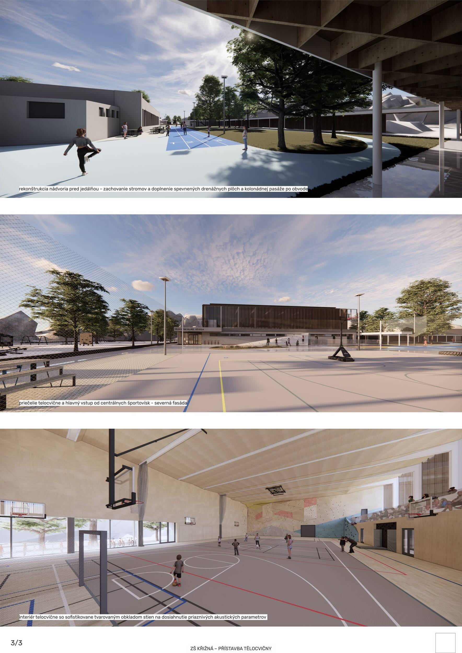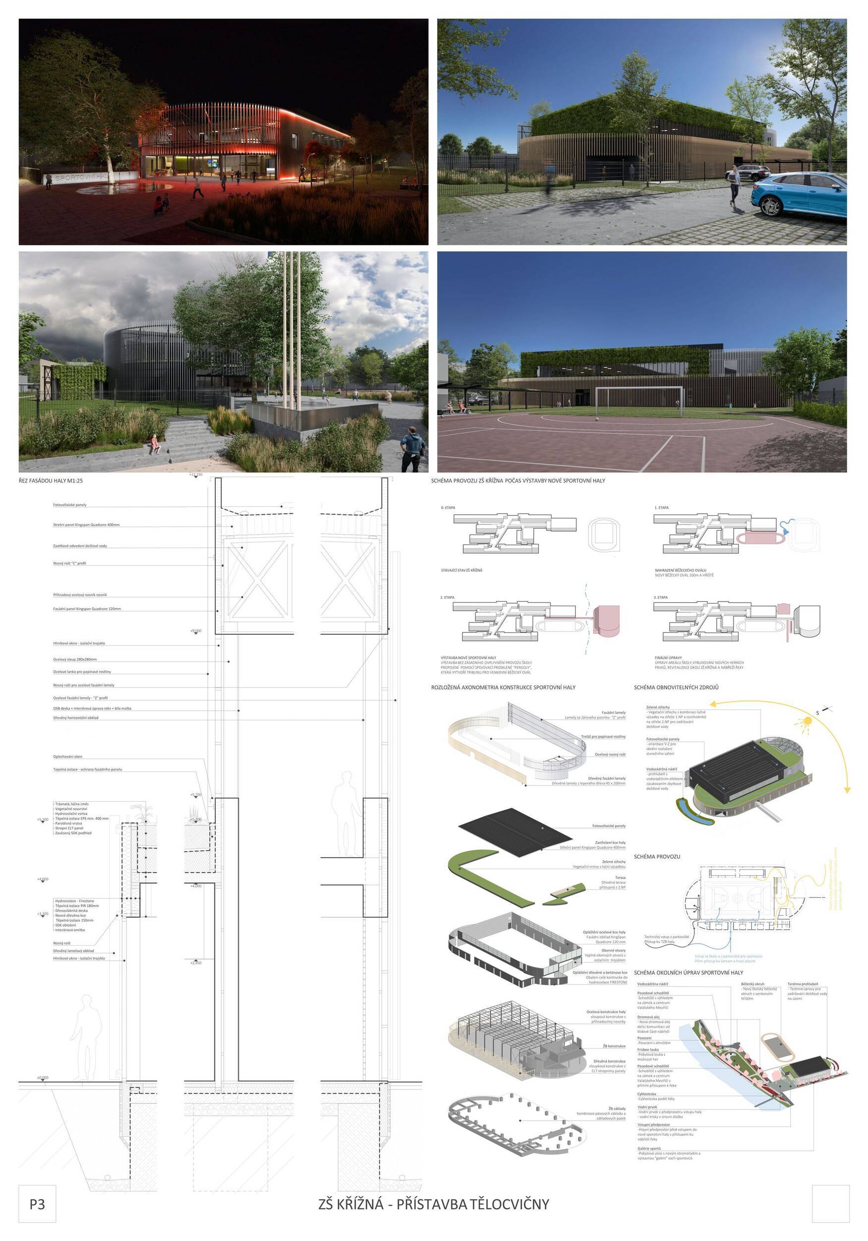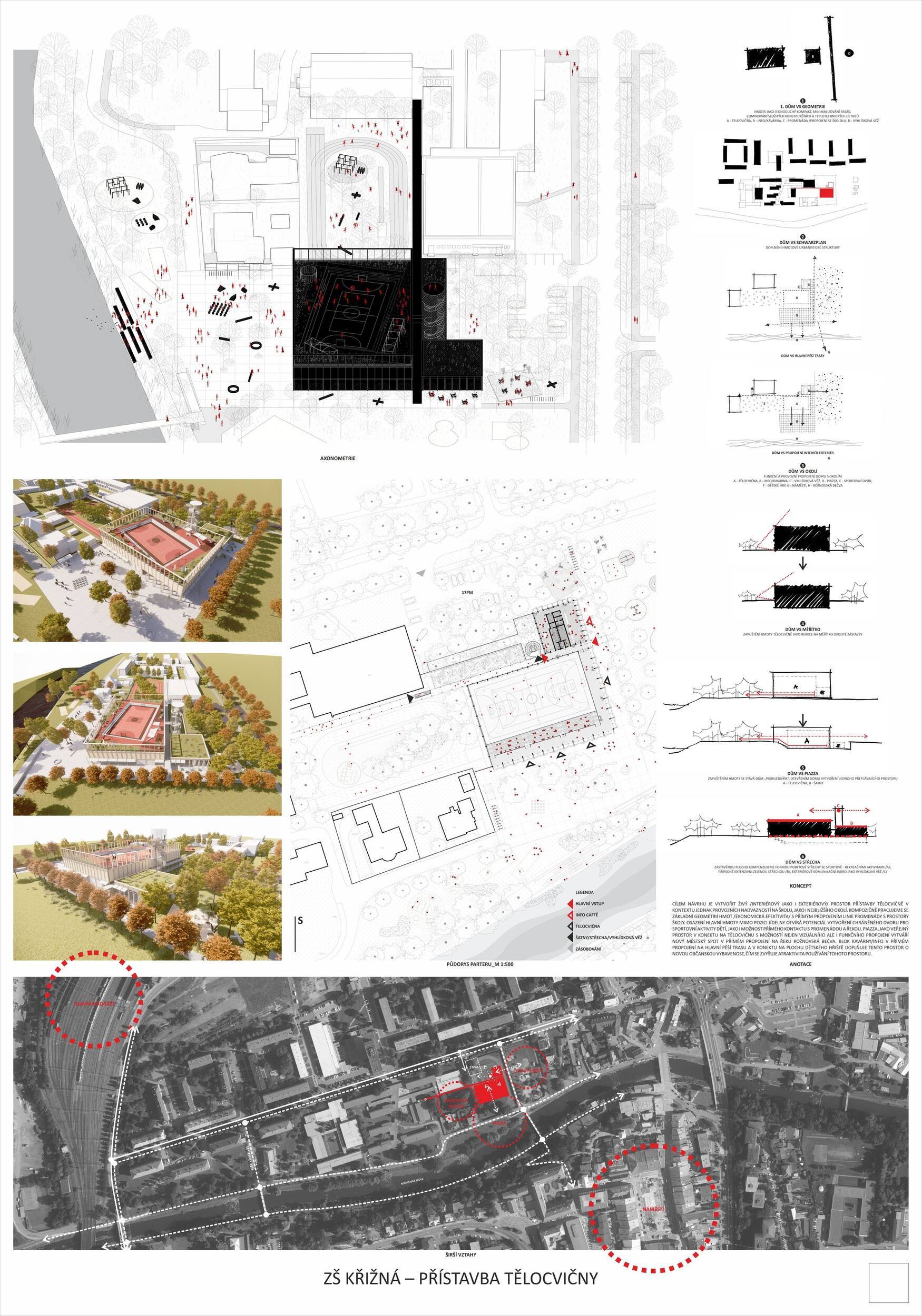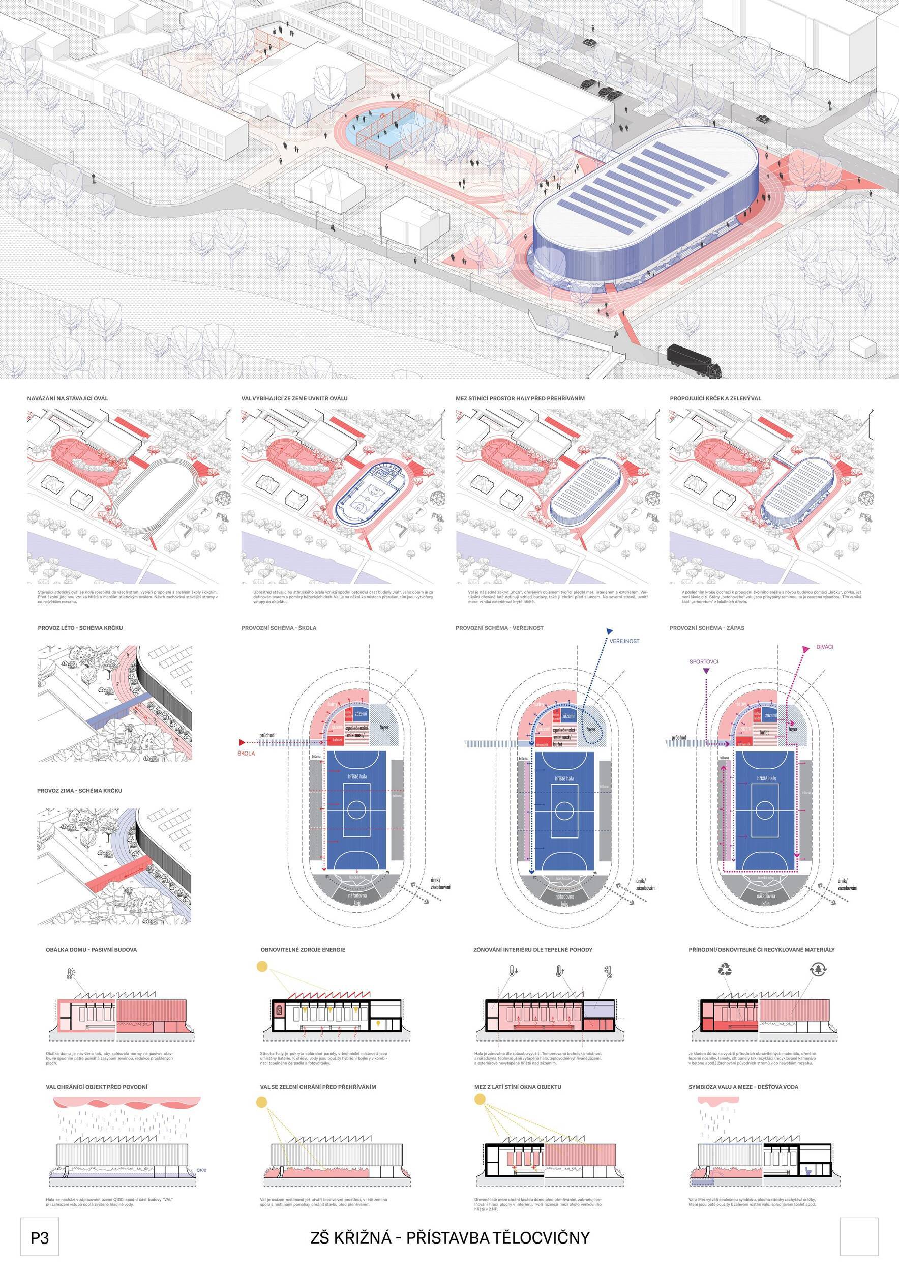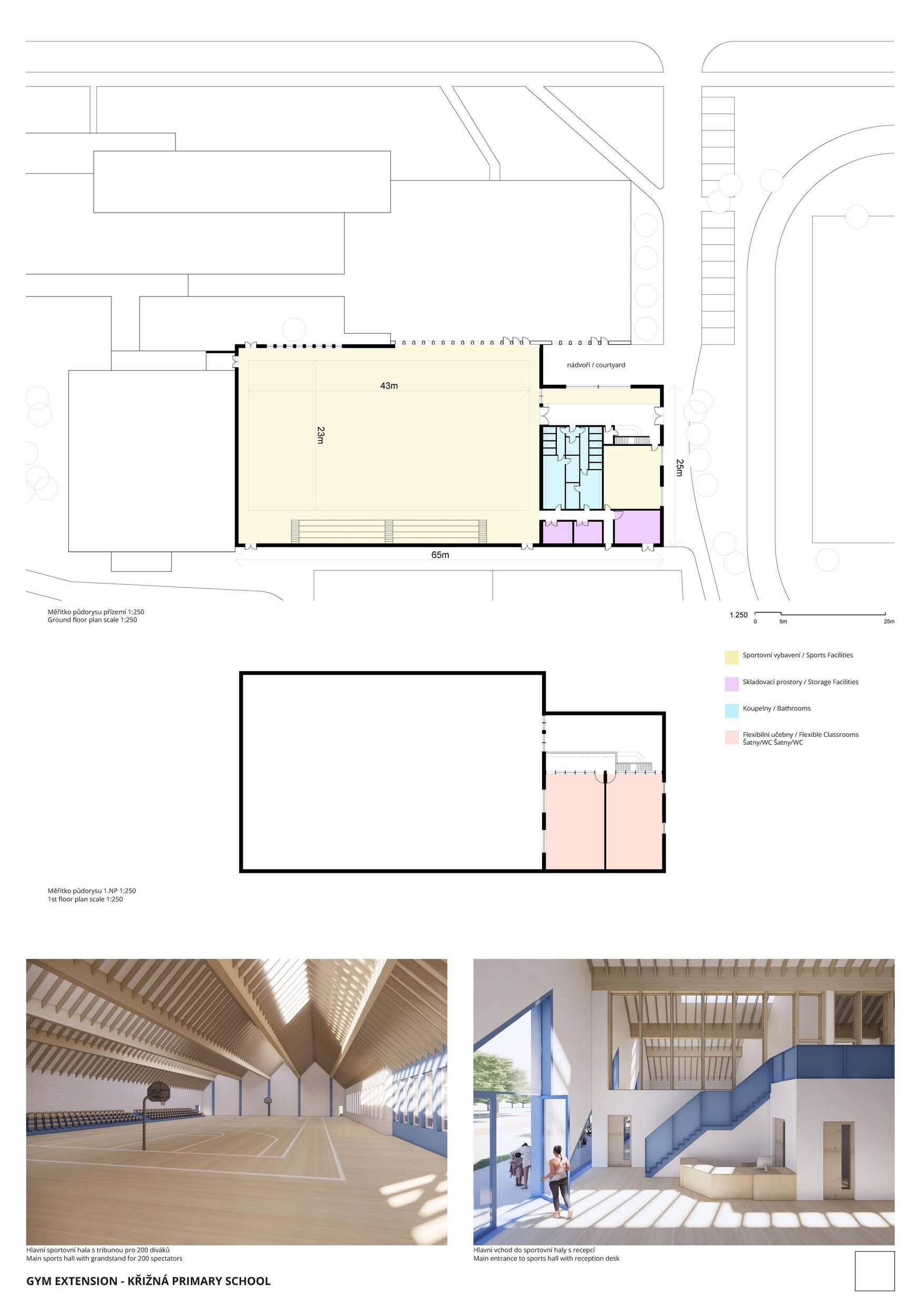 Návrh přináší změnu do celého areálu Základní školy Křižná. Umístěním sportovní haly přímo uprostřed dispozice vzniká široká paleta příležitostí a nových potenciálů, jak z poměrně zastaralé budovy s mnoha nepřehlednými koridory udělat funkční a moderní celek. Najednou vidíte jinou školu, která obstojí ve srovnání s novými budovami. Hlavním potenciálem návrhu je tak změna, která se nevyhýbá řešení stávajících problémů. Tento návrh dostavby tělocvičny jako jediný dokázal zachovat hřiště i zahradu se vzrostlými stromy a dává tímto rozhodnutím slušný prostor pro kultivované krajinářské řešení, které je v této fázi nabídnuto pouze v náznacích, které ovšem mají svou logiku. Návrh umožňuje i postupnou realizaci a je ke stávajícím stromům citlivý. Zpřístupnění střech je velice důležitou částí projektu a velká změna pro školu s doposud převládajícím vnitřním pohybem žáků. Dalším potenciálem návrhu je tak i práce se všemi koridory a zásadní zlepšení vnitřního prostředí pro žactvo, které se doposud pohybovalo v nepřehledných koridorech. Tato změna stávajícího stavu se logicky propíše do šaten, jídelny a může také lépe definovat vstup a vestibul školy. Umístění funkcí, jako je knihovna, počítačová učebna, družina, by mělo tuto změnu rovněž následovat a podpořit tak celkový koncept na vytvoření srdce Základní školy Křižná. Návrh má tak obrovskou přidanou hodnotu – do maximální míry využít a zlepšit stávající areál v moderní pulzující celek s kvalitním vnitřním i venkovním prostředím, které inspiruje budoucí generace.