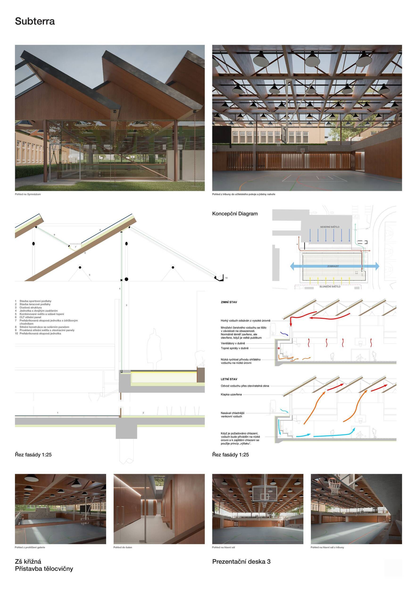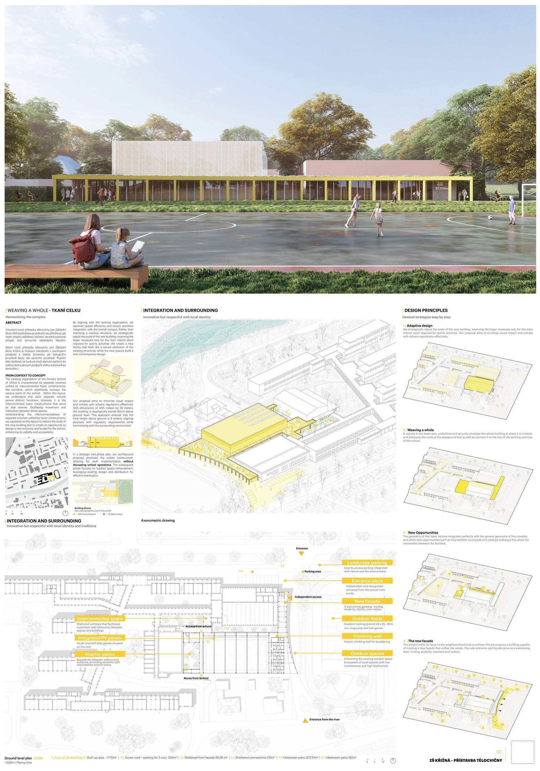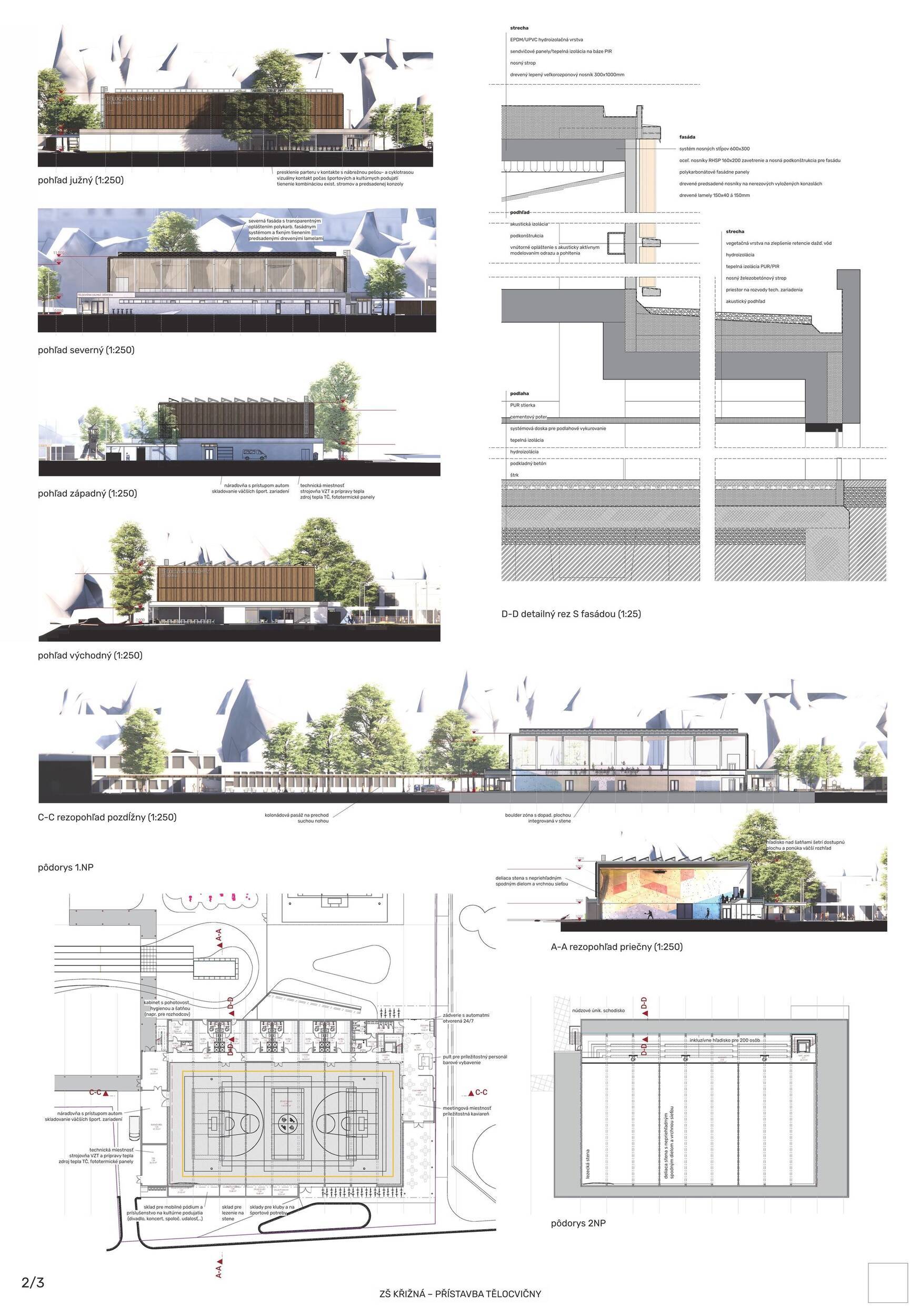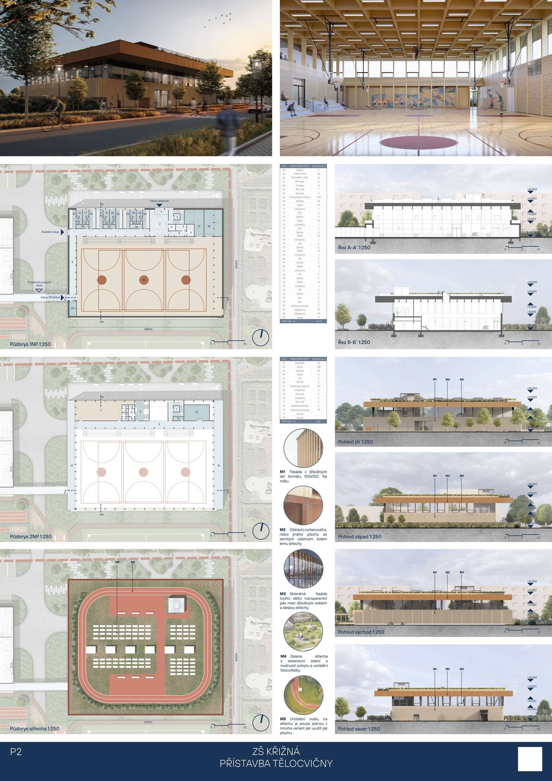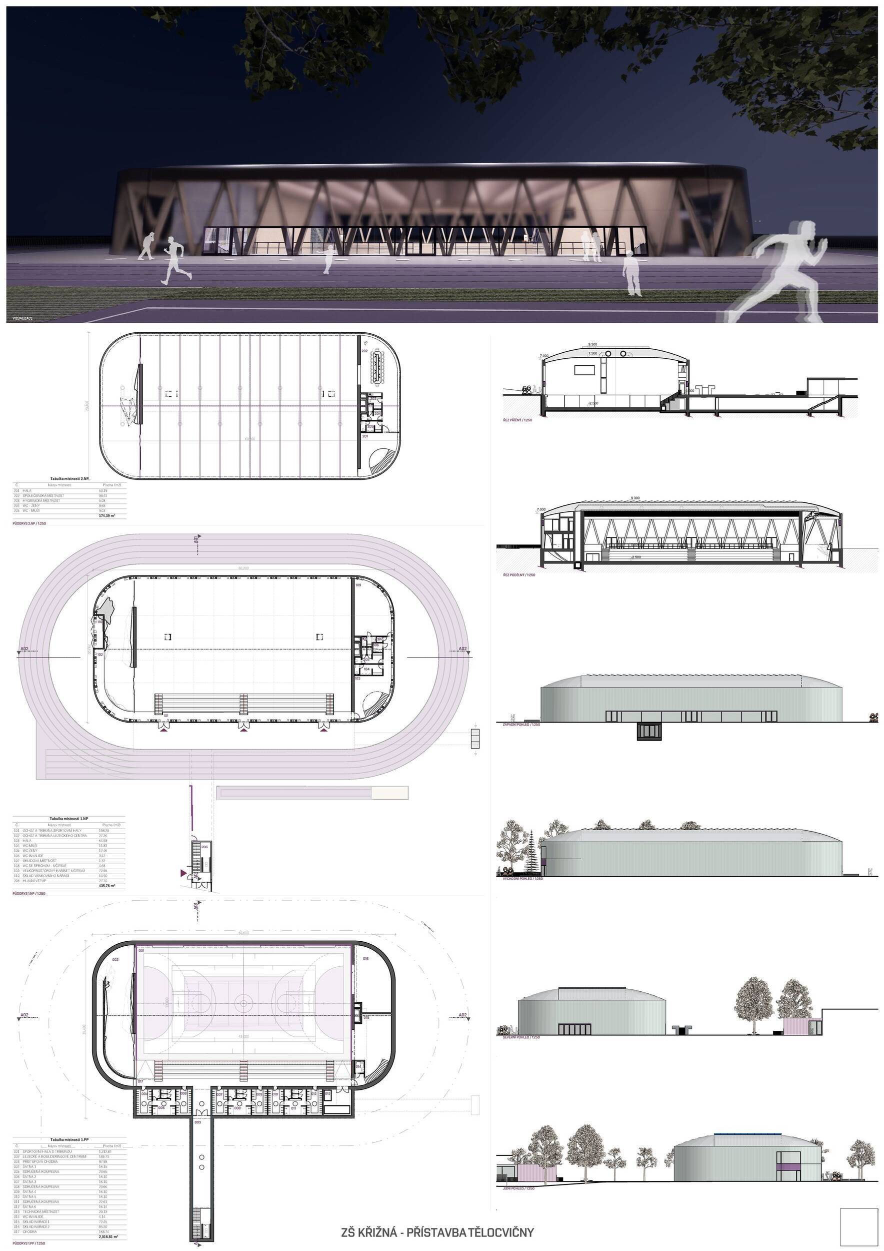 Návrh přináší změnu do celého areálu Základní školy Křižná. Umístěním sportovní haly přímo uprostřed dispozice vzniká široká paleta příležitostí a nových potenciálů, jak z poměrně zastaralé budovy s mnoha nepřehlednými koridory udělat funkční a moderní celek. Najednou vidíte jinou školu, která obstojí ve srovnání s novými budovami. Hlavním potenciálem návrhu je tak změna, která se nevyhýbá řešení stávajících problémů. Tento návrh dostavby tělocvičny jako jediný dokázal zachovat hřiště i zahradu se vzrostlými stromy a dává tímto rozhodnutím slušný prostor pro kultivované krajinářské řešení, které je v této fázi nabídnuto pouze v náznacích, které ovšem mají svou logiku. Návrh umožňuje i postupnou realizaci a je ke stávajícím stromům citlivý. Zpřístupnění střech je velice důležitou částí projektu a velká změna pro školu s doposud převládajícím vnitřním pohybem žáků. Dalším potenciálem návrhu je tak i práce se všemi koridory a zásadní zlepšení vnitřního prostředí pro žactvo, které se doposud pohybovalo v nepřehledných koridorech. Tato změna stávajícího stavu se logicky propíše do šaten, jídelny a může také lépe definovat vstup a vestibul školy. Umístění funkcí, jako je knihovna, počítačová učebna, družina, by mělo tuto změnu rovněž následovat a podpořit tak celkový koncept na vytvoření srdce Základní školy Křižná. Návrh má tak obrovskou přidanou hodnotu – do maximální míry využít a zlepšit stávající areál v moderní pulzující celek s kvalitním vnitřním i venkovním prostředím, které inspiruje budoucí generace.