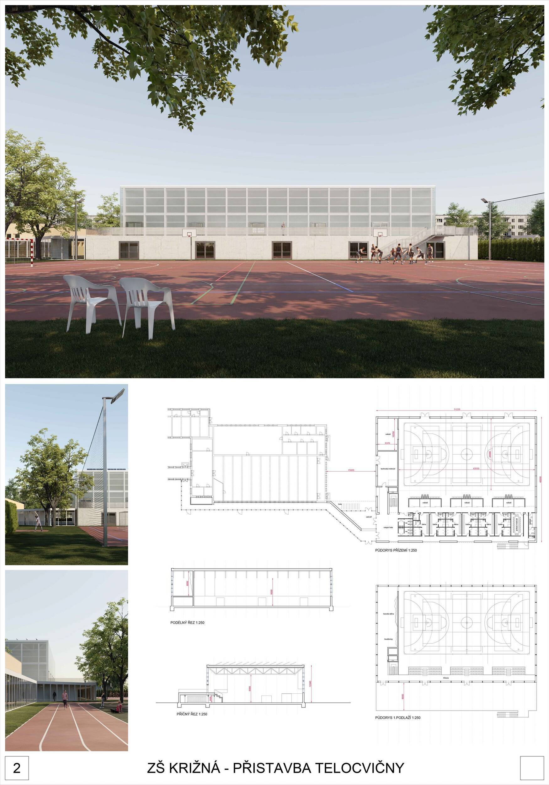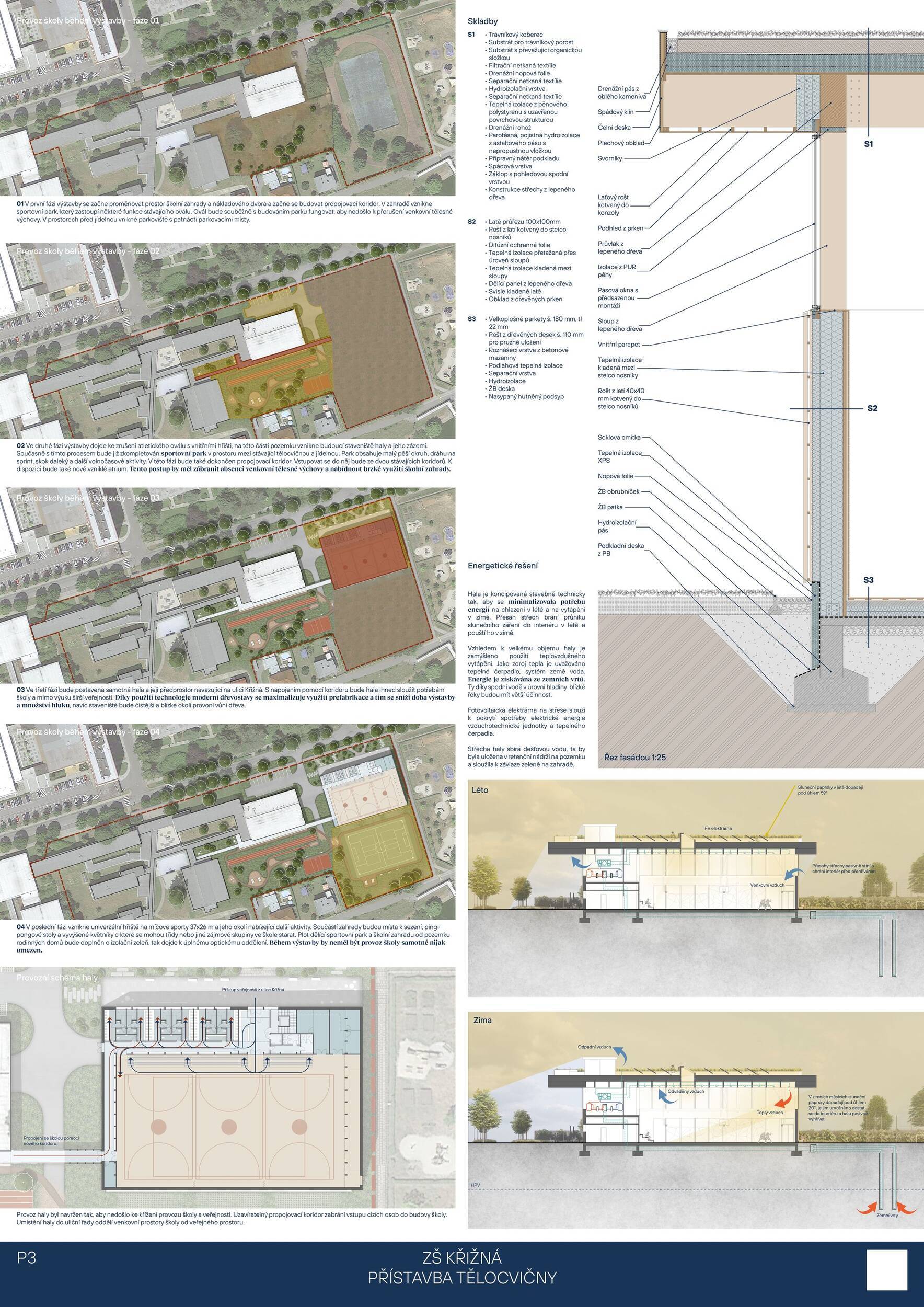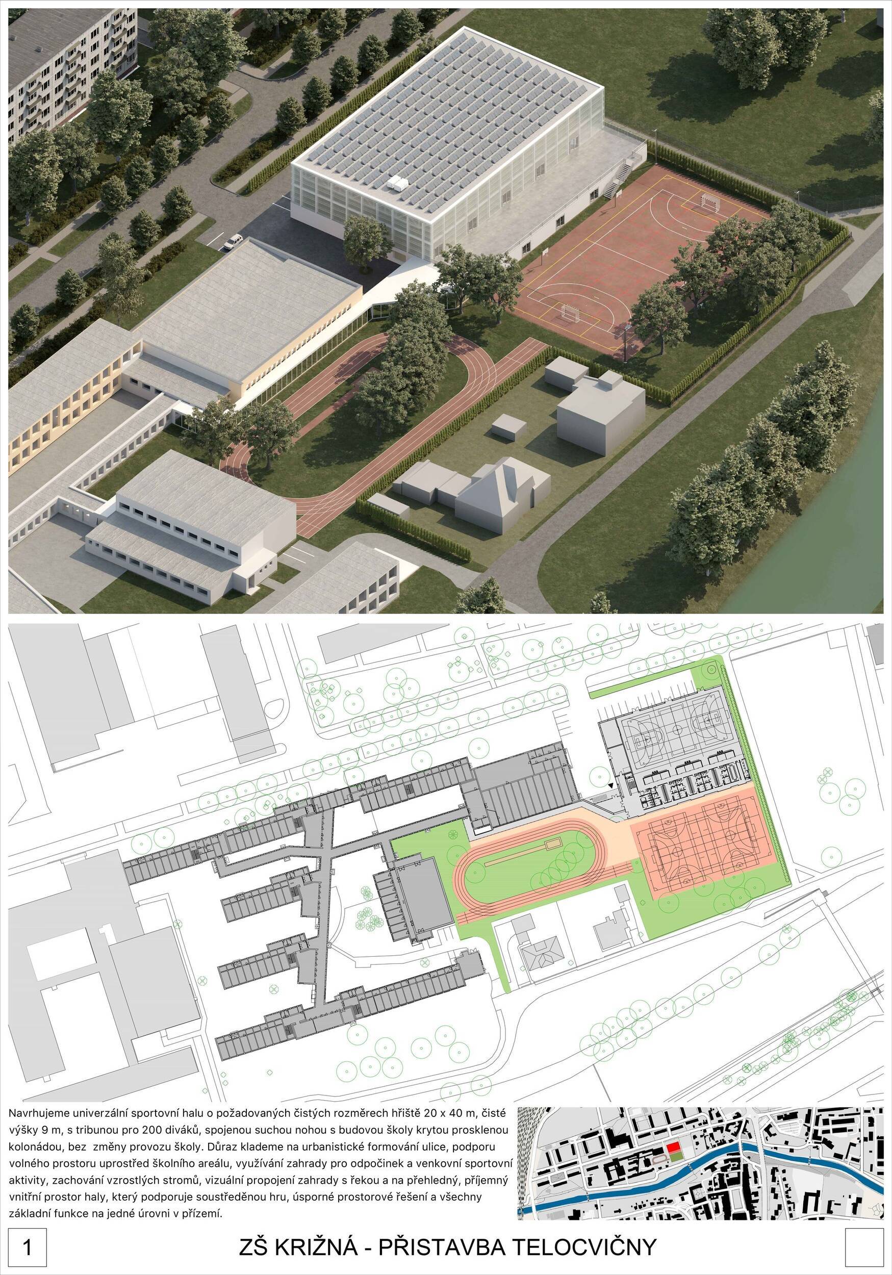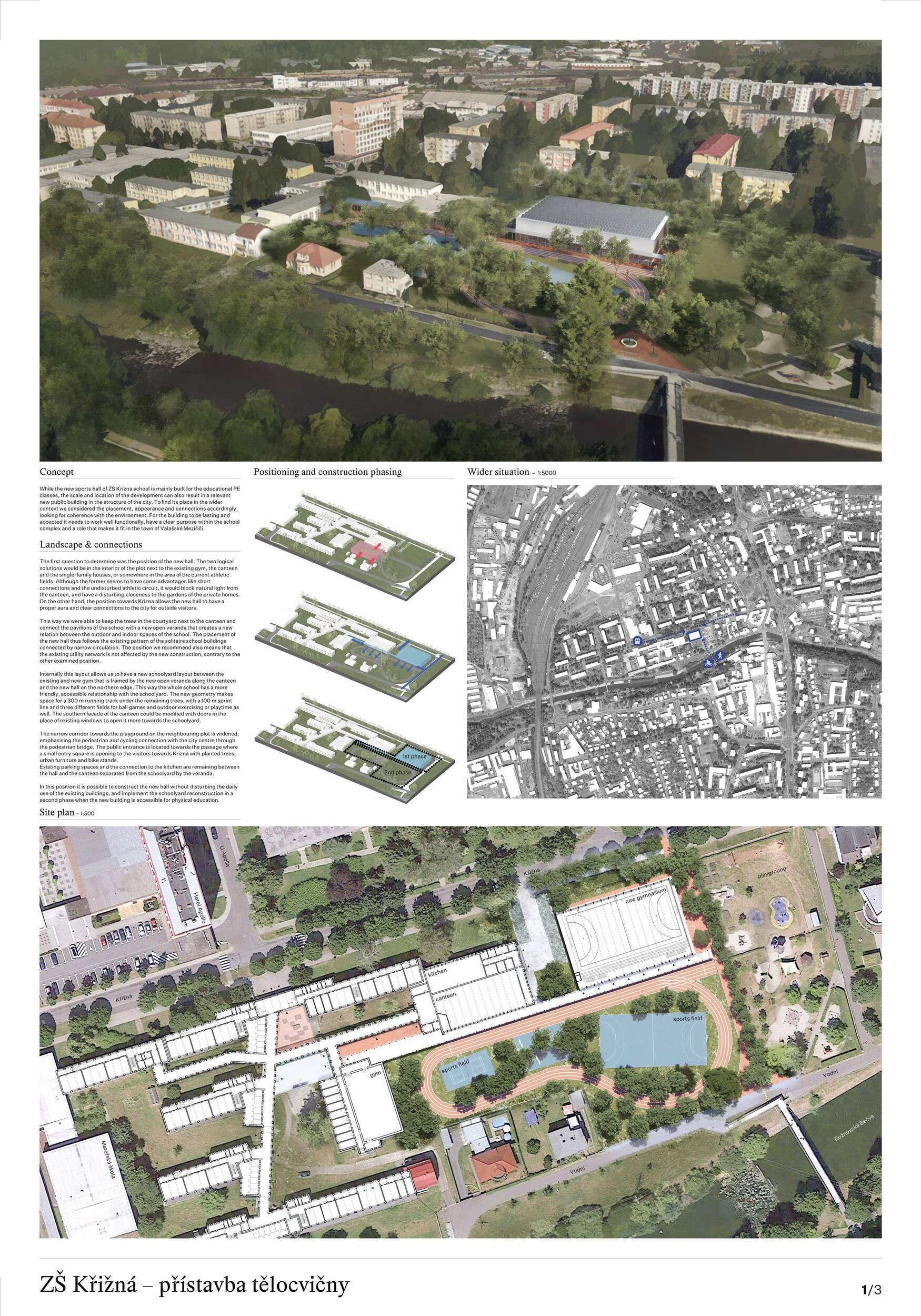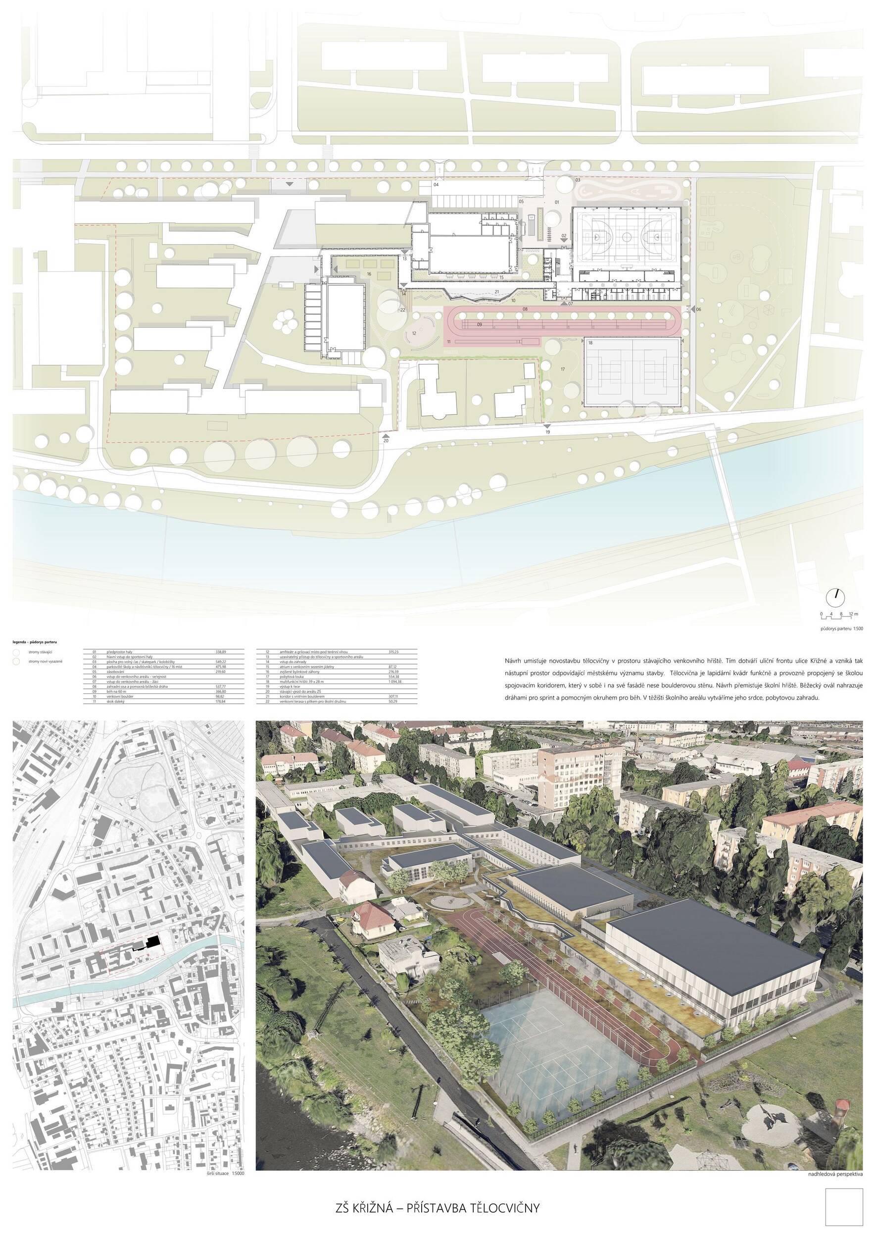 Návrh umisťuje objekt sportovní haly do pozice za jídelnou. Toto umístění bylo voleno často, protože zachovává krajinářsky důležitý prostor se vzrostlými stromy před jídelnou a novou sportovní halou. Přináší však s sebou problém, jak nový objekt napojit „suchou nohou“ na stávající budovy školy. Jeho řešení je v tomto projektu elegantní - prosklenou arkádou, která je ladně napojena na hmotu tělocvičny. Porota vysoce cení vizuální i funkční propojení vnitřní sportovní plochy s venkovní sportovní plochou, která na objekt přímo navazuje. Tímto propojením vzniká vynikající sportovně funkční prostředí. Návrh harmonicky pracuje se stávajícími i nově navrženými stromy a vytváří příjemný venkovní prostor. Autoři se rozhodli objekt nezapustit do země a zároveň navrhli sportovní halu s minimální doporučenou výškou. Tato dvě rozhodnutí vedou k hmotově a technicky ekonomickému řešení, které je dle názoru poroty vhodnou odpovědí na zadání. Porota vysoce hodnotí čistotu návrhu konstrukce tvořené kombinací štíhlých betonových sloupů a dřevěných nosníků jako hlavního konstrukčního prvku. Pochybnosti u poroty vzbudila jižní fasáda, která působí lehce a krásně, ale nepřesvědčivě ve smyslu dostatečného zastínění. Druhou pochybností poroty byl vztah navrhované stavby k ulici Křižná, kde je sice logicky umístěn hlavní vstup do budovy pro veřejnost, ale zbytek fasády je slepá stěna šaten. Je to cena, kterou autoři platí za rozhodnutí šatny nezapouštět pod zem.