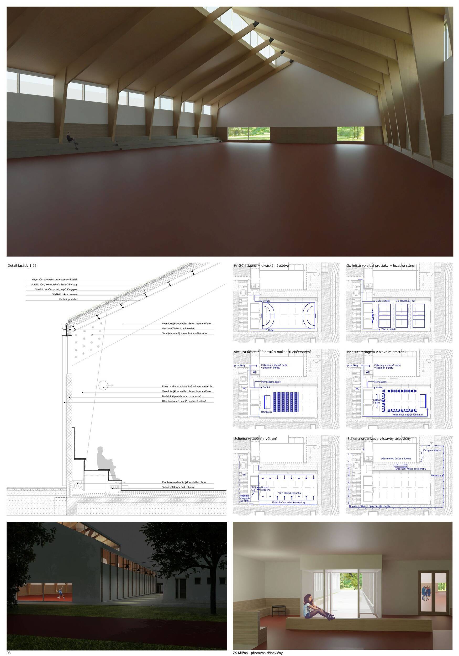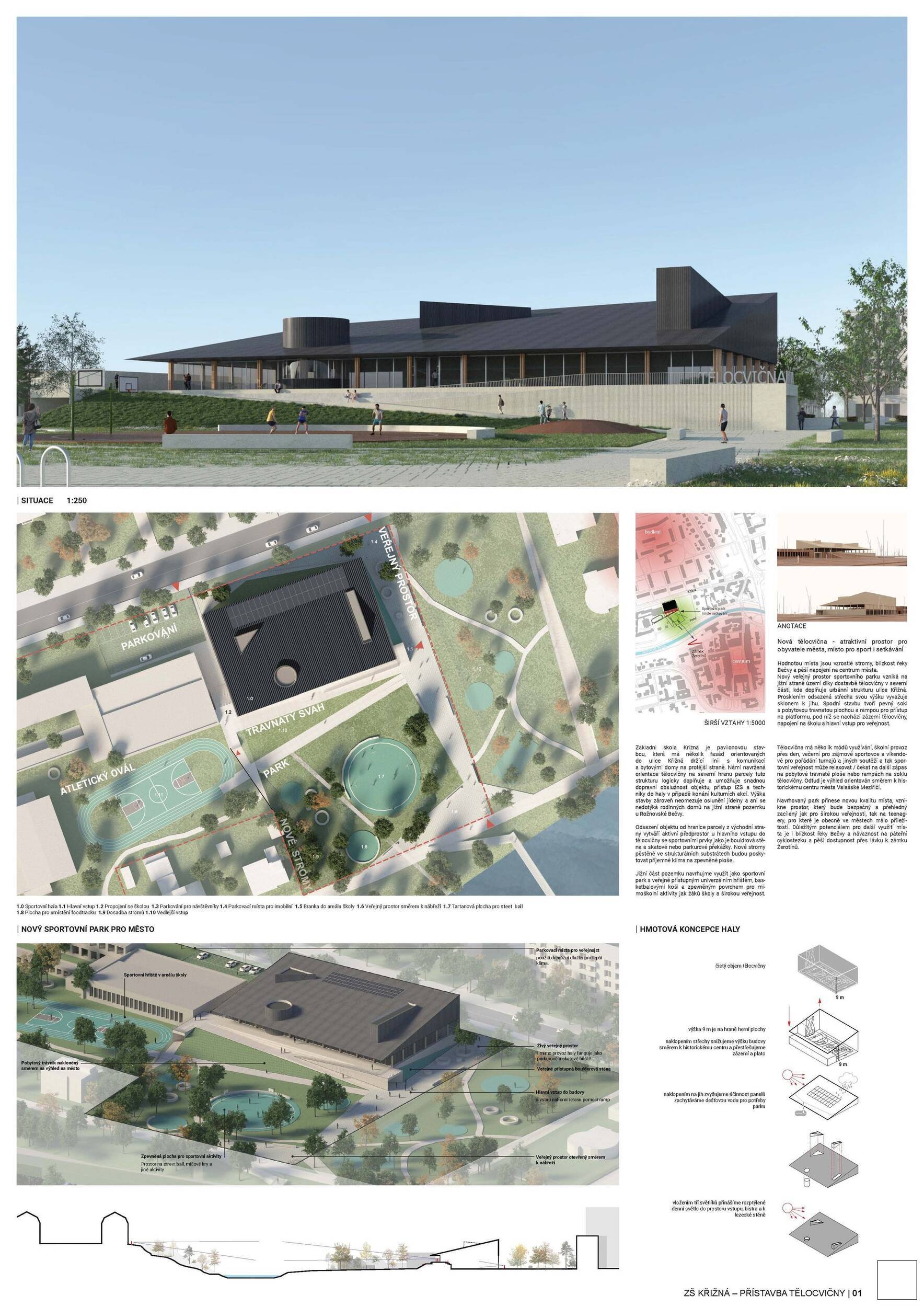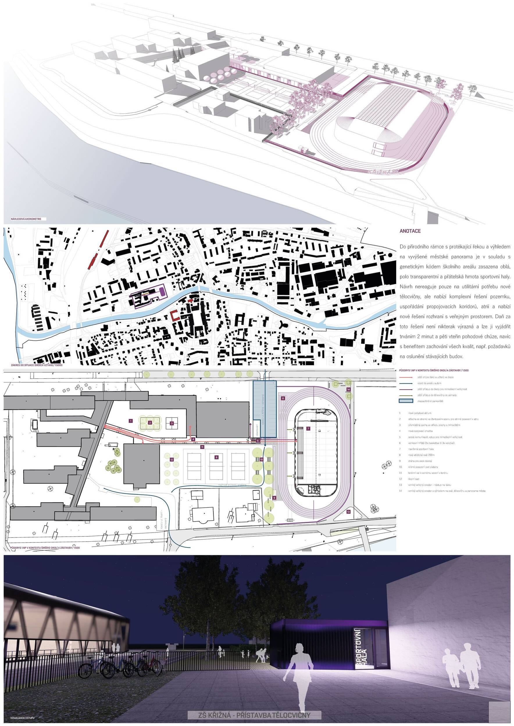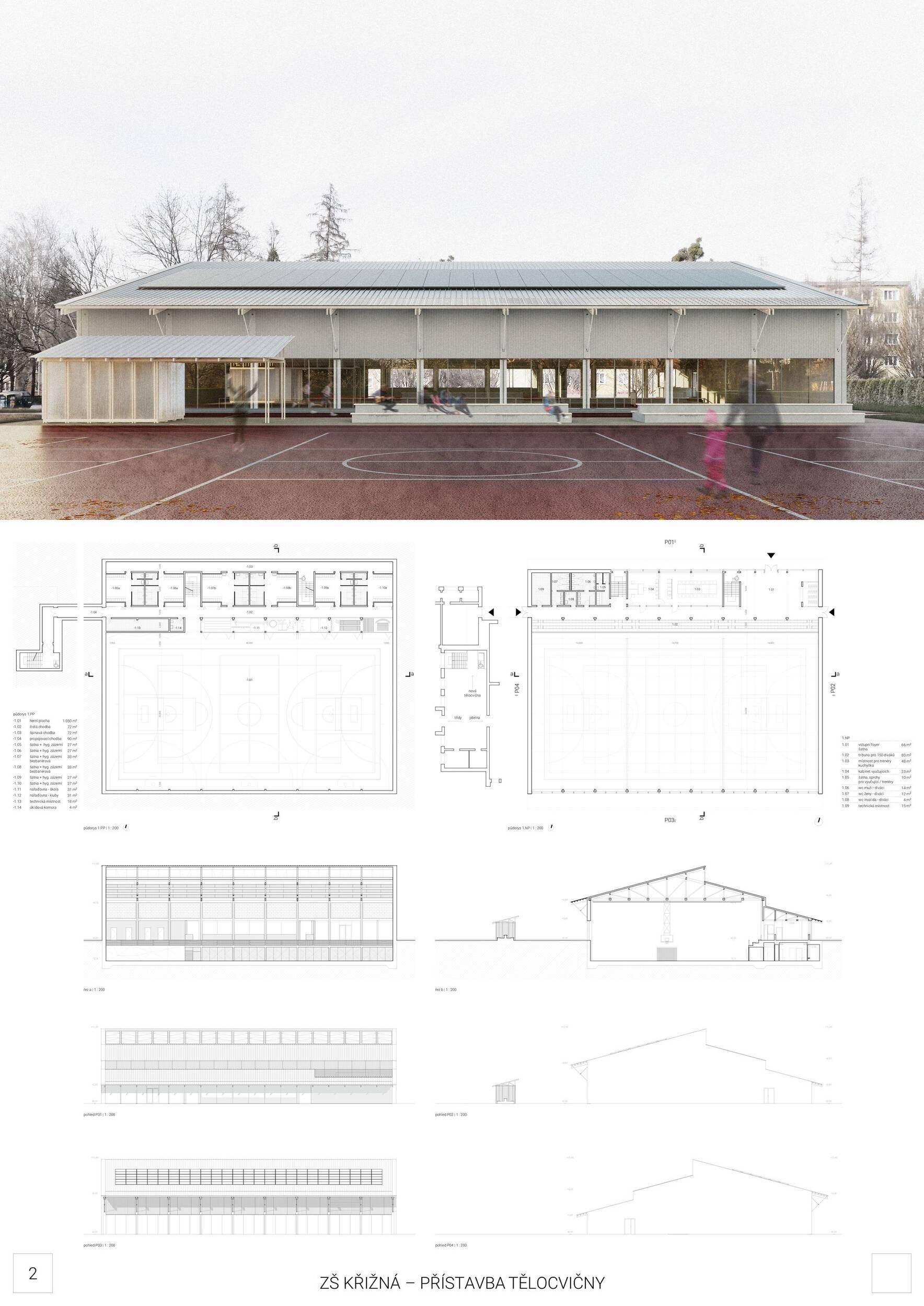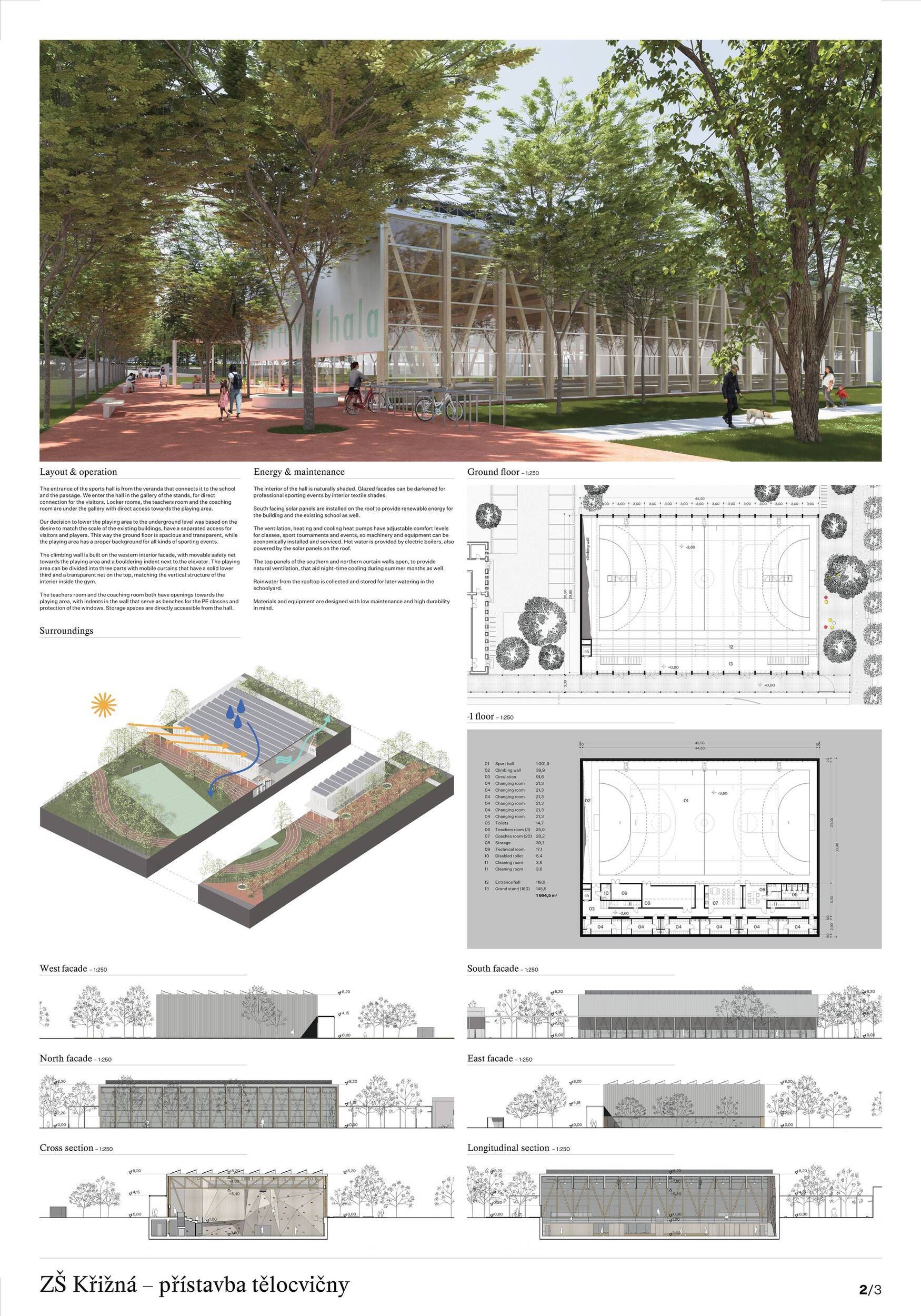 Návrh umisťuje objekt sportovní haly do pozice za jídelnou. Toto umístění bylo voleno často, protože zachovává krajinářsky důležitý prostor se vzrostlými stromy před jídelnou a novou sportovní halou. Přináší však s sebou problém, jak nový objekt napojit „suchou nohou“ na stávající budovy školy. Jeho řešení je v tomto projektu elegantní - prosklenou arkádou, která je ladně napojena na hmotu tělocvičny. Porota vysoce cení vizuální i funkční propojení vnitřní sportovní plochy s venkovní sportovní plochou, která na objekt přímo navazuje. Tímto propojením vzniká vynikající sportovně funkční prostředí. Návrh harmonicky pracuje se stávajícími i nově navrženými stromy a vytváří příjemný venkovní prostor. Autoři se rozhodli objekt nezapustit do země a zároveň navrhli sportovní halu s minimální doporučenou výškou. Tato dvě rozhodnutí vedou k hmotově a technicky ekonomickému řešení, které je dle názoru poroty vhodnou odpovědí na zadání. Porota vysoce hodnotí čistotu návrhu konstrukce tvořené kombinací štíhlých betonových sloupů a dřevěných nosníků jako hlavního konstrukčního prvku. Pochybnosti u poroty vzbudila jižní fasáda, která působí lehce a krásně, ale nepřesvědčivě ve smyslu dostatečného zastínění. Druhou pochybností poroty byl vztah navrhované stavby k ulici Křižná, kde je sice logicky umístěn hlavní vstup do budovy pro veřejnost, ale zbytek fasády je slepá stěna šaten. Je to cena, kterou autoři platí za rozhodnutí šatny nezapouštět pod zem.
