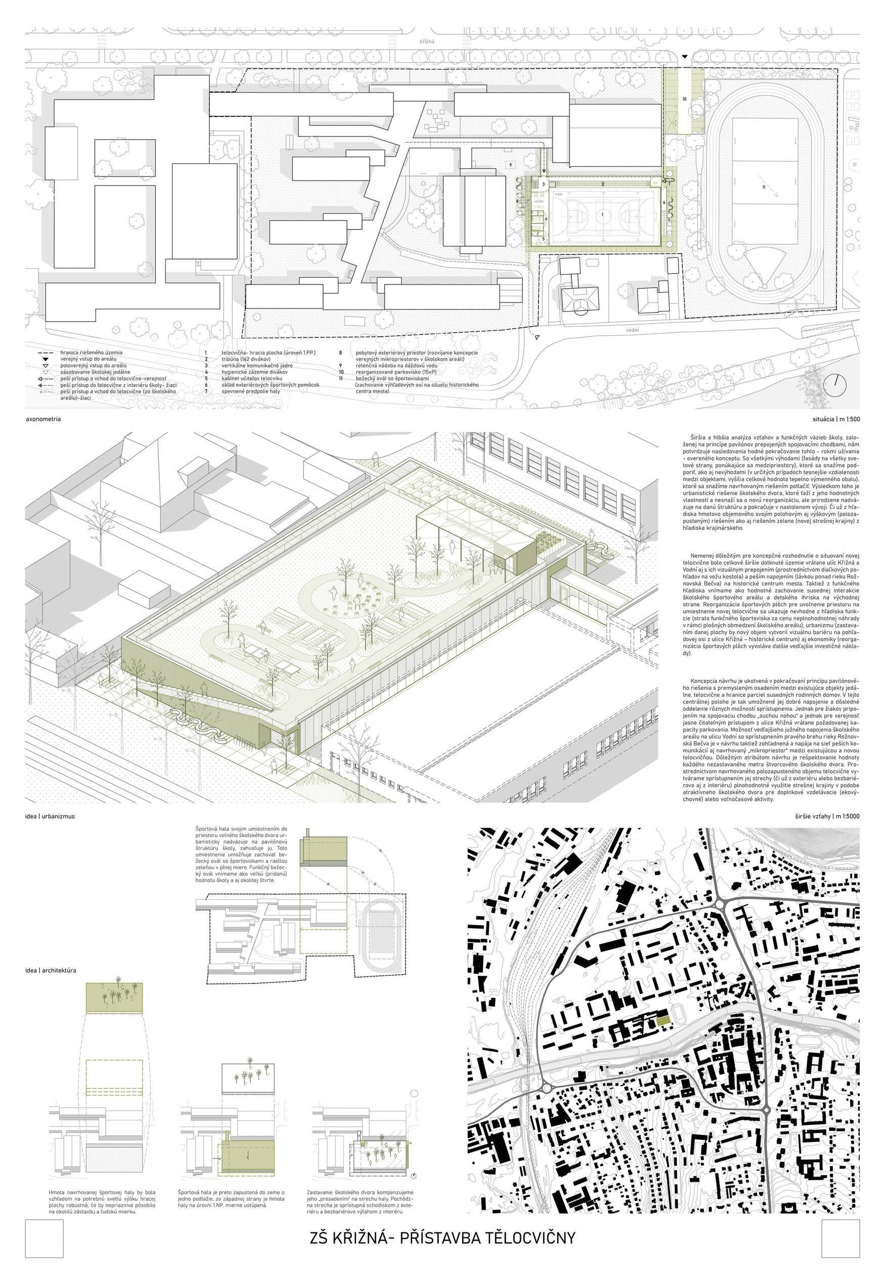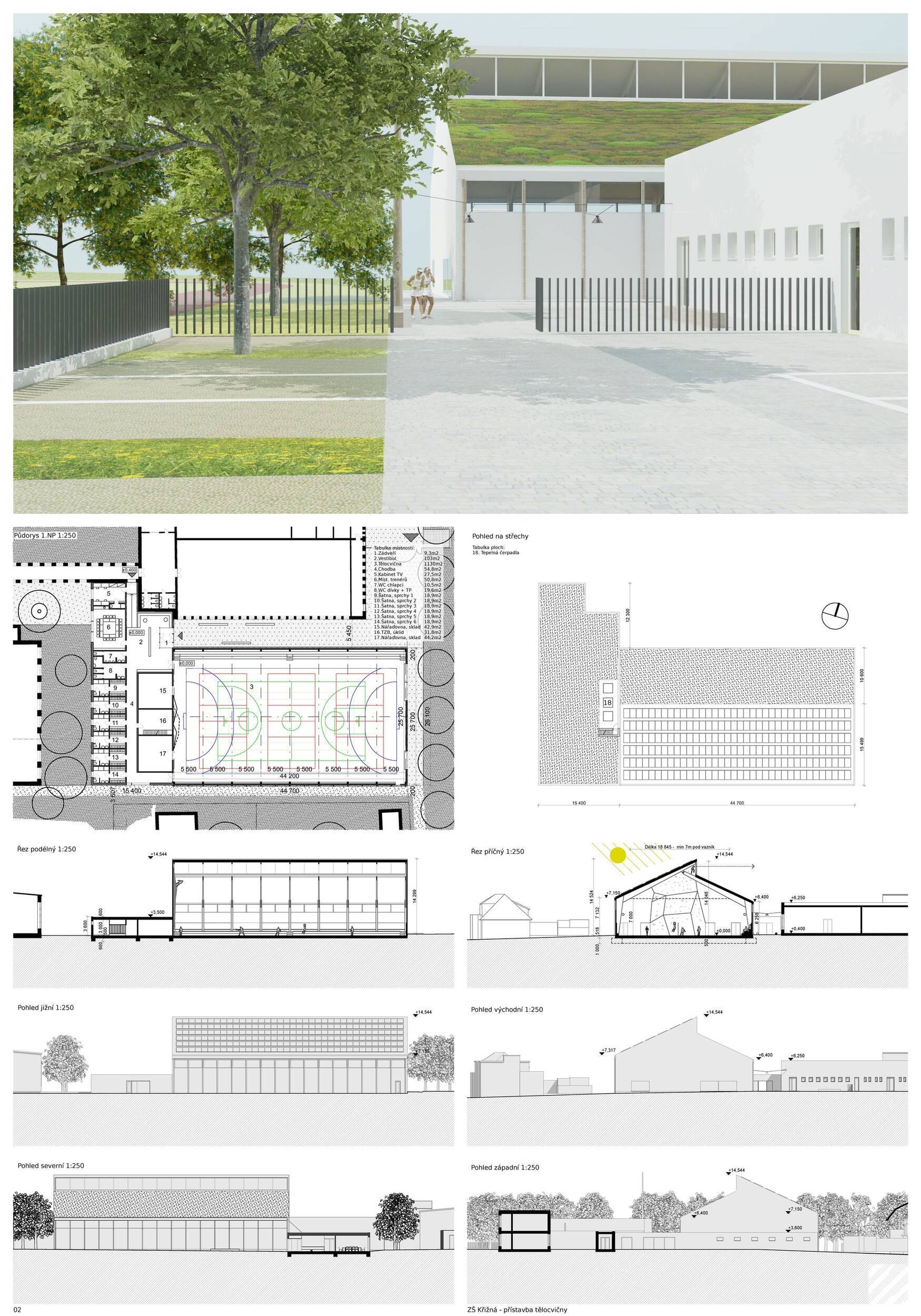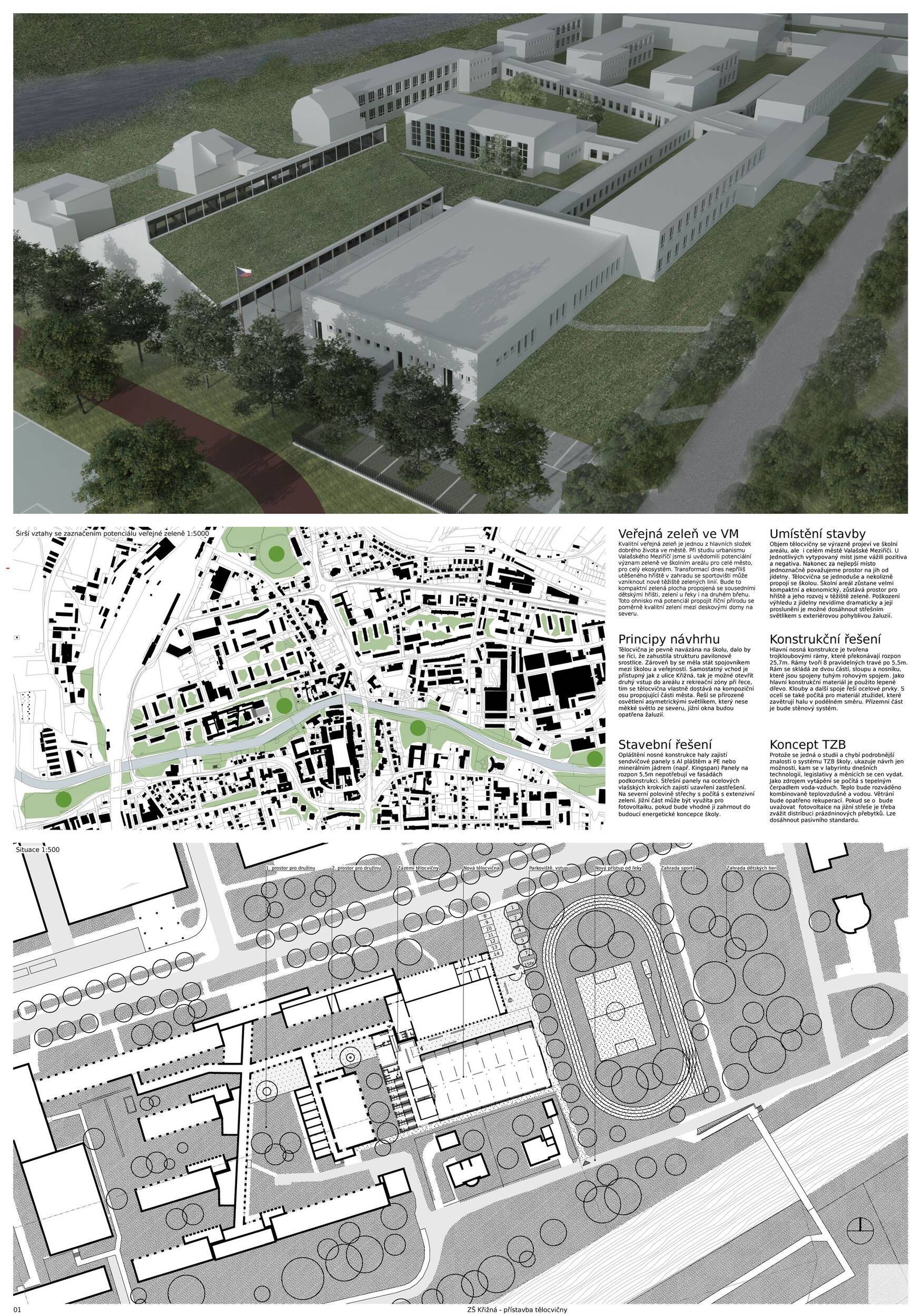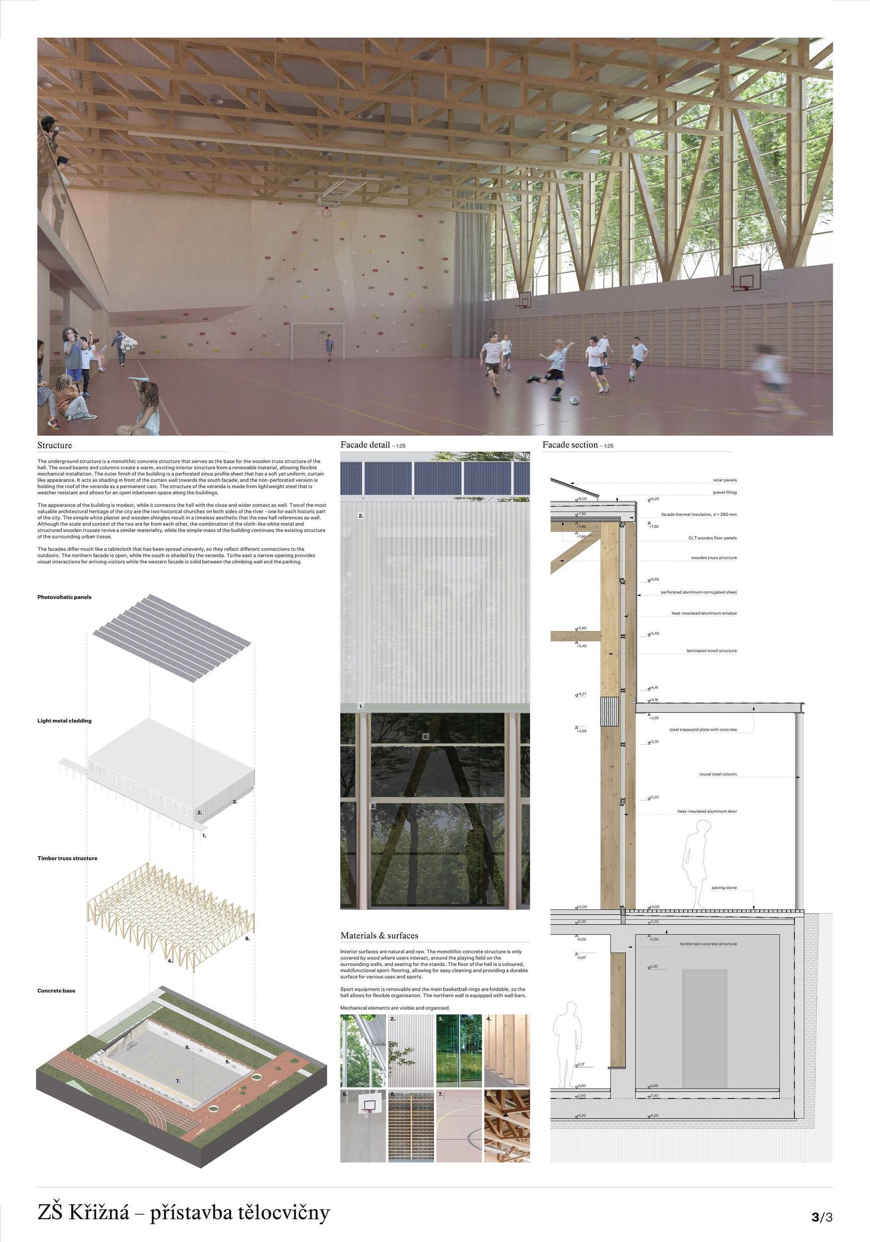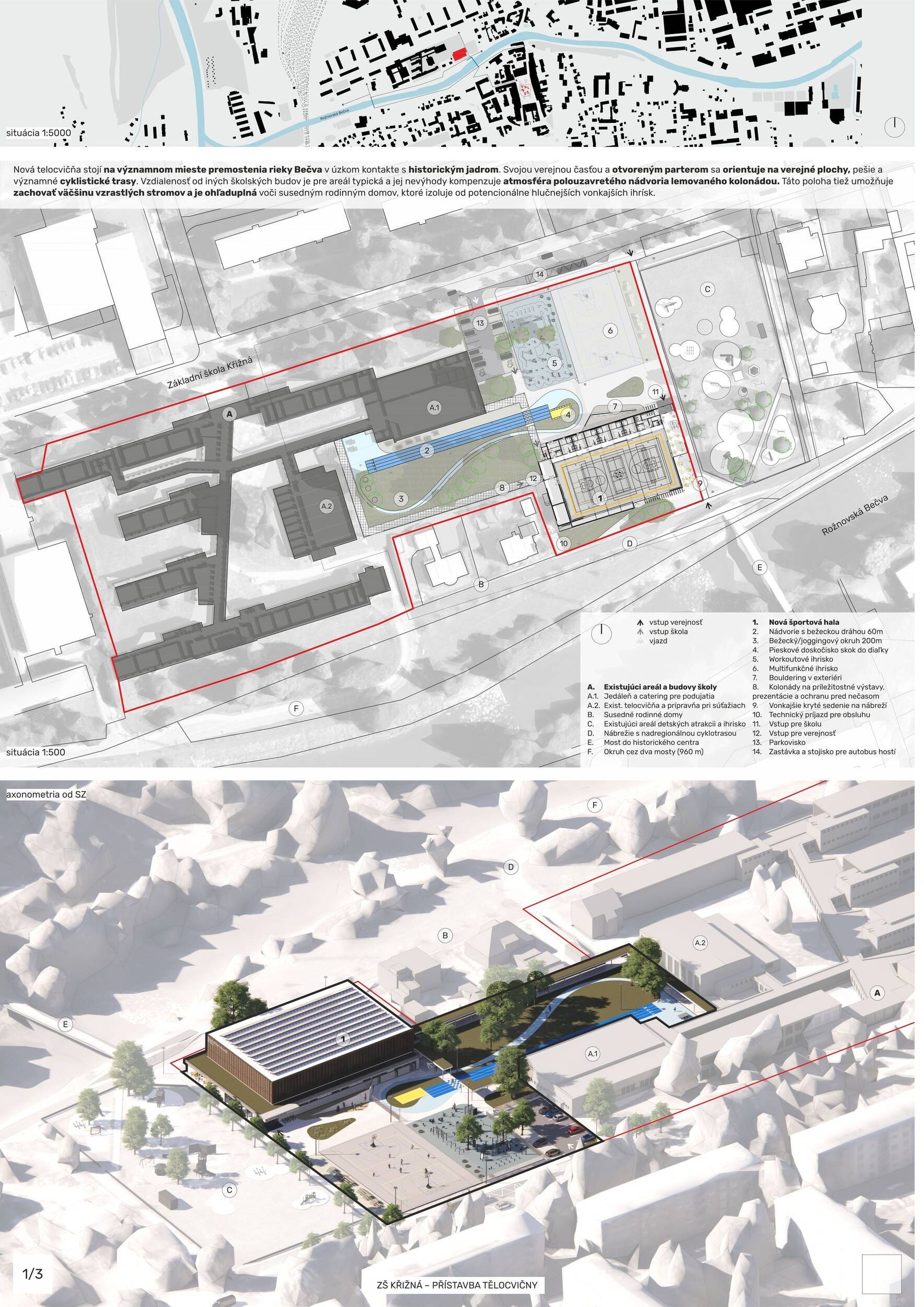 Návrh umisťuje objekt sportovní haly do pozice za jídelnou. Toto umístění bylo voleno často, protože zachovává krajinářsky důležitý prostor se vzrostlými stromy před jídelnou a novou sportovní halou. Přináší však s sebou problém, jak nový objekt napojit „suchou nohou“ na stávající budovy školy. Jeho řešení je v tomto projektu elegantní - prosklenou arkádou, která je ladně napojena na hmotu tělocvičny. Porota vysoce cení vizuální i funkční propojení vnitřní sportovní plochy s venkovní sportovní plochou, která na objekt přímo navazuje. Tímto propojením vzniká vynikající sportovně funkční prostředí. Návrh harmonicky pracuje se stávajícími i nově navrženými stromy a vytváří příjemný venkovní prostor. Autoři se rozhodli objekt nezapustit do země a zároveň navrhli sportovní halu s minimální doporučenou výškou. Tato dvě rozhodnutí vedou k hmotově a technicky ekonomickému řešení, které je dle názoru poroty vhodnou odpovědí na zadání. Porota vysoce hodnotí čistotu návrhu konstrukce tvořené kombinací štíhlých betonových sloupů a dřevěných nosníků jako hlavního konstrukčního prvku. Pochybnosti u poroty vzbudila jižní fasáda, která působí lehce a krásně, ale nepřesvědčivě ve smyslu dostatečného zastínění. Druhou pochybností poroty byl vztah navrhované stavby k ulici Křižná, kde je sice logicky umístěn hlavní vstup do budovy pro veřejnost, ale zbytek fasády je slepá stěna šaten. Je to cena, kterou autoři platí za rozhodnutí šatny nezapouštět pod zem.