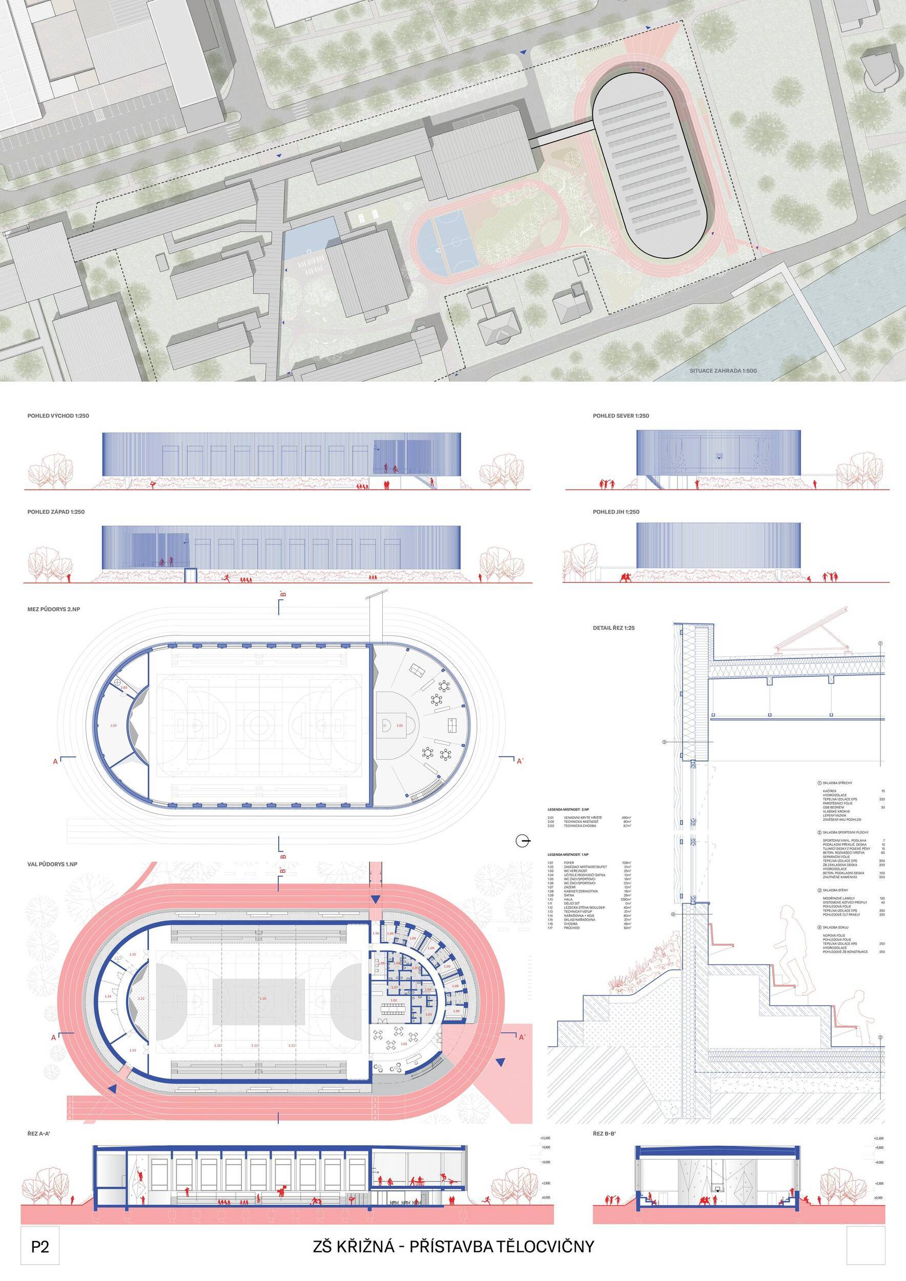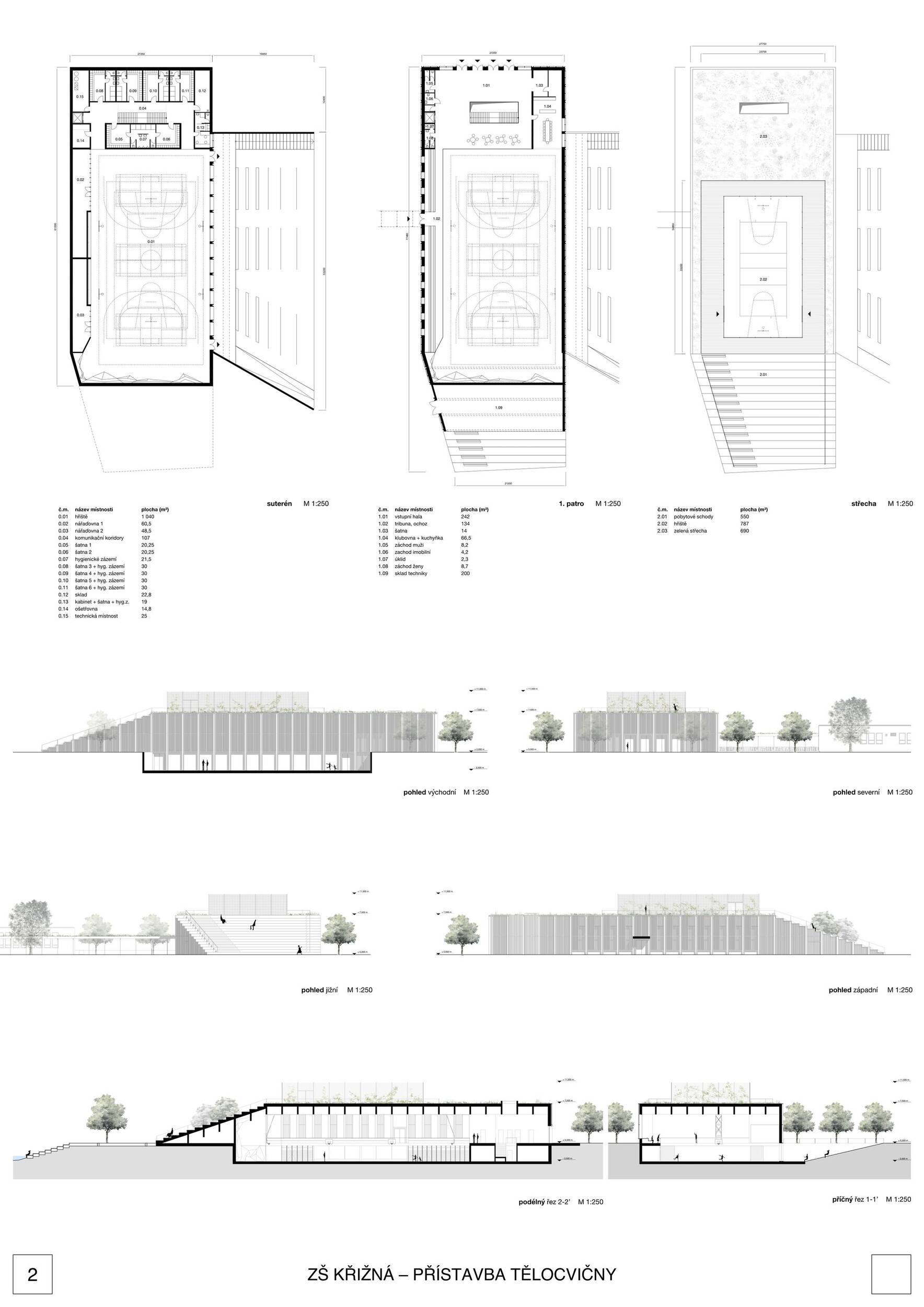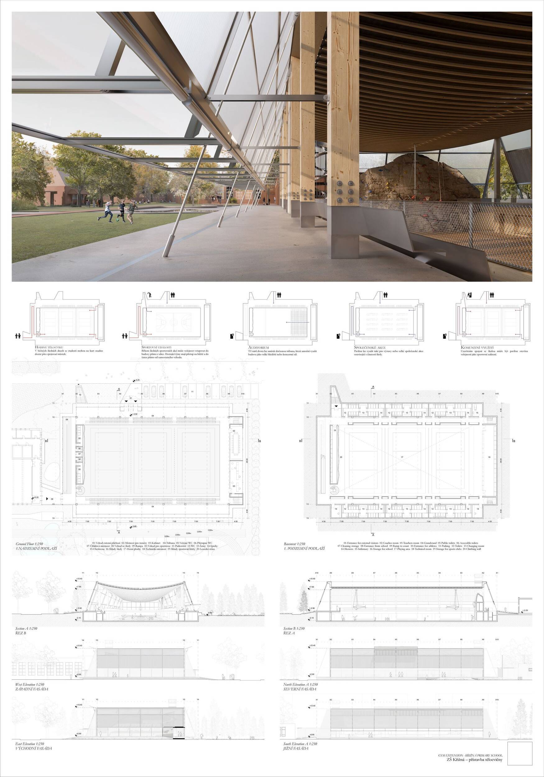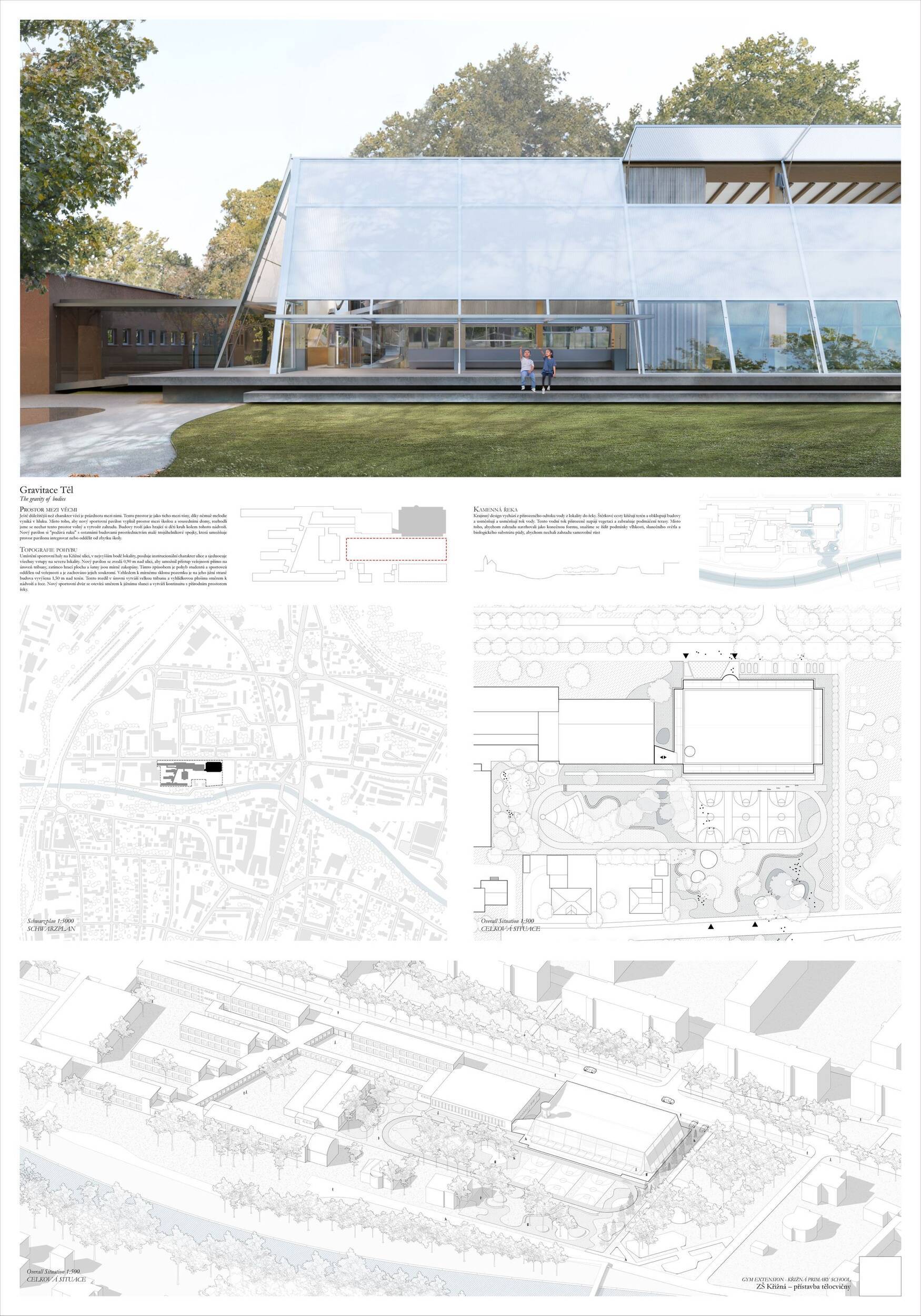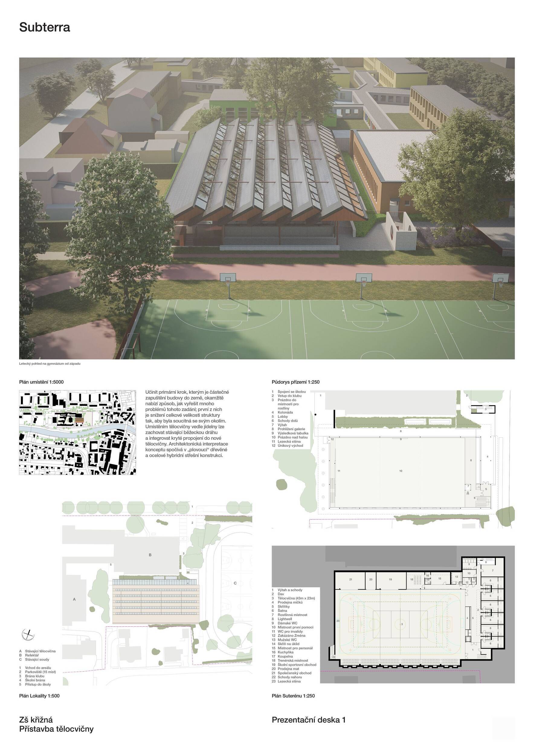 Návrh umisťuje objekt sportovní haly do pozice za jídelnou. Toto umístění bylo voleno často, protože zachovává krajinářsky důležitý prostor se vzrostlými stromy před jídelnou a novou sportovní halou. Přináší však s sebou problém, jak nový objekt napojit „suchou nohou“ na stávající budovy školy. Jeho řešení je v tomto projektu elegantní - prosklenou arkádou, která je ladně napojena na hmotu tělocvičny. Porota vysoce cení vizuální i funkční propojení vnitřní sportovní plochy s venkovní sportovní plochou, která na objekt přímo navazuje. Tímto propojením vzniká vynikající sportovně funkční prostředí. Návrh harmonicky pracuje se stávajícími i nově navrženými stromy a vytváří příjemný venkovní prostor. Autoři se rozhodli objekt nezapustit do země a zároveň navrhli sportovní halu s minimální doporučenou výškou. Tato dvě rozhodnutí vedou k hmotově a technicky ekonomickému řešení, které je dle názoru poroty vhodnou odpovědí na zadání. Porota vysoce hodnotí čistotu návrhu konstrukce tvořené kombinací štíhlých betonových sloupů a dřevěných nosníků jako hlavního konstrukčního prvku. Pochybnosti u poroty vzbudila jižní fasáda, která působí lehce a krásně, ale nepřesvědčivě ve smyslu dostatečného zastínění. Druhou pochybností poroty byl vztah navrhované stavby k ulici Křižná, kde je sice logicky umístěn hlavní vstup do budovy pro veřejnost, ale zbytek fasády je slepá stěna šaten. Je to cena, kterou autoři platí za rozhodnutí šatny nezapouštět pod zem.